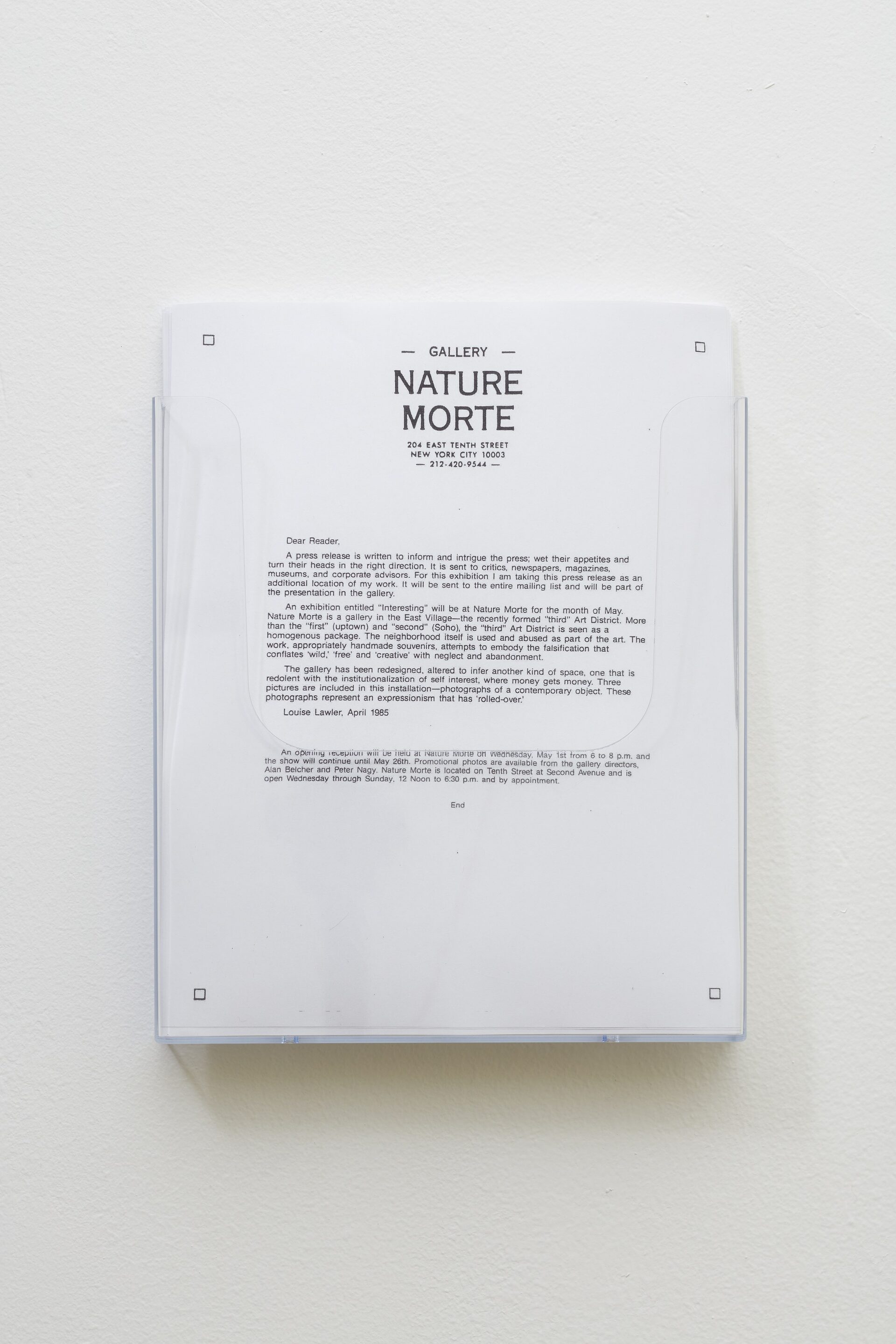 Ehrlich Steinberg is pleased to present Nature Morte, 1982–1988, the first survey exhibition dedicated to the influential East Village gallery Nature Morte, founded by artists Alan Belcher and Peter Nagy, active from 1982 to 1988. The exhibition features early works, some unseen in decades, both originally shown at Nature Morte or created during its six-year run. Nature Morte, 1982–1988 includes represented artists Gretchen Bender, Jennifer Bolande, Kevin Larmon, Ken Lum, Richard Milani, Joseph Nechvatal, Joel Otterson, Steven Parrino, David Robbins, Not Vital, and Julia Wachtel, as well as exhibited artists Louise Lawler, Sherrie Levine, Allan McCollum and Laurie Simmons, and Richard Pettibone. The exhibition also features works by Belcher and Nagy, at the time represented by Cable Gallery and International with Monument, respectively.