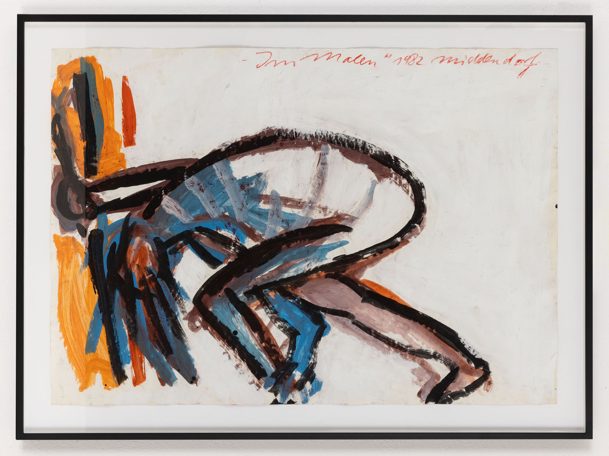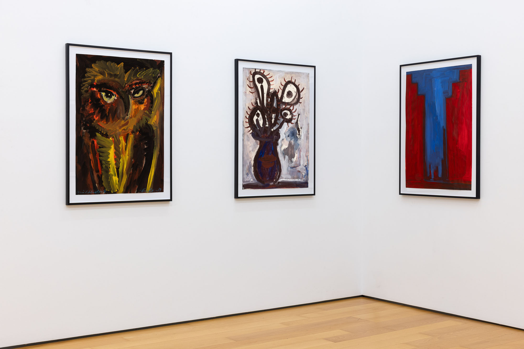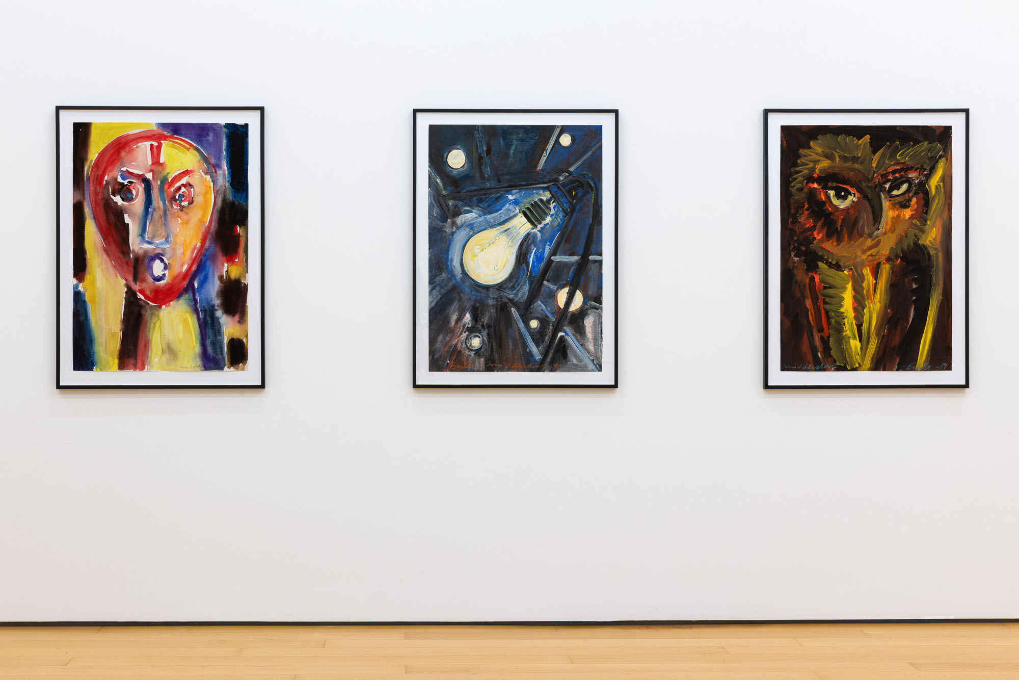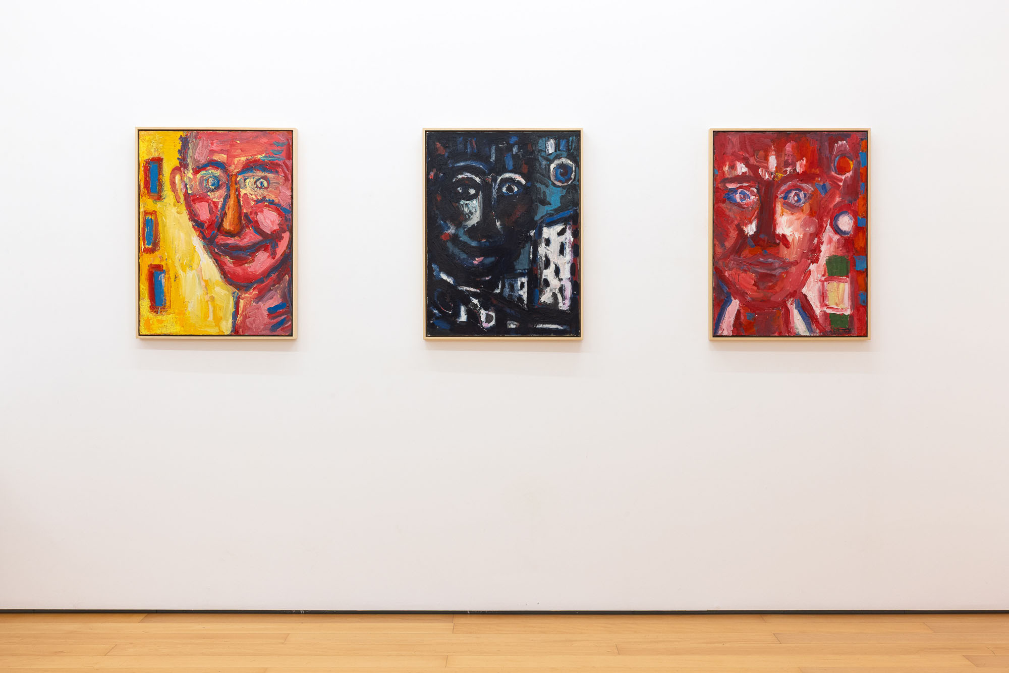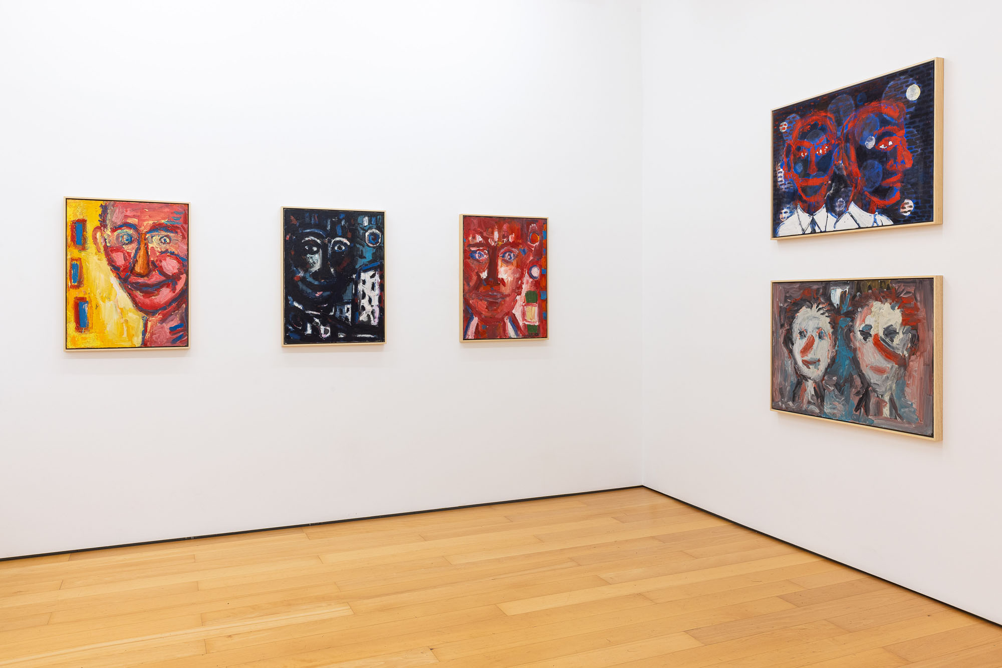 The paintings from the 1990s, exhibited here for the first time, form a series of self-portraits imbued with Middendorf’s characteristically raw and immediate energy. They create a vivid, psychologically charged constellation of faces, each pushing the expressive limits of color and gesture. Some appear as double portraits, where two heads share the same frame, their features overlapping or echoing one another. This doubling heightens a sense of movement, introspection, and internal dialogue.