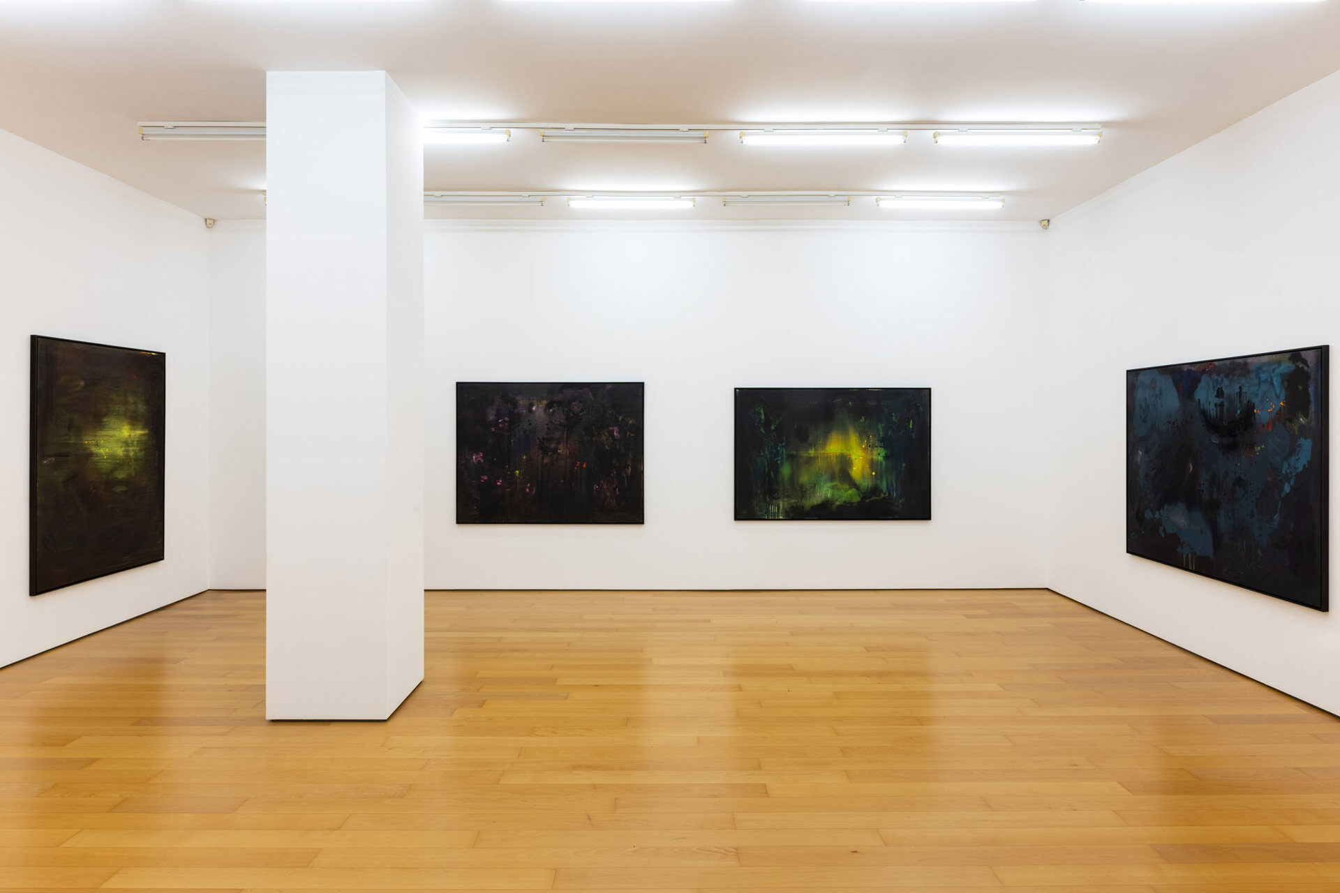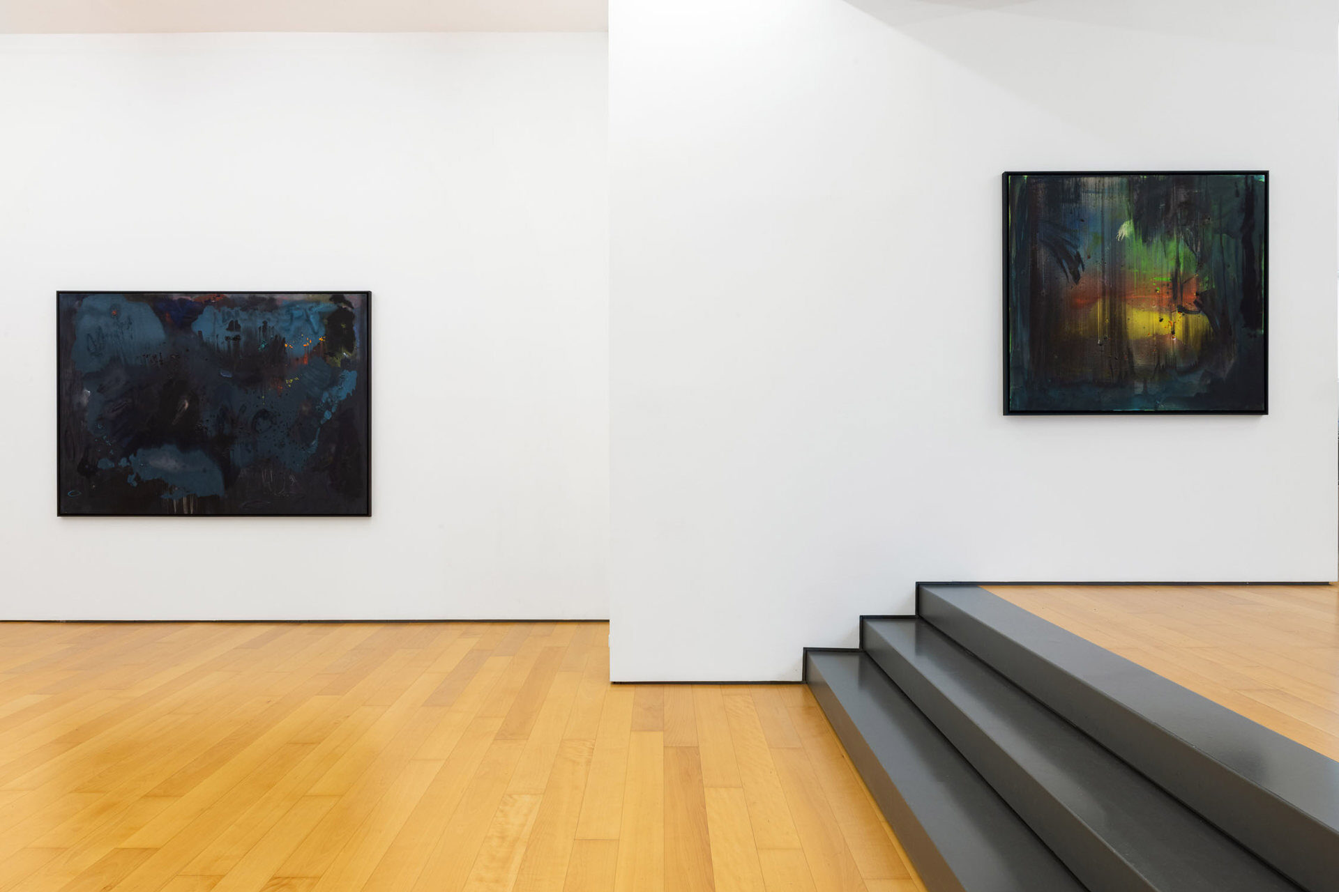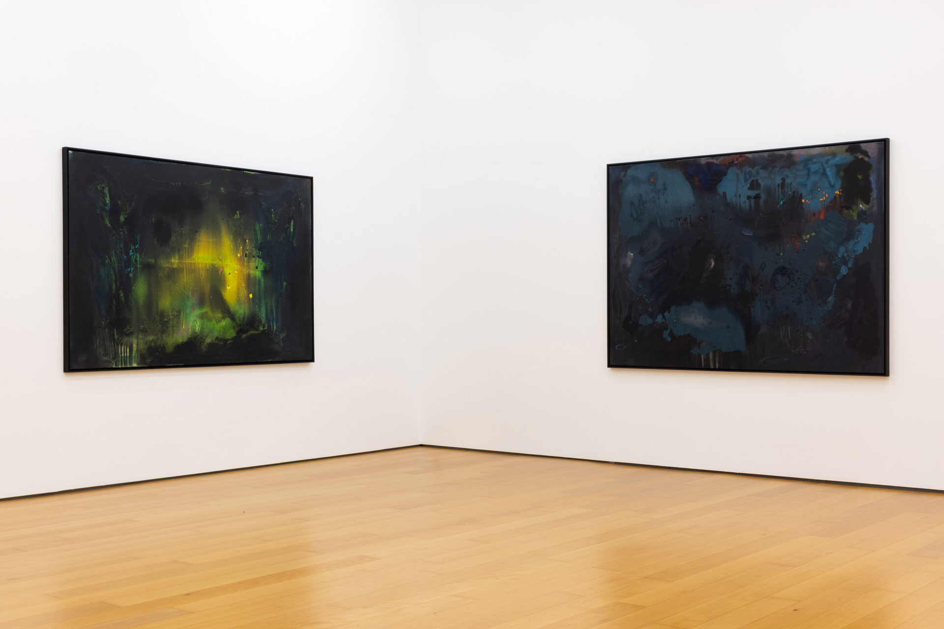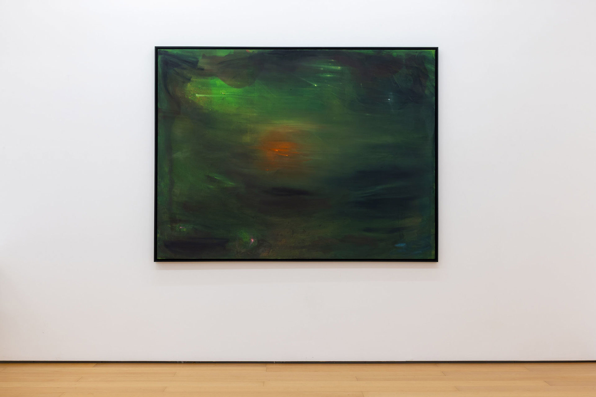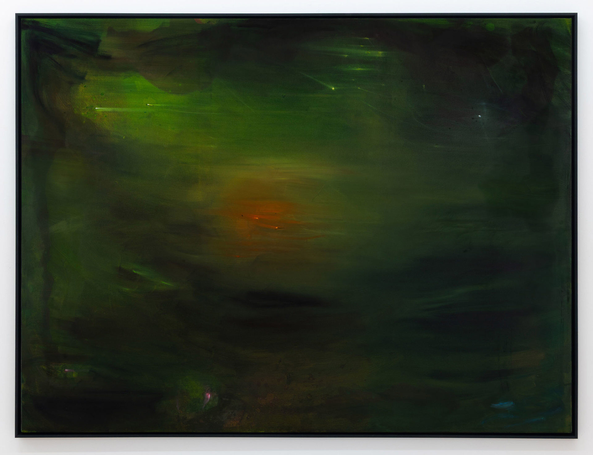 Calling the works in this exhibition “landscapes” is both helpful and misleading. The eight paintings do feature forms that can be found in nature, like clouds, trees, or rays of light, and they evoke natural phenomena, such as twilight, fog, or volcanic eruptions. Yet the term is not entirely accurate, in that the paintings do not have a clear spatial orientation that defines them as a panorama or a specific place that could be visited. Instead, they create their own space in which color and light are the main actors.