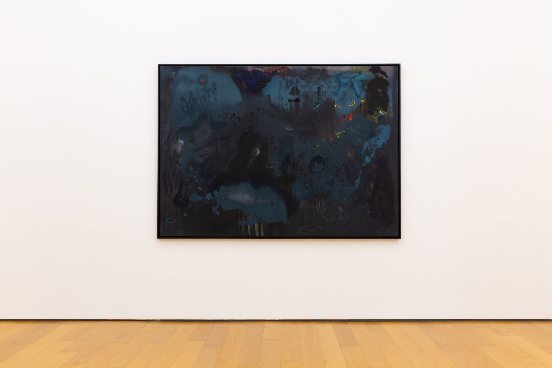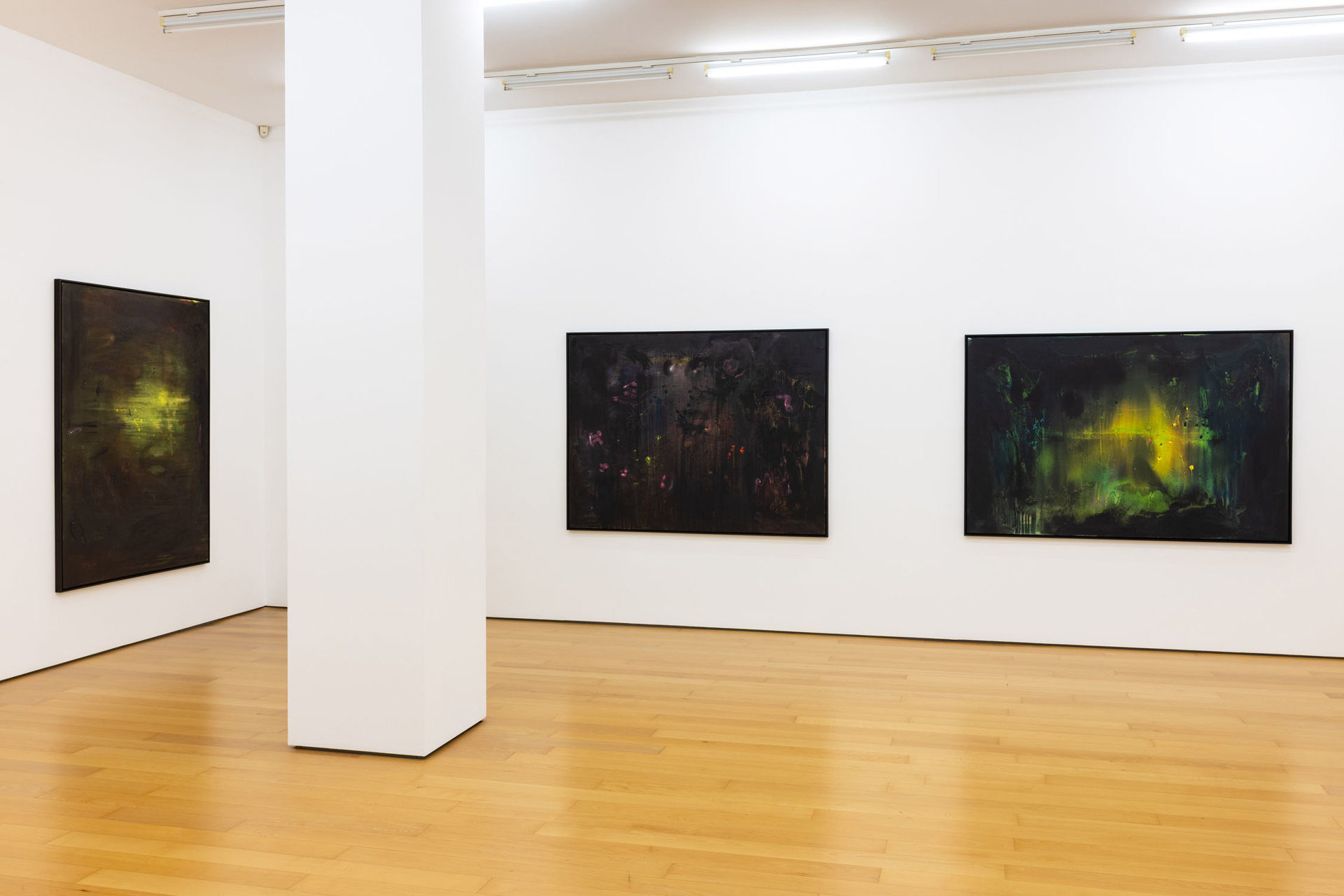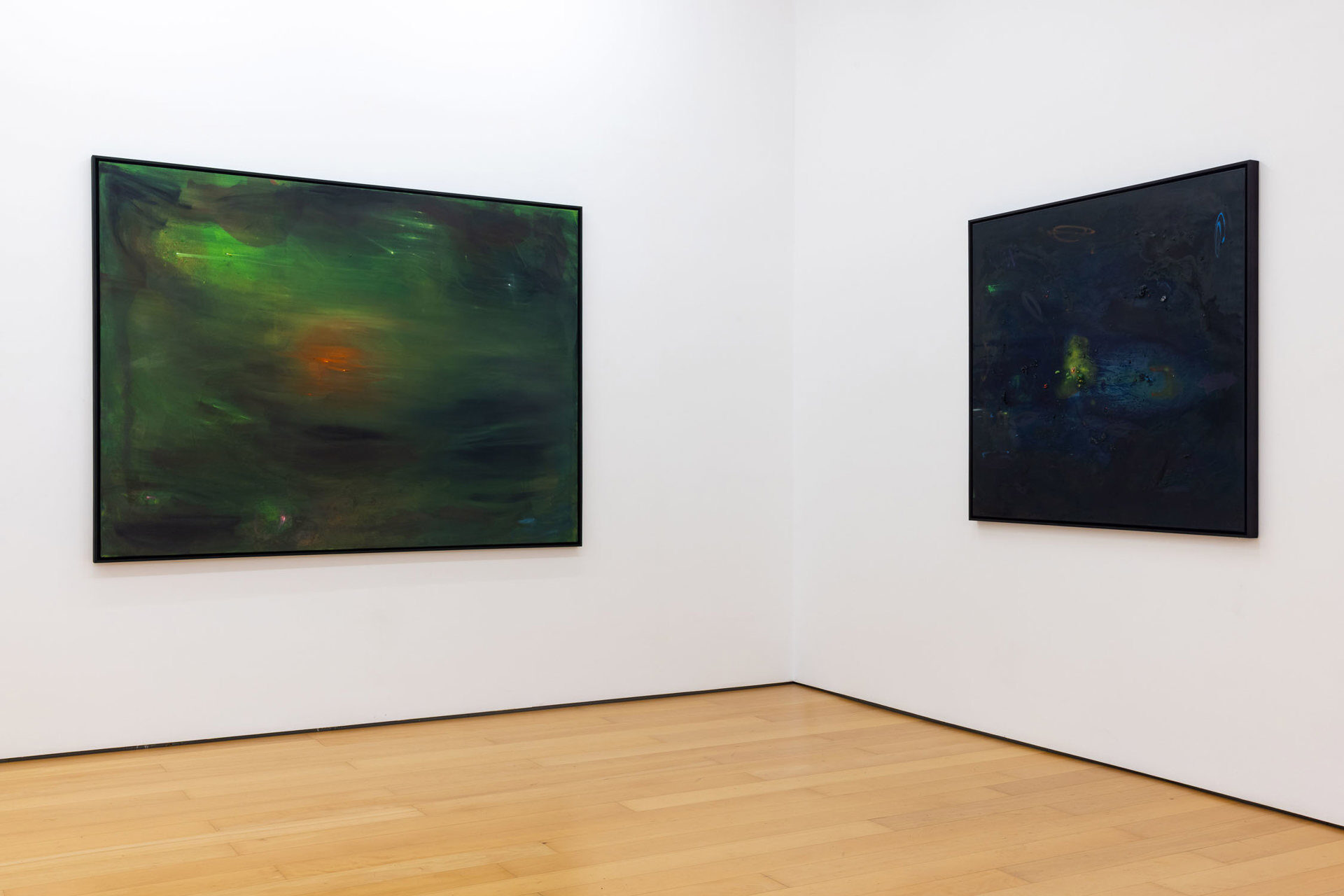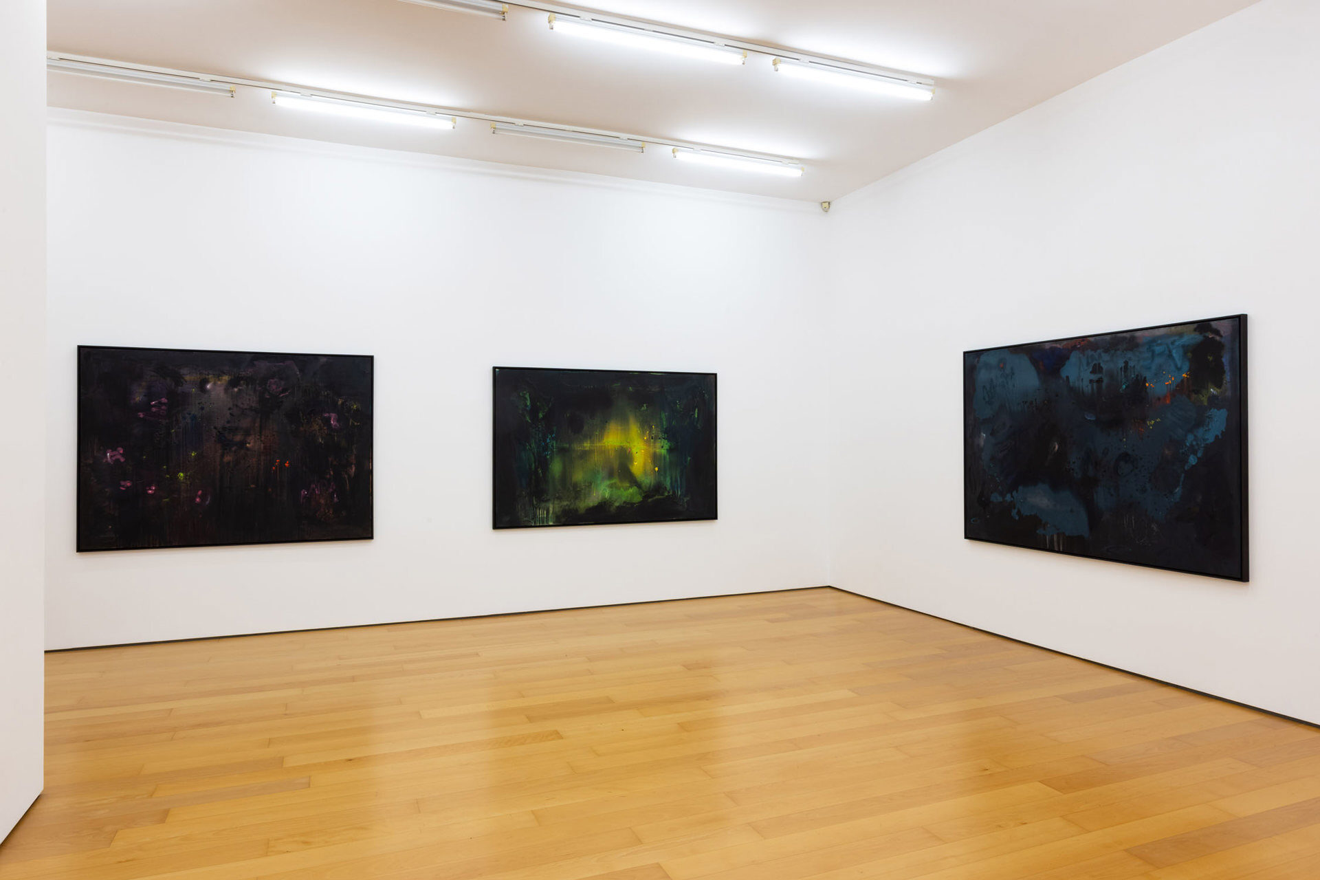Calling the works in this exhibition “landscapes” is both helpful and misleading. The eight paintings do feature forms that can be found in nature, like clouds, trees, or rays of light, and they evoke natural phenomena, such as twilight, fog, or volcanic eruptions. Yet the term is not entirely accurate, in that the paintings do not have a clear spatial orientation that defines them as a panorama or a specific place that could be visited. Instead, they create their own space in which color and light are the main actors.