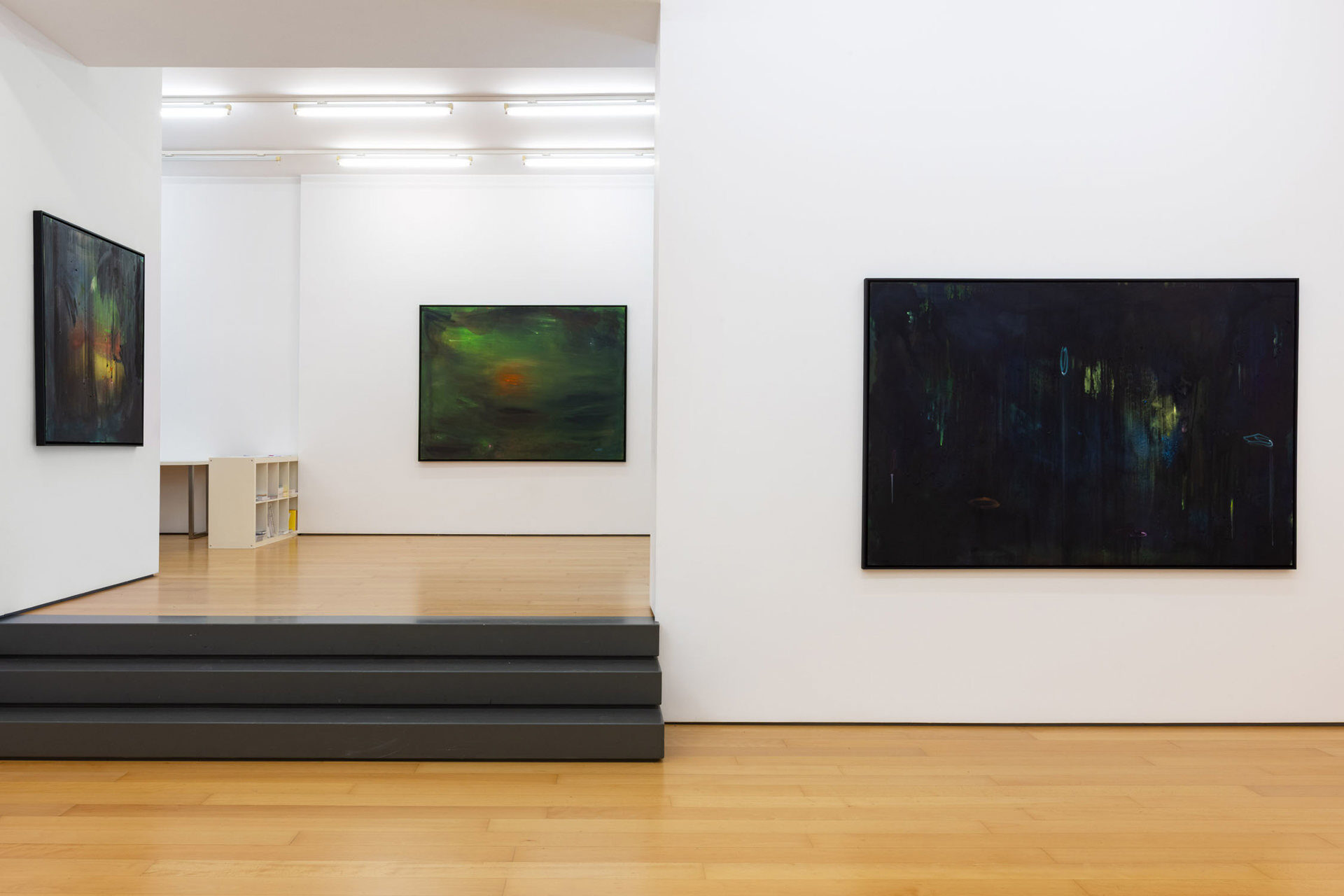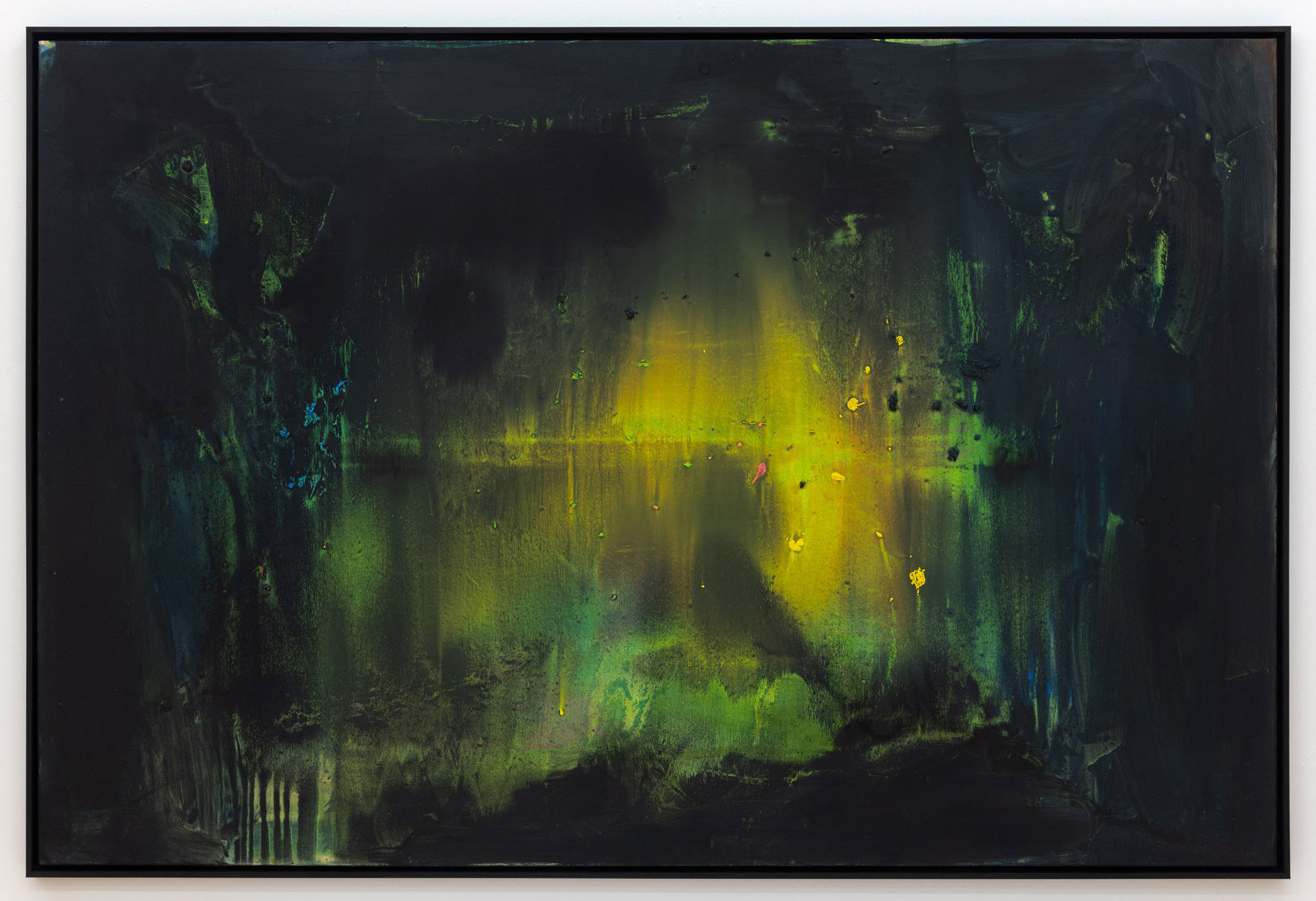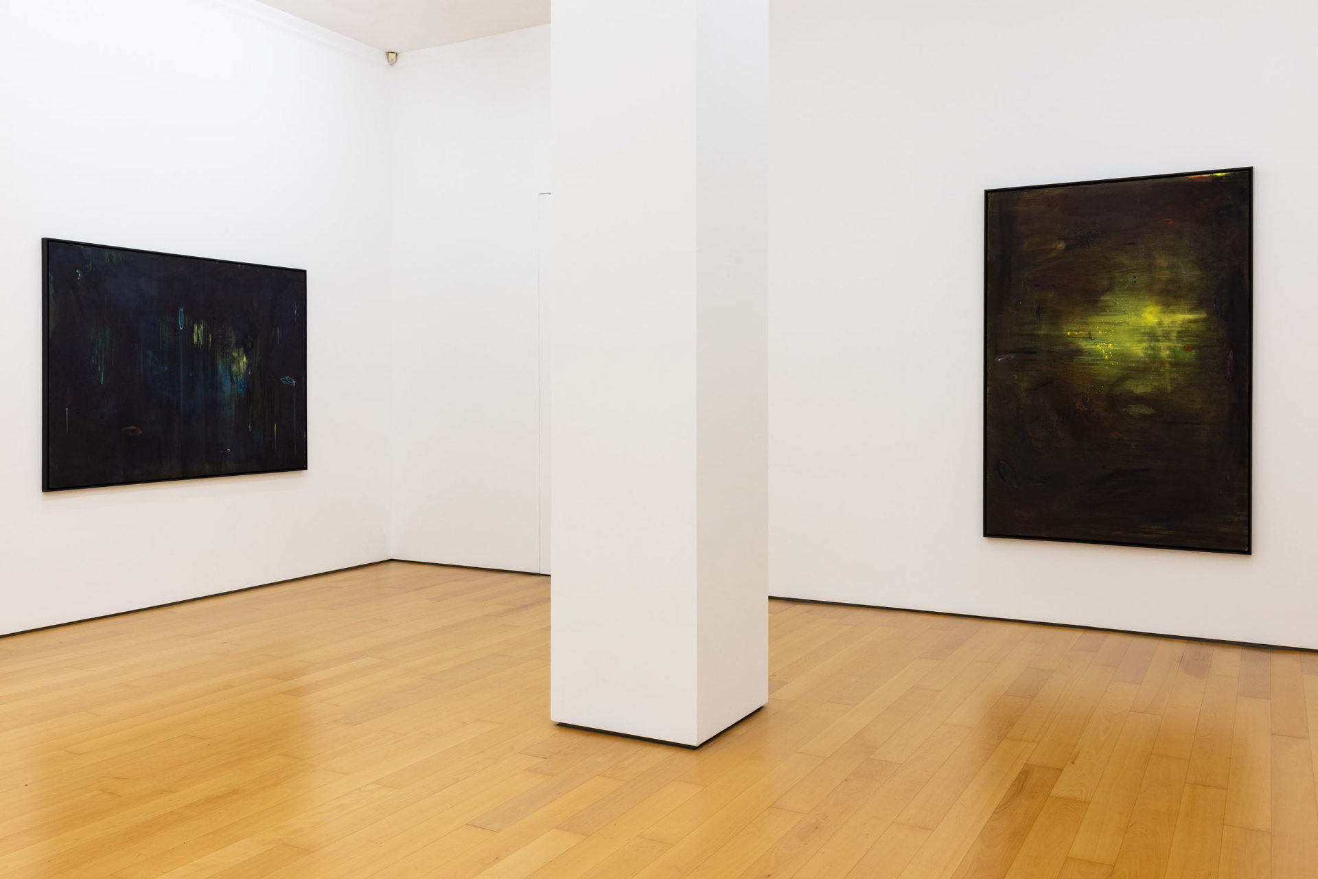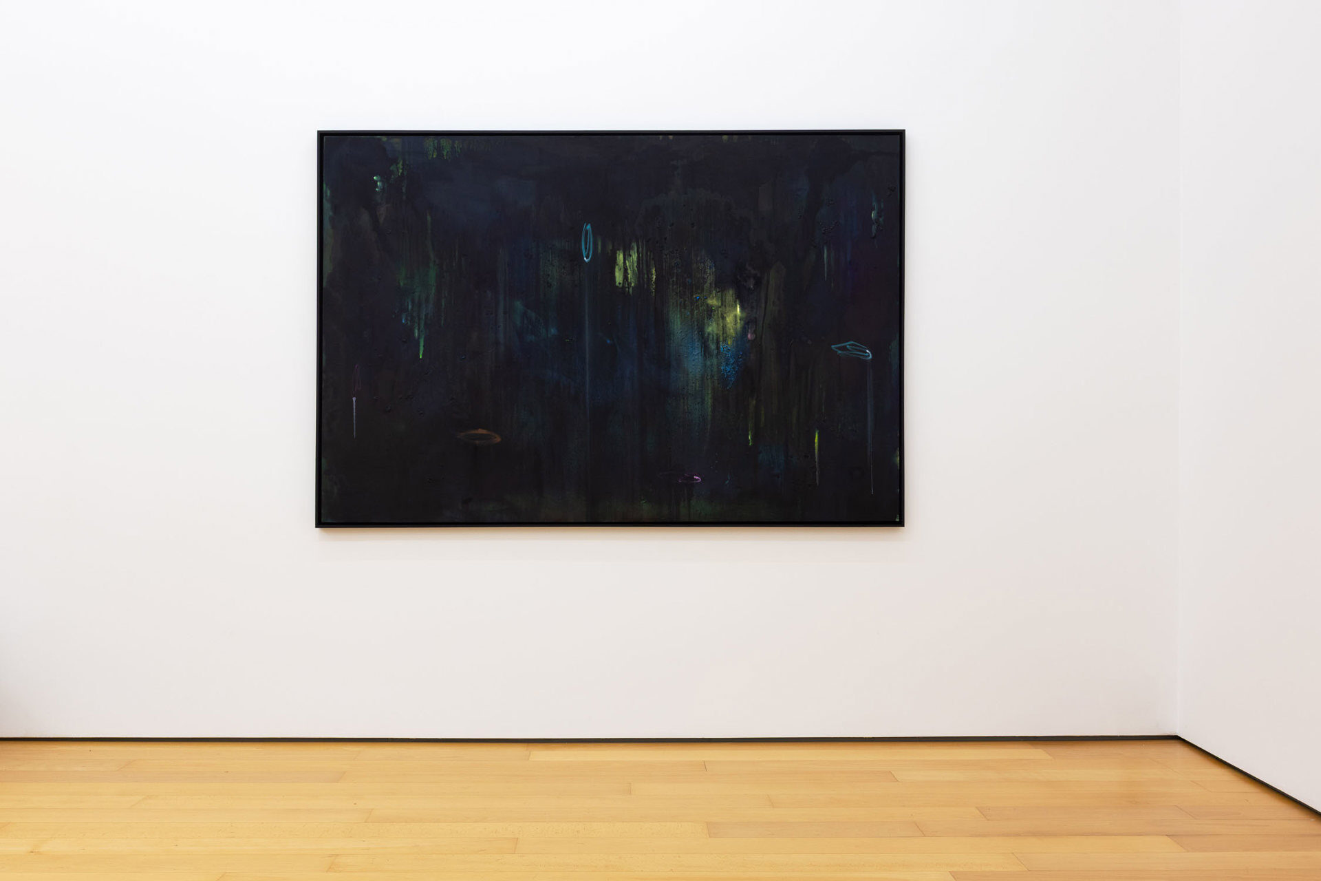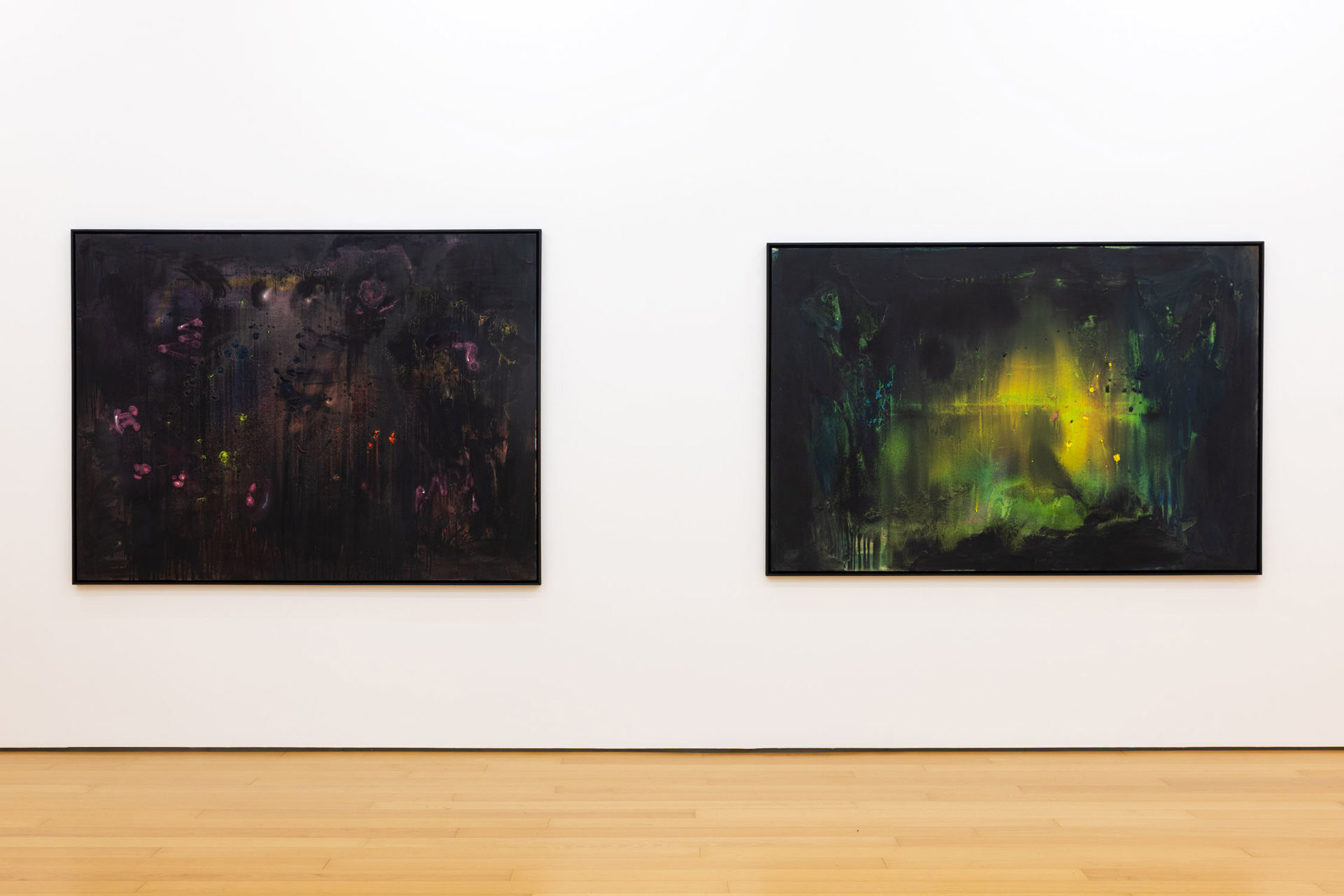 Calling the works in this exhibition “landscapes” is both helpful and misleading. The eight paintings do feature forms that can be found in nature, like clouds, trees, or rays of light, and they evoke natural phenomena, such as twilight, fog, or volcanic eruptions. Yet the term is not entirely accurate, in that the paintings do not have a clear spatial orientation that defines them as a panorama or a specific place that could be visited. Instead, they create their own space in which color and light are the main actors.