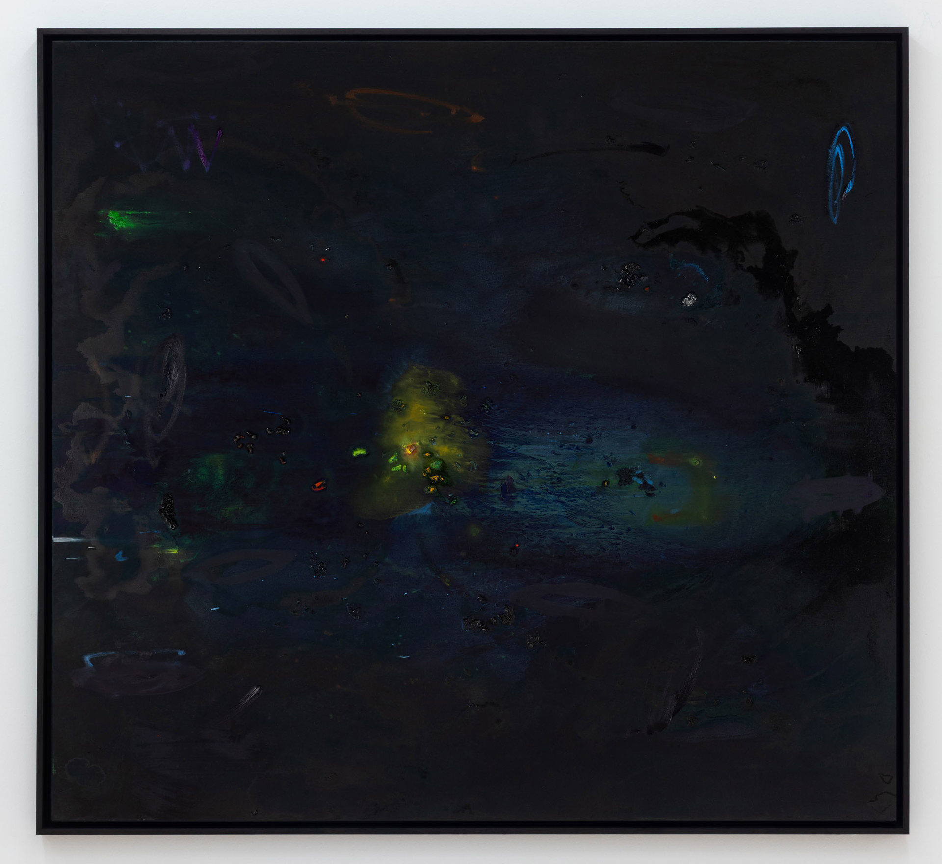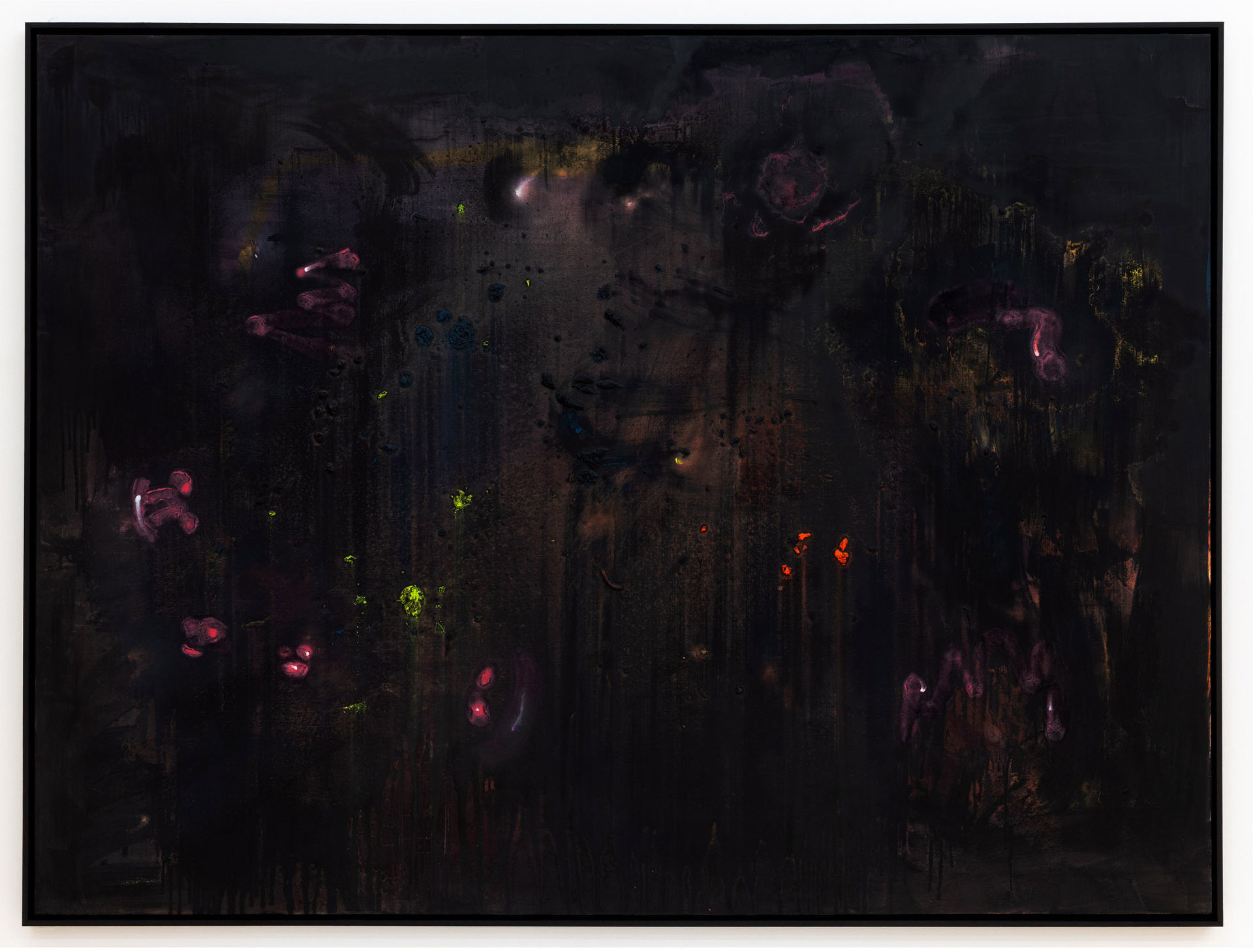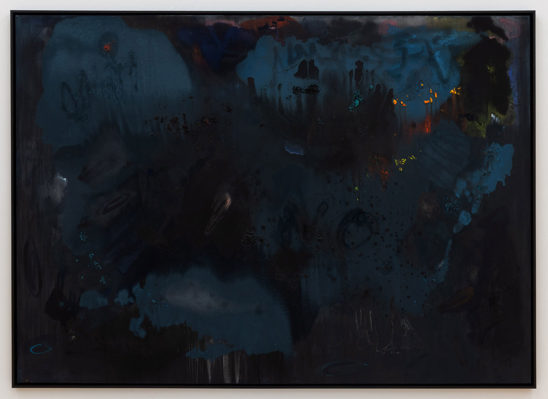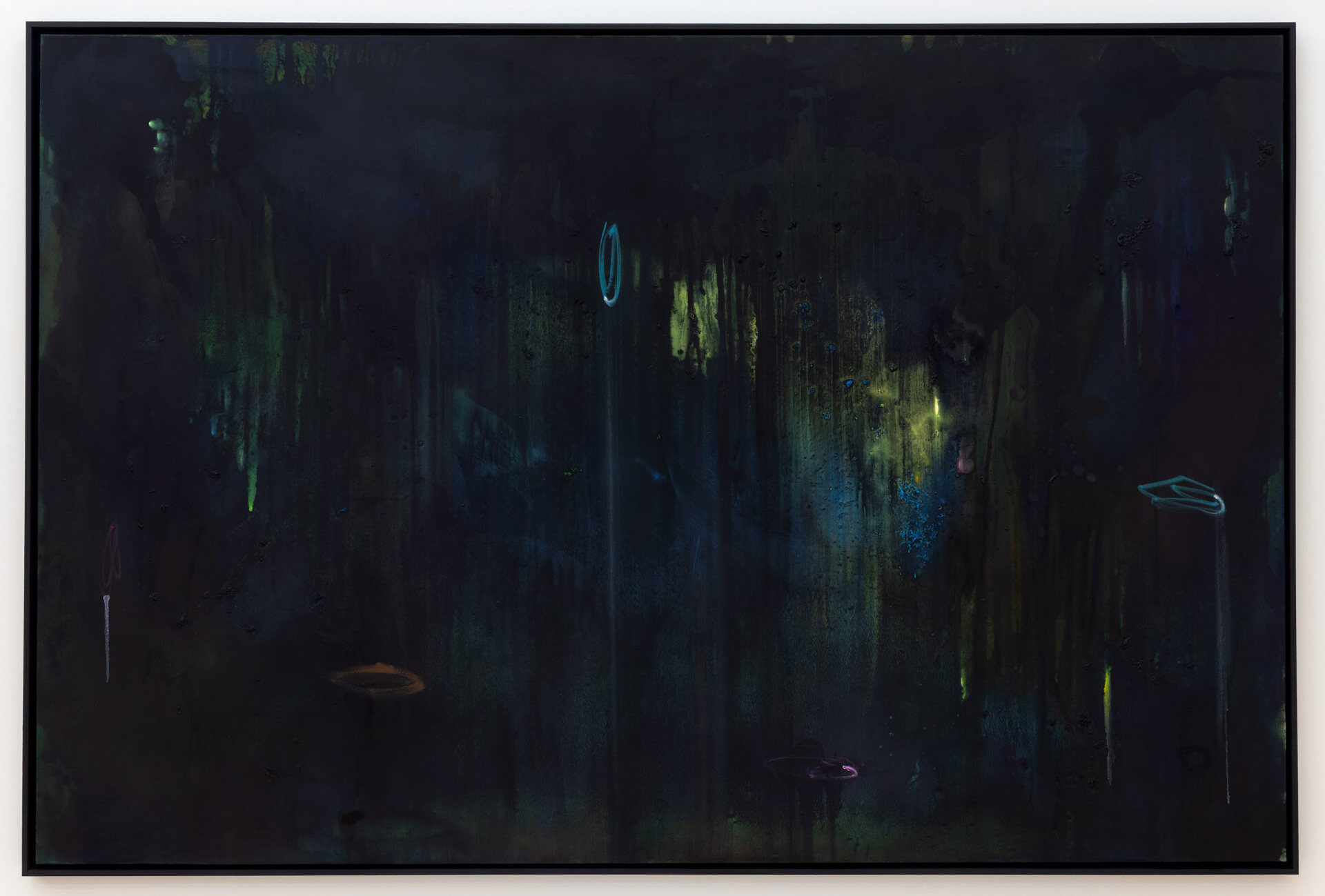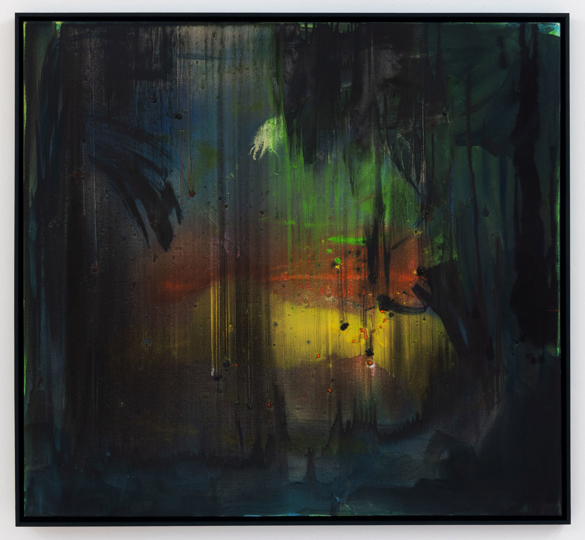 Calling the works in this exhibition “landscapes” is both helpful and misleading. The eight paintings do feature forms that can be found in nature, like clouds, trees, or rays of light, and they evoke natural phenomena, such as twilight, fog, or volcanic eruptions. Yet the term is not entirely accurate, in that the paintings do not have a clear spatial orientation that defines them as a panorama or a specific place that could be visited. Instead, they create their own space in which color and light are the main actors.