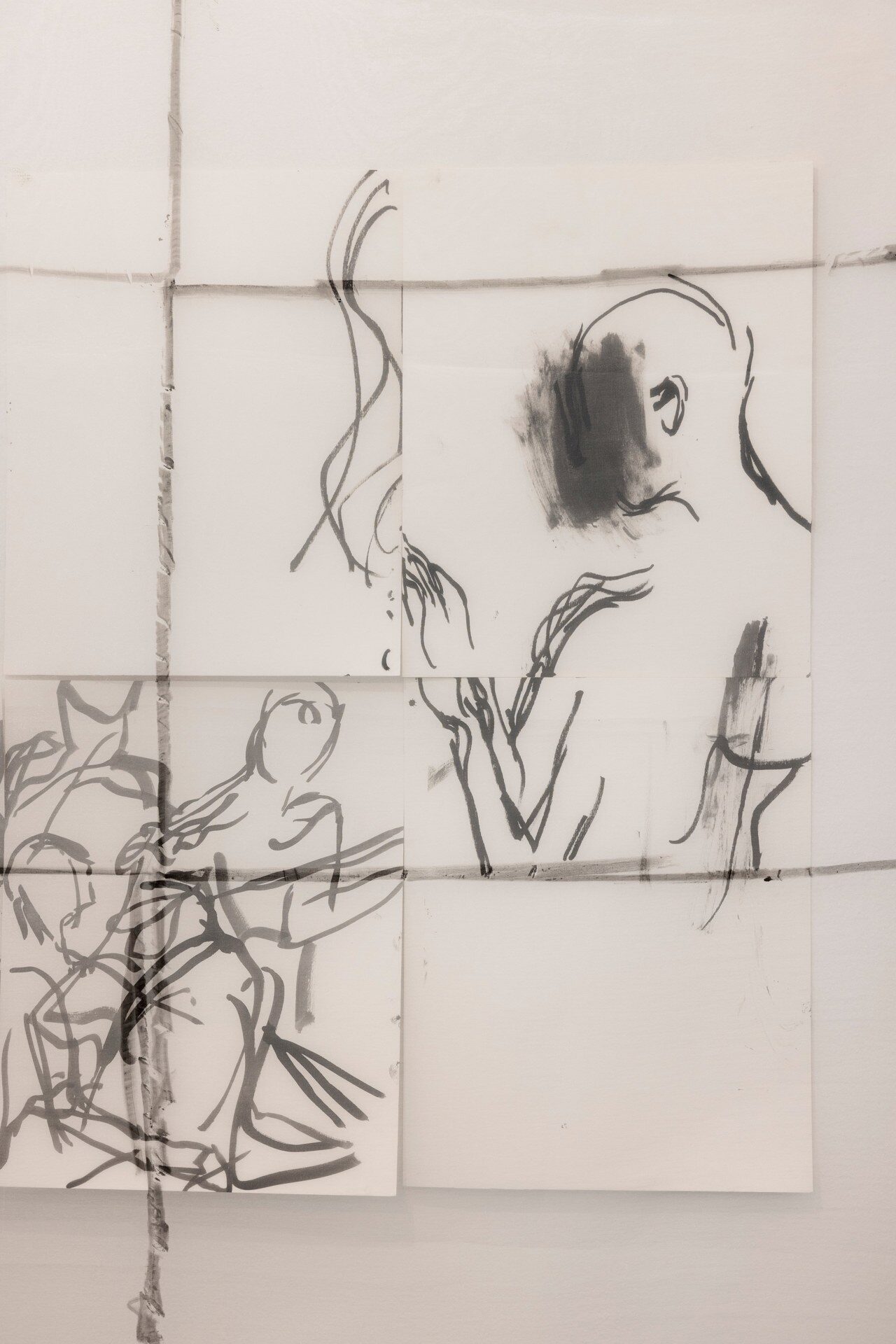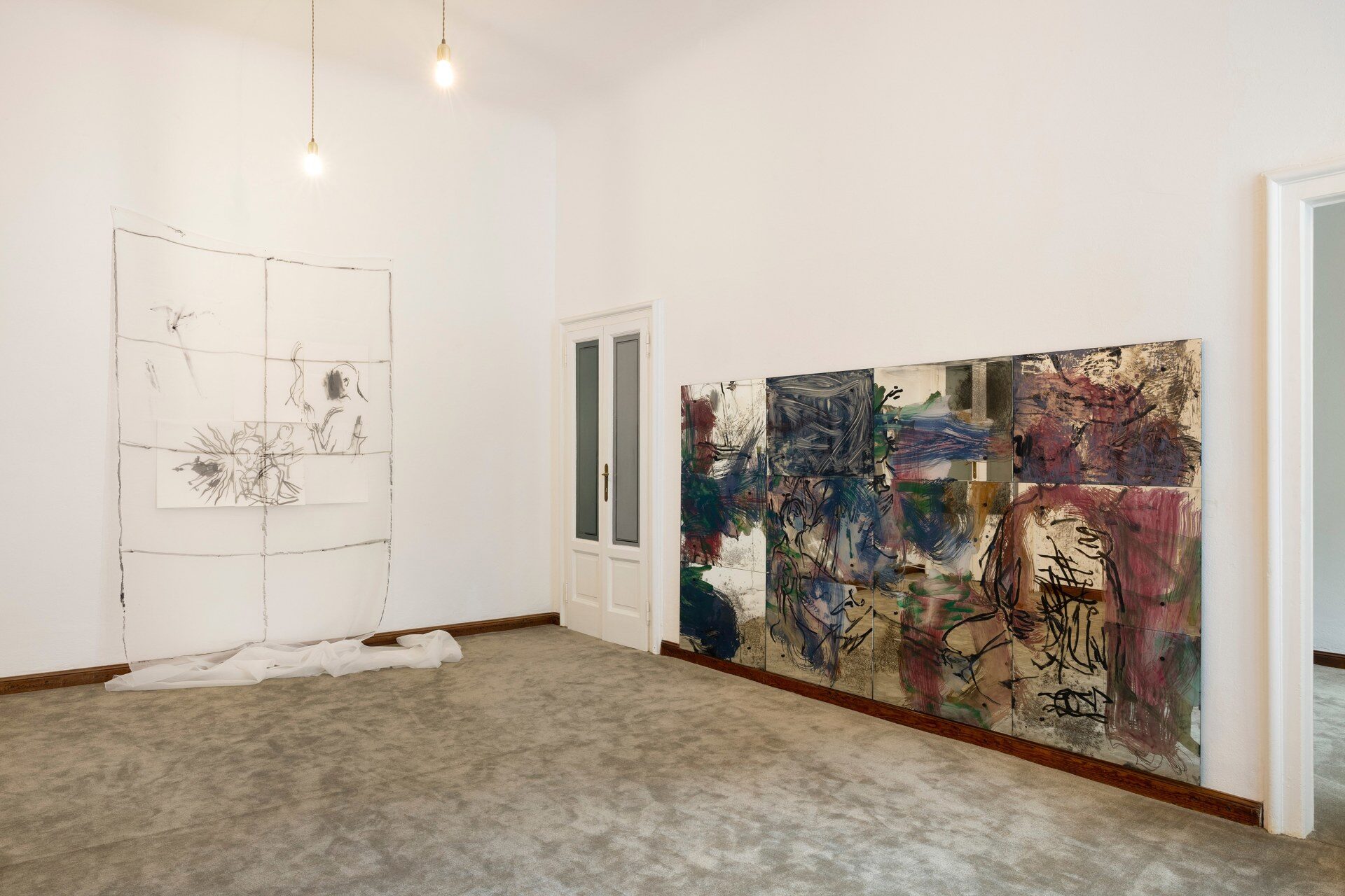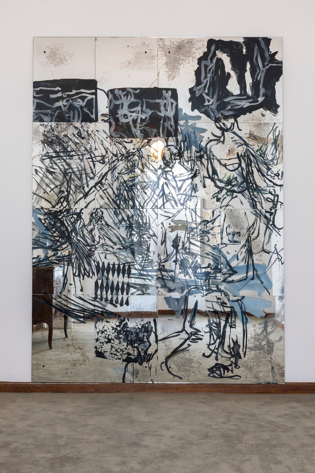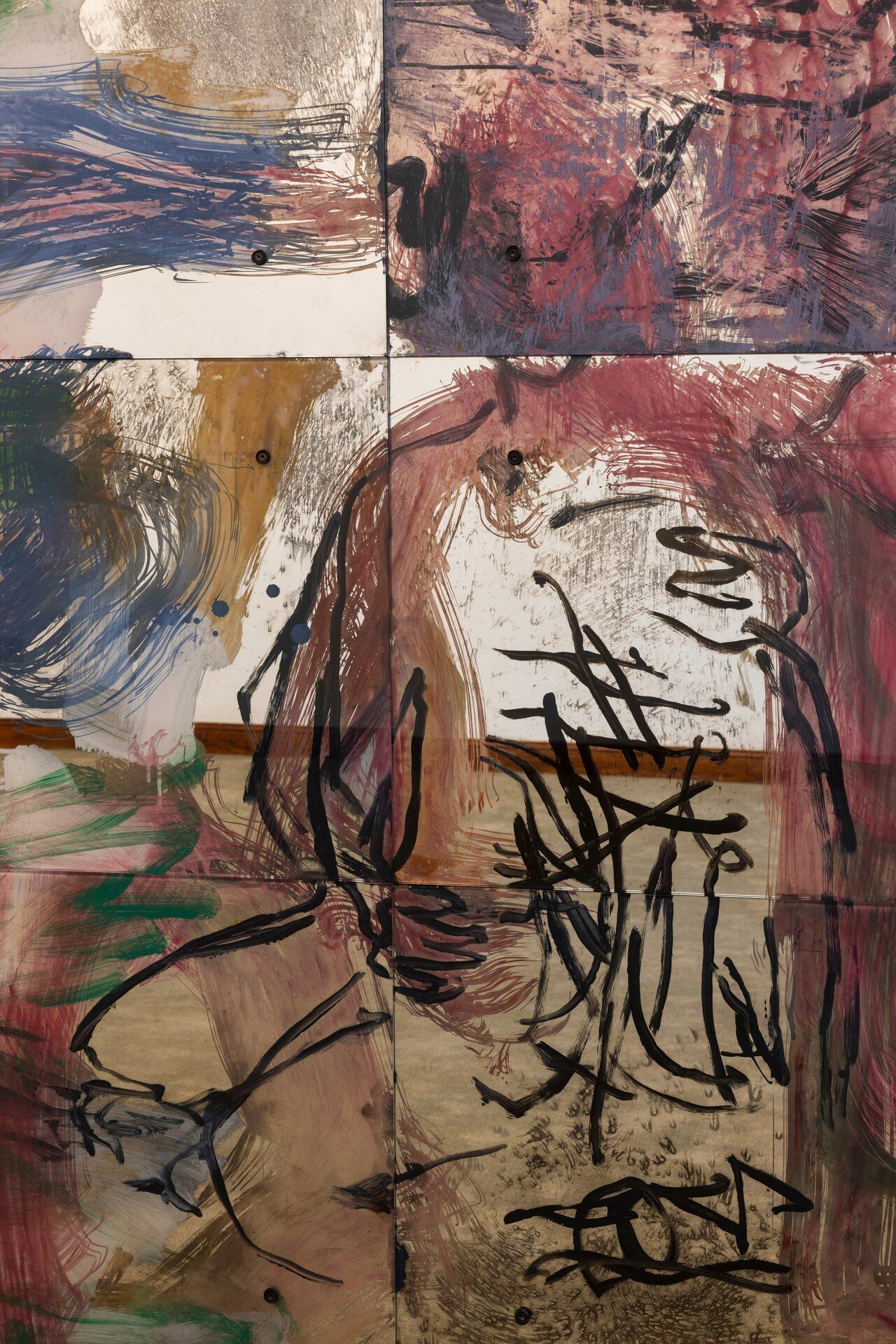 Painting behind glass, Mauss enacts procedures of painting in reverse. Line and color, applied in layers on the verso of the transparent support, produce a meshwork of simultaneous description, figuring fragments of bodies in a gestural vocabulary that shuttles between written language, obliteration, and ornamental cipher. Through a process of silvering, the painted glass is rendered reflective, animated by alchemical swarms of silver deposits and halos of oxidization behind the brushmarks. Corresponding and reacting to the given architecture of the space, and bodies that move in it, these works simultaneously invoke…