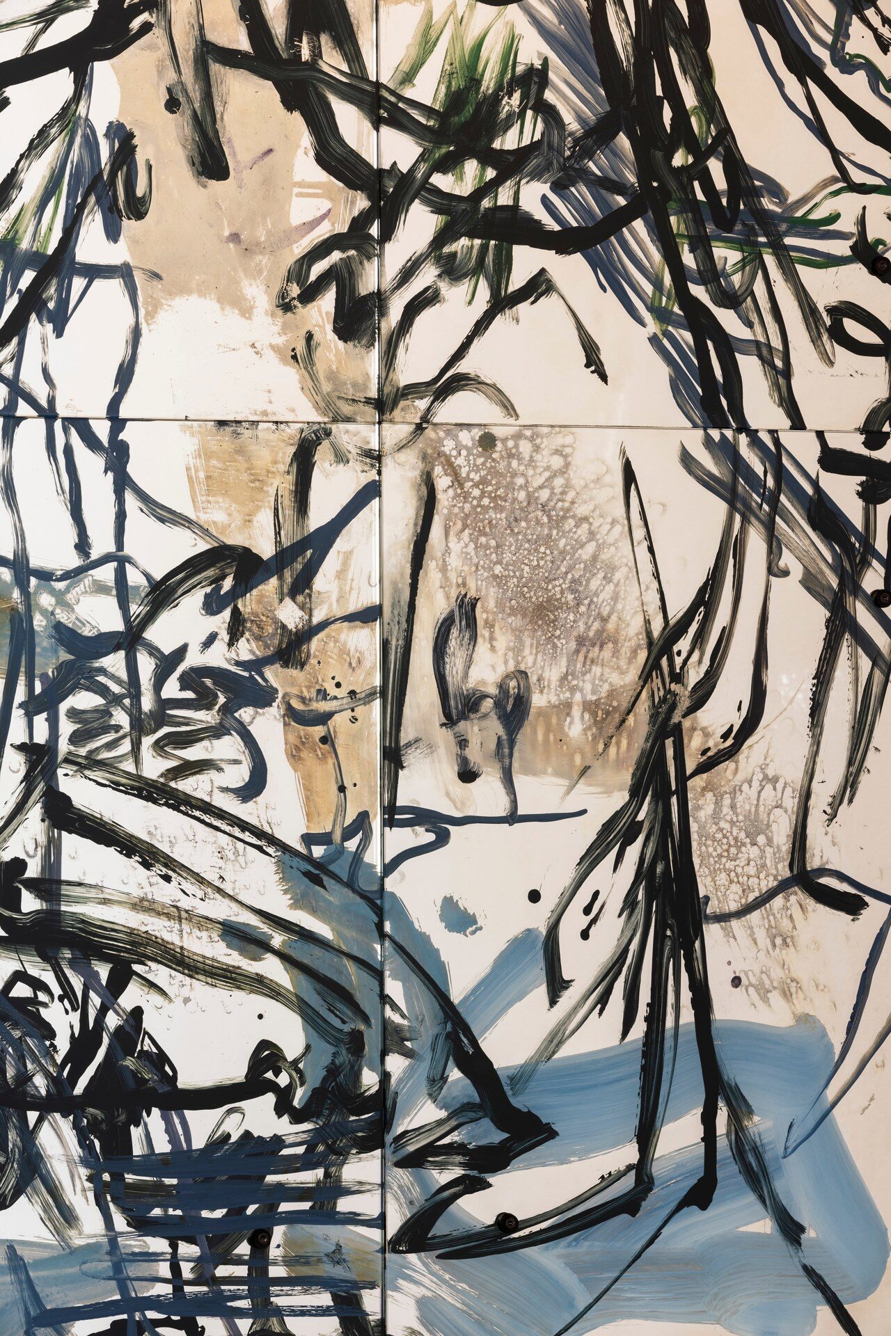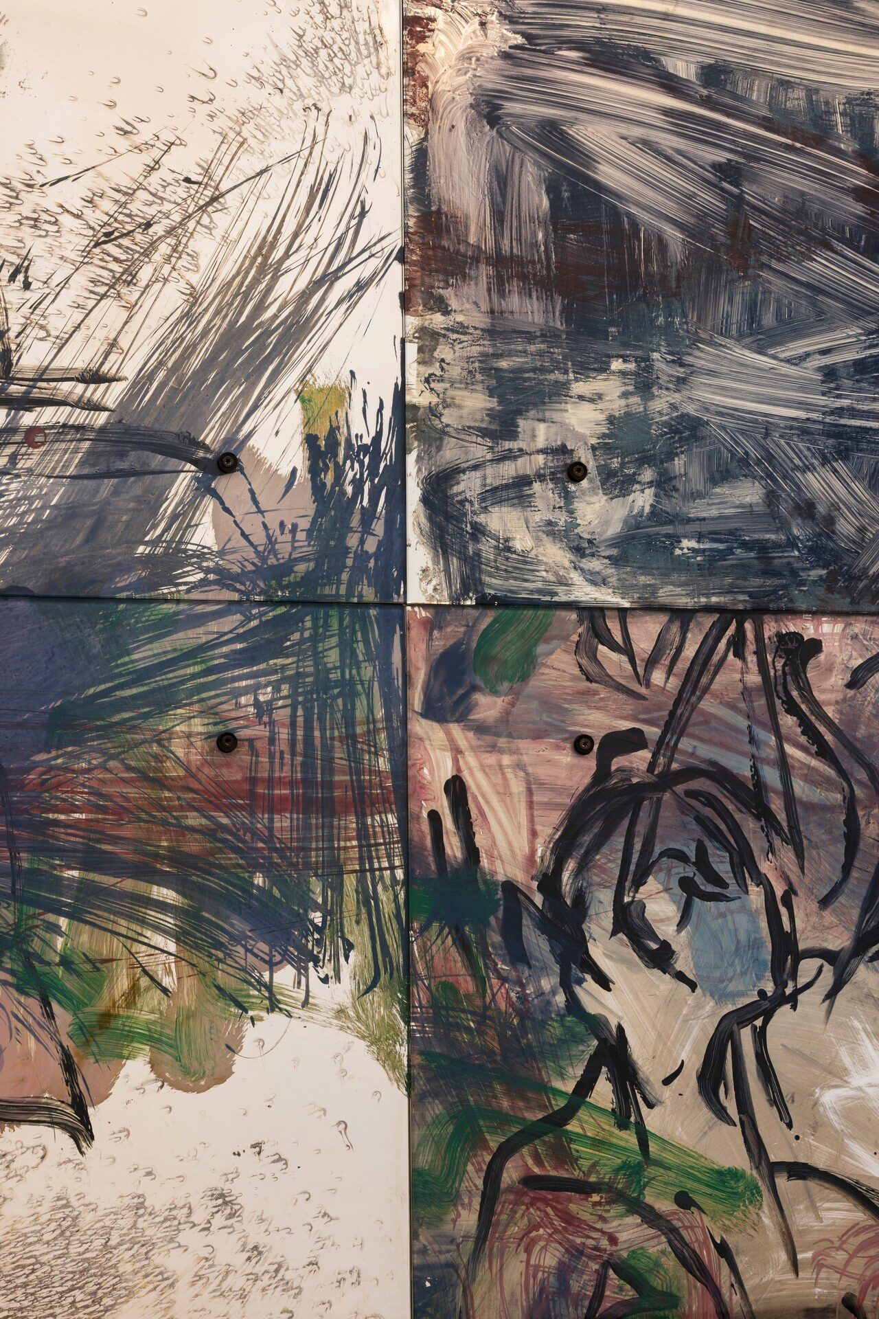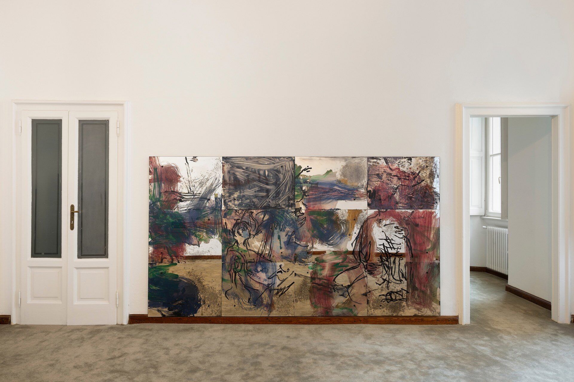 Painting behind glass, Mauss enacts procedures of painting in reverse. Line and color, applied in layers on the verso of the transparent support, produce a meshwork of simultaneous description, figuring fragments of bodies in a gestural vocabulary that shuttles between written language, obliteration, and ornamental cipher. Through a process of silvering, the painted glass is rendered reflective, animated by alchemical swarms of silver deposits and halos of oxidization behind the brushmarks. Corresponding and reacting to the given architecture of the space, and bodies that move in it, these works simultaneously invoke…