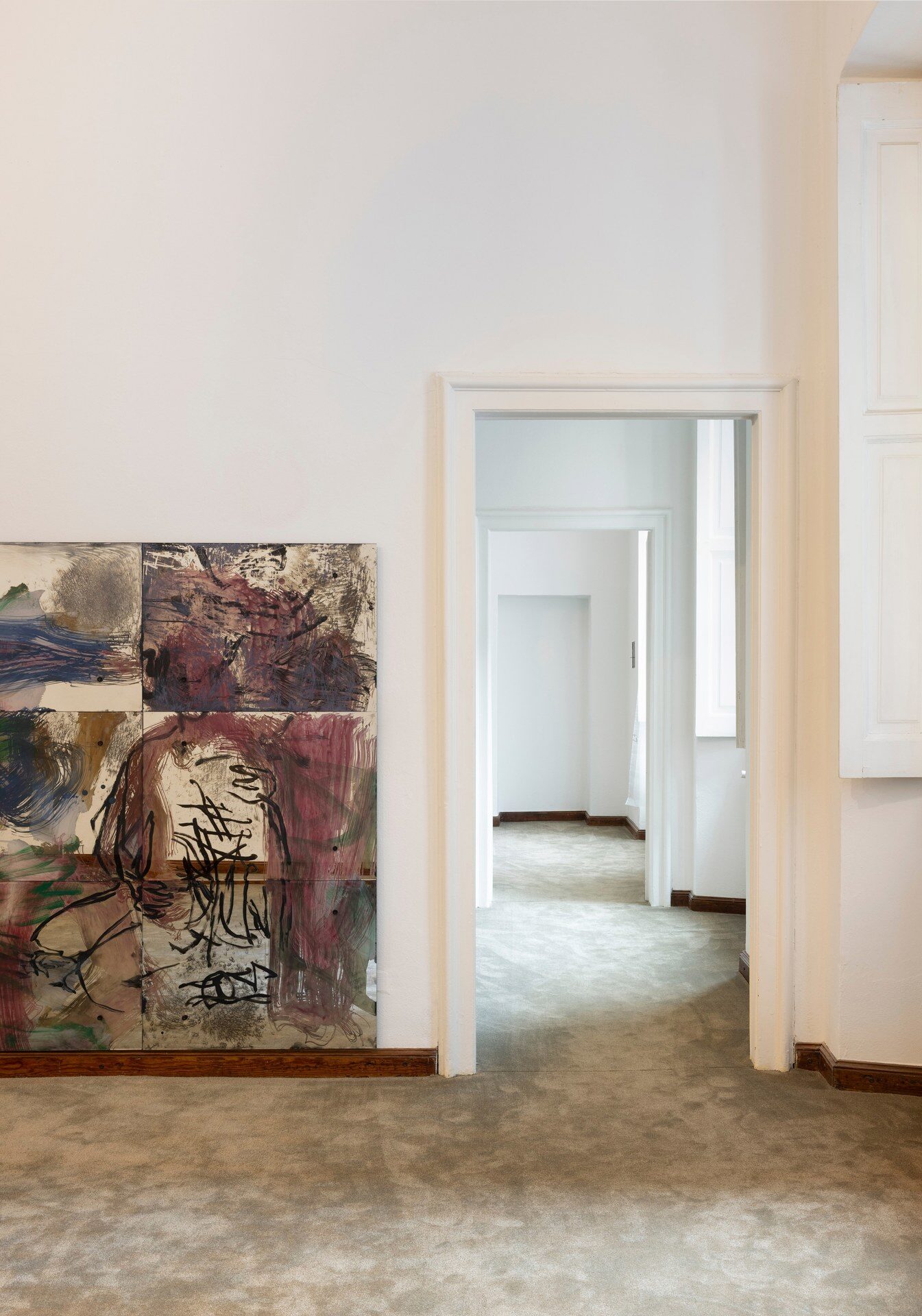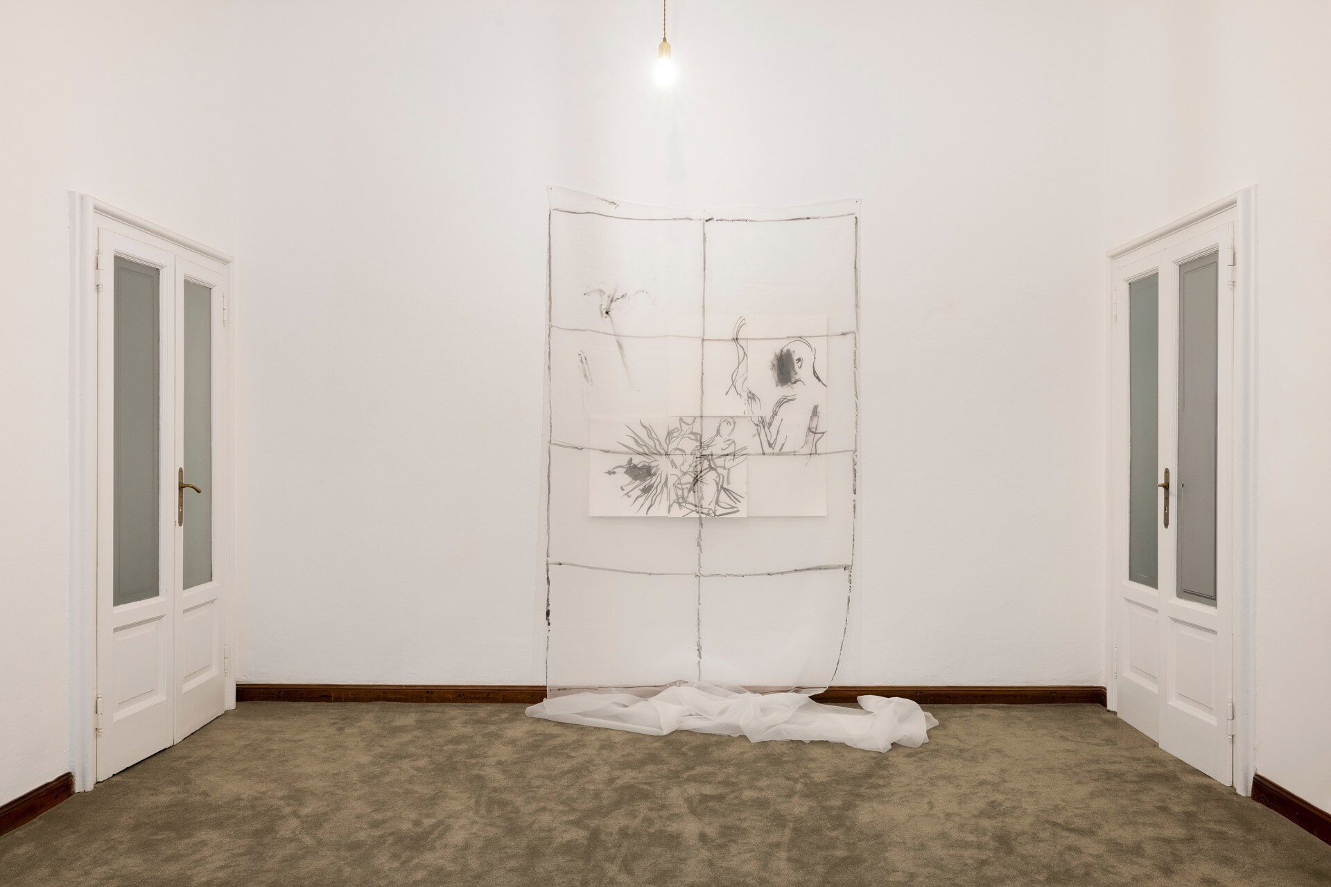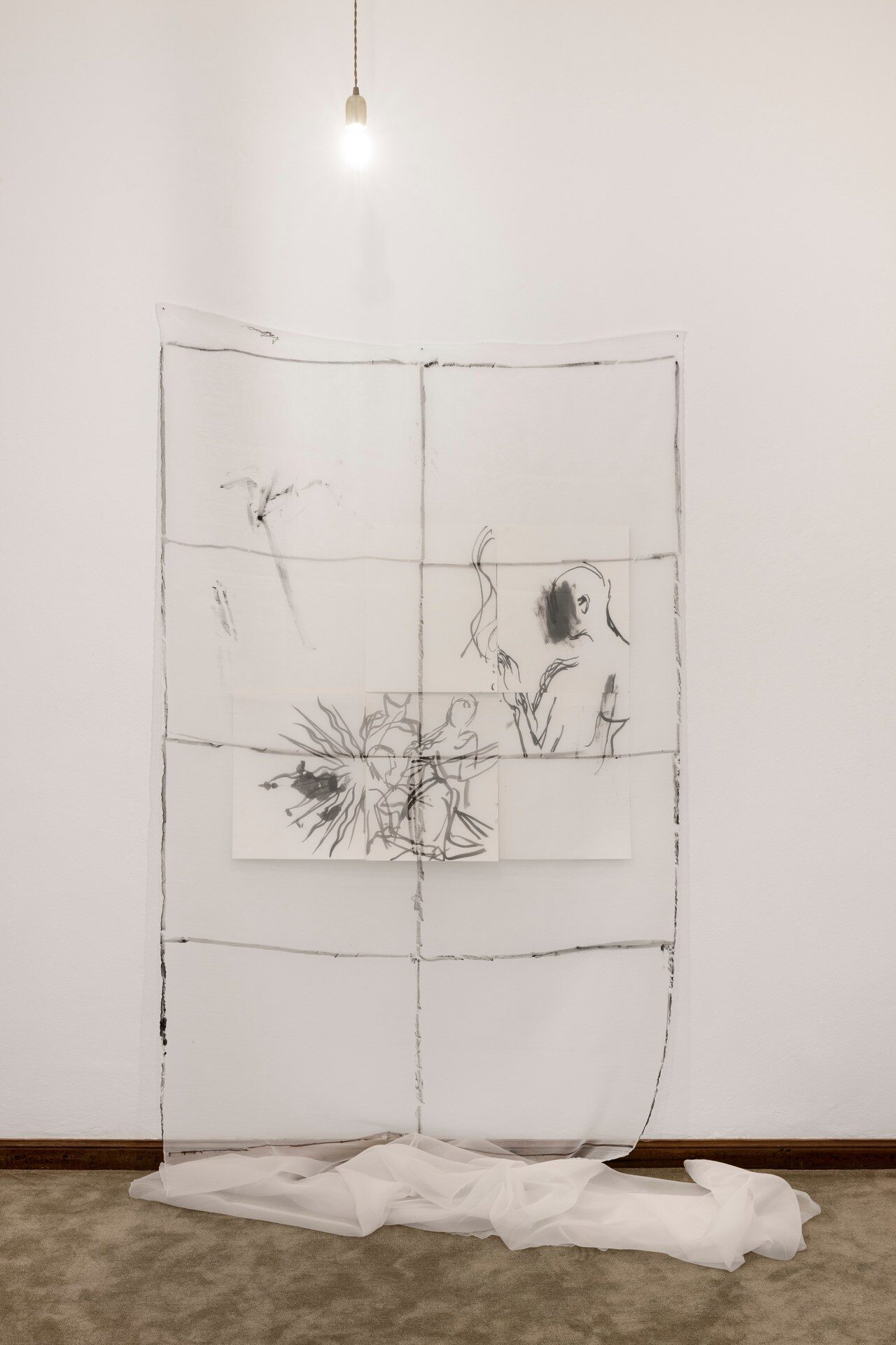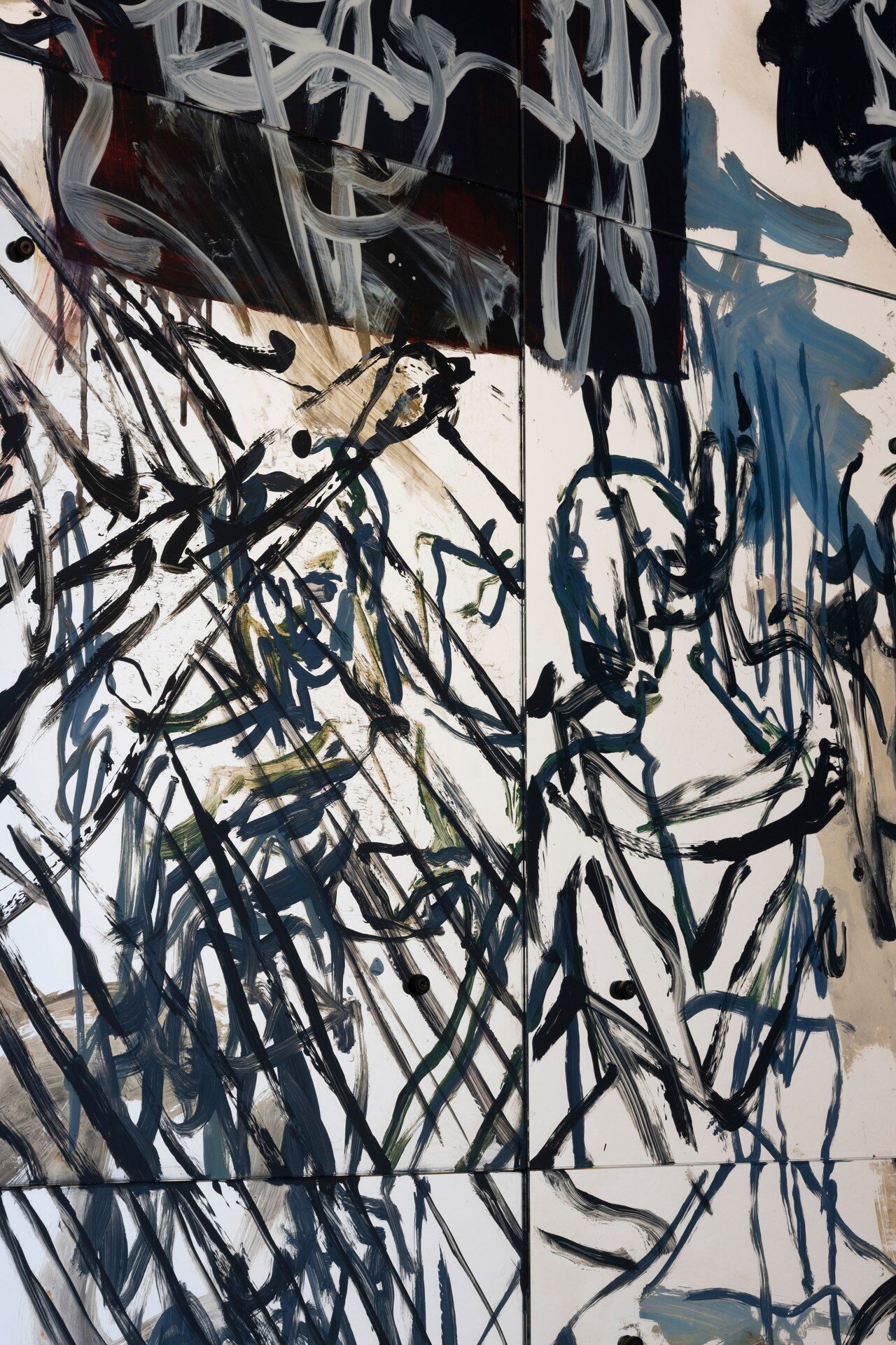 Painting behind glass, Mauss enacts procedures of painting in reverse. Line and color, applied in layers on the verso of the transparent support, produce a meshwork of simultaneous description, figuring fragments of bodies in a gestural vocabulary that shuttles between written language, obliteration, and ornamental cipher. Through a process of silvering, the painted glass is rendered reflective, animated by alchemical swarms of silver deposits and halos of oxidization behind the brushmarks. Corresponding and reacting to the given architecture of the space, and bodies that move in it, these works simultaneously invoke…
