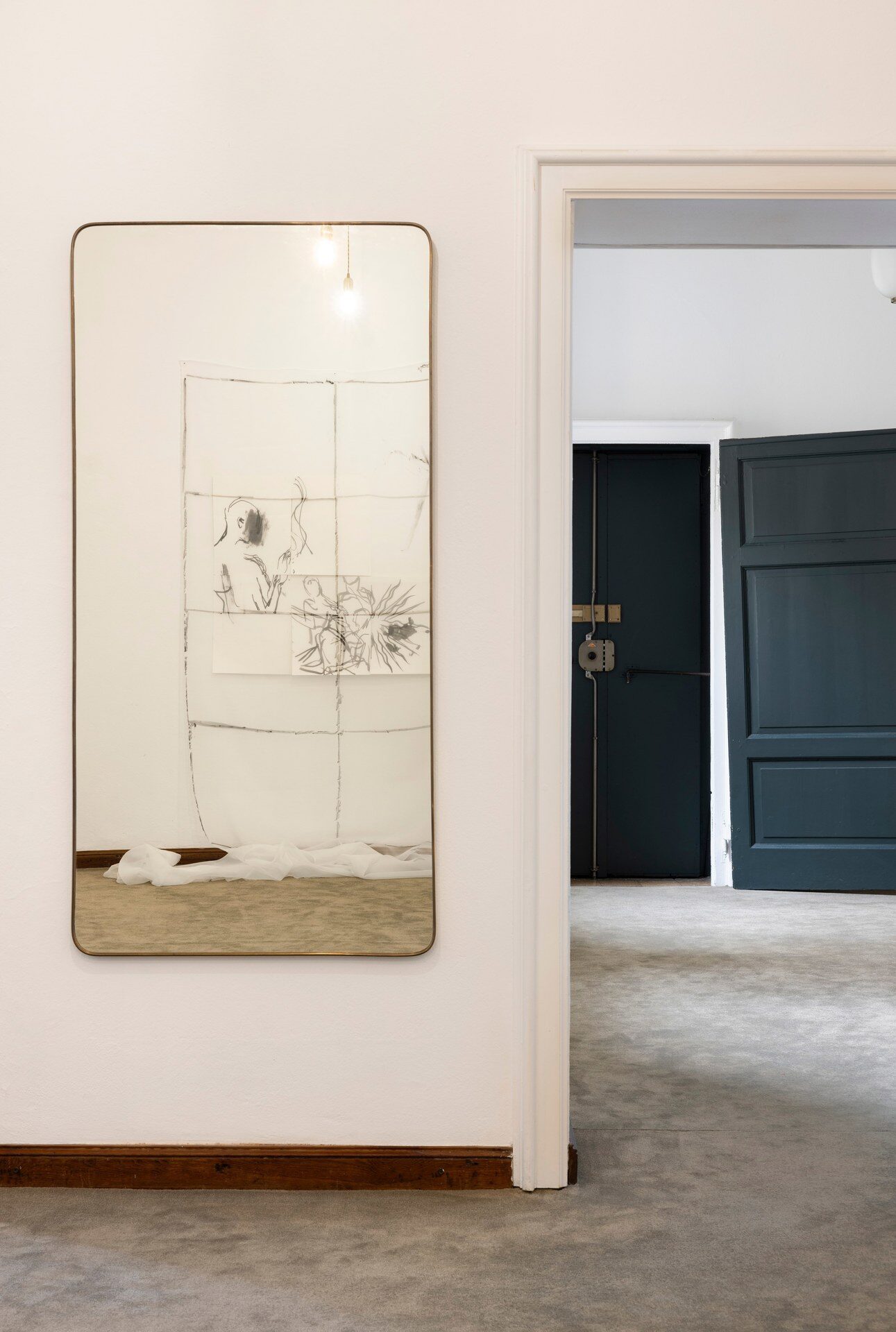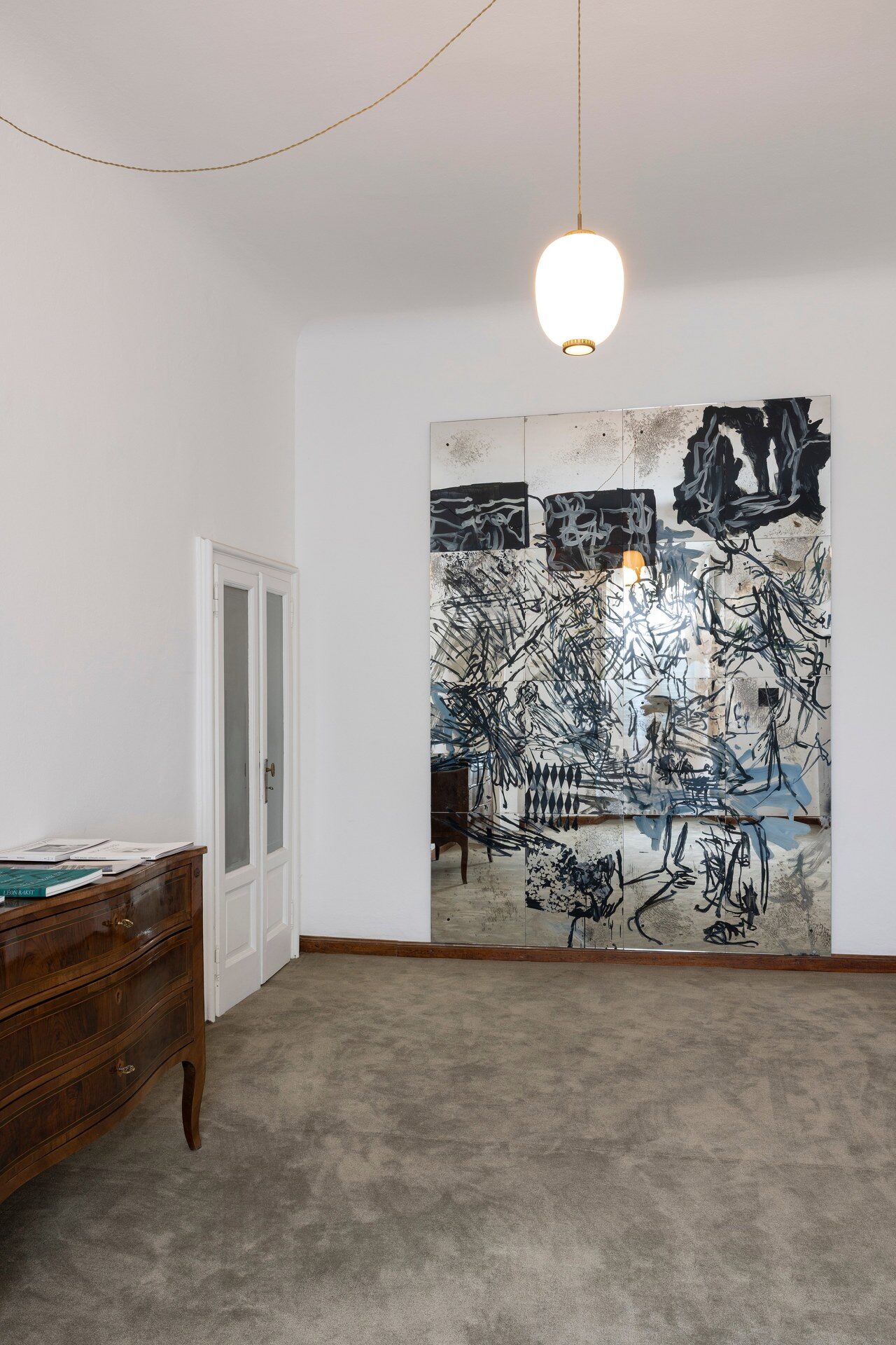 For his exhibition at 48, Foro Bonaparte, Nick Mauss juxtaposes two mirrored murals and a drawing on paper and voile in an apartment that appears suspended in a state of ambiguous habitation -- not yet, or no longer, lived in or vacated.
