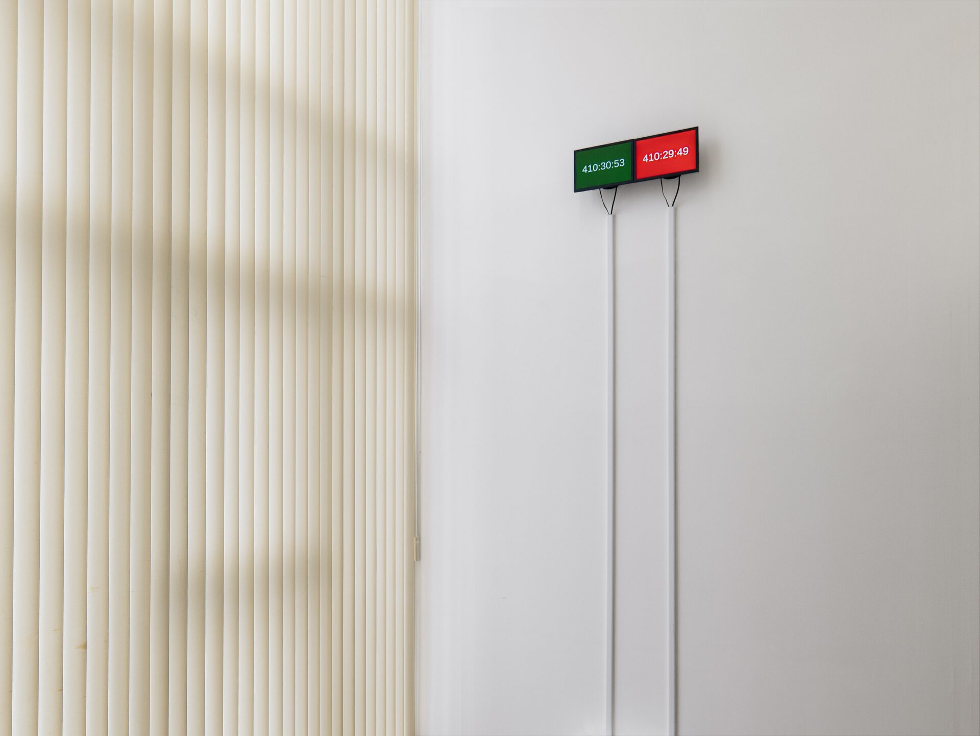 The cross section is made literal between the vertical gallery window and its thin descending blinds and the lateral, heavy vectors of the gallery’s shelves which visually extend and match to the Overground Line at Haggerston Station visible through the window.
