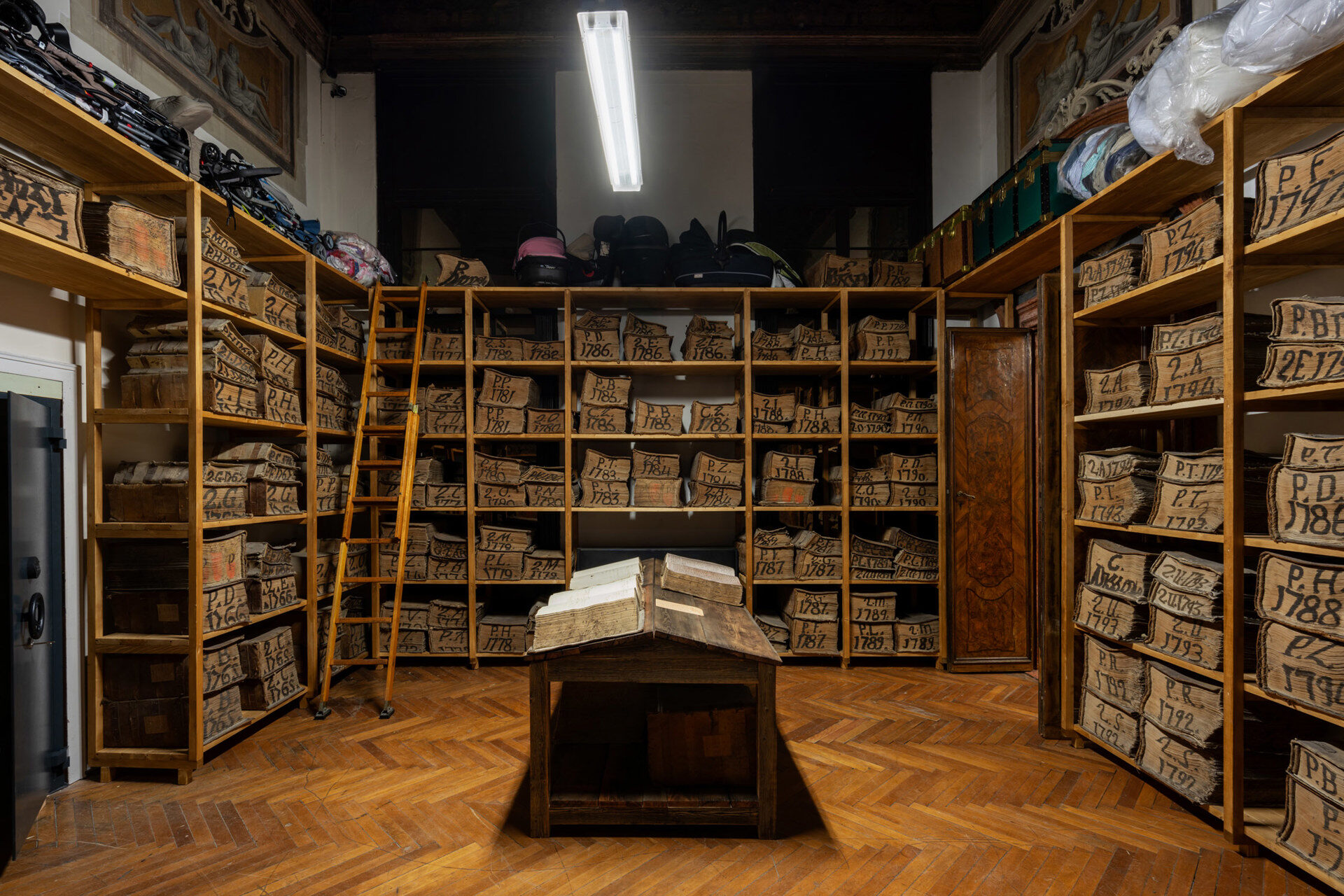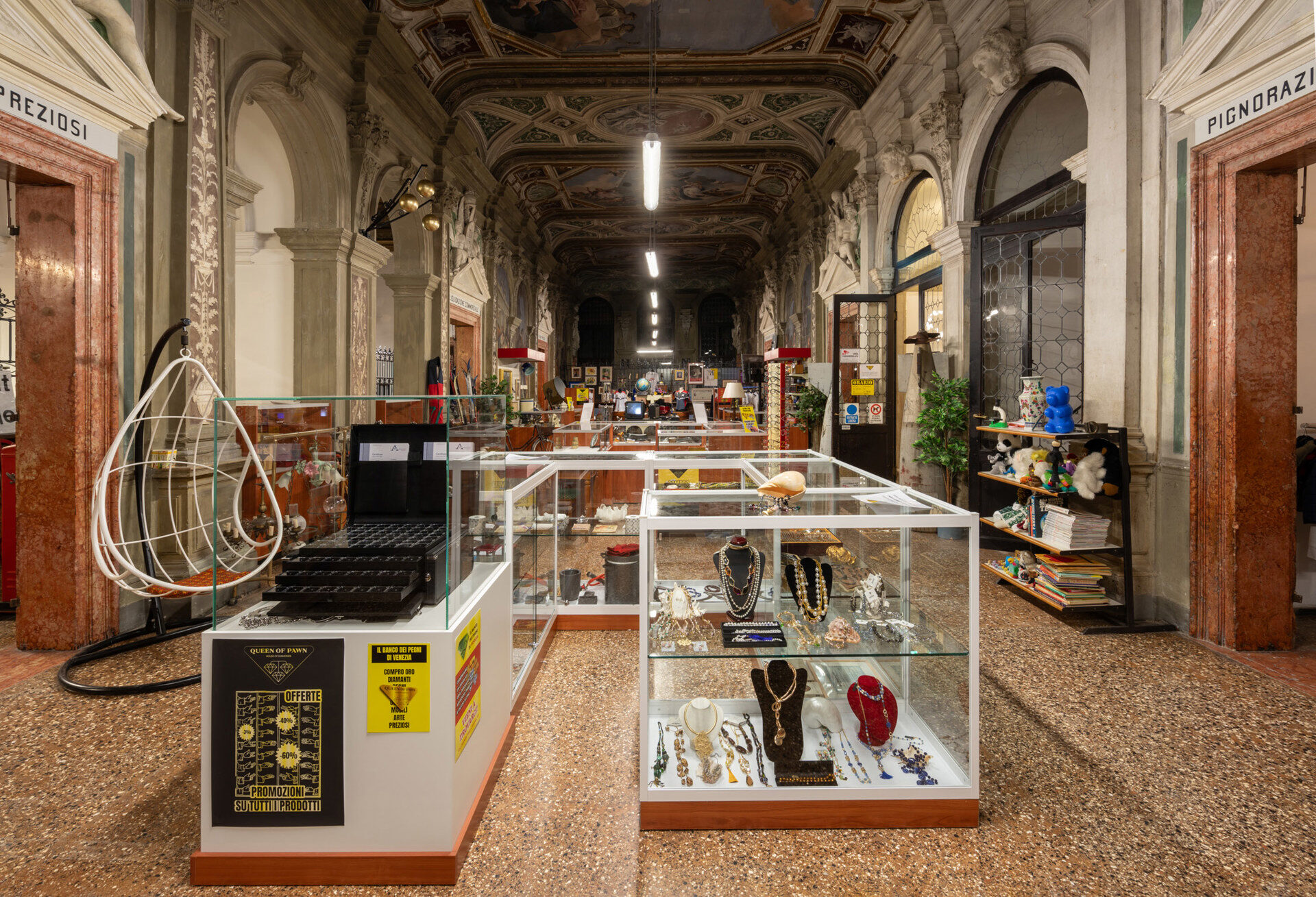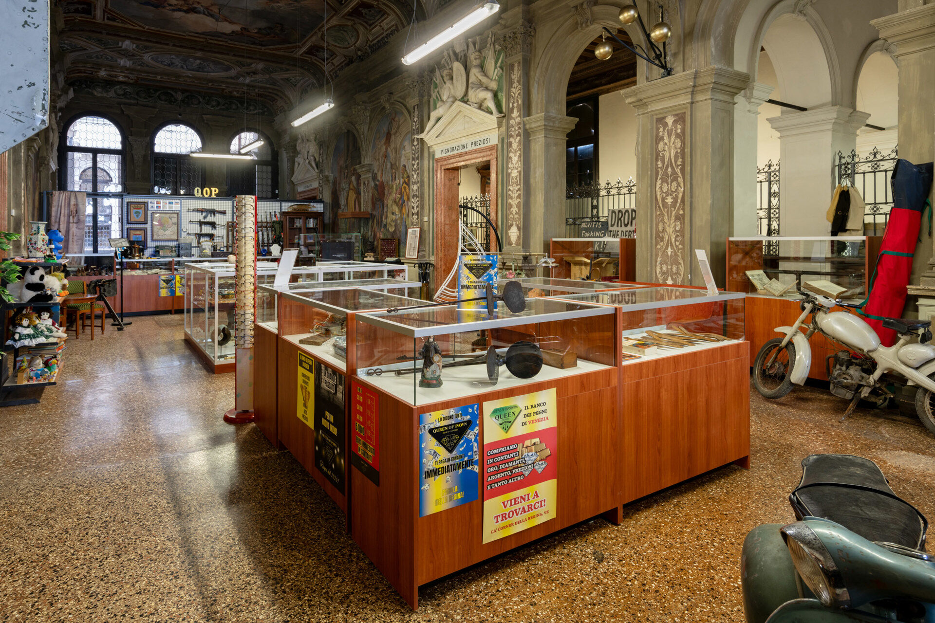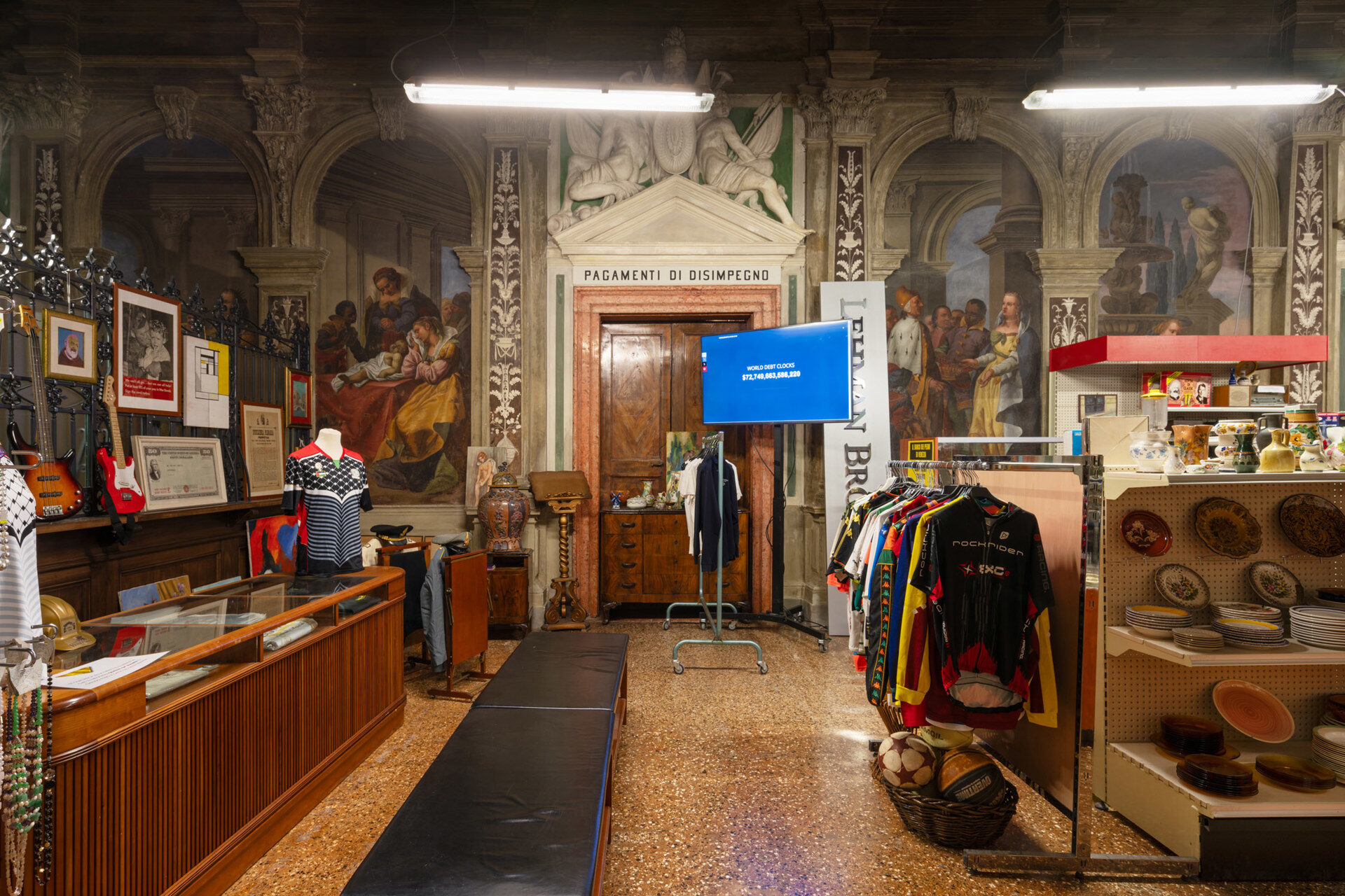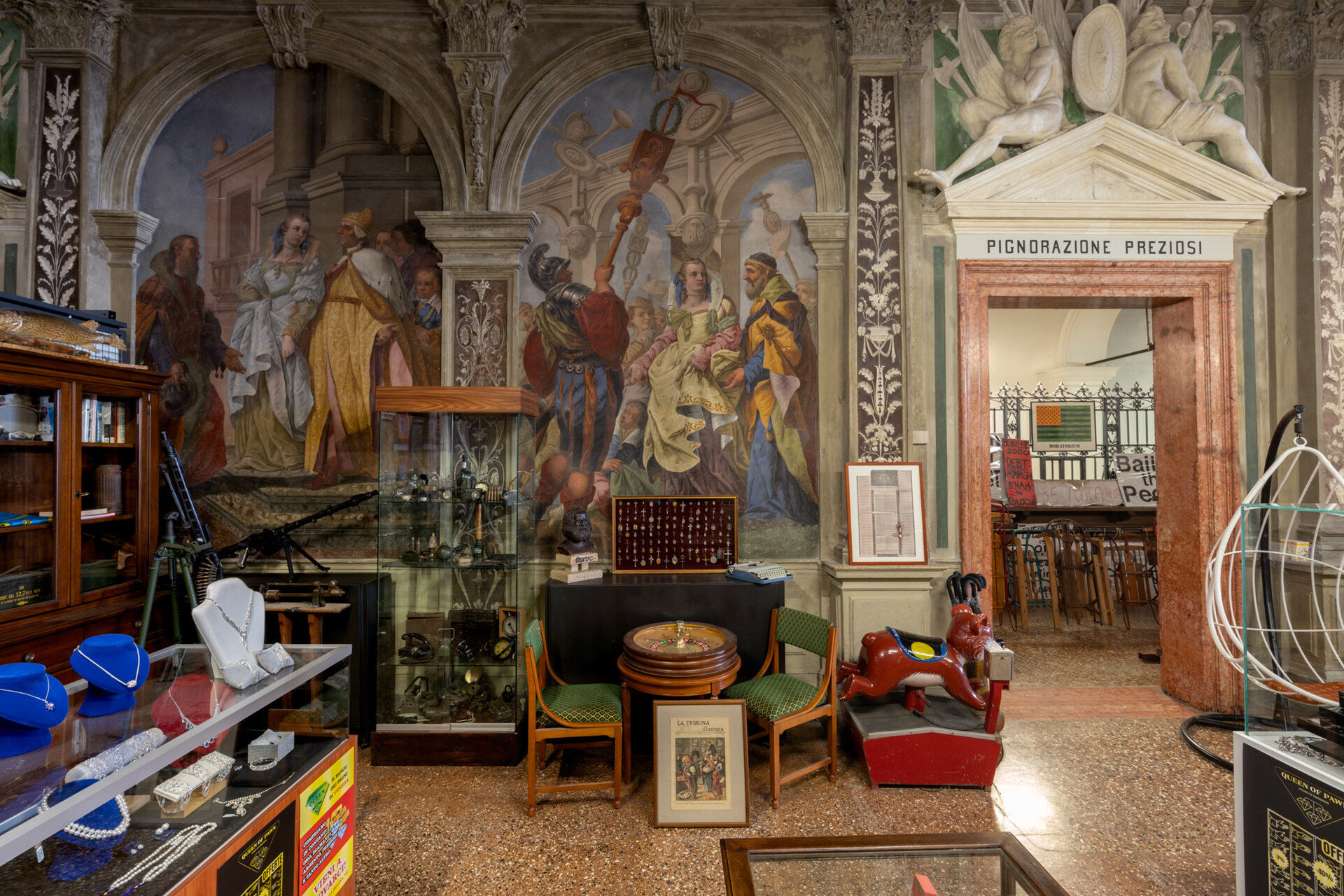 The layered history of the 18th-century palazzo Ca’ Corner della Regina – venue of the Monte di Pietà (Mount of Piety) of Venice from 1834 to 1969 and since 2011 permanent venue of Fondazione Prada – is Büchel’s framework for constructing an articulated network of spatial, economic, and cultural references. “Monte di Pietà” is a deep dive into the notion of debt as the root of human society and the primary vehicle by which political and cultural power is exercised. Historically, a crossroads of commercial and artistic exchange and intermingling, the city of Venice is an ideal context for exploring the relationships between these complex topics and the deep dynamics of contemporary society.