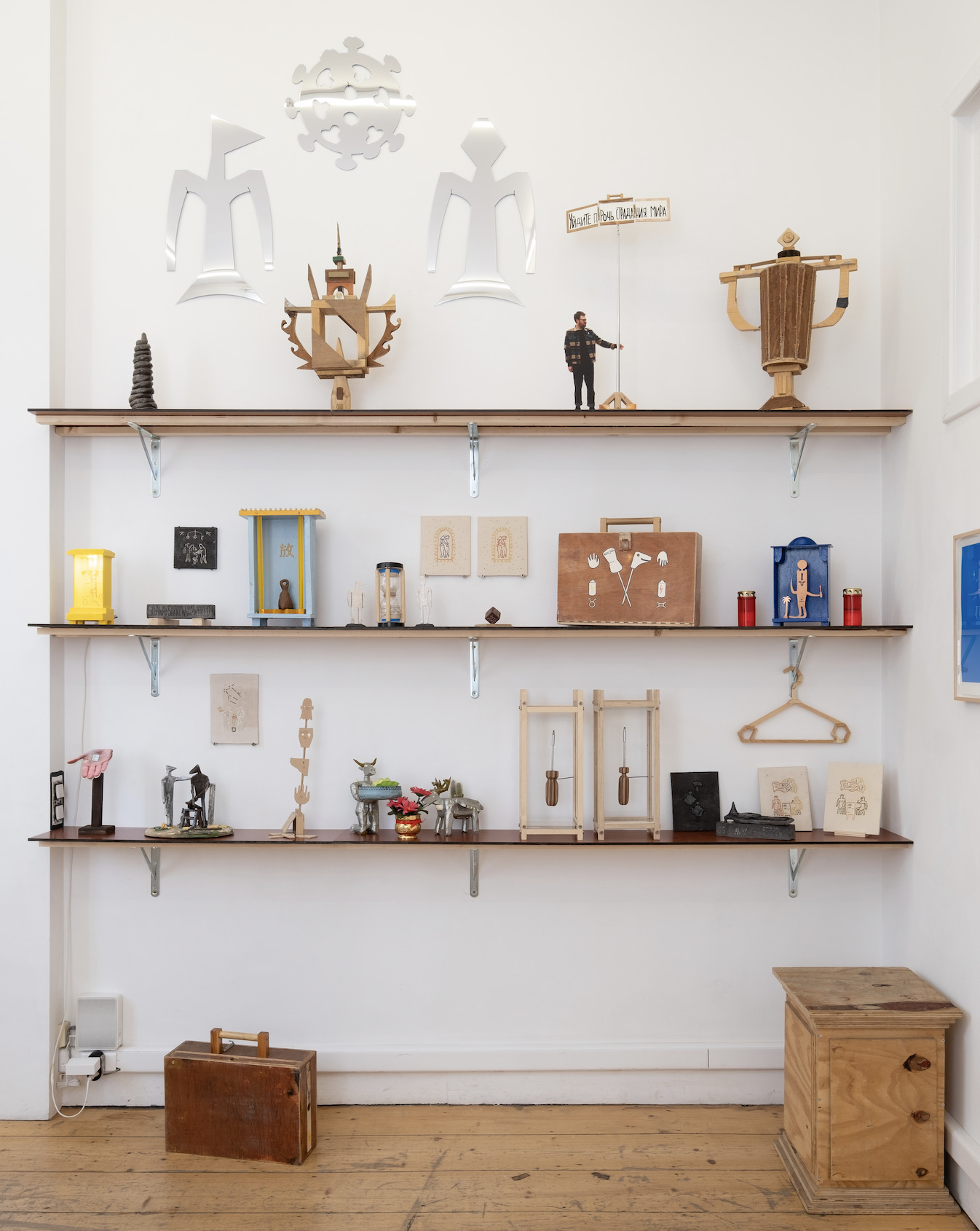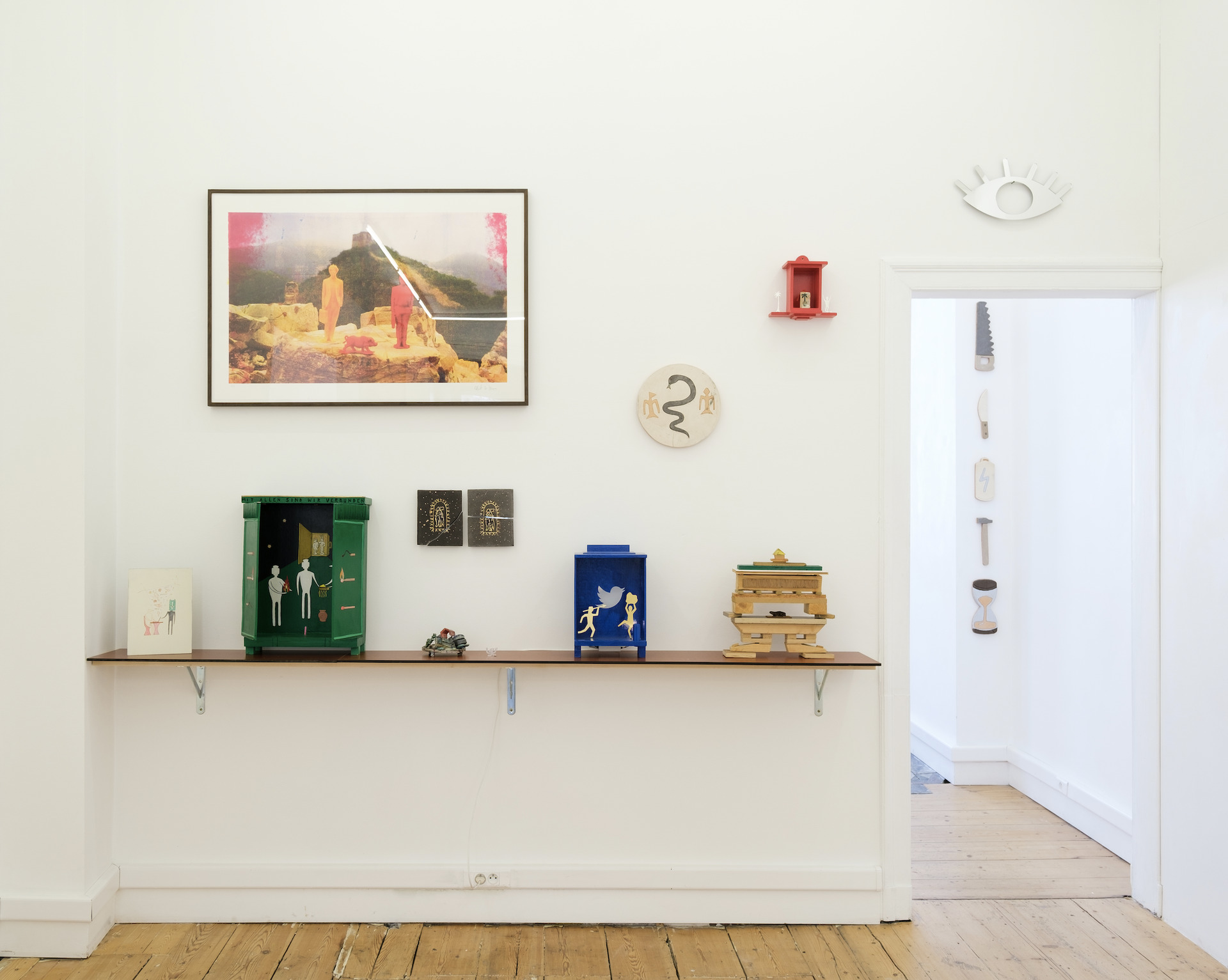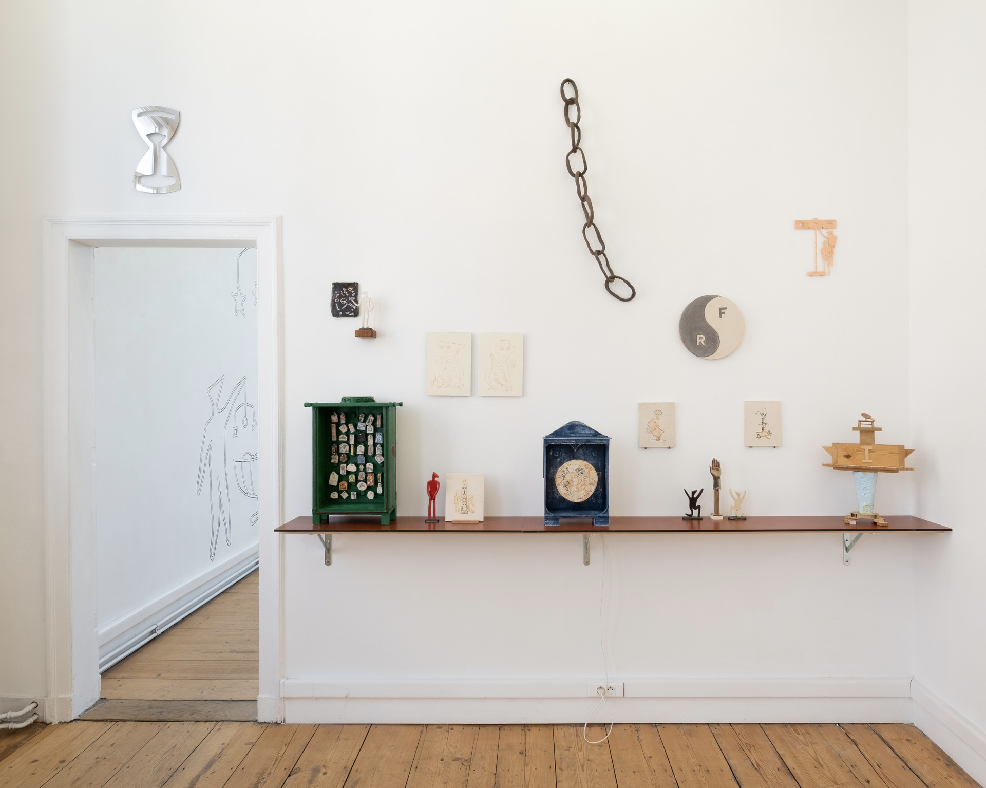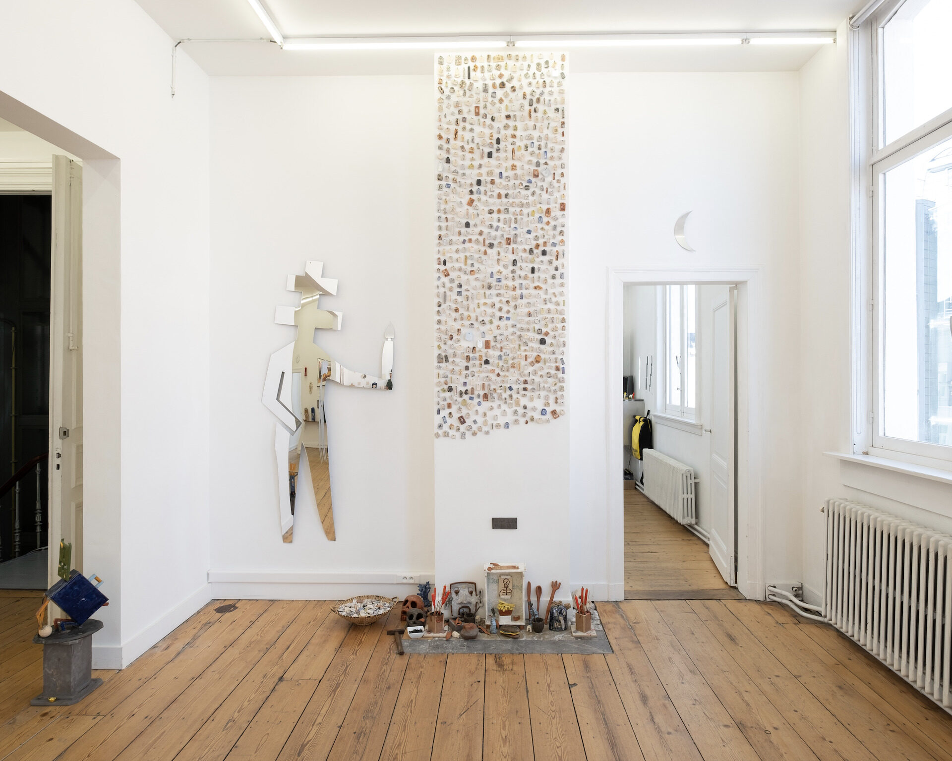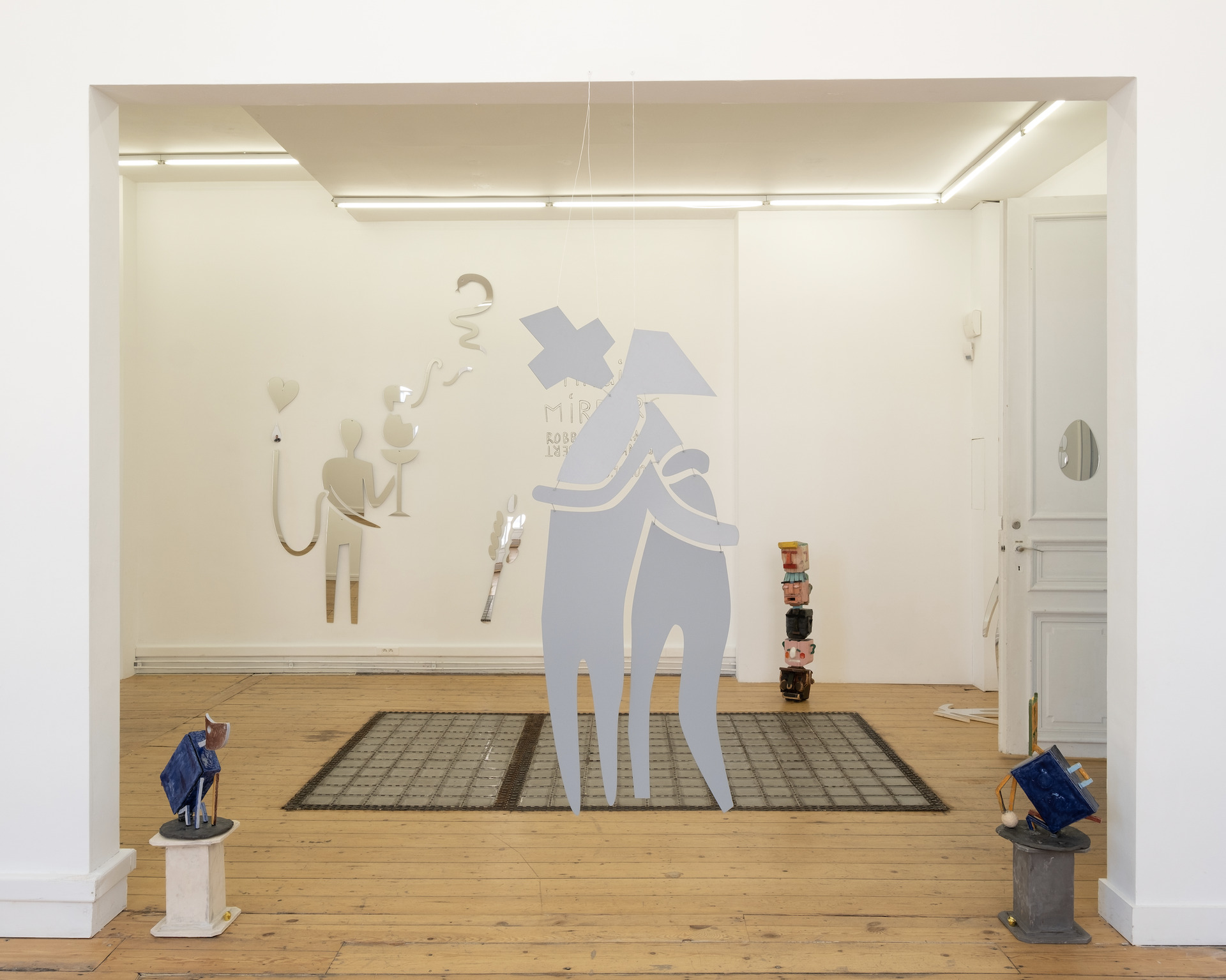 "Magic Mirrors" was the first solo exhibition by Robbert&Frank Frank&Robbert (R&F F&R) at FRED&FERRY Gallery in Antwerp (BE). It took place from September 5 to October 9, 2021. A new series of works was created especially for this exhibition. Frank and Robbert transformed drawings and clay tablets into large massive plexiglass mirrors. Doing so, the artists played with the concepts of spiritual mirroring, but also theme park hall of mirrors and fairs; think of Coney Island, circus and carnival. But... a little bit different. The mirrors were often a combination of humor with serious reflections, placing the perception of both the maker and the viewer at the center. Hints to the COVID pandemic and international politics were never far-off. The exhibition was characterized by an "informed naivety" and "pragmatic idealism." Frank and Robbert combined the magic mirrors with a series of small rituals; hammering amulets into the wall, shredding personal sorrows, doing a little blood magic…