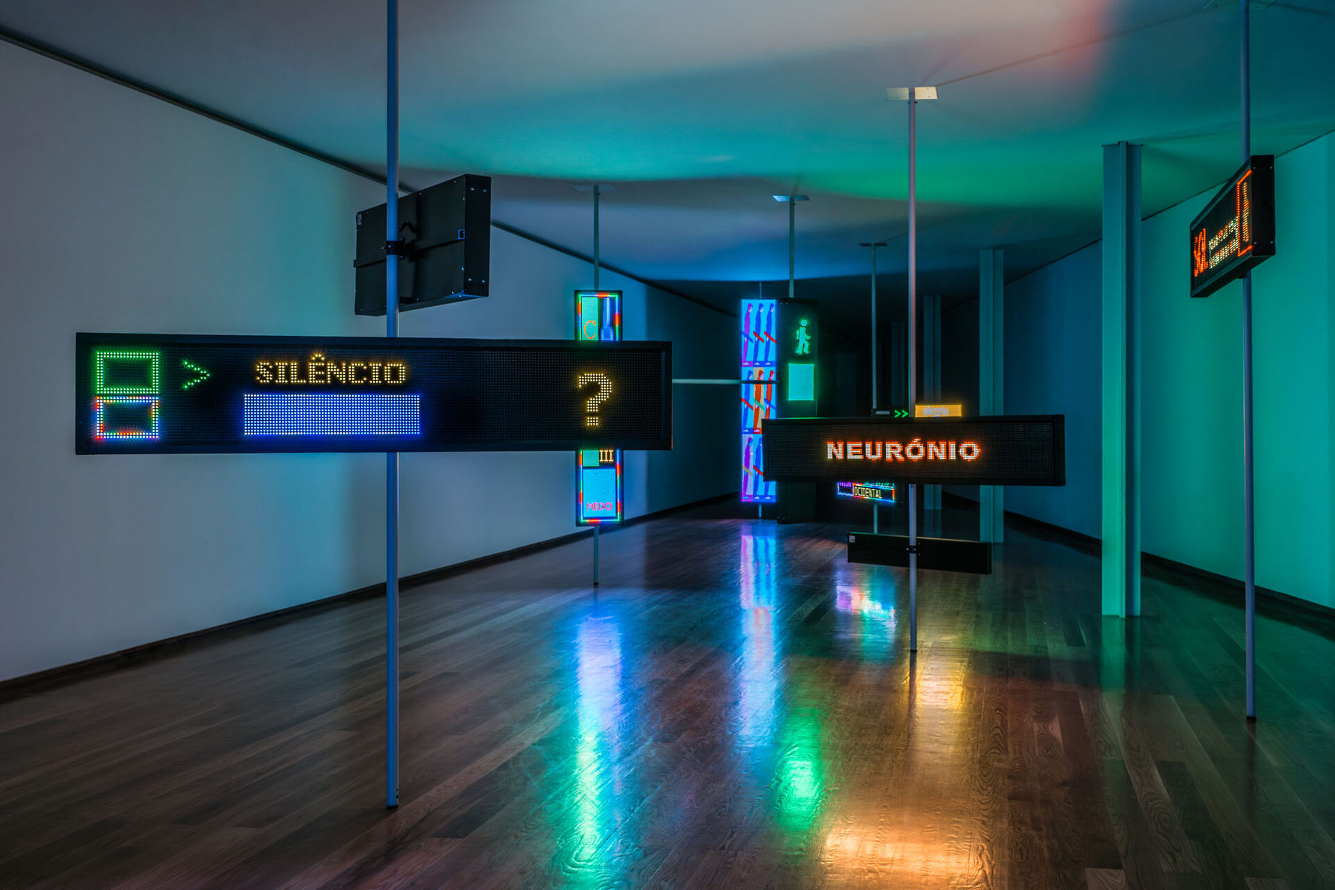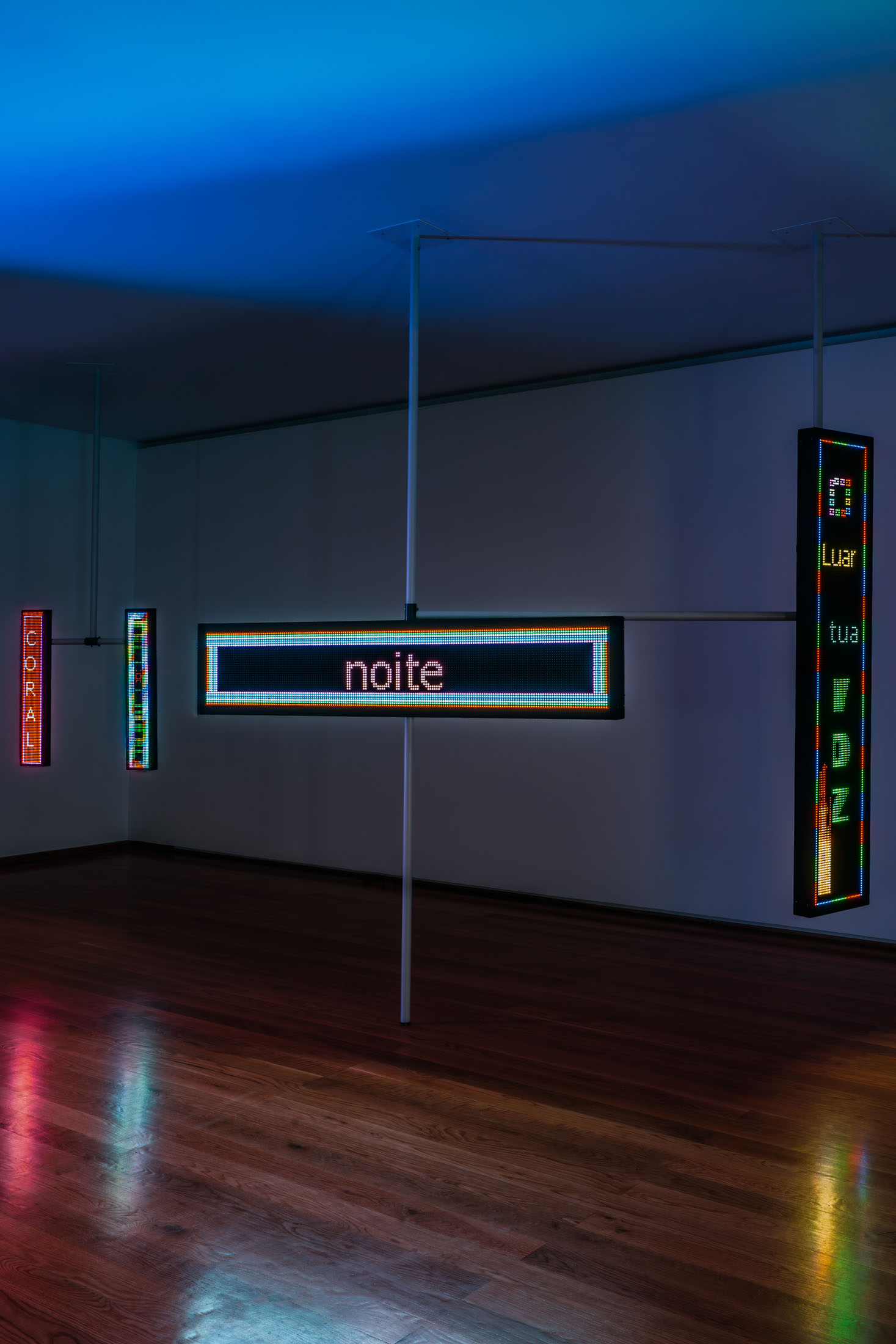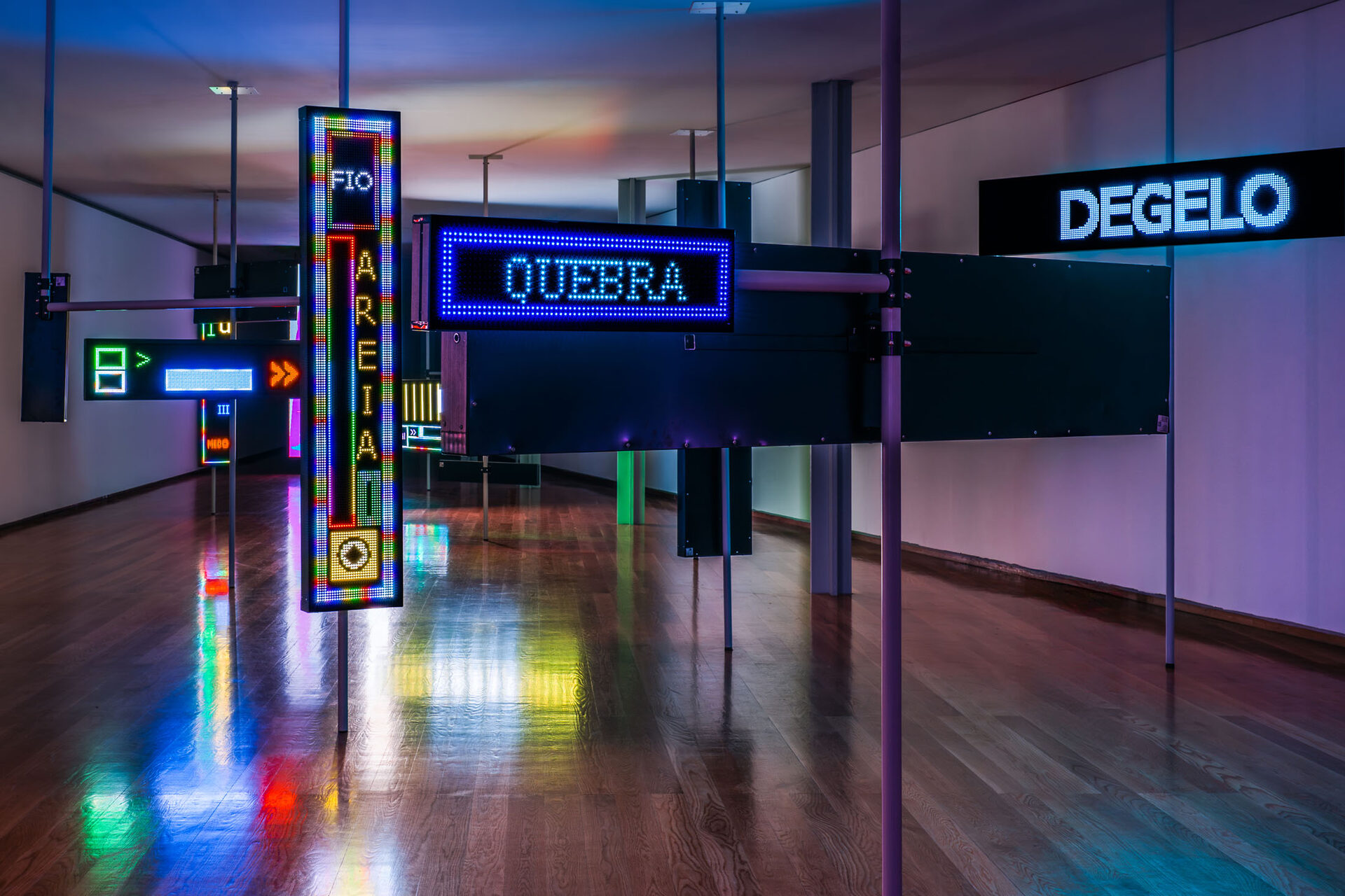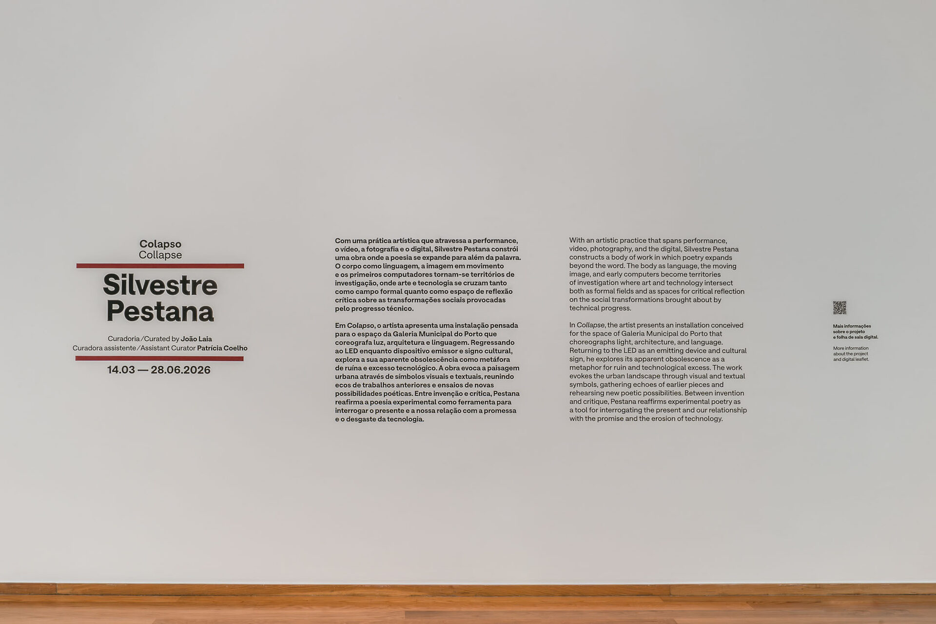In Collapse, the artist presents an installation conceived for the space of Galeria Municipal do Porto that choreographs light, architecture, and language. Returning to the LED as an emitting device and cultural sign, he explores its apparent obsolescence as a metaphor for ruin and technological excess. The work evokes the urban landscape through visual and textual symbols, gathering echoes of earlier pieces and rehearsing new poetic possibilities. Between invention and critique, Pestana reaffirms experimental poetry as a tool for interrogating the present and our…