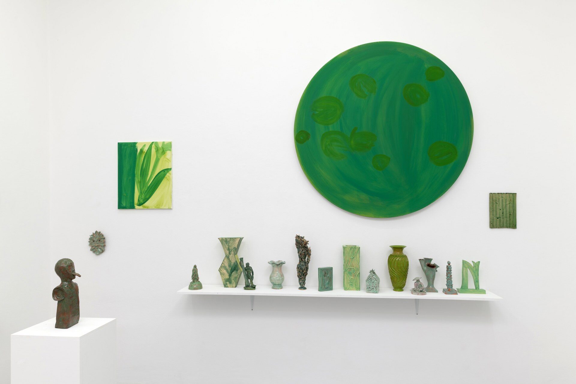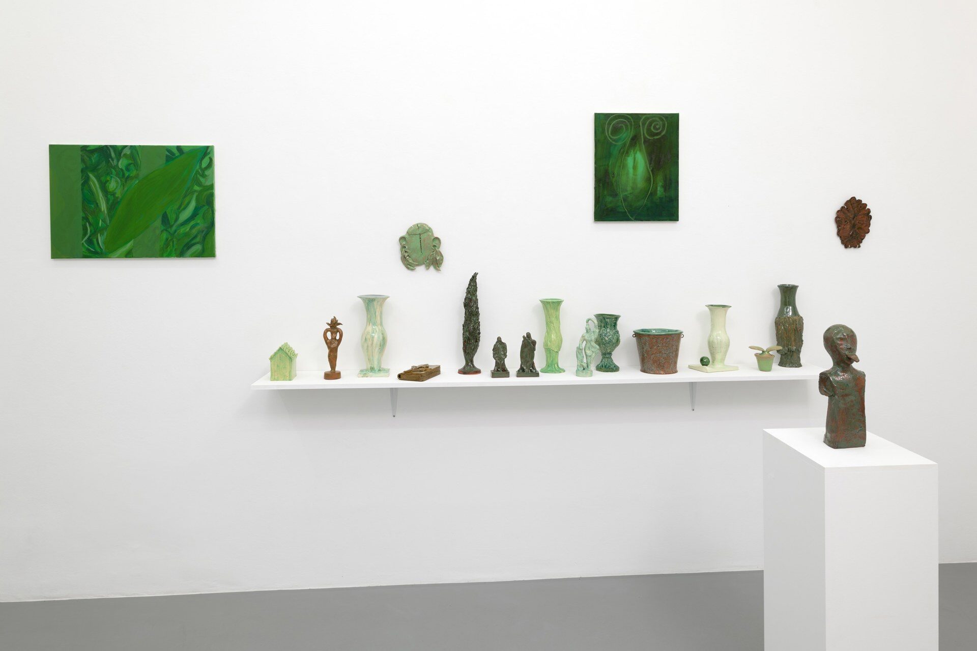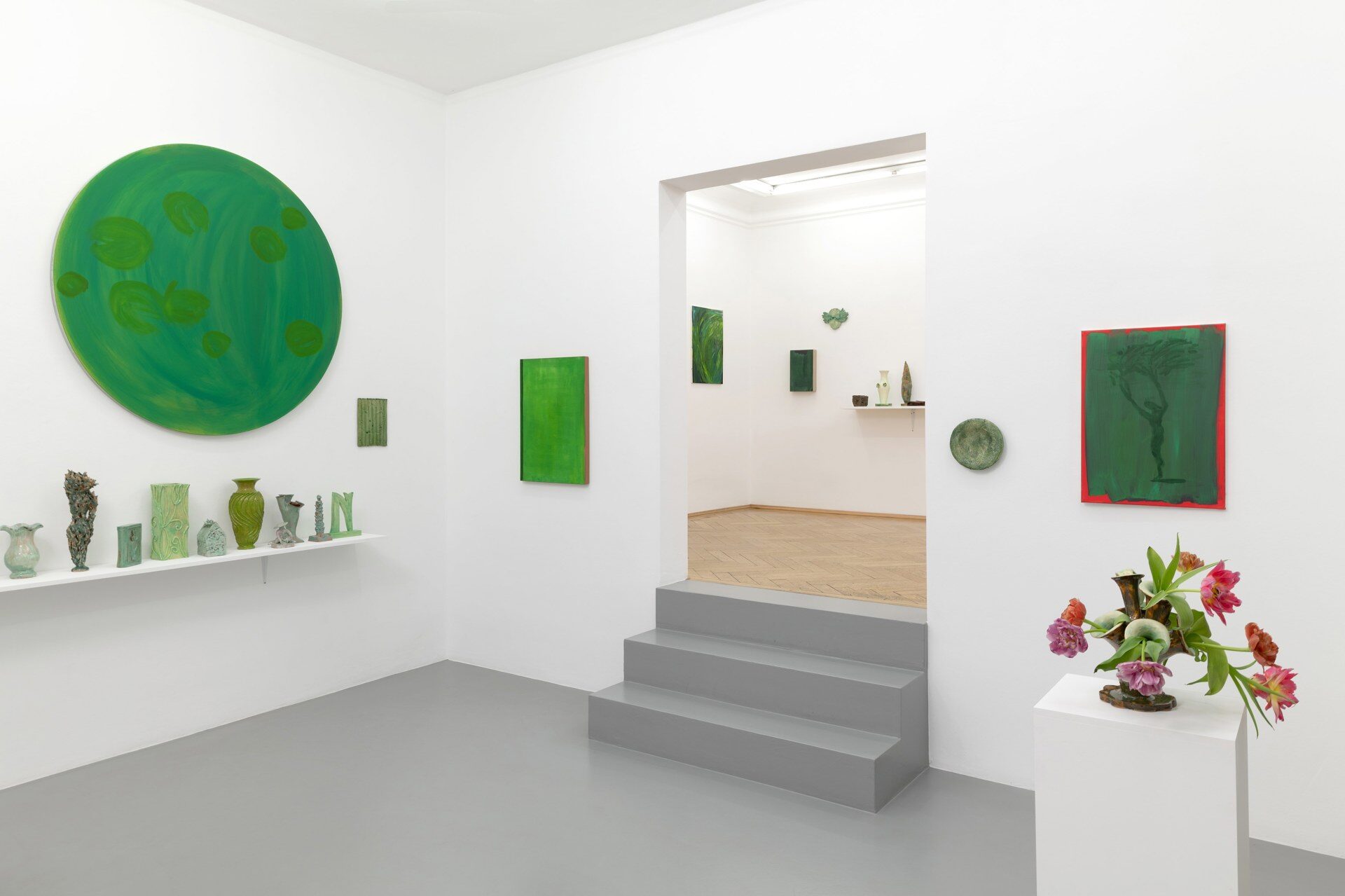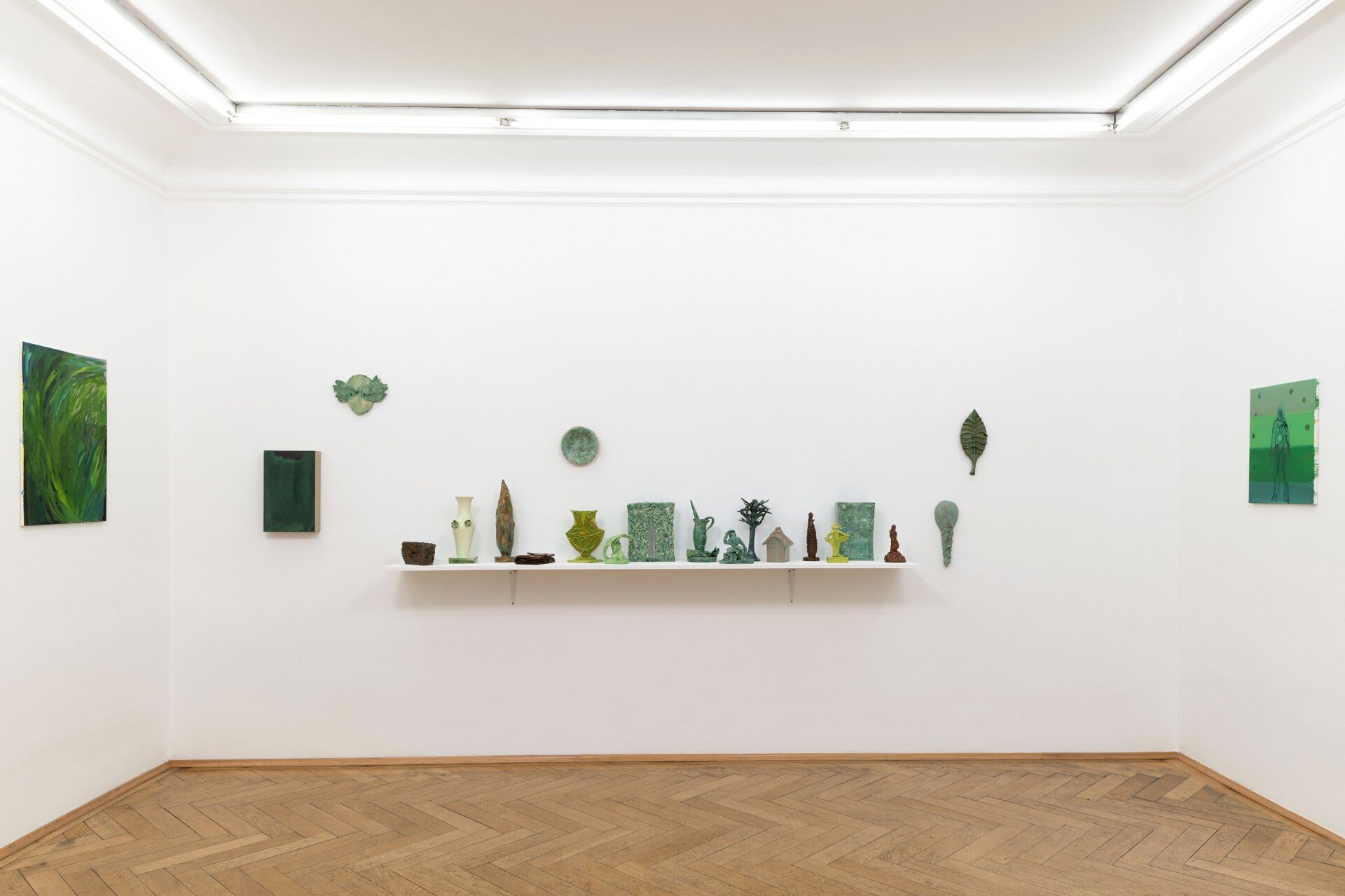 The title of the exhibition, grünende (greening), refers not only to green as a color but also to greening as an activity in nature—and an expression of growth and transformation. Ovid’s Metamorphosis vividly describes Daphne’s transformation into a tree: “…Her hair to leaves, her arms extend to boughs…” Rößner presents paintings and ceramics in shades of green.