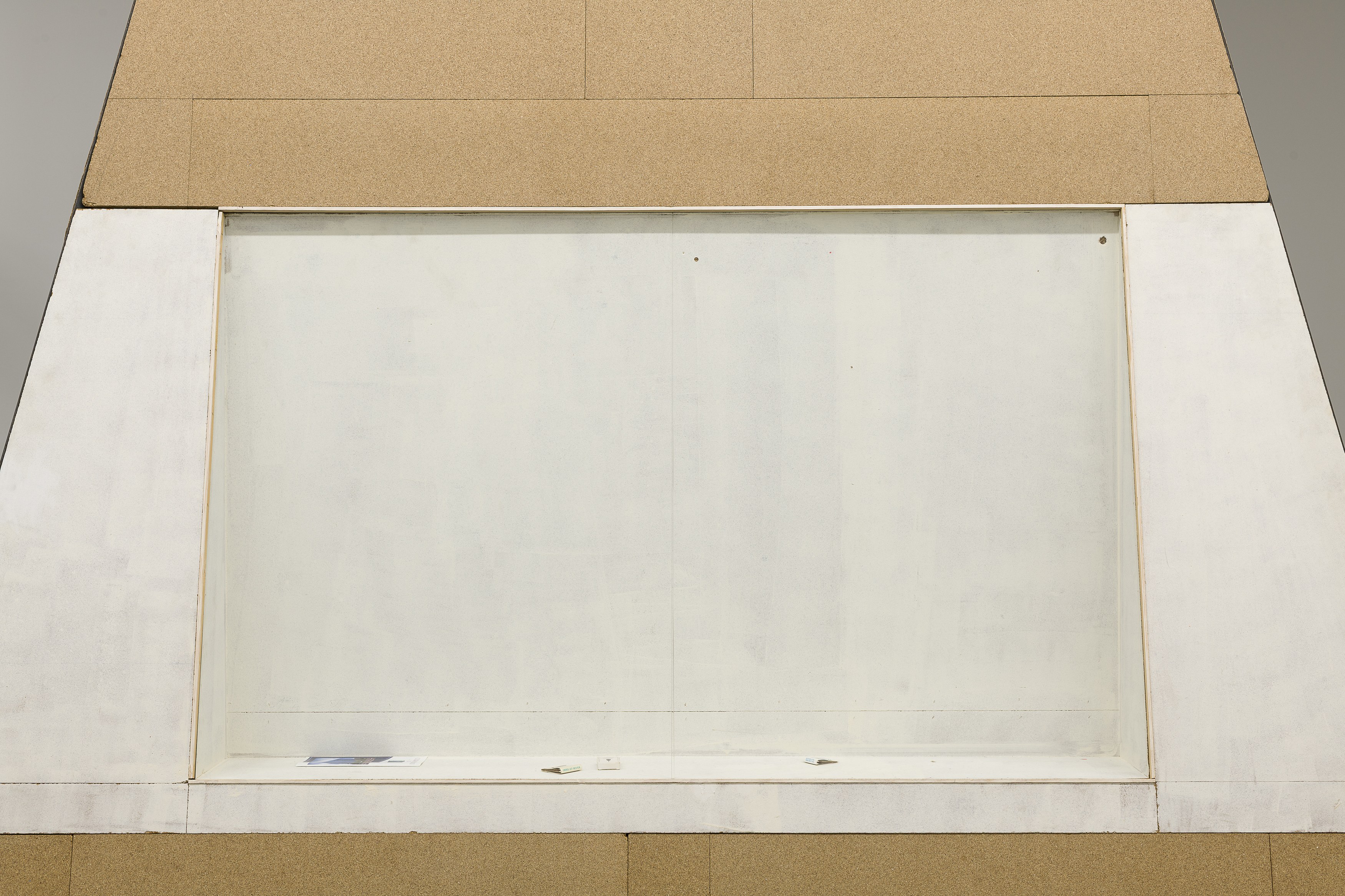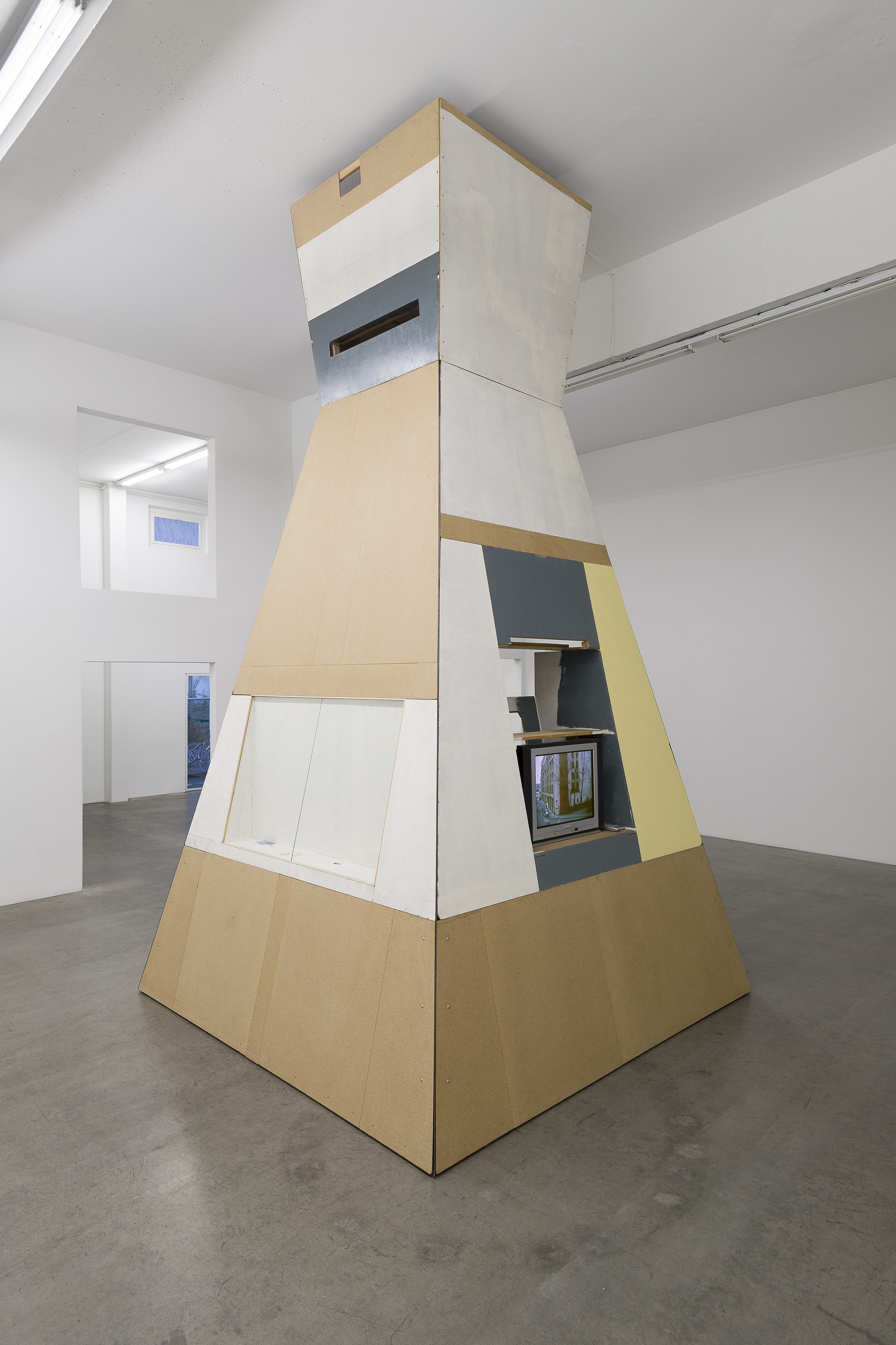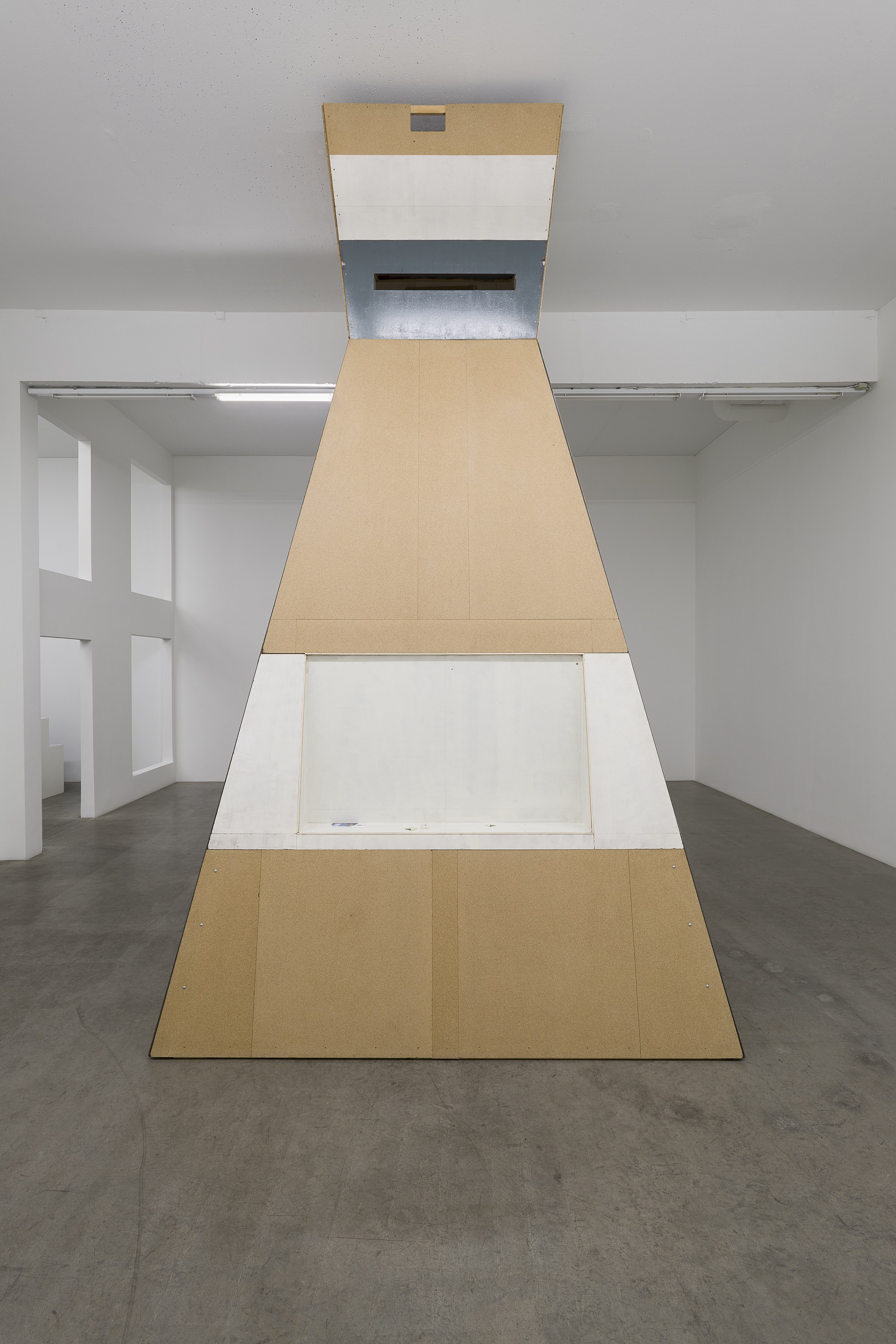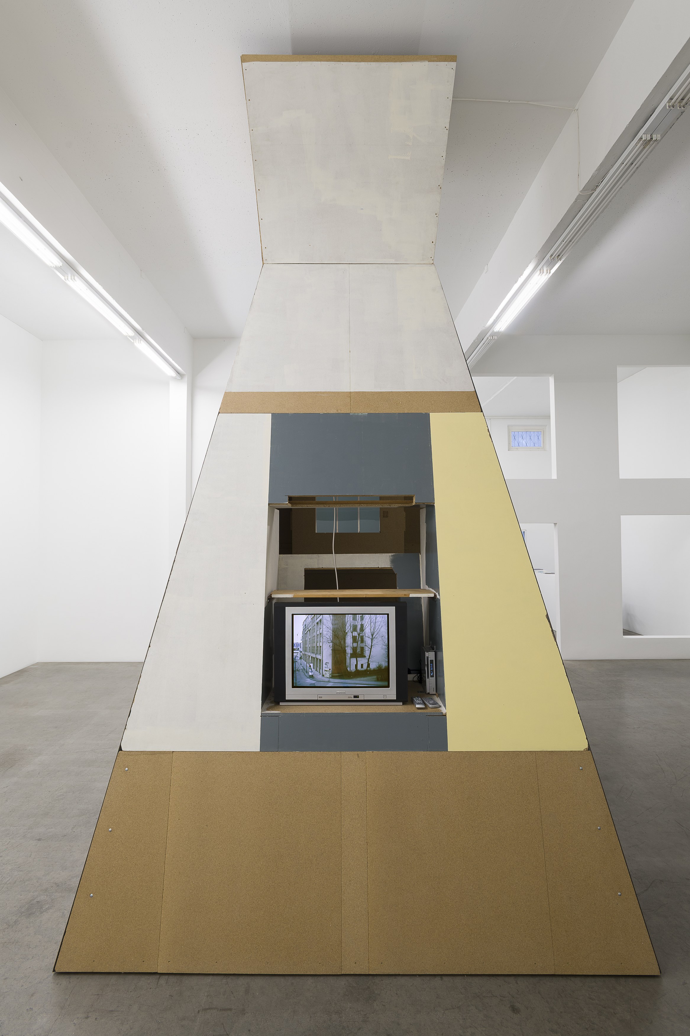 estrel-docx is a solo presentation by Manfred Pernice at Galerie Neu, taking this year’s milestone anniversary of the documenta as its occasion. The work ESTREL; quattro stagioni from 2002 was conceived for documenta 11 in Kassel and was later shown at the Kunstmuseum Wolfsburg. The frontal side of the construction – which initially appears monolithic – appositely reflects the title as a form of the standardised international hotel architecture of turn-of-the‐millennium globalization. In contrast, the four seasons also invoked in the title are understood as an “emerging + fading”, as a process of gradual decay, and as a “glimpse behind the scenes”.