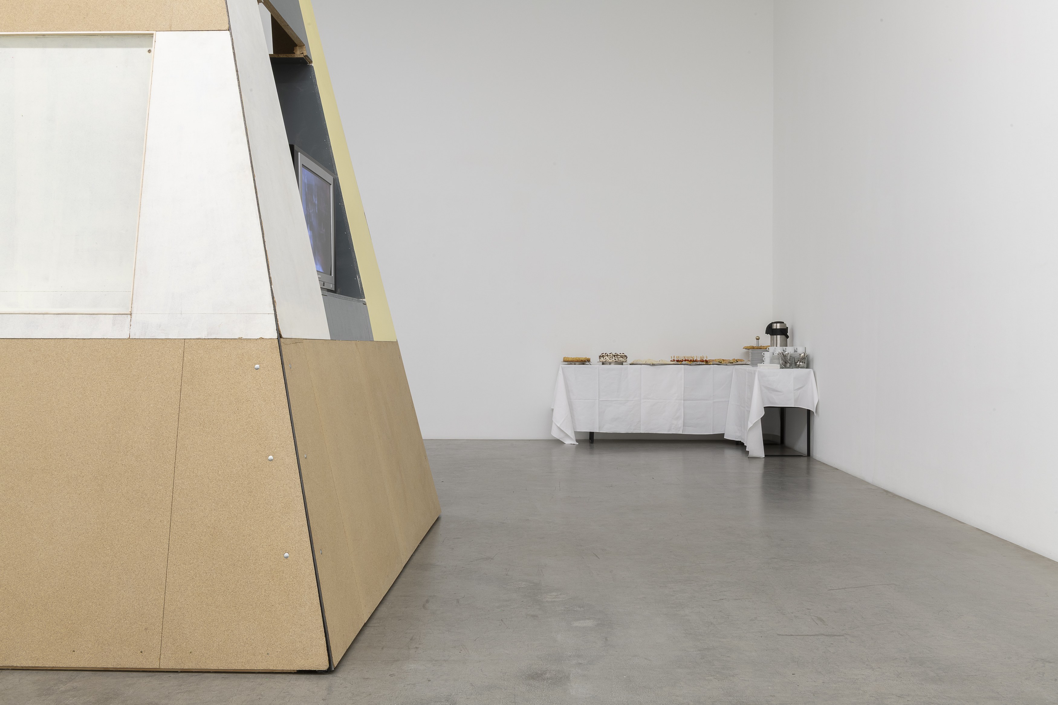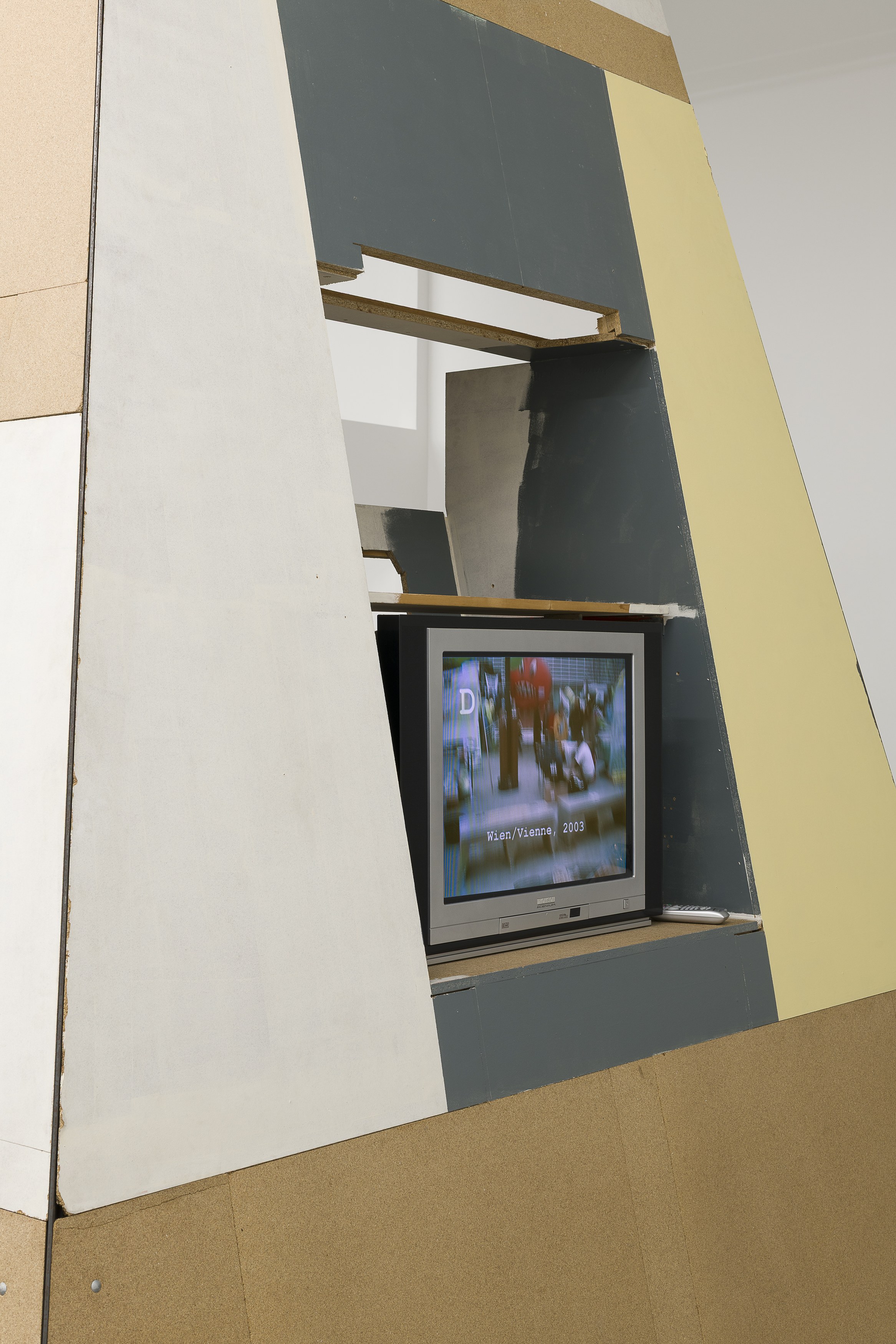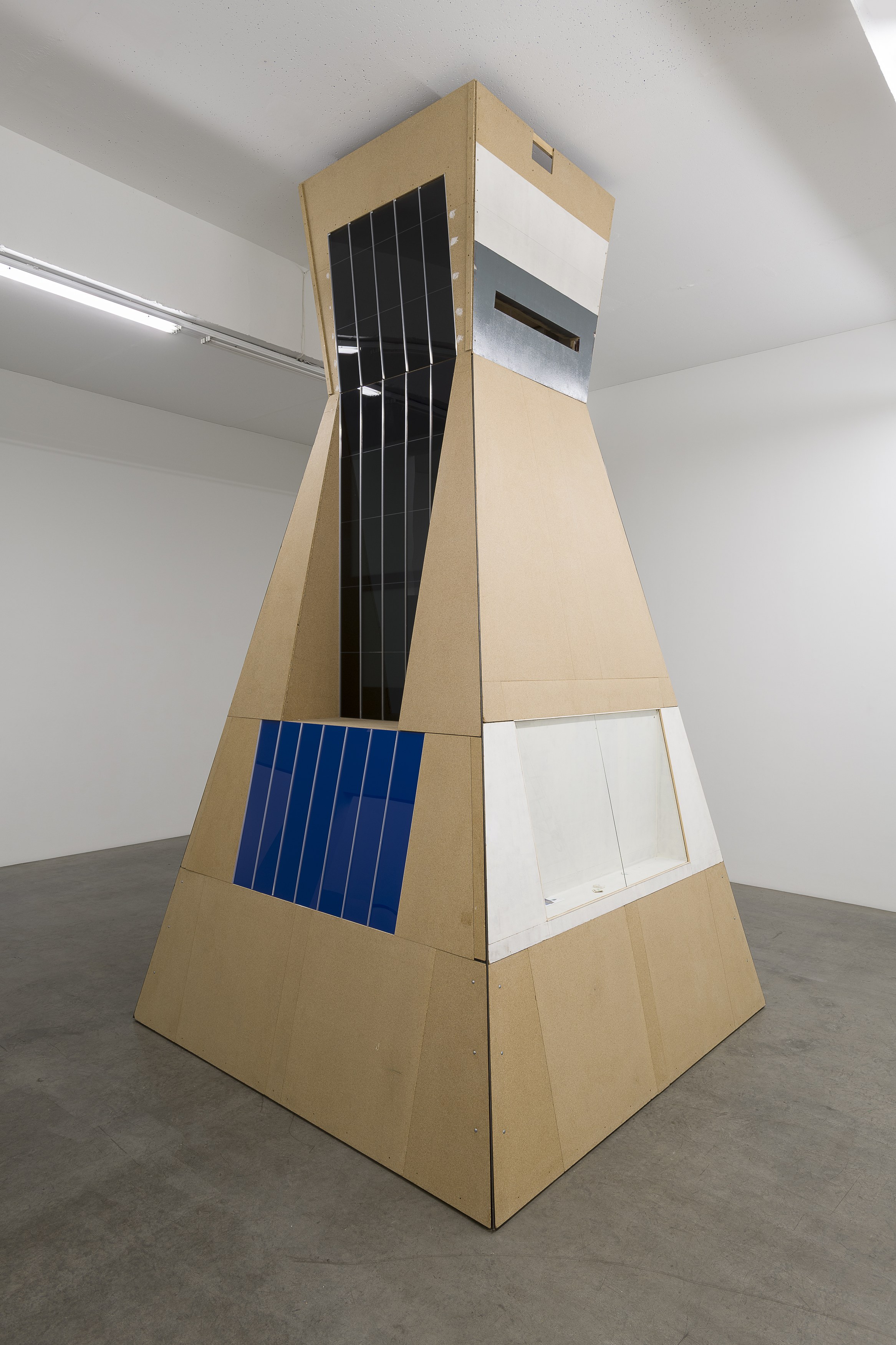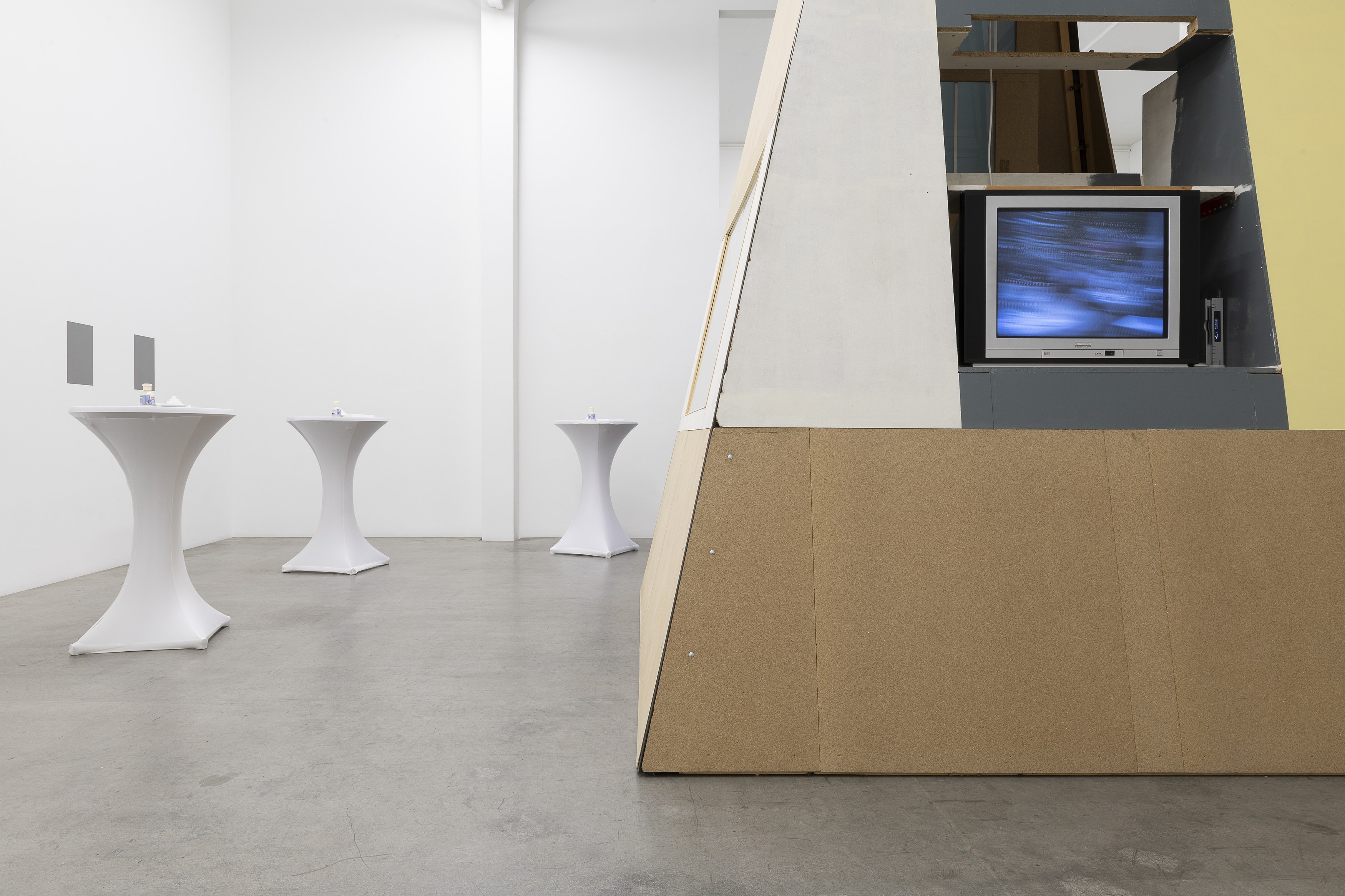 estrel-docx is a solo presentation by Manfred Pernice at Galerie Neu, taking this year’s milestone anniversary of the documenta as its occasion. The work ESTREL; quattro stagioni from 2002 was conceived for documenta 11 in Kassel and was later shown at the Kunstmuseum Wolfsburg. The frontal side of the construction – which initially appears monolithic – appositely reflects the title as a form of the standardised international hotel architecture of turn-of-the‐millennium globalization. In contrast, the four seasons also invoked in the title are understood as an “emerging + fading”, as a process of gradual decay, and as a “glimpse behind the scenes”.