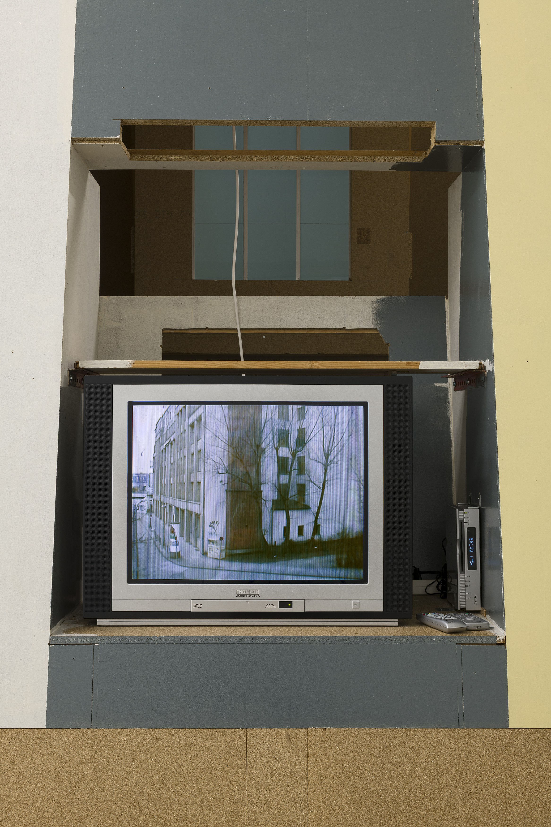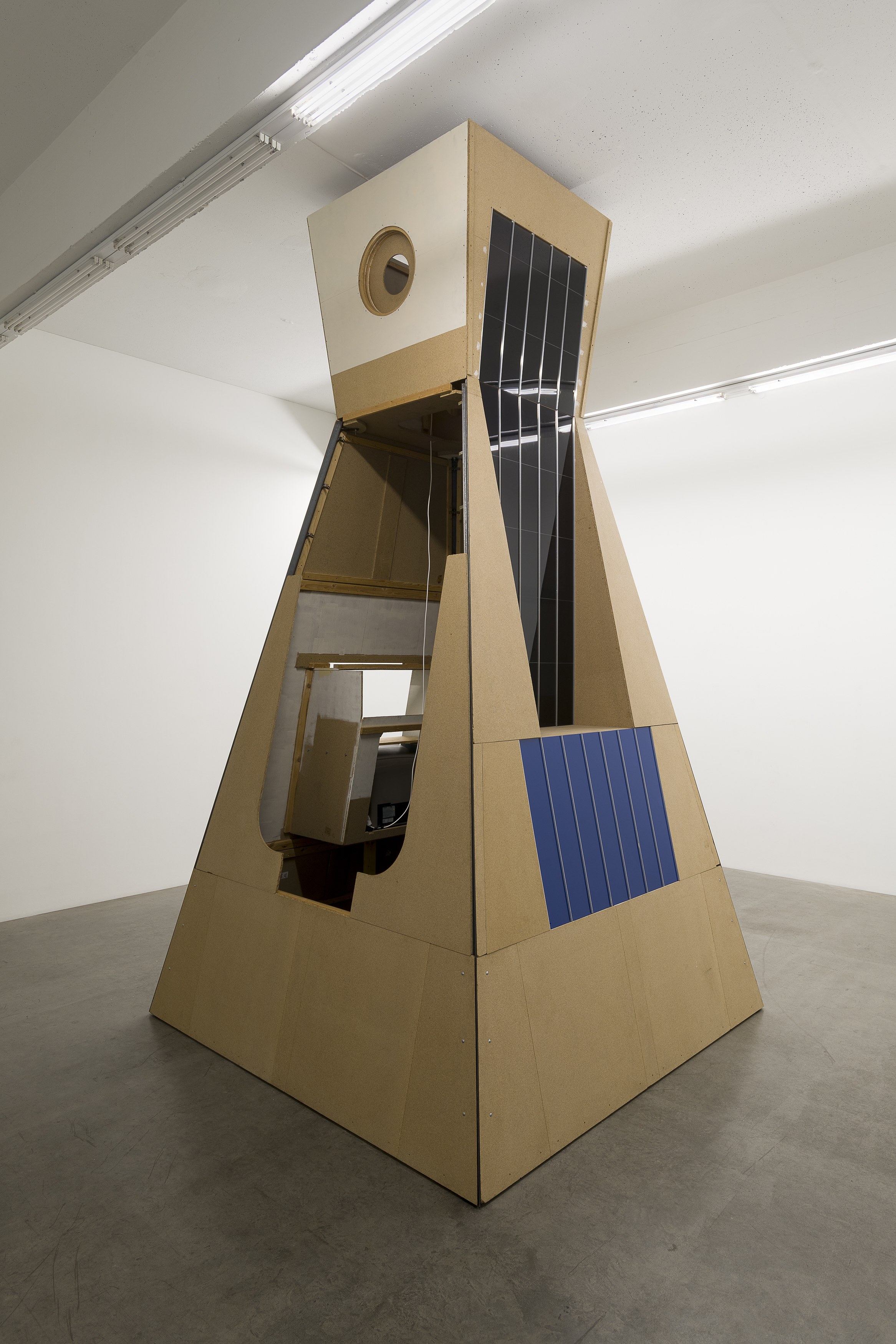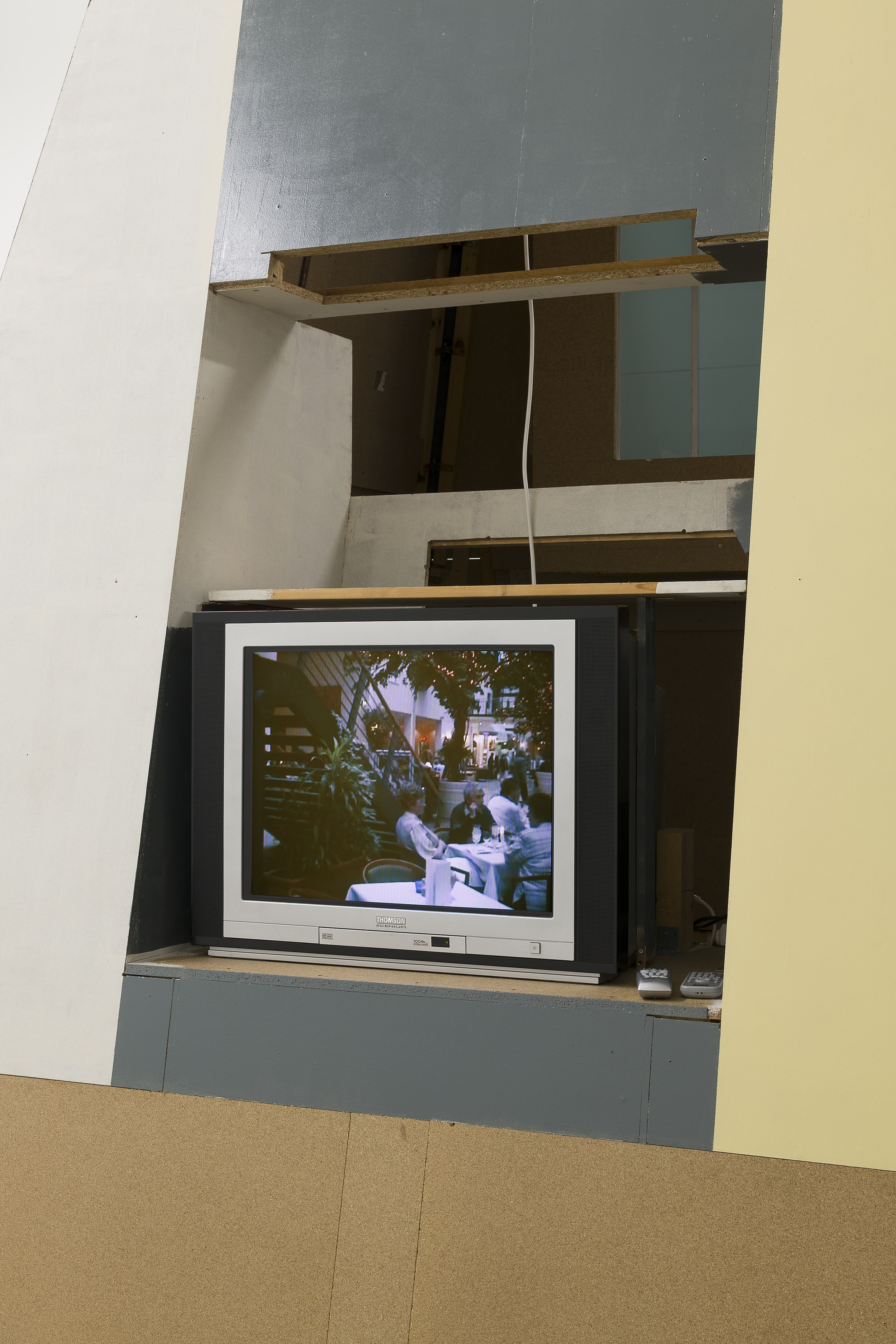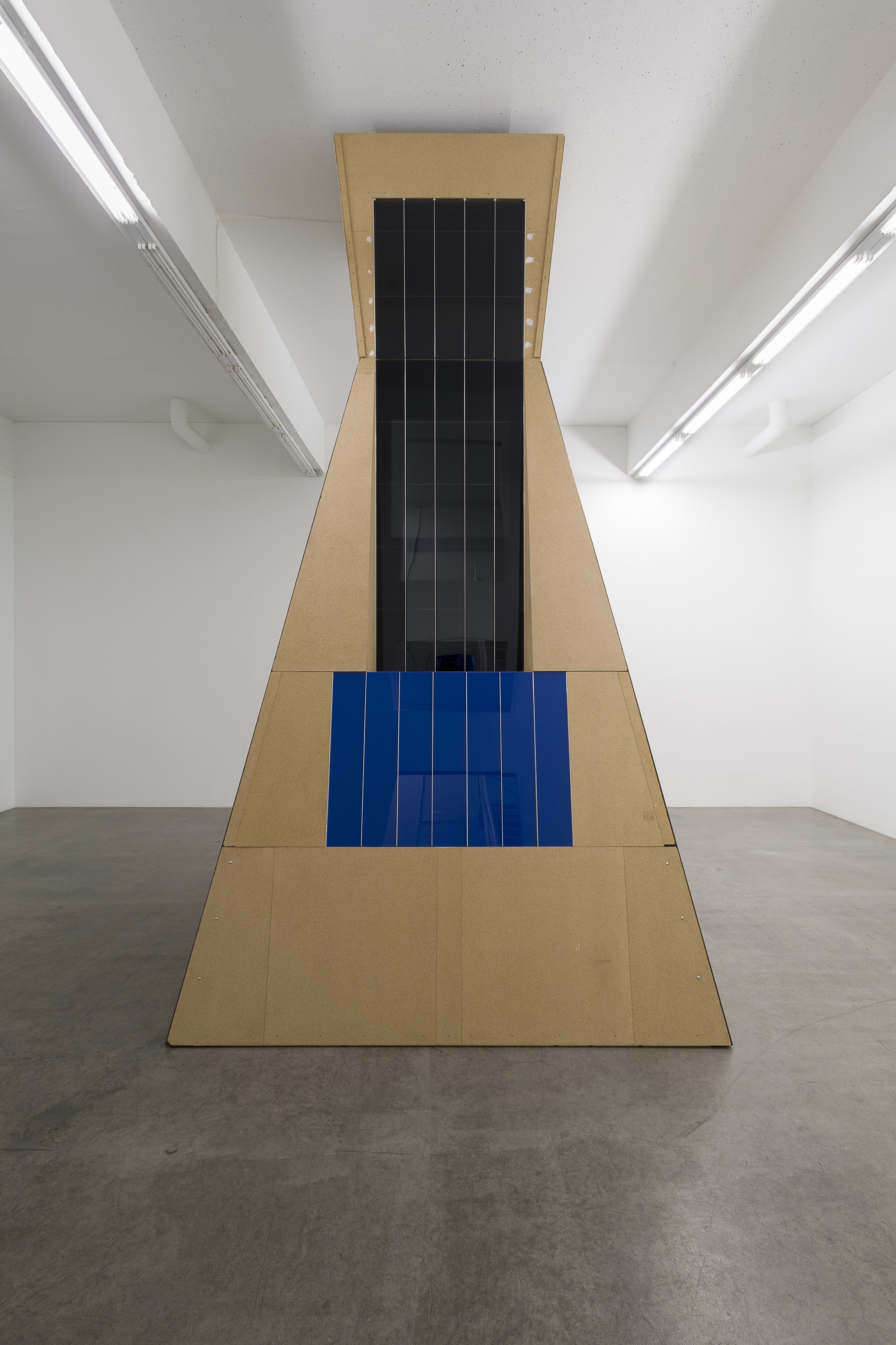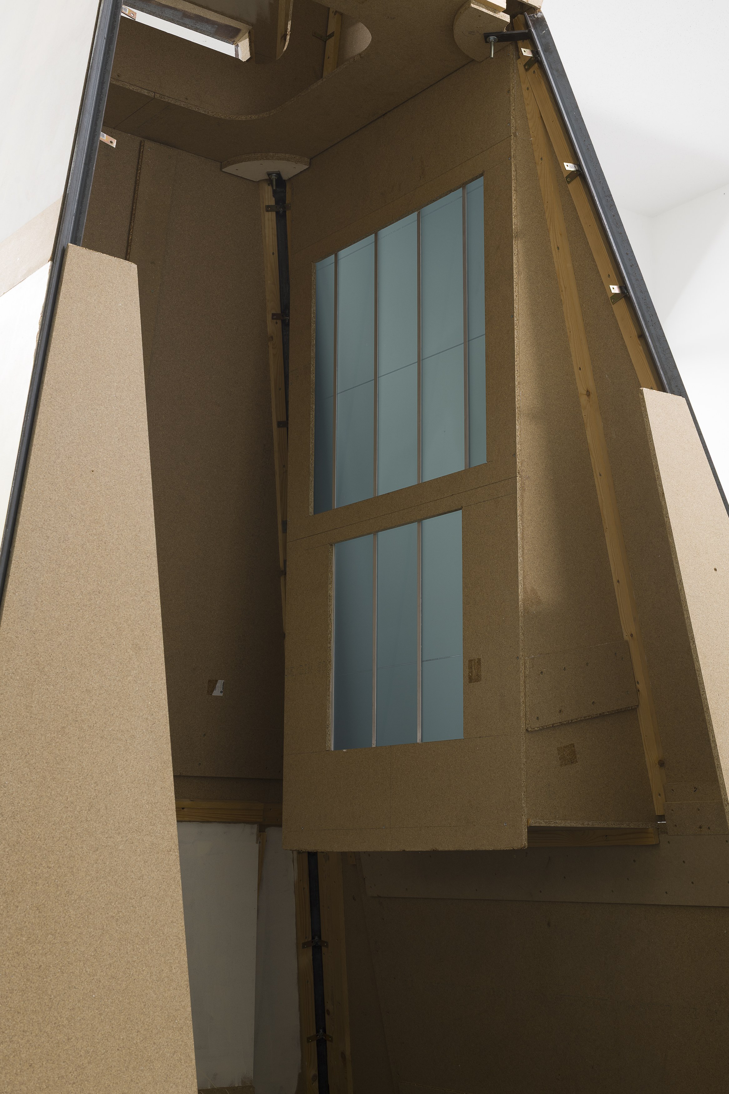 estrel-docx is a solo presentation by Manfred Pernice at Galerie Neu, taking this year’s milestone anniversary of the documenta as its occasion. The work ESTREL; quattro stagioni from 2002 was conceived for documenta 11 in Kassel and was later shown at the Kunstmuseum Wolfsburg. The frontal side of the construction – which initially appears monolithic – appositely reflects the title as a form of the standardised international hotel architecture of turn-of-the‐millennium globalization. In contrast, the four seasons also invoked in the title are understood as an “emerging + fading”, as a process of gradual decay, and as a “glimpse behind the scenes”.