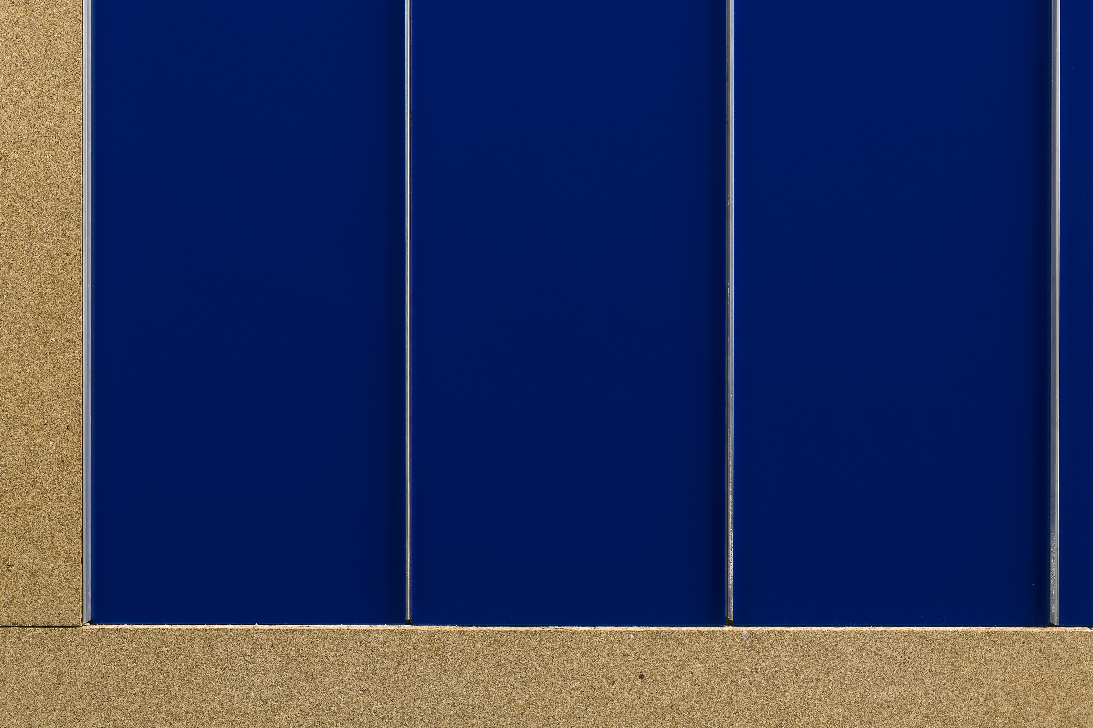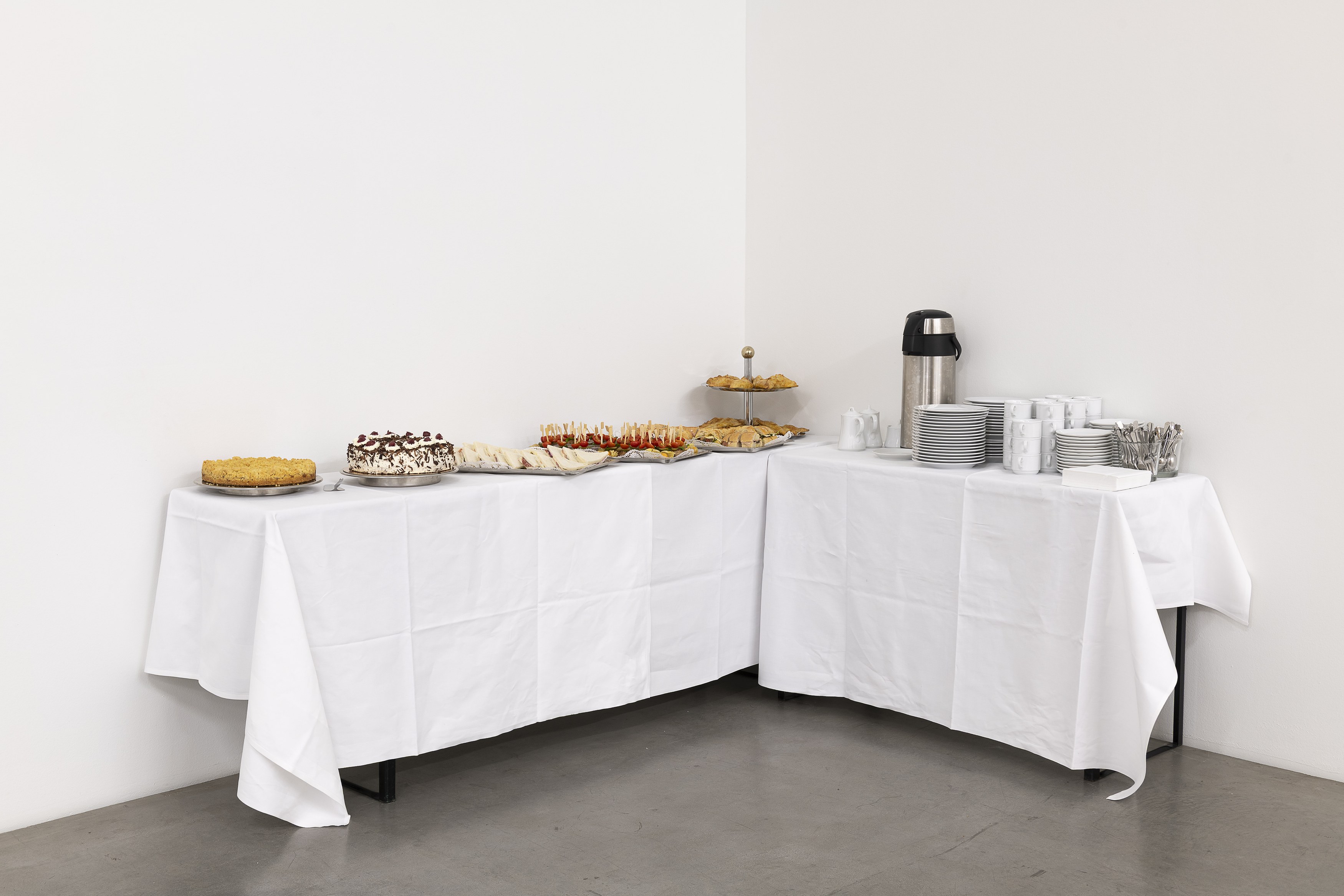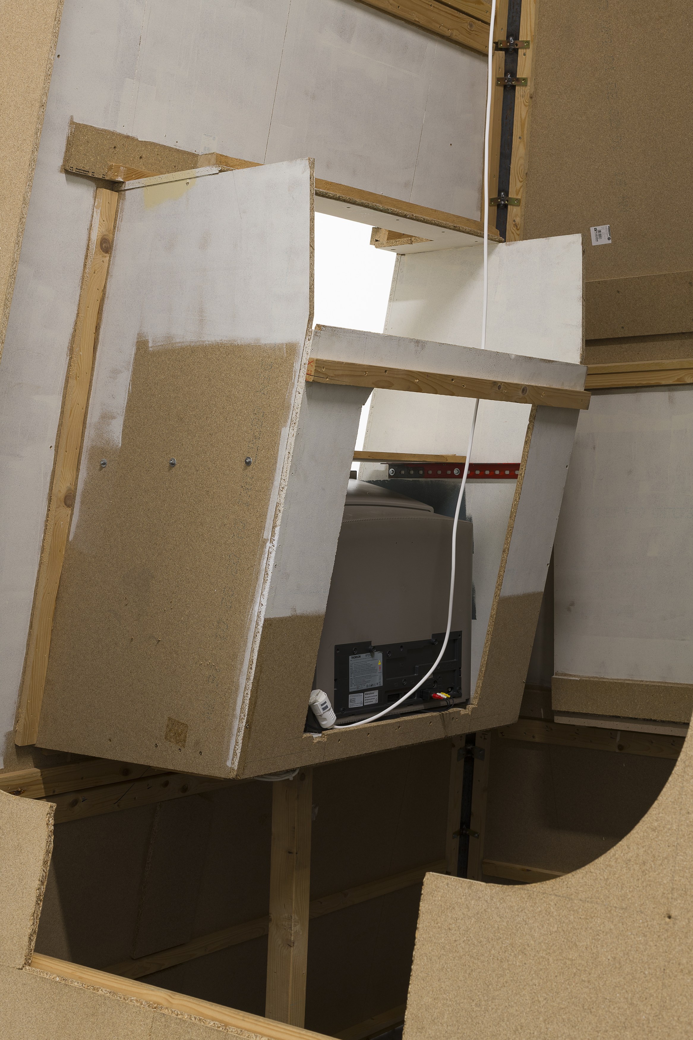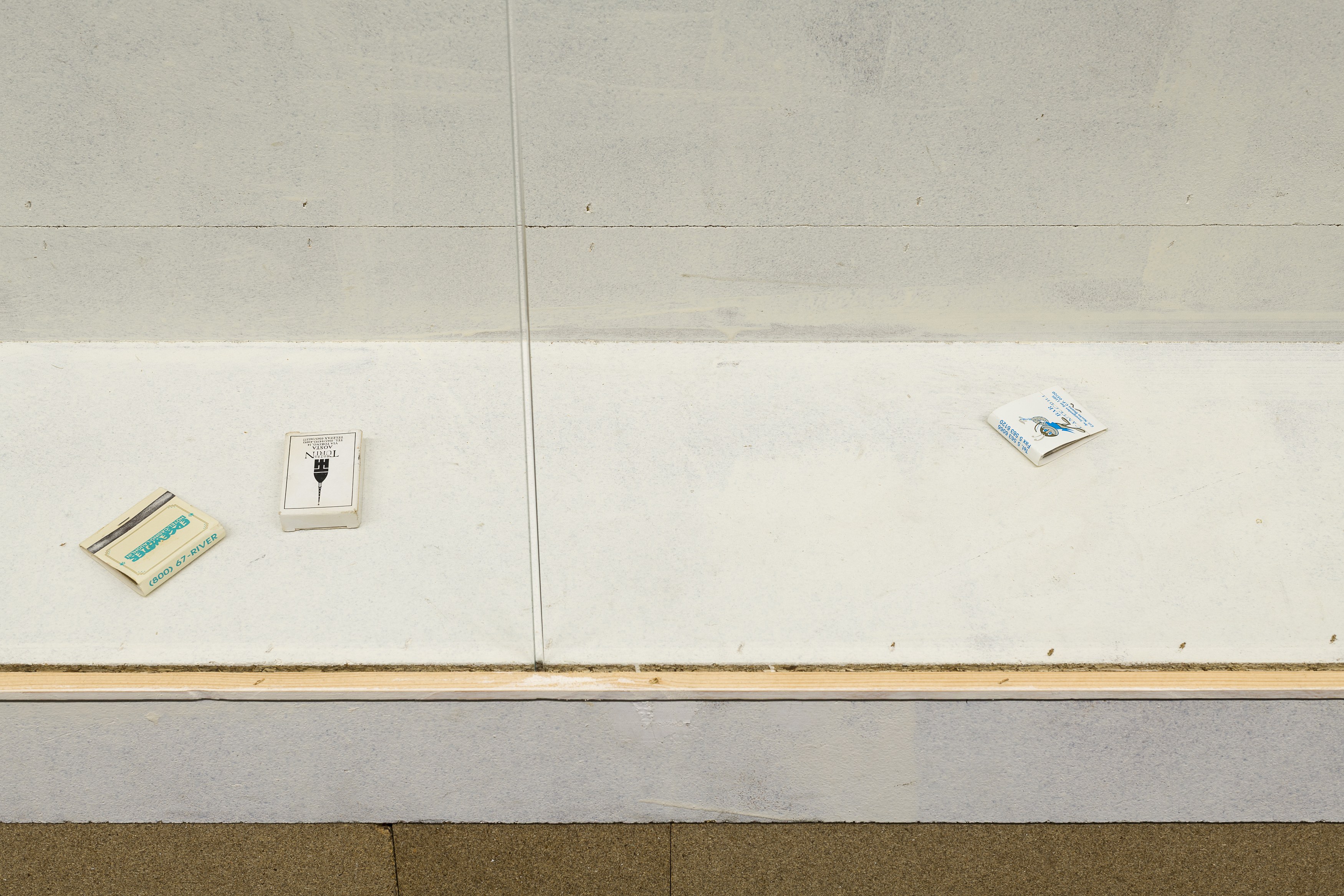 estrel-docx is a solo presentation by Manfred Pernice at Galerie Neu, taking this year’s milestone anniversary of the documenta as its occasion. The work ESTREL; quattro stagioni from 2002 was conceived for documenta 11 in Kassel and was later shown at the Kunstmuseum Wolfsburg. The frontal side of the construction – which initially appears monolithic – appositely reflects the title as a form of the standardised international hotel architecture of turn-of-the‐millennium globalization. In contrast, the four seasons also invoked in the title are understood as an “emerging + fading”, as a process of gradual decay, and as a “glimpse behind the scenes”.