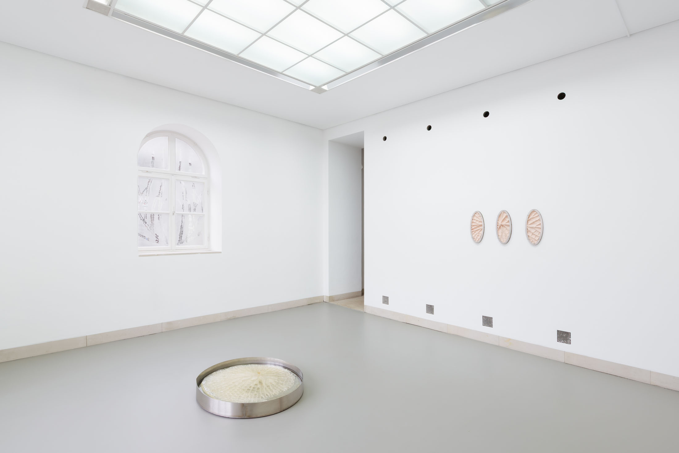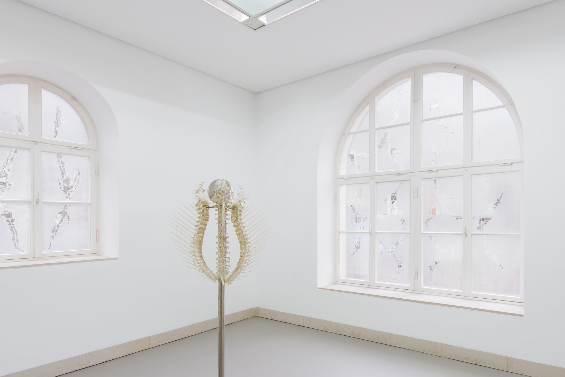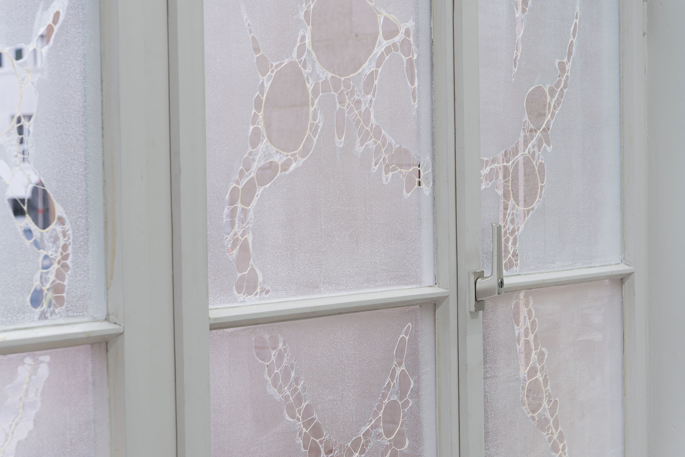 The windows of the exhibition spaces are covered by the fragile latex work Veil (2024–ongoing), which covers the glass surfaces like organically grown intertwining strands. The work depicts the process of sclerotization,…