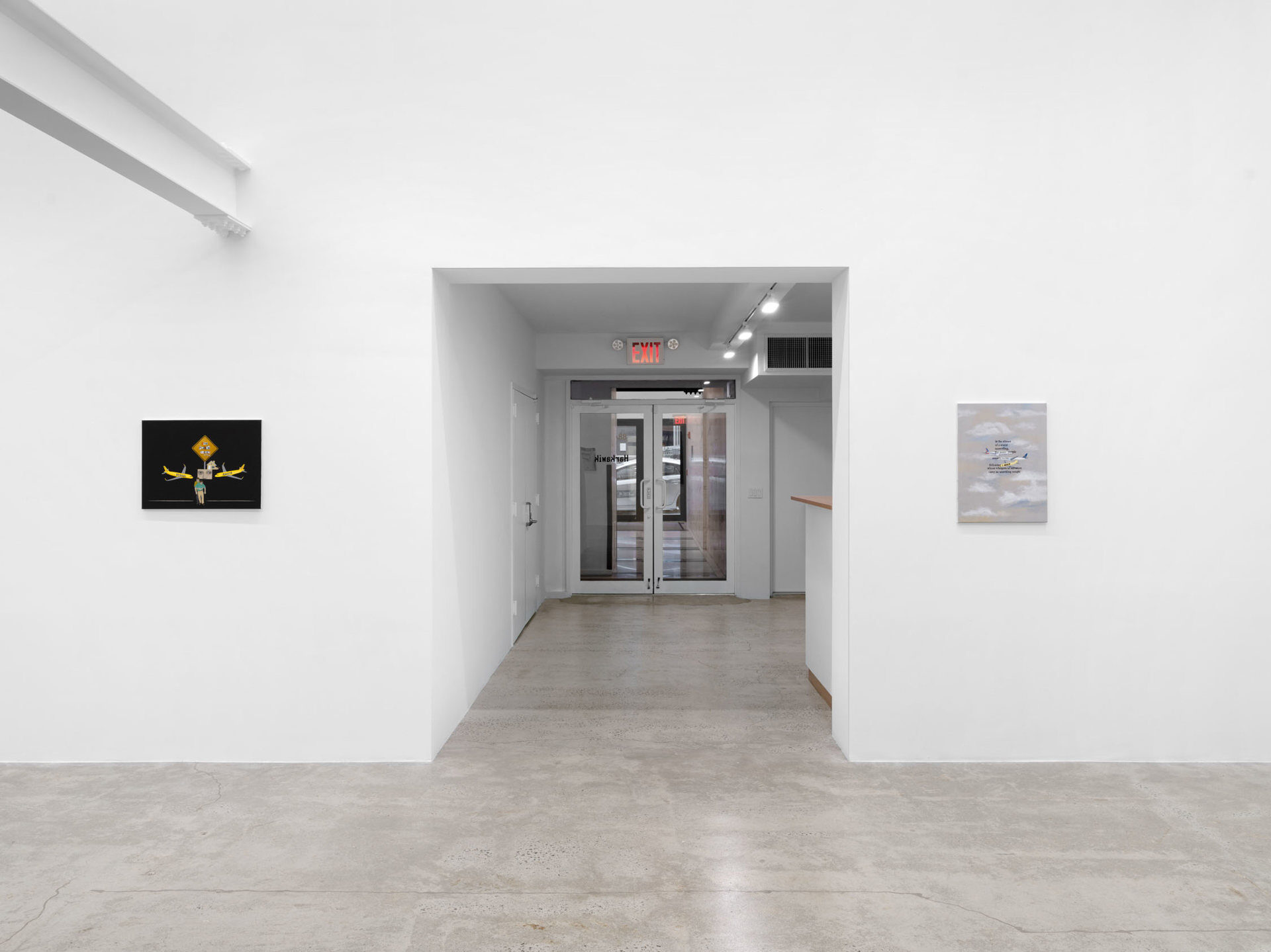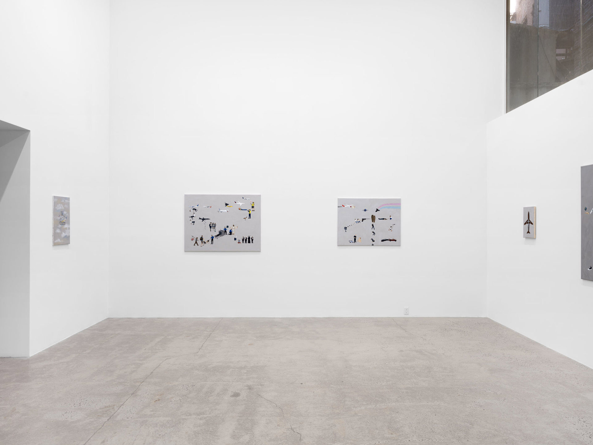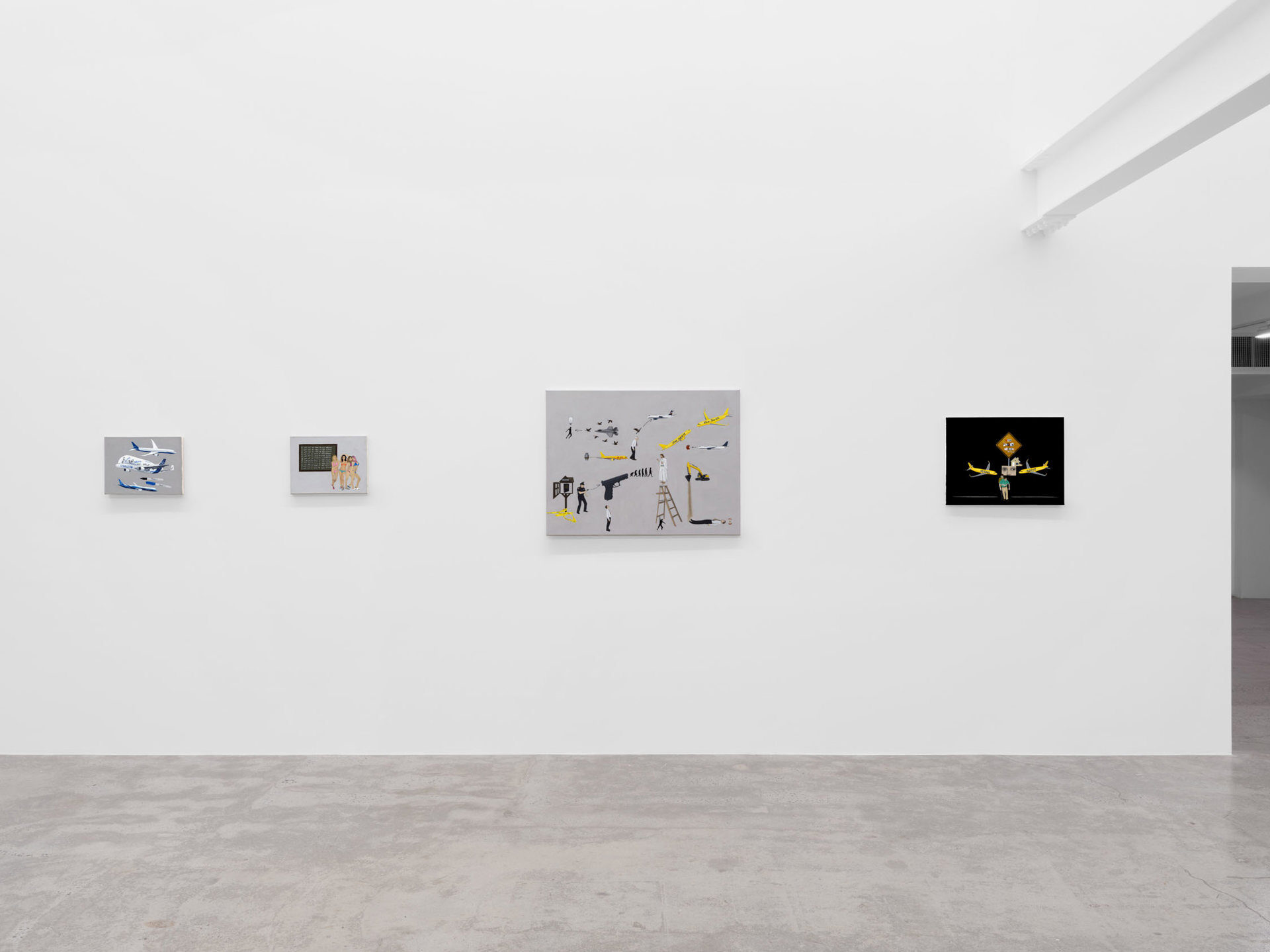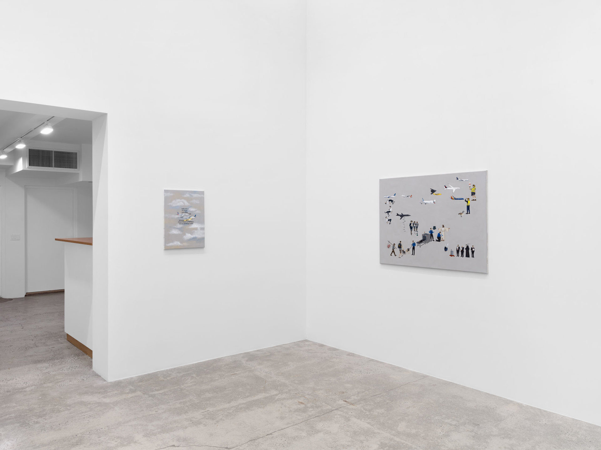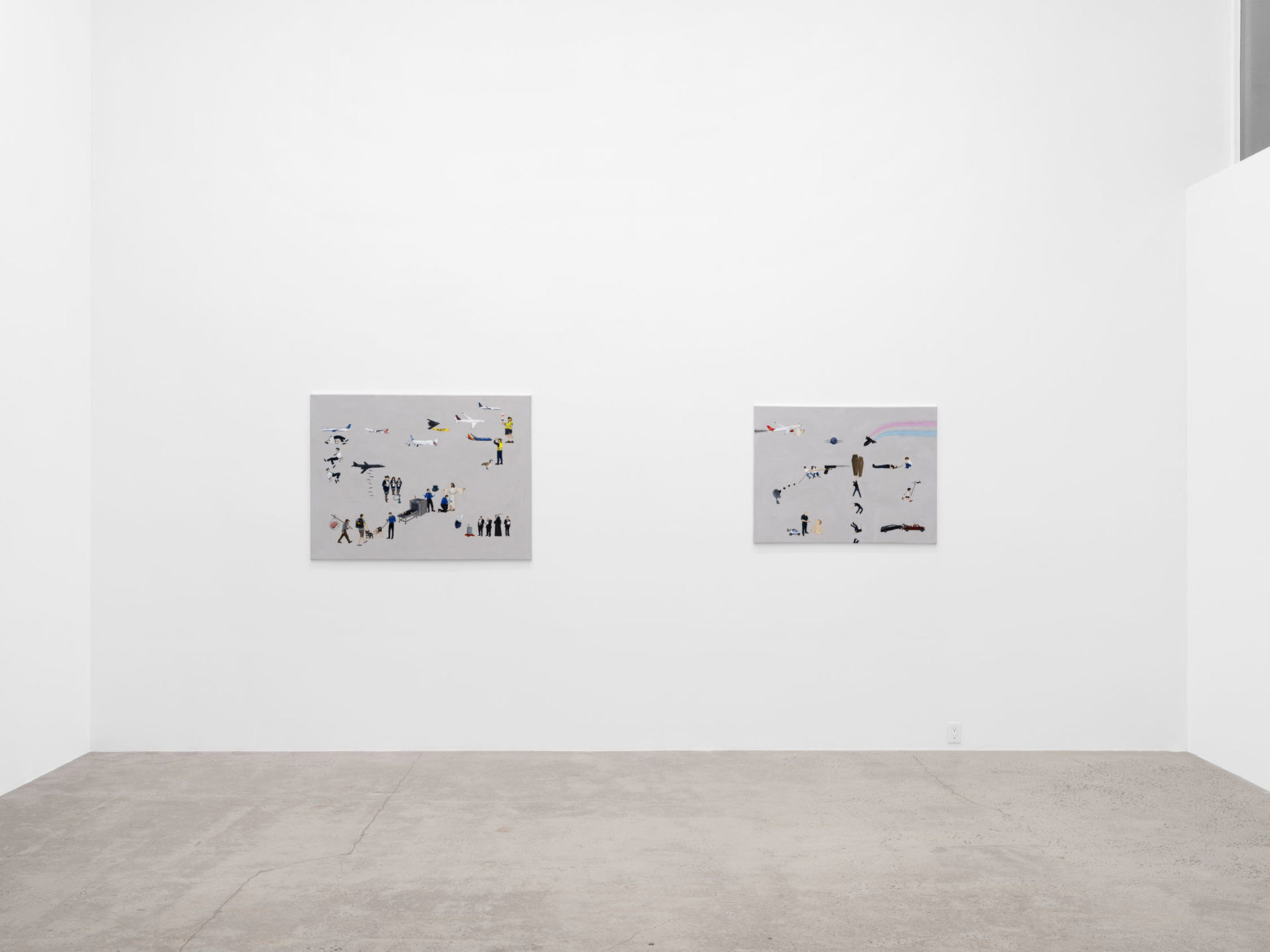 Harkawik is pleased to present Spirit, our second solo exhibition with Philadelphia-based painter Exene Karros. Spirit charts a course between faith and bankruptcy, offering us momentary glimpses of a world outside her gray expanse, even as she ratchets up the complexity and madcap brilliance that defines it. Here, balloons float a coffin toward the heavens–and it might make it, were it not for Jesus Christ himself, casually gripping a giant pushpin. Here, bulging, showy airplanes are body shamed, Calvin and Hobbes and Calvinist doctrine mingle freely, airline logos teach us color theory, the FBI wiretaps the clergy, marriage is proposed and sucked away in one swift maneuver of aerial advertising, and the excesses and absurdities of modern life are given free reign in a kind of branded animism. Karros creates mimetic systems of omnipresent yet isolated realities, scattering icons across the picture plane like a divine editor. Her players’ motivations and investments collide in the…