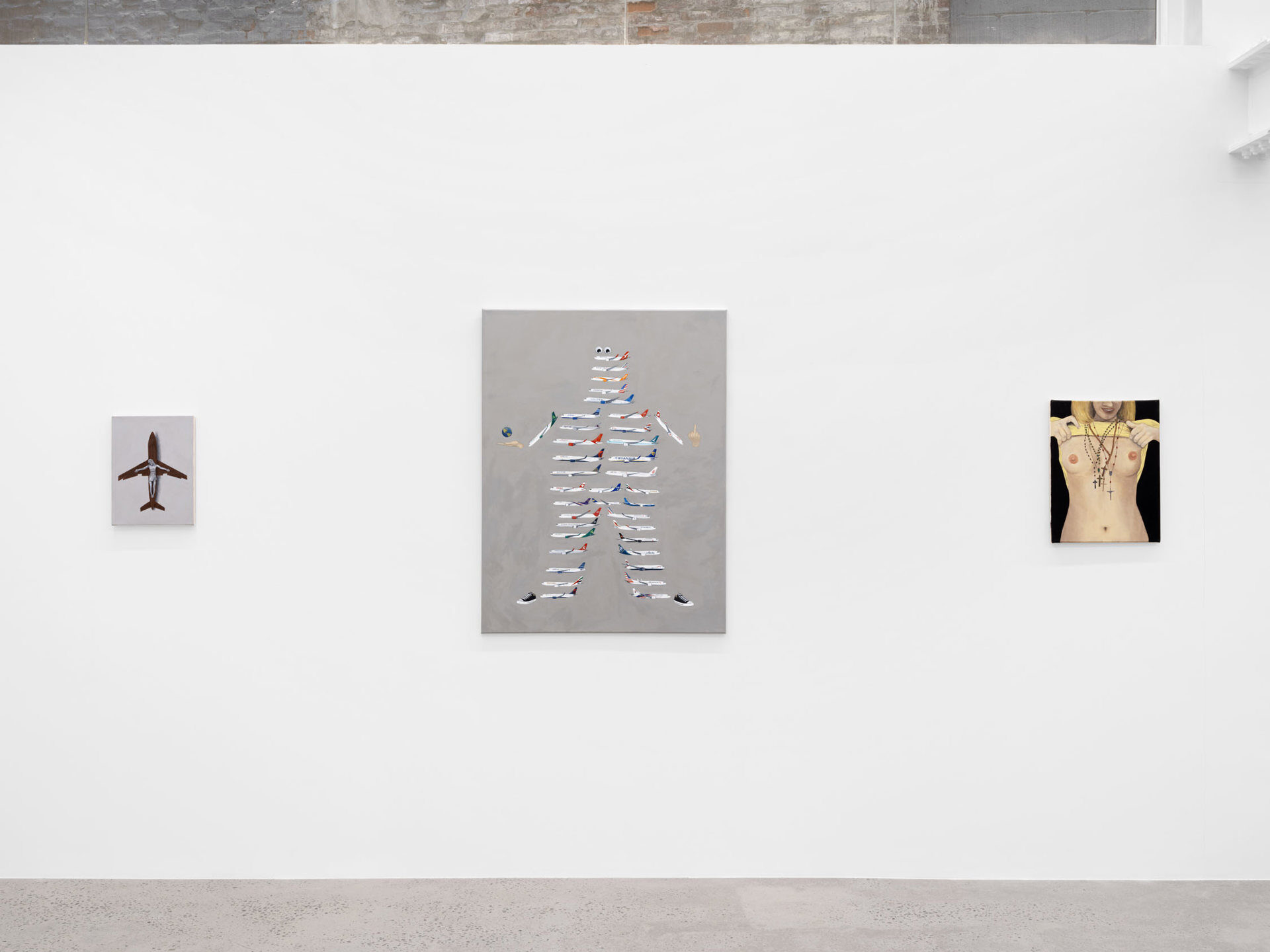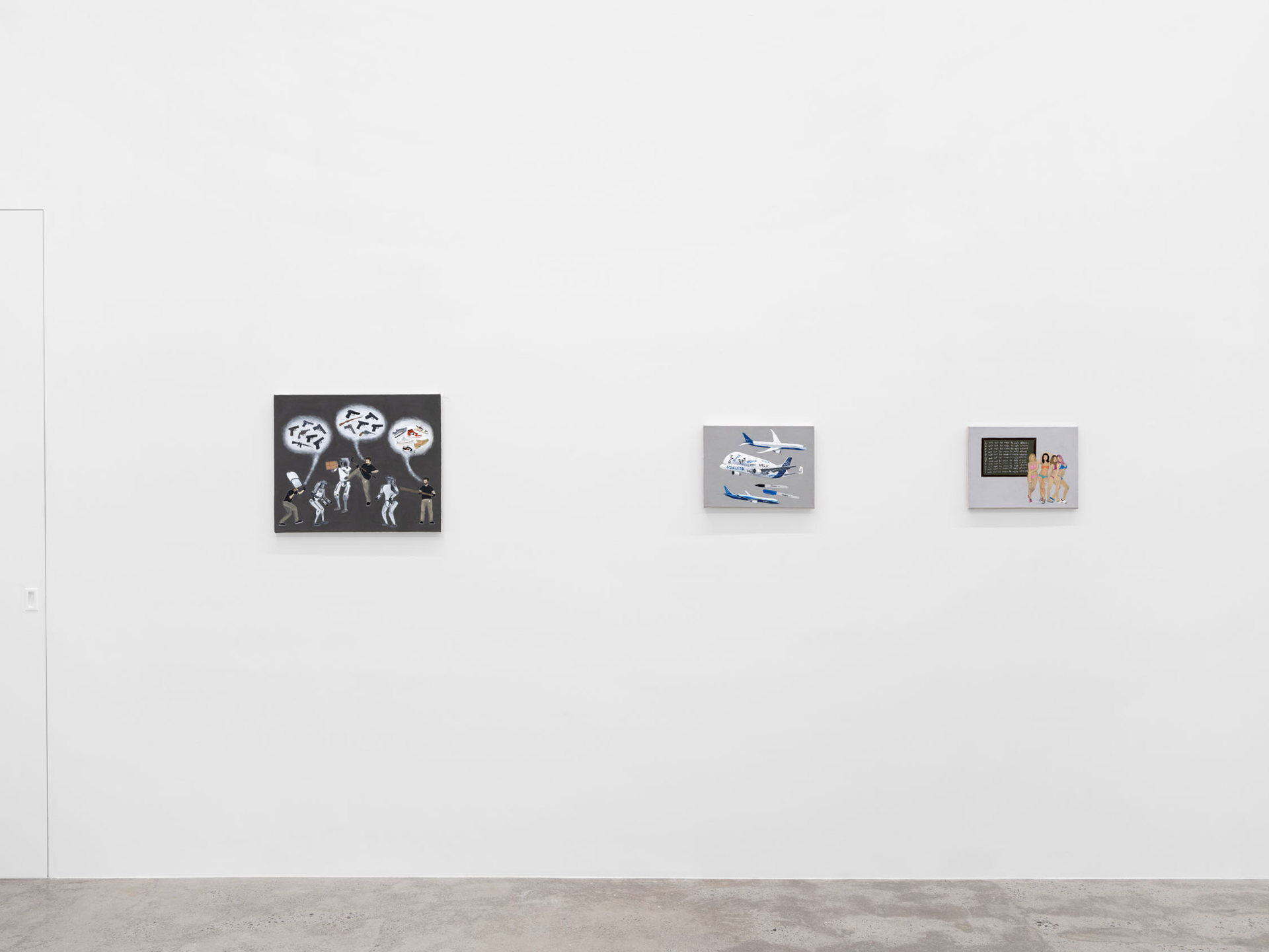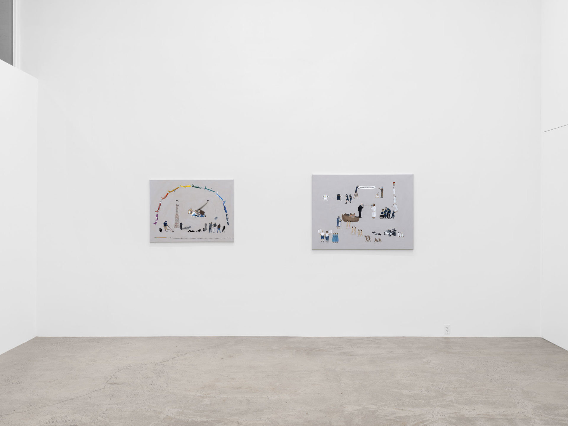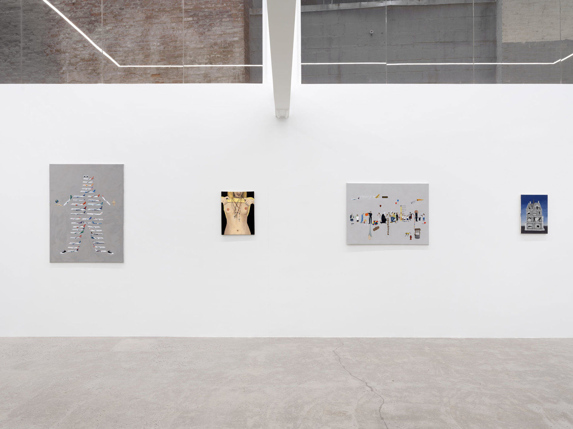 Harkawik is pleased to present Spirit, our second solo exhibition with Philadelphia-based painter Exene Karros. Spirit charts a course between faith and bankruptcy, offering us momentary glimpses of a world outside her gray expanse, even as she ratchets up the complexity and madcap brilliance that defines it. Here, balloons float a coffin toward the heavens–and it might make it, were it not for Jesus Christ himself, casually gripping a giant pushpin. Here, bulging, showy airplanes are body shamed, Calvin and Hobbes and Calvinist doctrine mingle freely, airline logos teach us color theory, the FBI wiretaps the clergy, marriage is proposed and sucked away in one swift maneuver of aerial advertising, and the excesses and absurdities of modern life are given free reign in a kind of branded animism. Karros creates mimetic systems of omnipresent yet isolated realities, scattering icons across the picture plane like a divine editor. Her players’ motivations and investments collide in the…