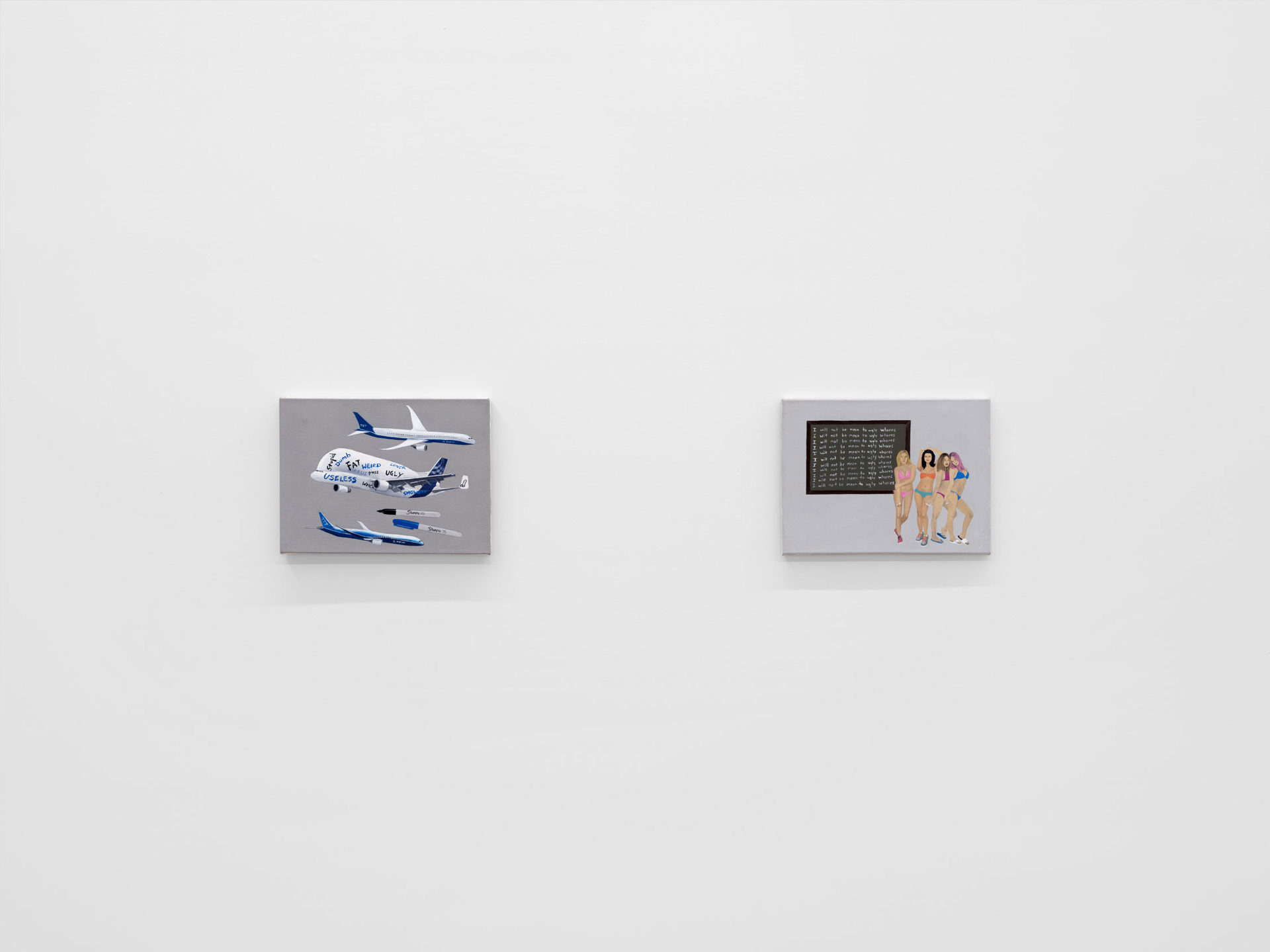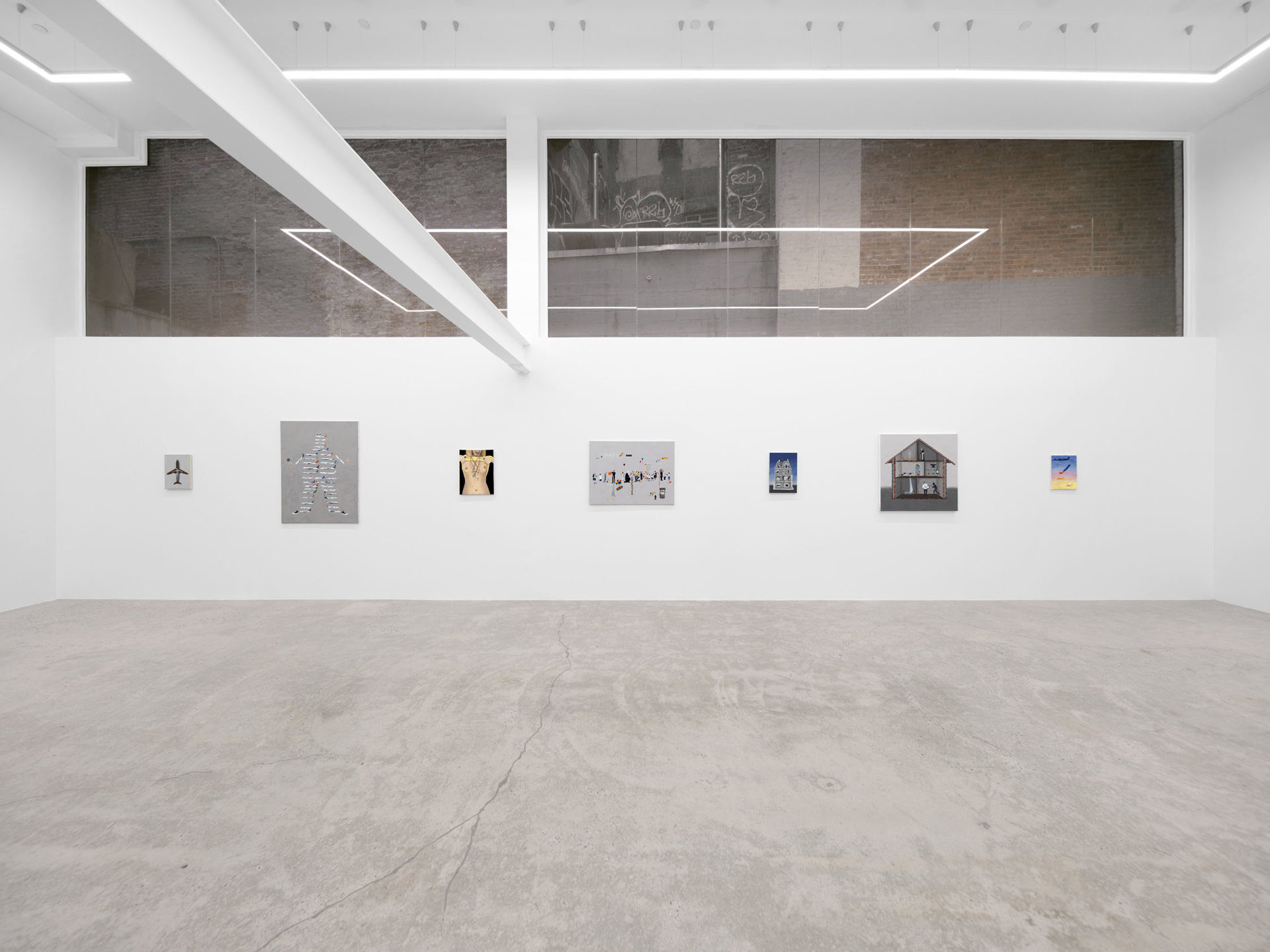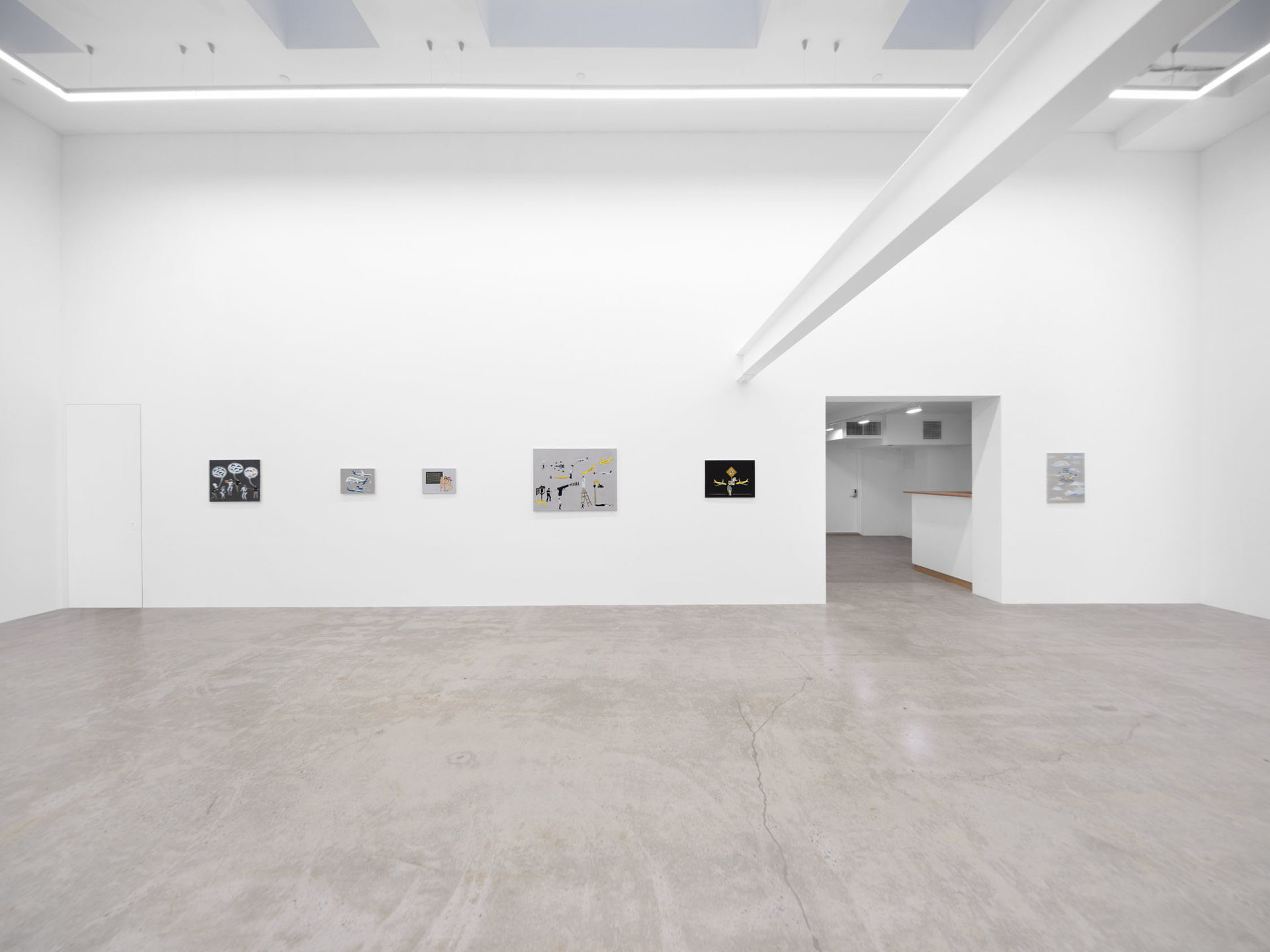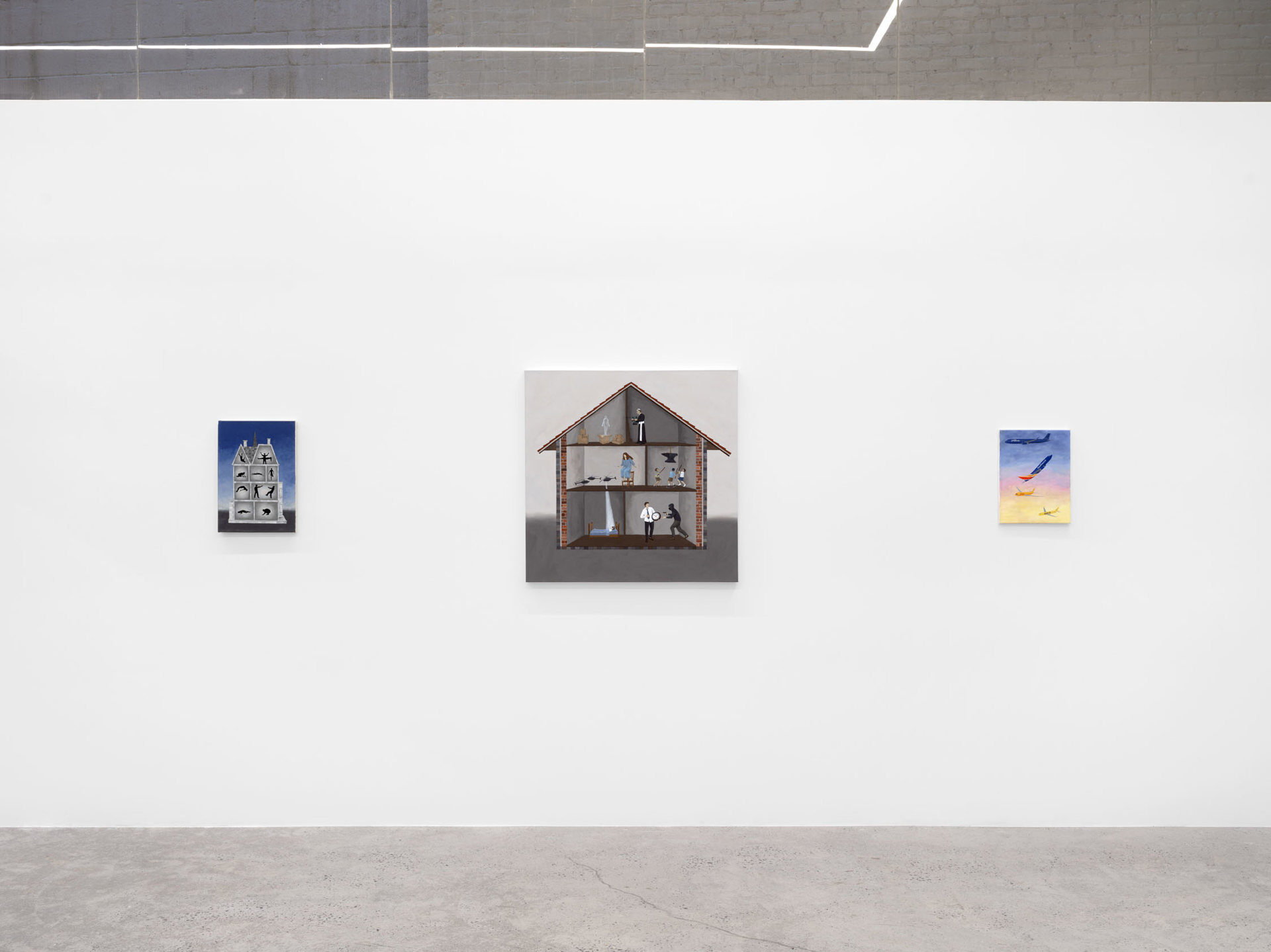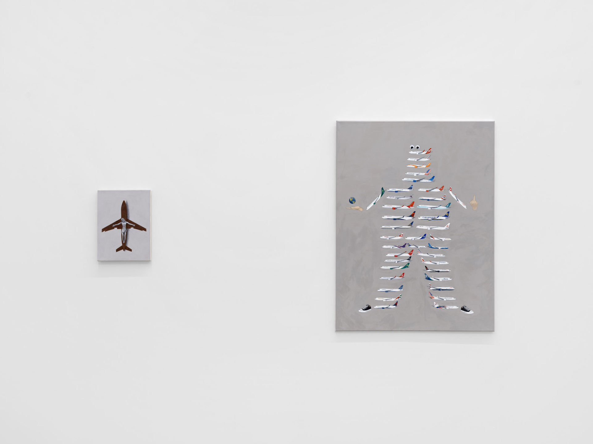Harkawik is pleased to present Spirit, our second solo exhibition with Philadelphia-based painter Exene Karros. Spirit charts a course between faith and bankruptcy, offering us momentary glimpses of a world outside her gray expanse, even as she ratchets up the complexity and madcap brilliance that defines it. Here, balloons float a coffin toward the heavens–and it might make it, were it not for Jesus Christ himself, casually gripping a giant pushpin. Here, bulging, showy airplanes are body shamed, Calvin and Hobbes and Calvinist doctrine mingle freely, airline logos teach us color theory, the FBI wiretaps the clergy, marriage is proposed and sucked away in one swift maneuver of aerial advertising, and the excesses and absurdities of modern life are given free reign in a kind of branded animism. Karros creates mimetic systems of omnipresent yet isolated realities, scattering icons across the picture plane like a divine editor. Her players’ motivations and investments collide in the…