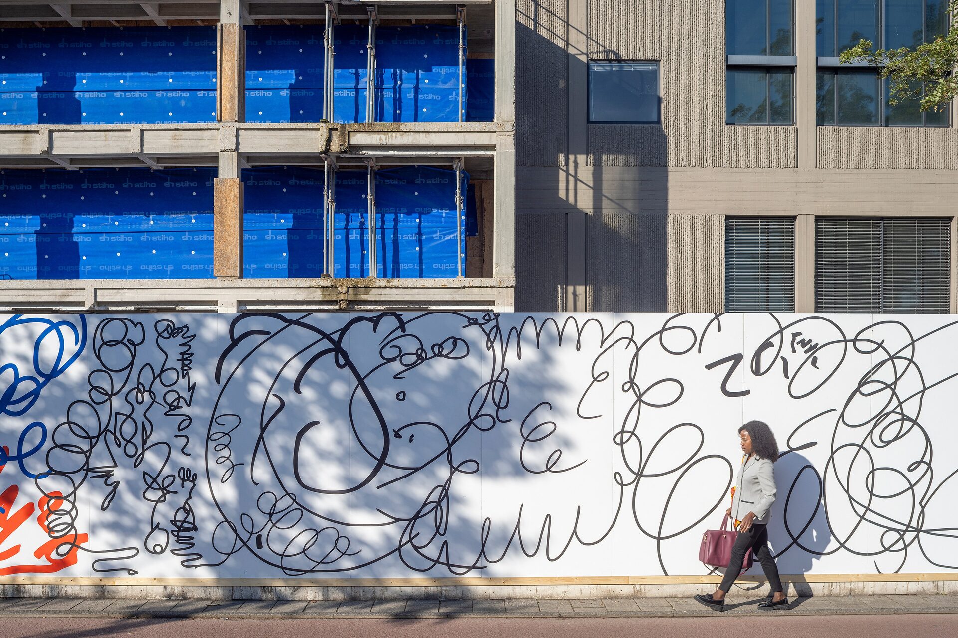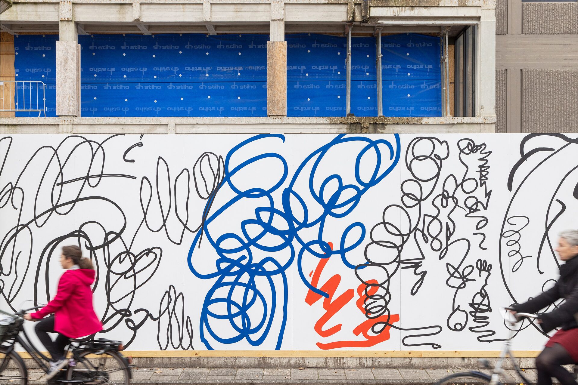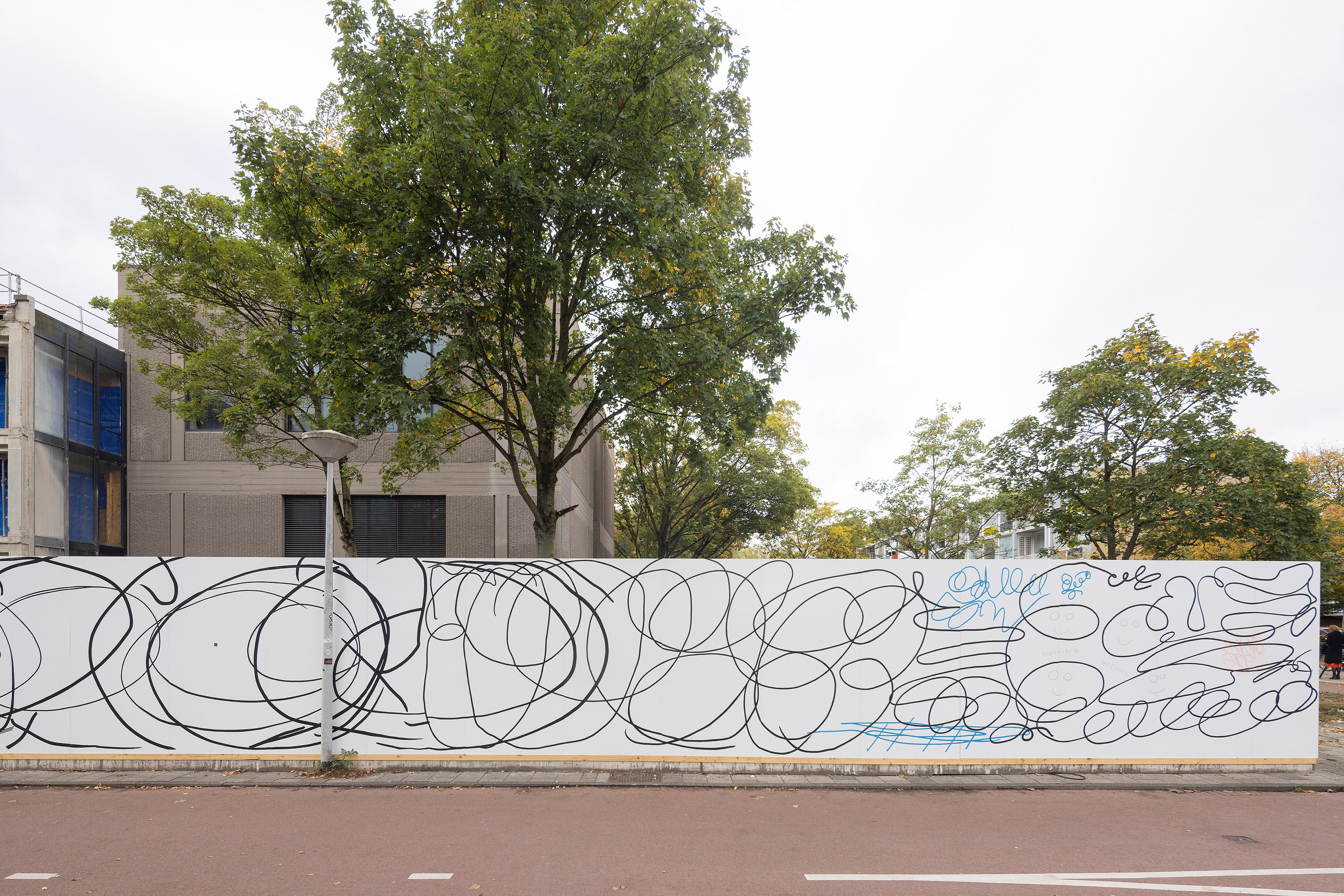 With Nothing Wall, a 92-meter hand-painted mural, she transforms the construction fence of the future Hartwig Museum into a place of enlarged scribbles, curls and doodles that seem like writing but say nothing at all. Van der Stokker calls this “the scandal of effortlessly painting nothing”—a reminder that nothing can still be beautiful, decorative, fun, photogenic, and even worth stopping for.