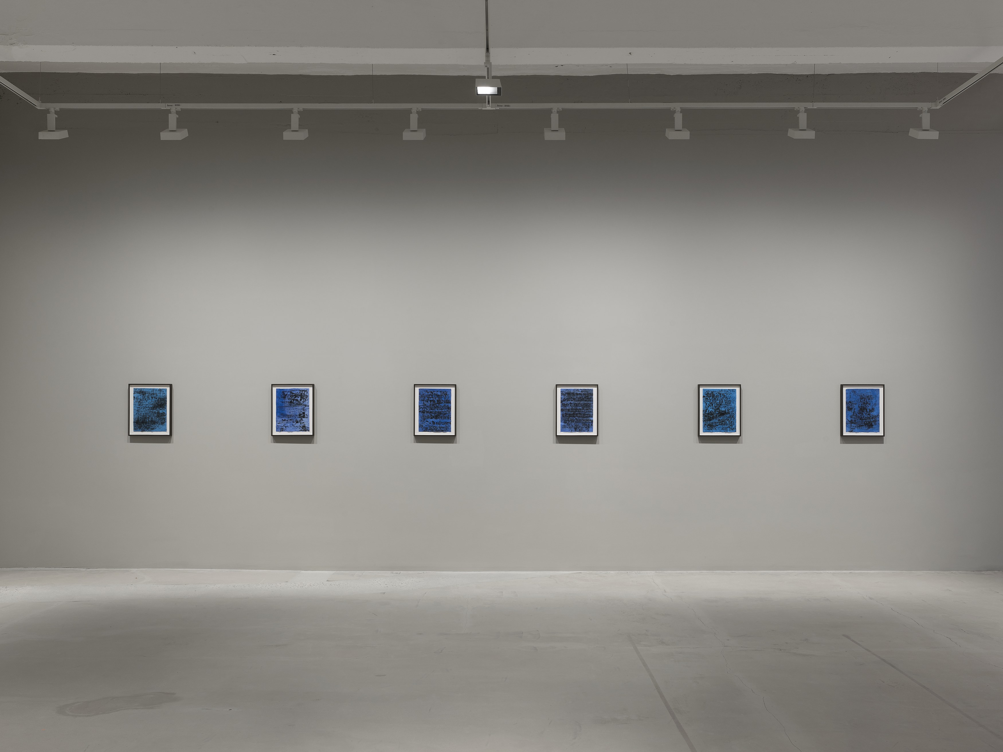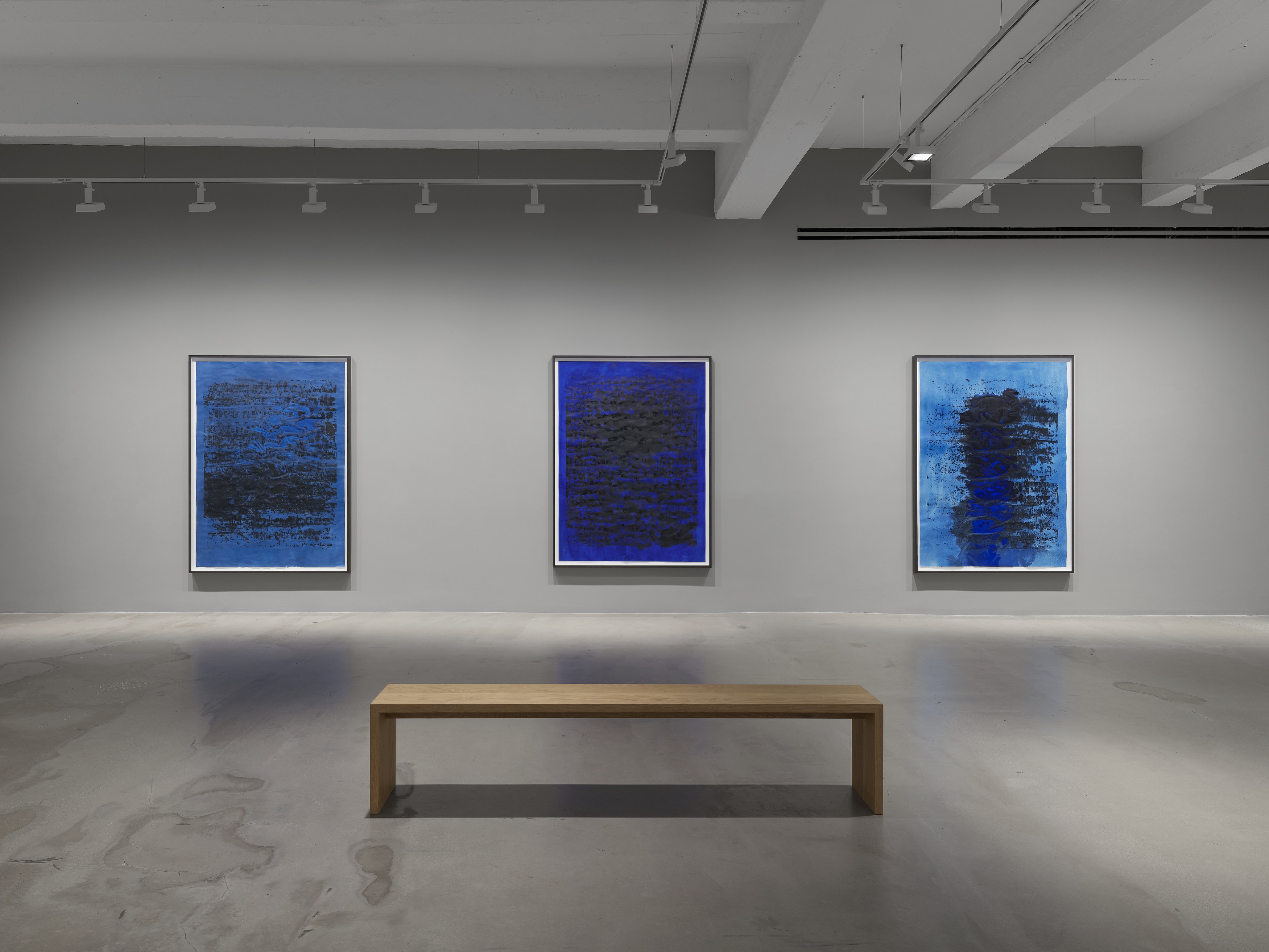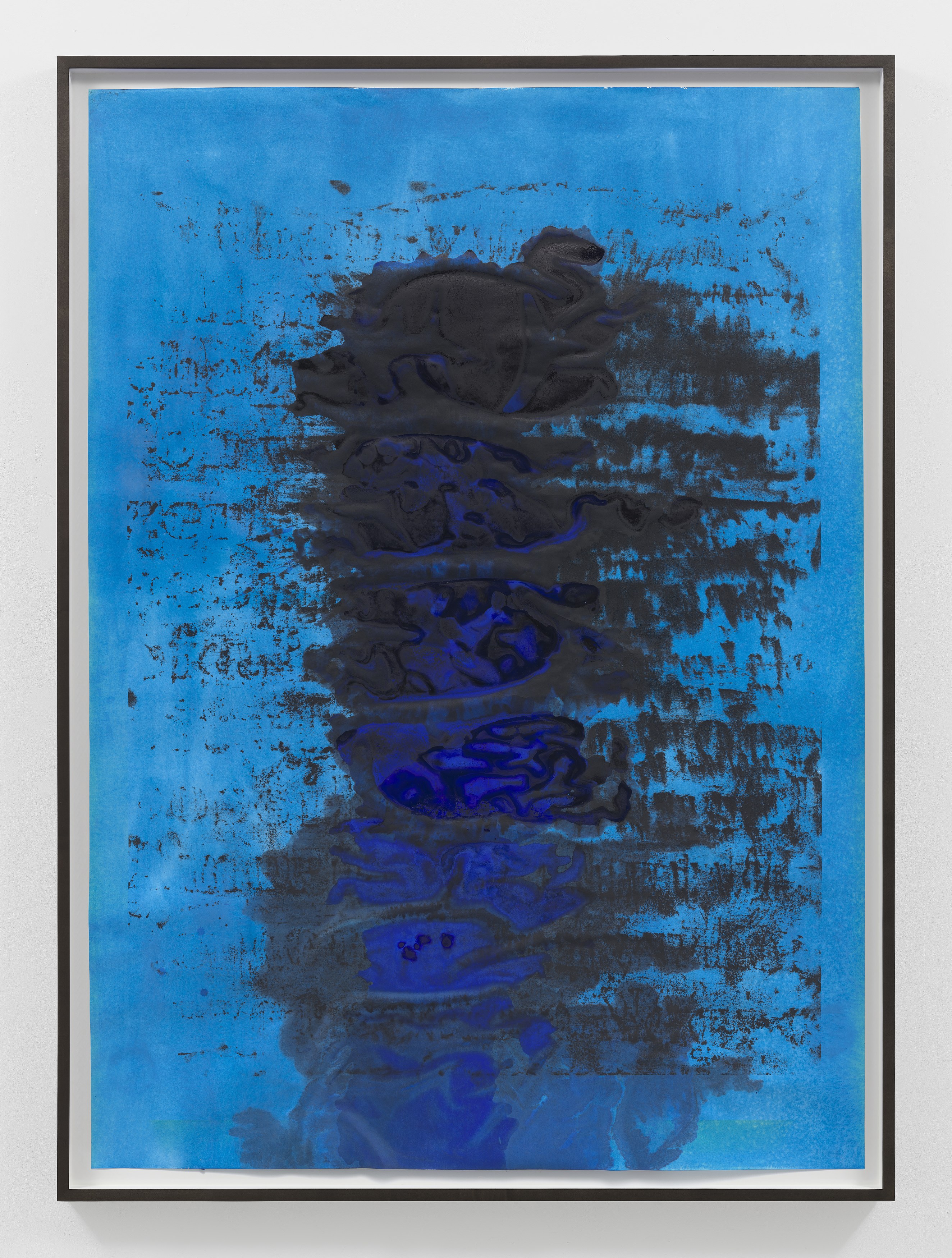 Hauser & Wirth is pleased to present ‘Late at night, early in the morning, at noon,’ a two-part exhibition of new and historic works on paper by Glenn Ligon. This presentation extends the artist’s longstanding engagement with language and abstraction through a series of richly layered compositions that meditate on the color blue and its emotional, historical and cultural inflections. In dialogue with the writings of James Baldwin, Ligon’s latest work here traverses the space between legibility and sensation, where text dissolves into atmosphere and meaning into light.