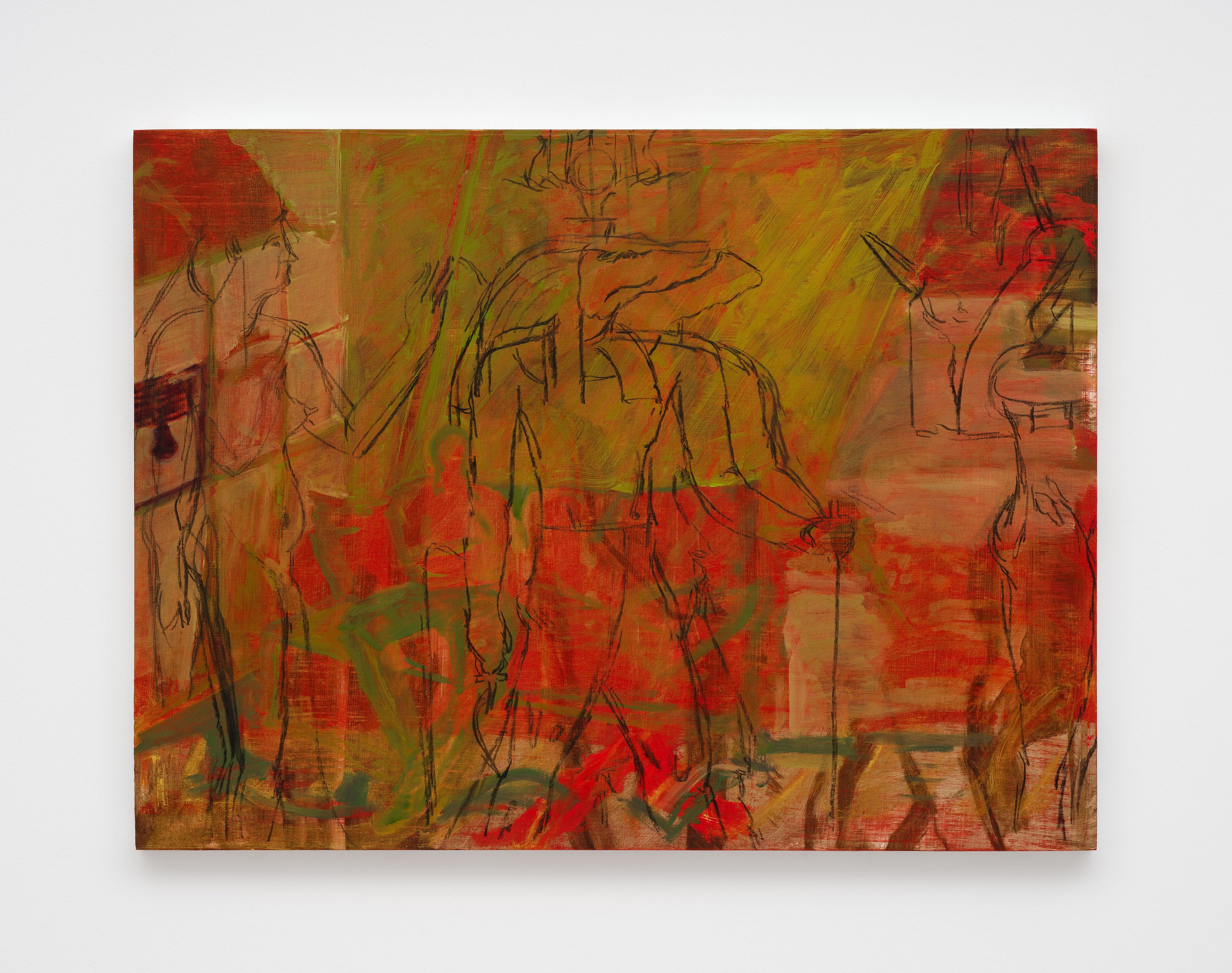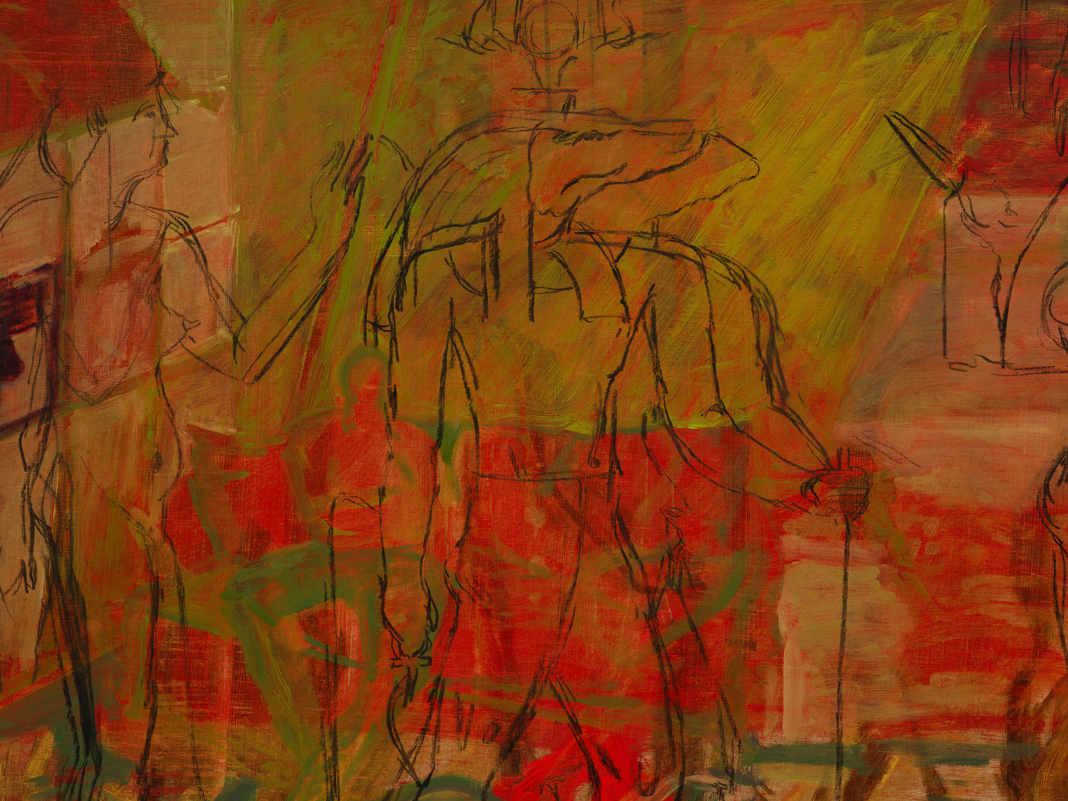 Needing to stand on art history is out. The present tense is in. These lines in Acosta’s painting manifesto cut to the heart of her project. At odds with the slow pace of oil painting, Acosta pushes her medium to achieve a swift communication usually reserved for drawings. Often working with a dry brush and very little solvent, she emulates the texture of charcoal scribbled on paper. Ephemerality and permanence coexist, with ancient religious motifs alongside memories from yesterday. Acosta is clear that despite ritualistic references in her work, she is not interested in the transcendent. Rather, the city, the…
