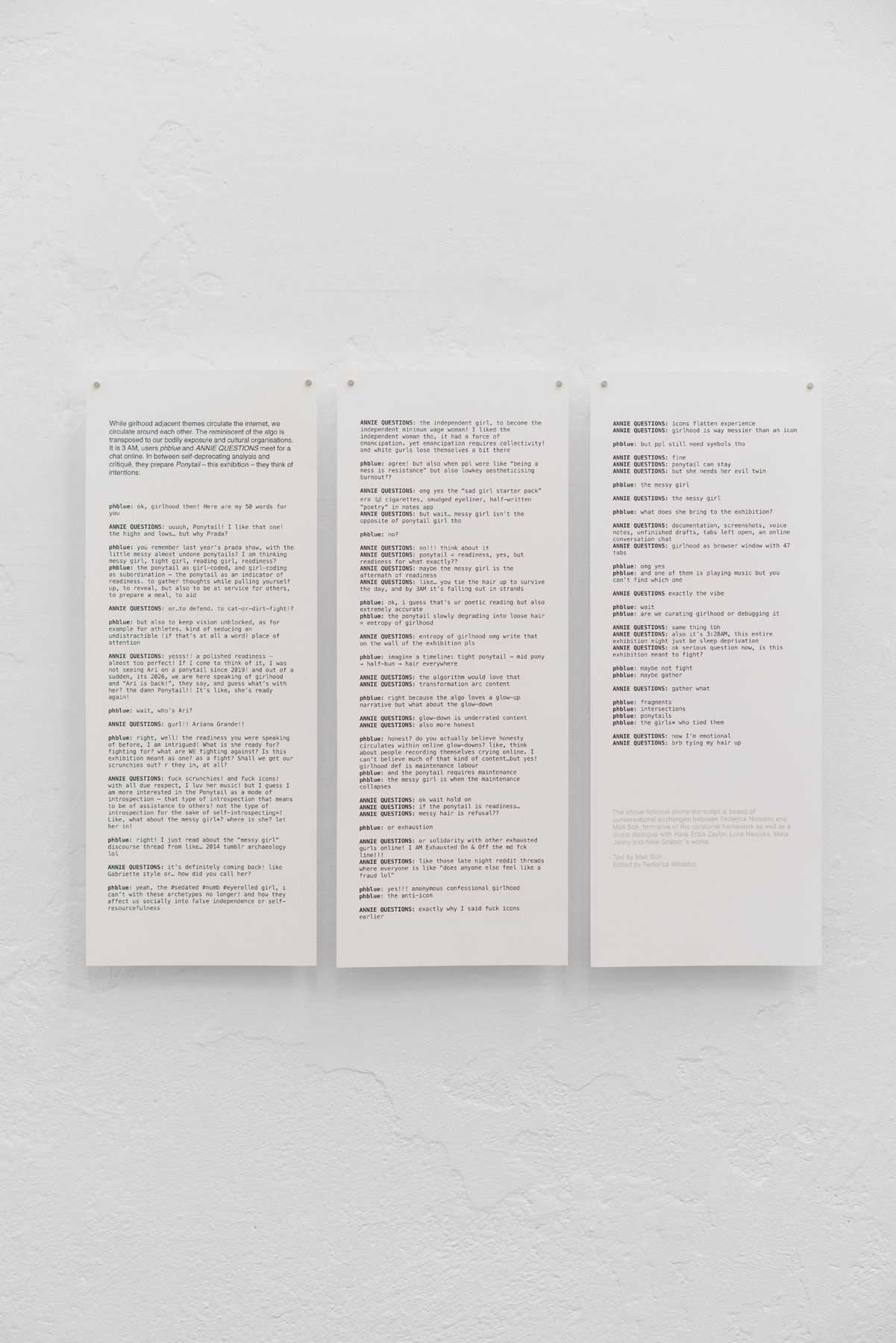 Ponytail unfolds as an inquiry into forms and signals of concentration, one where the gesture of tightening long hair turns into a declaration of focus, introspection, and coded girlhood. Drawing from hinted archetypes circulating around the internet and intimate storytelling, Ponytail shapes a space where readiness meets softness.