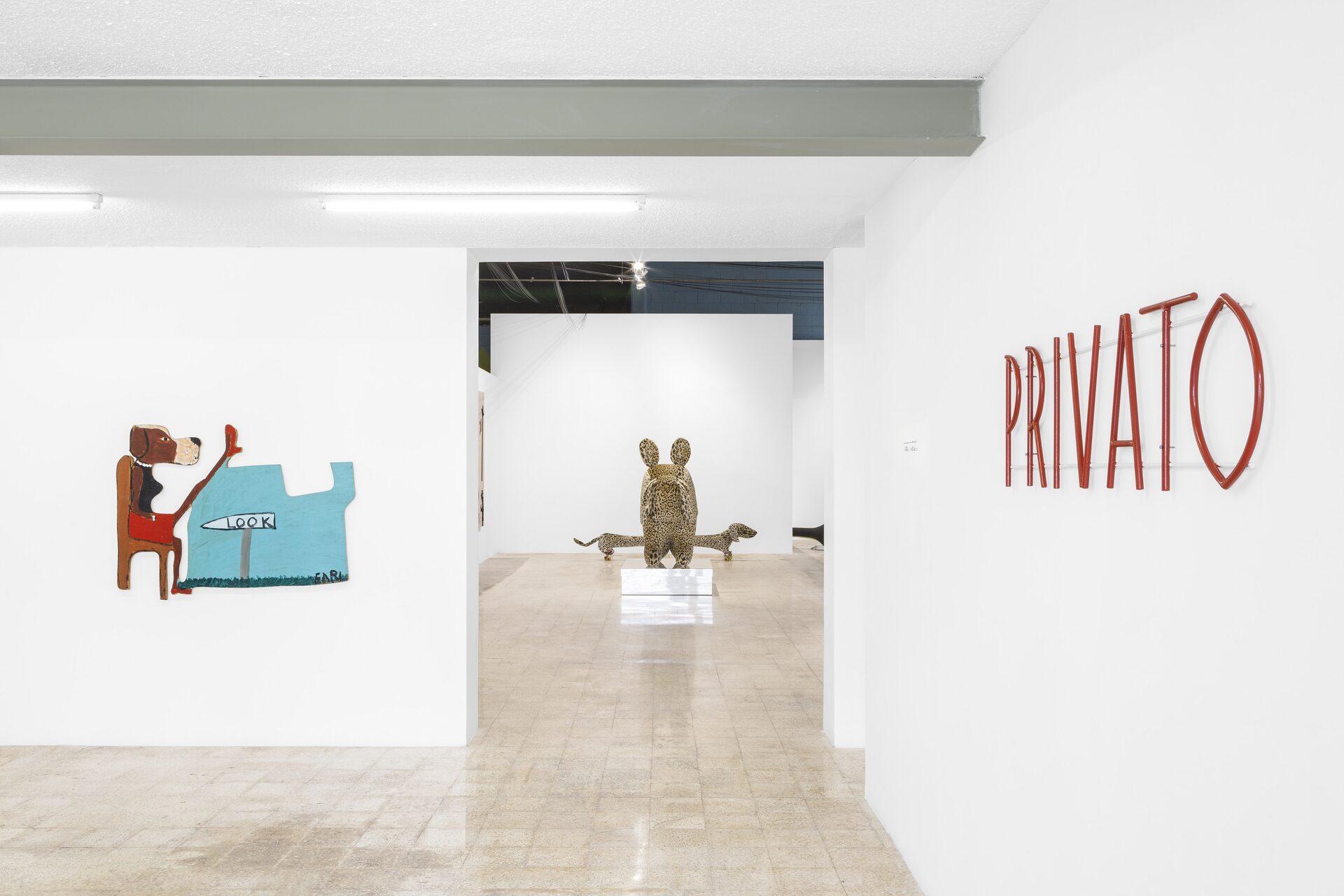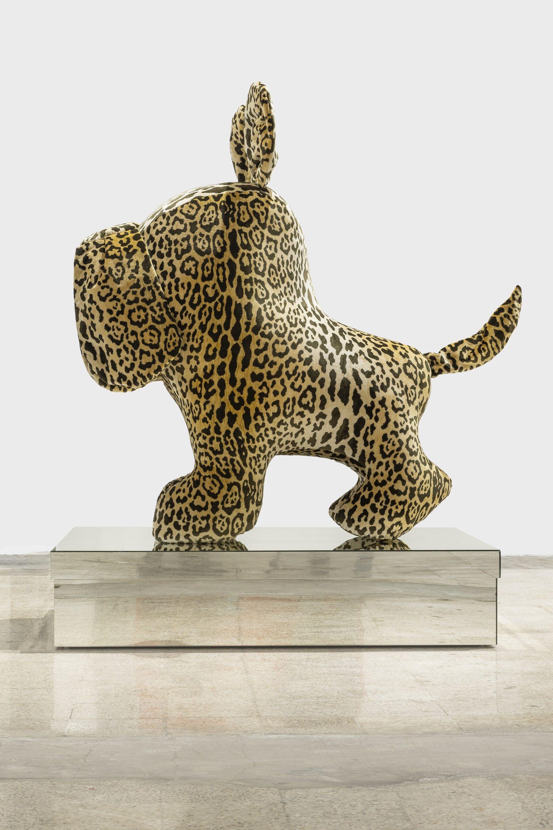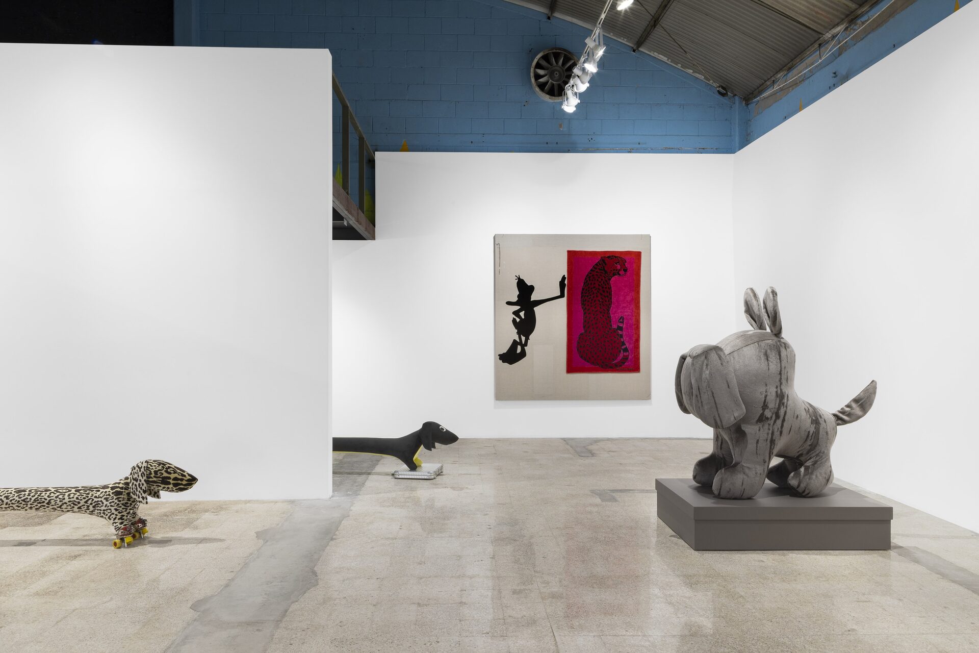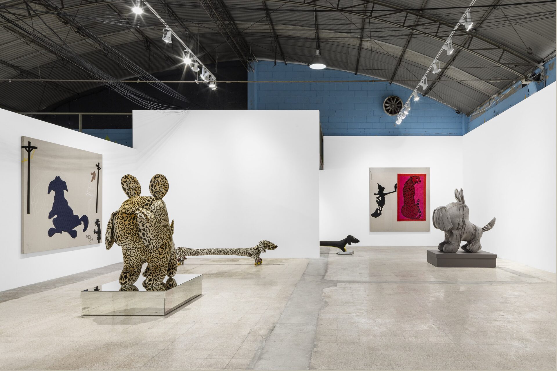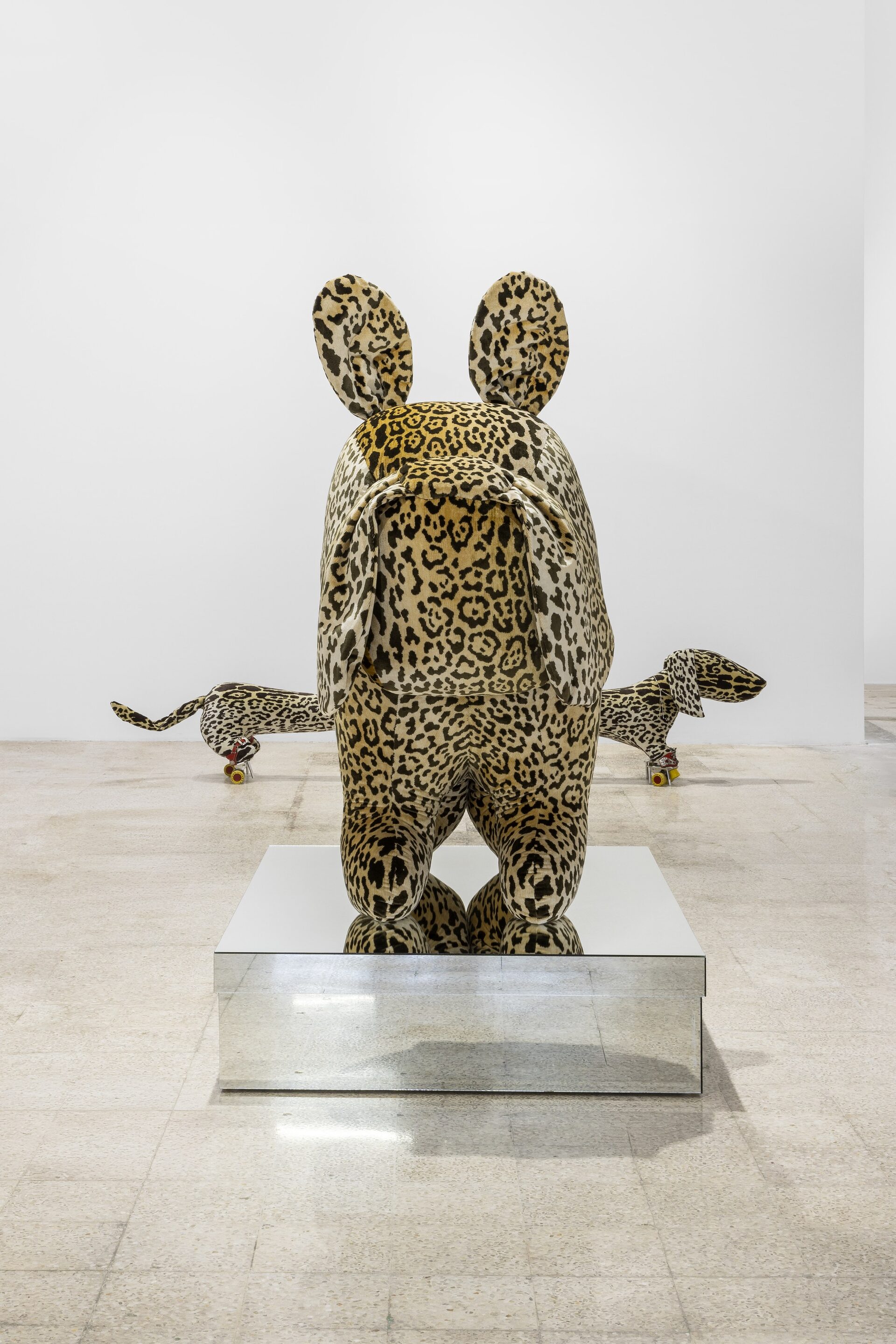 Nor should I also refrain from writing anything about those stuffed dachshunds that so charmingly cross the gallery, or about those enormous bulldogs covered in leopard print?