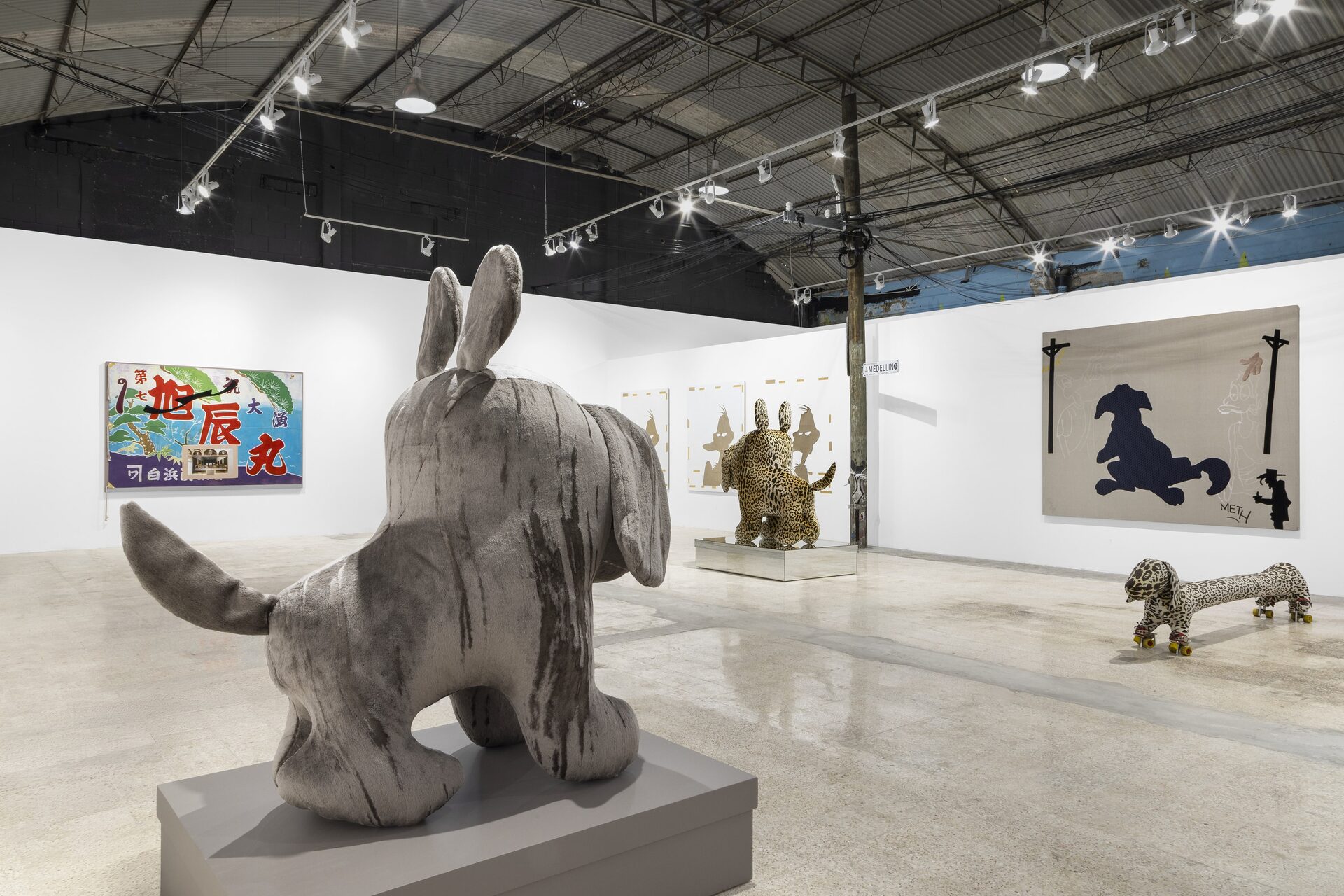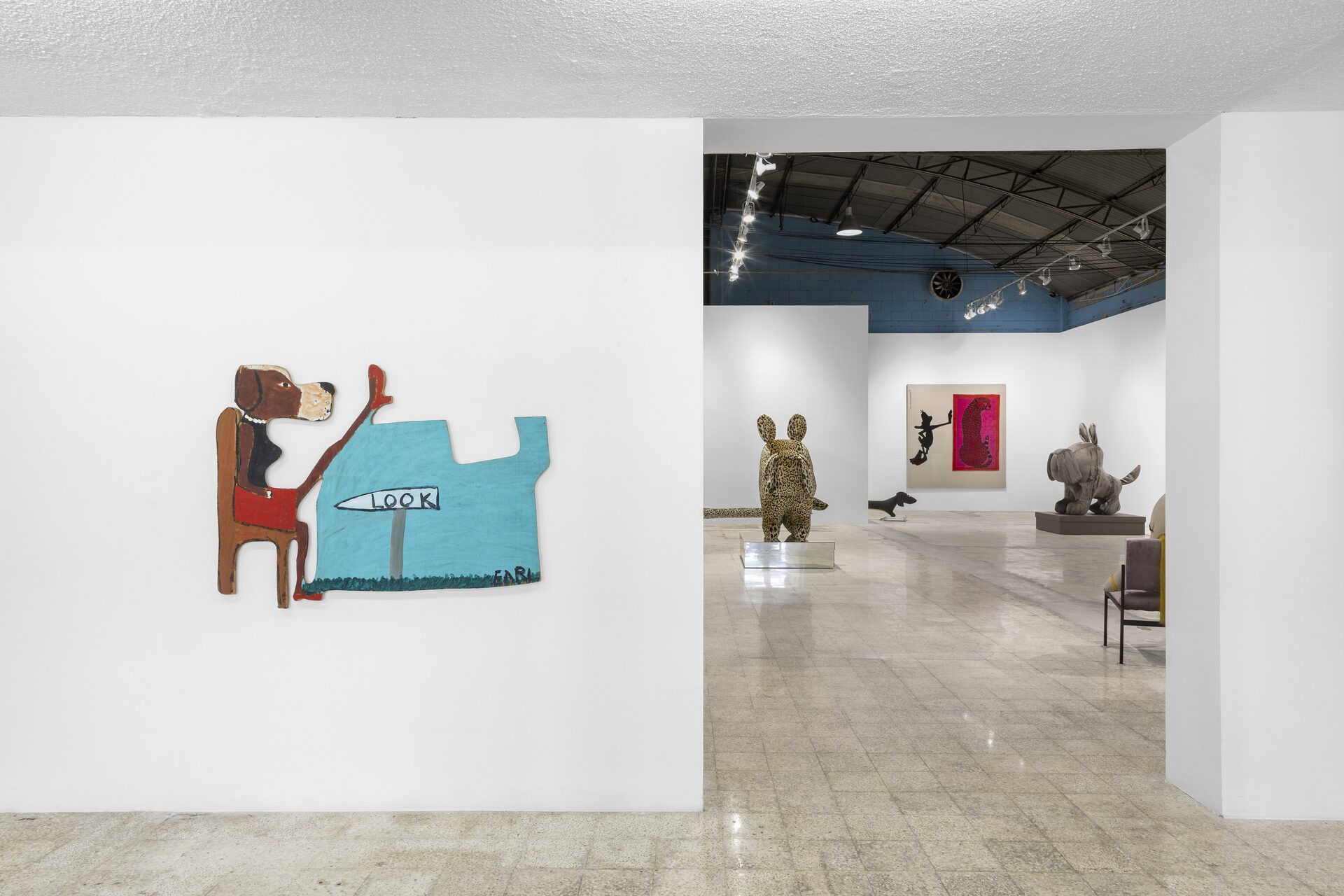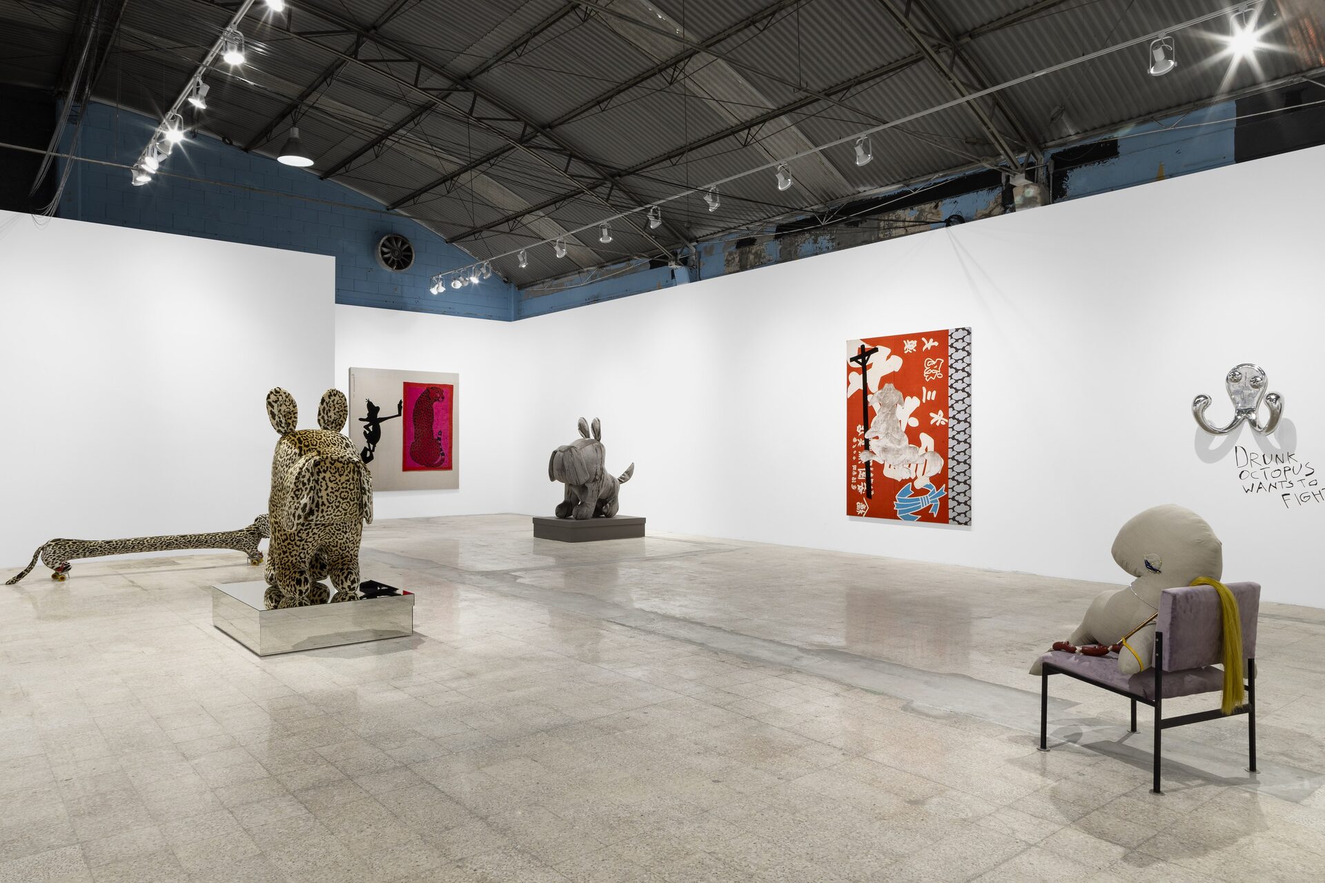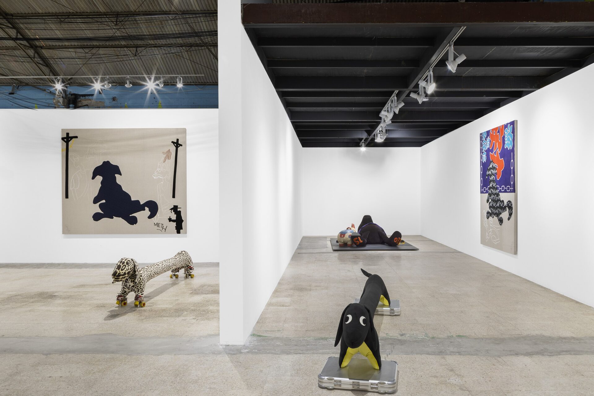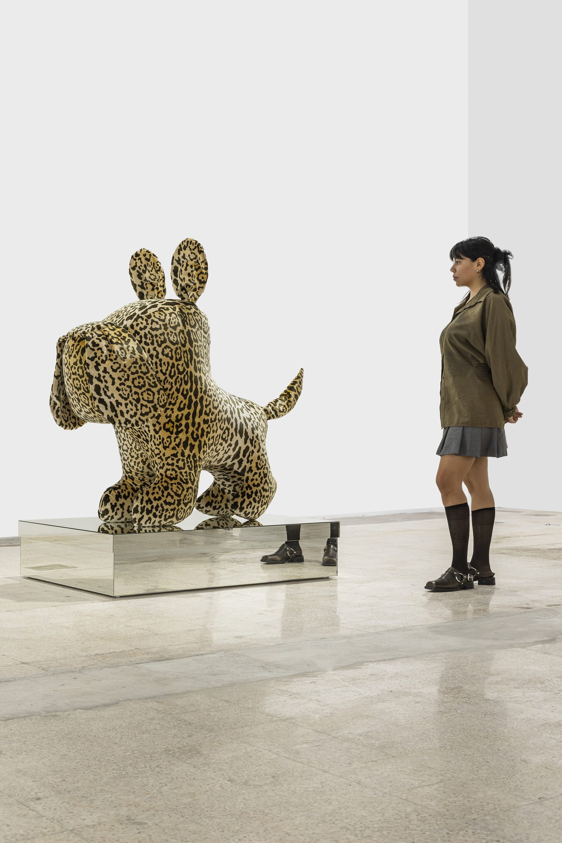 Nor should I also refrain from writing anything about those stuffed dachshunds that so charmingly cross the gallery, or about those enormous bulldogs covered in leopard print?