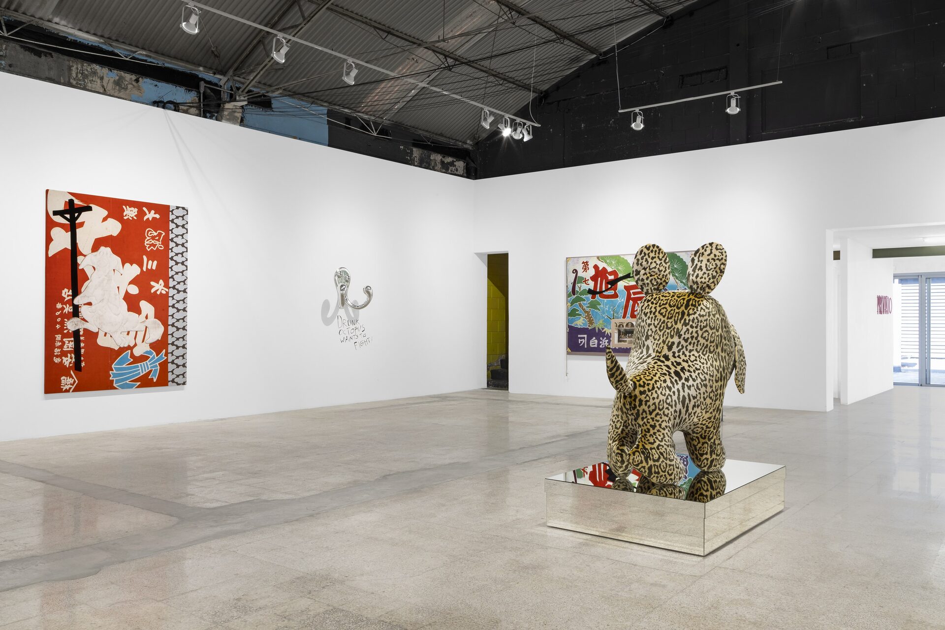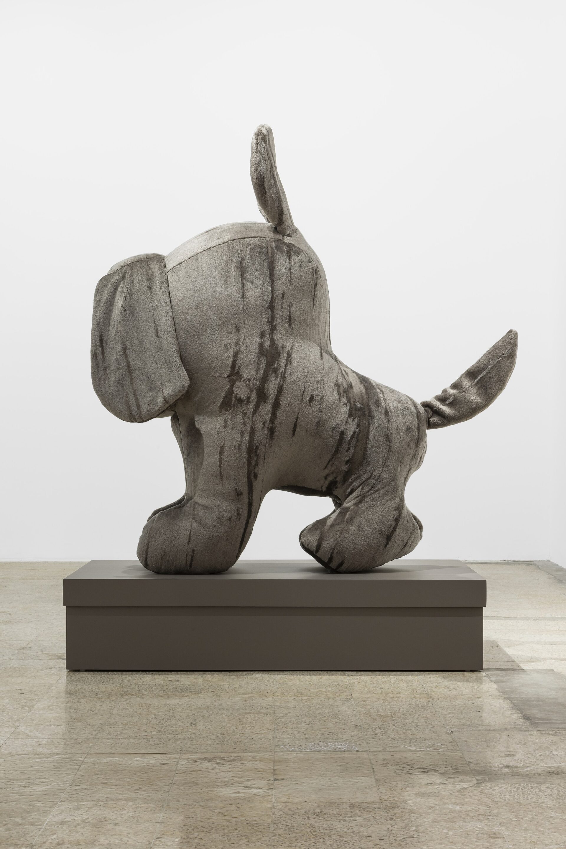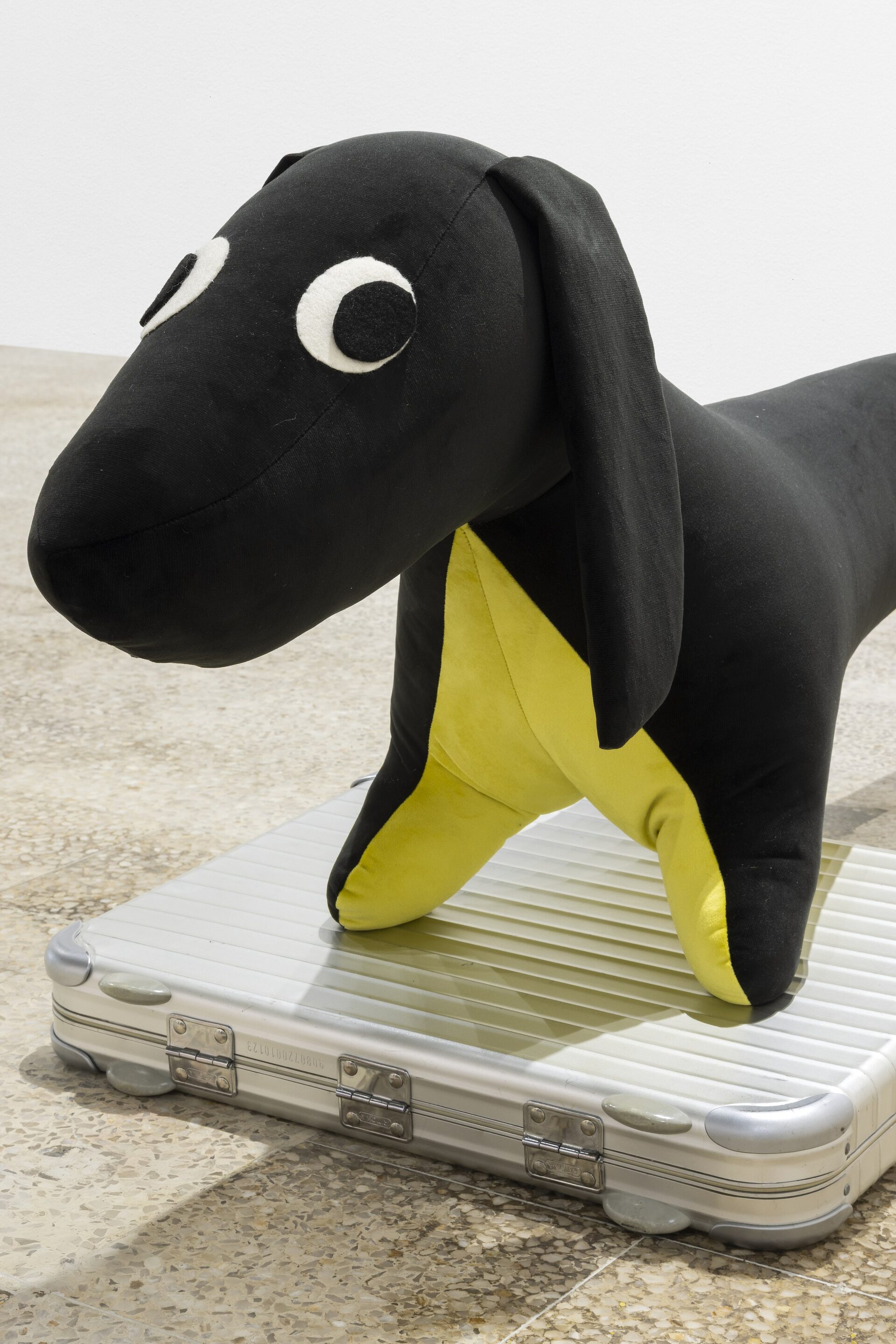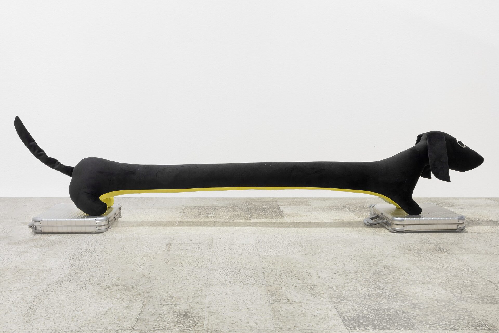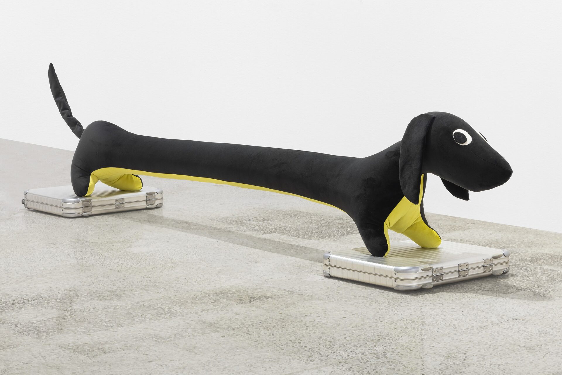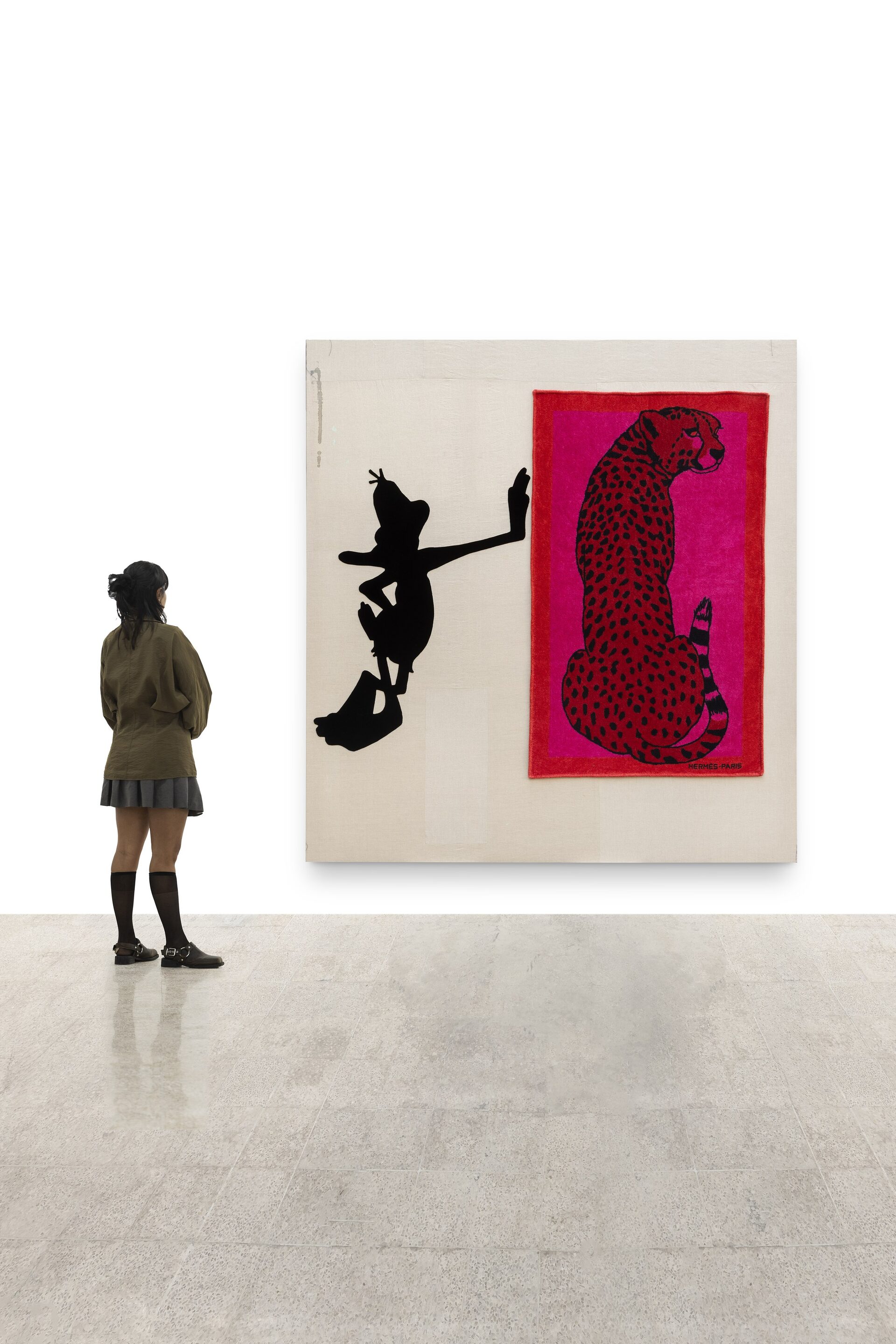 Nor should I also refrain from writing anything about those stuffed dachshunds that so charmingly cross the gallery, or about those enormous bulldogs covered in leopard print?