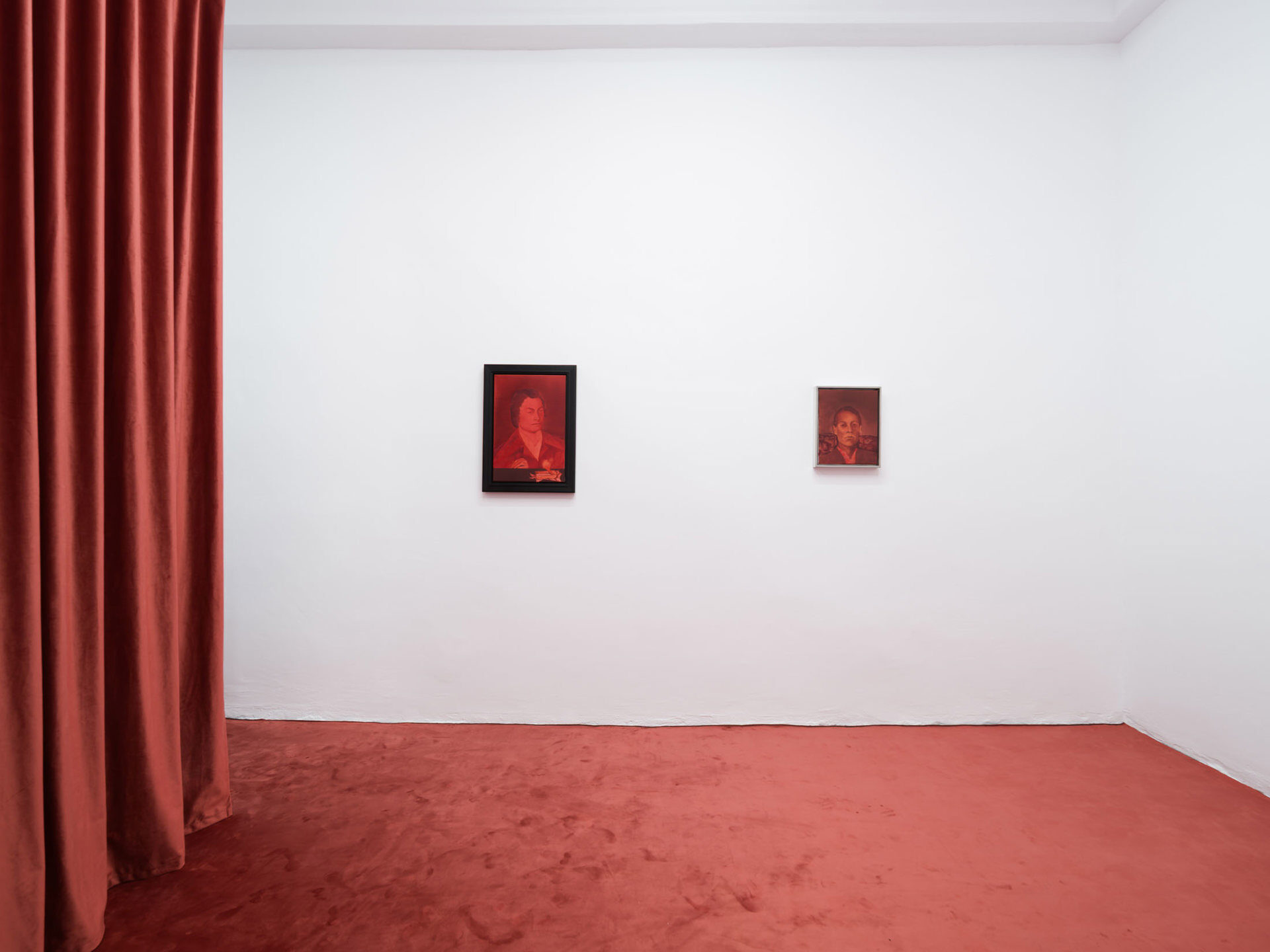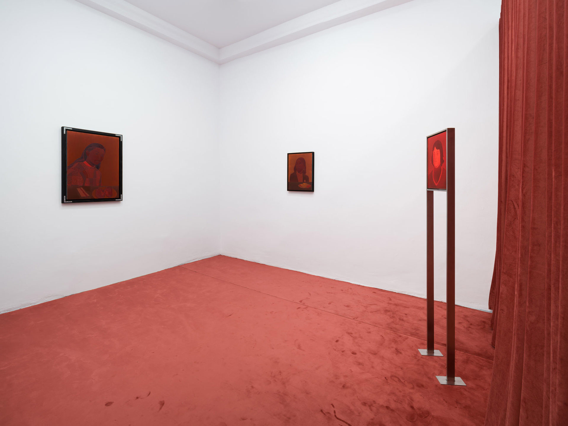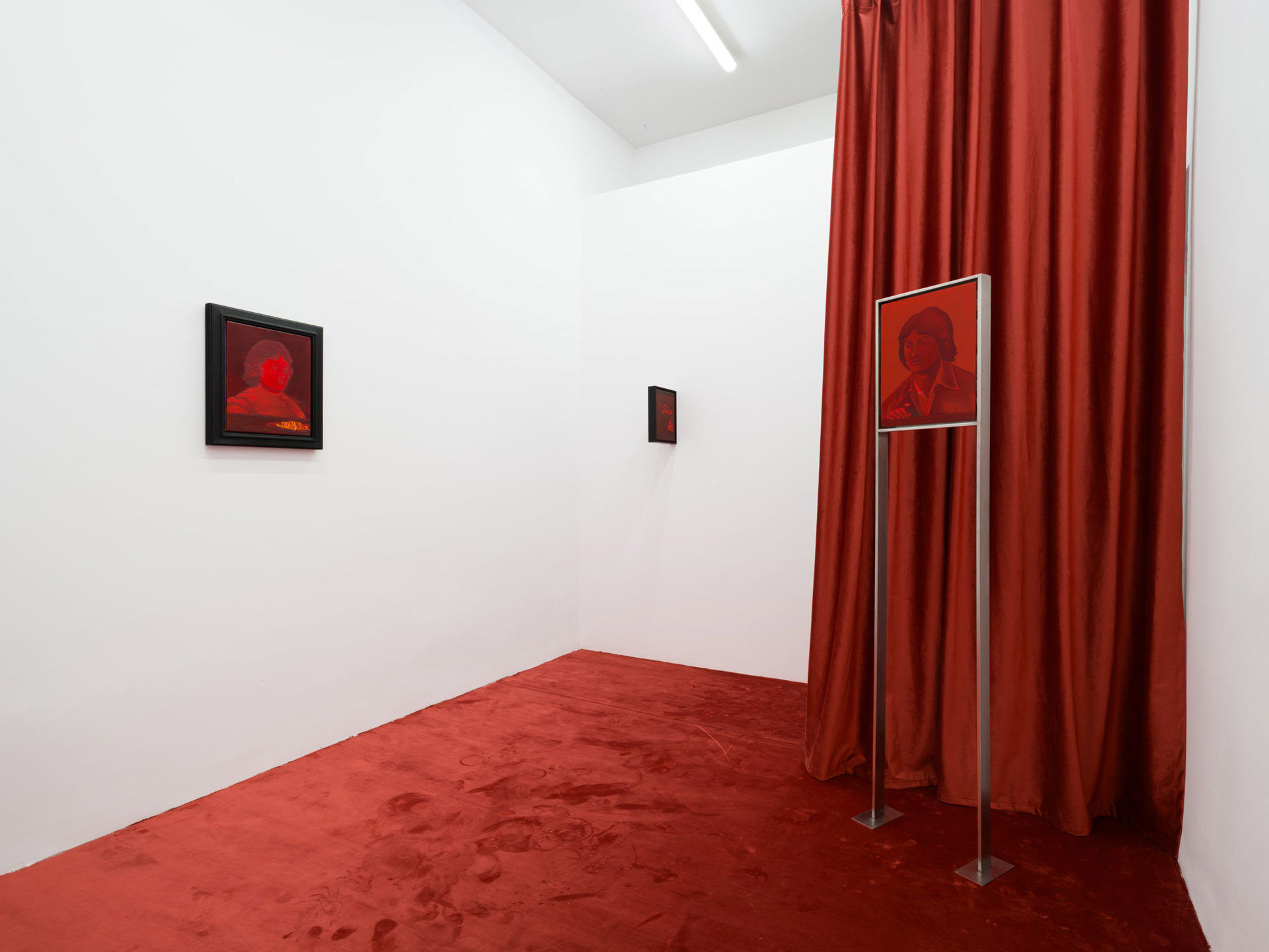 The works create a subtle dialogue between material and perception: the burgundy velvet of drapery, the fabric of the floor, dark tones, and metallic reflections set against stark white walls form a sensorial interplay of textures and atmospheres. These formal choices echo the variability of light and the subjective nature of sight. Semeniuc navigates human essence through the lens of filiation and shared memory, crafting a space where personal mythology meets collective imagination. The Renaissance emerges…