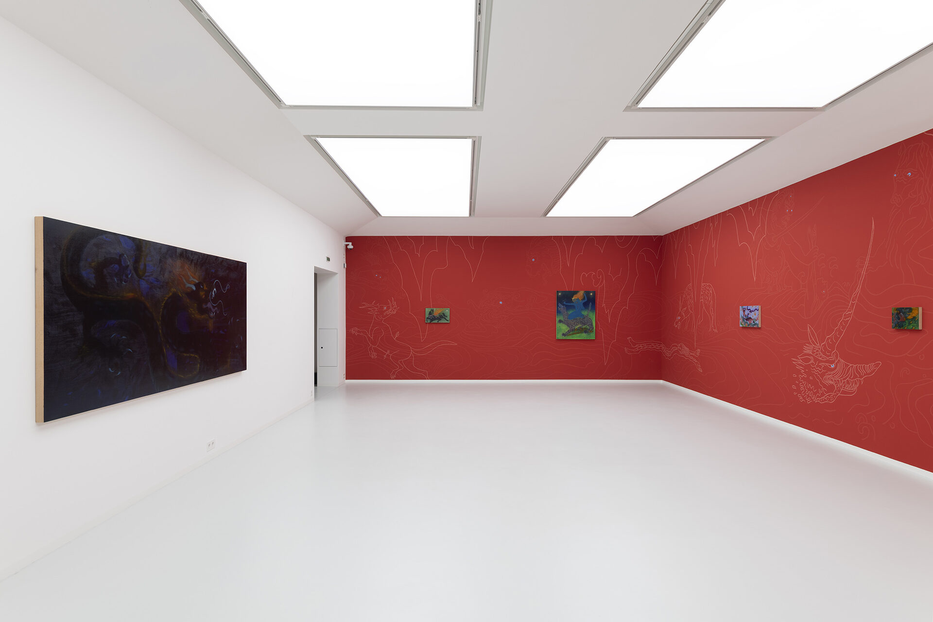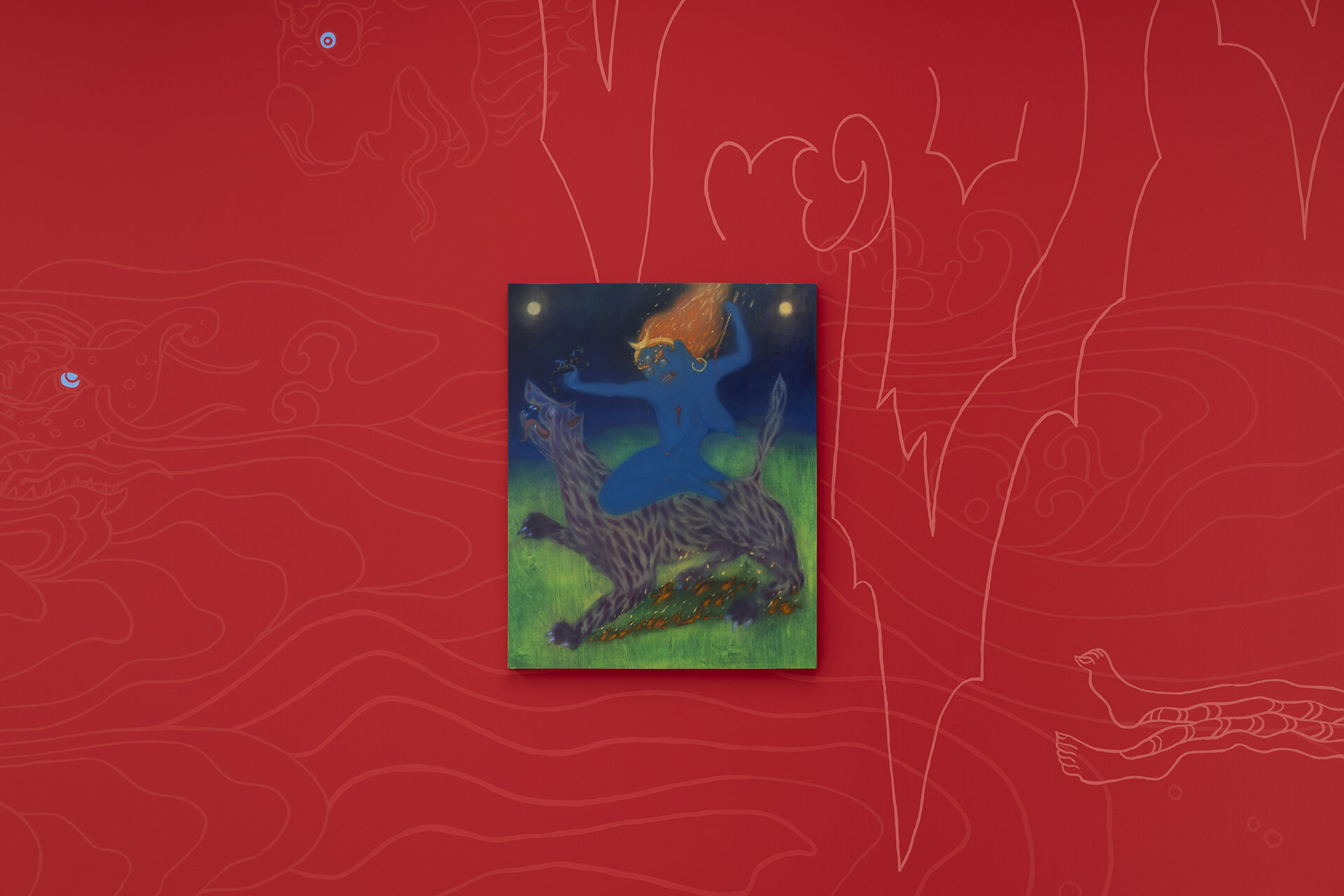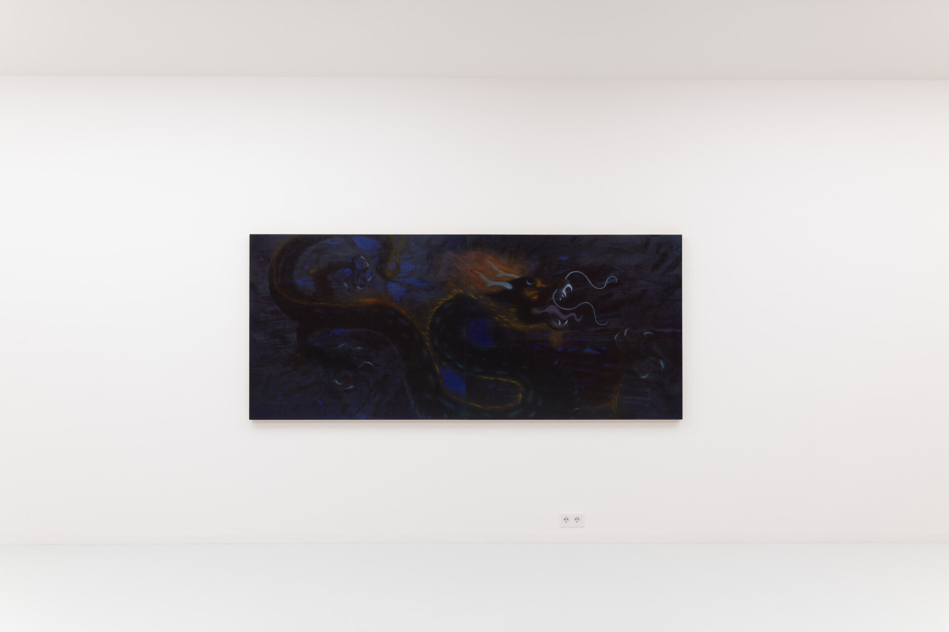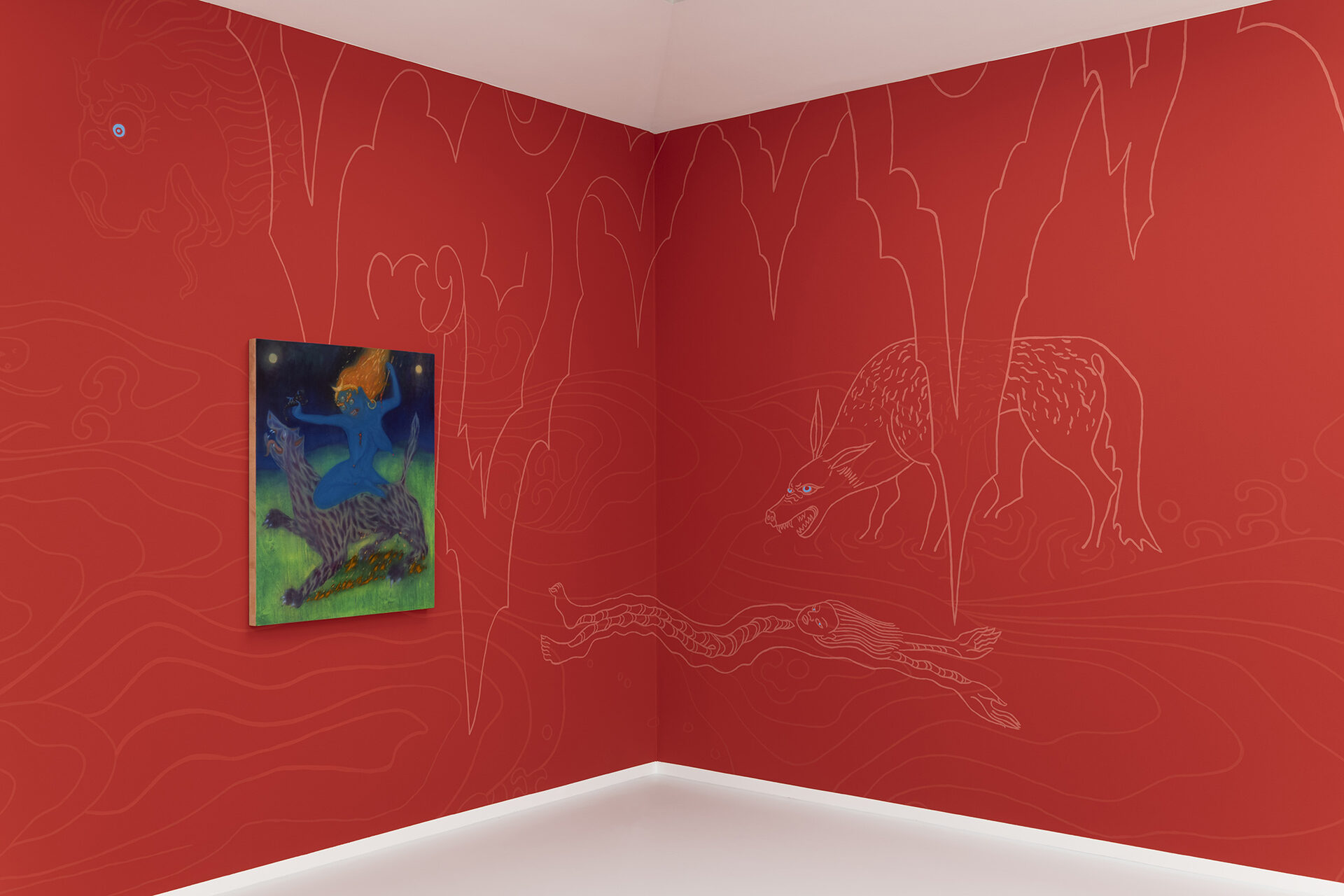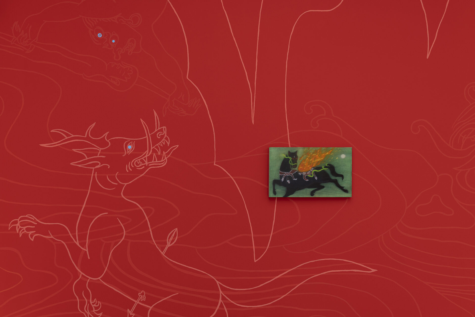 The Mongolian painter and video artist Javkhlan Ariunbold (*1990 in Ulaanbaatar; lives and works in Cologne) draws in her art on the myths and legends of her homeland, in which nature deities and sacred beings, often in animal form, play a central role. “Manggus,” the title of her exhibition at the Kallmann Museum, translates from Mongolian as “monster” and refers to a mysterious figure that personifies evil. We all know such figures from fairy tales and myths, and they also played an important role in the stories told by Ariunbold’s parents and grandparents.