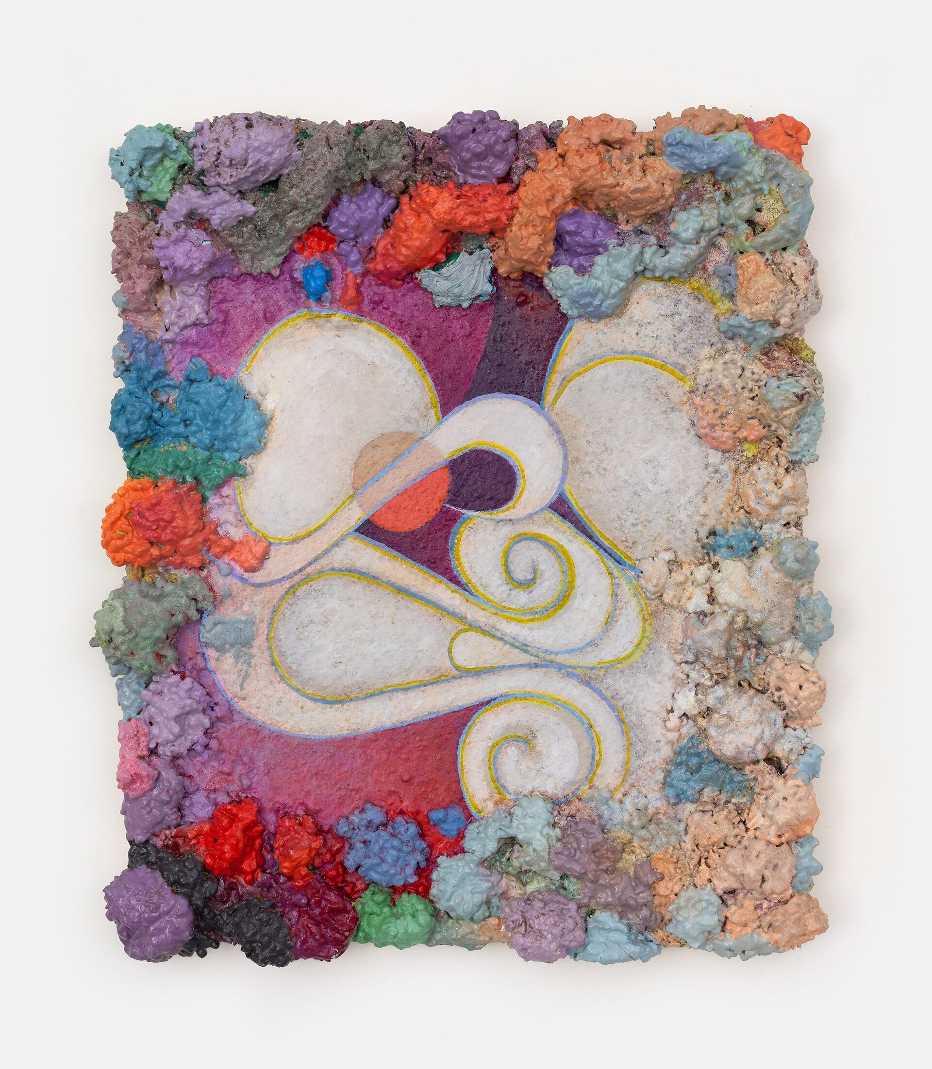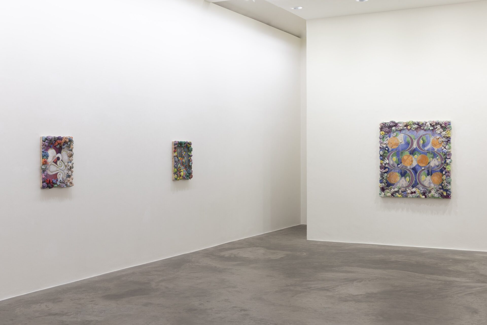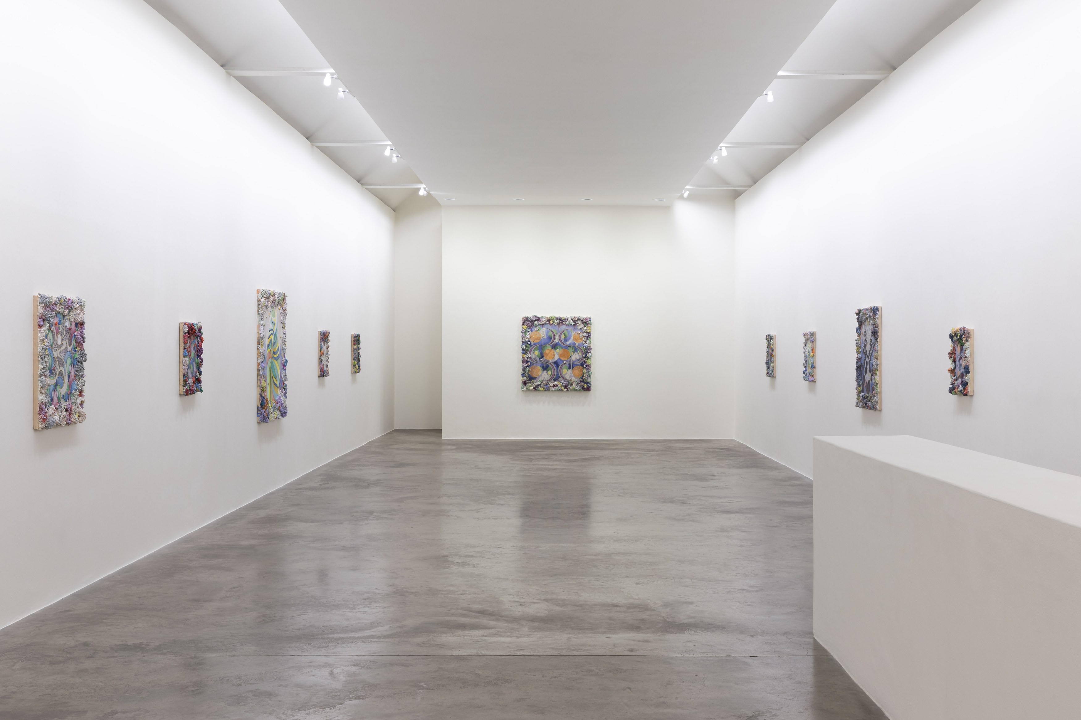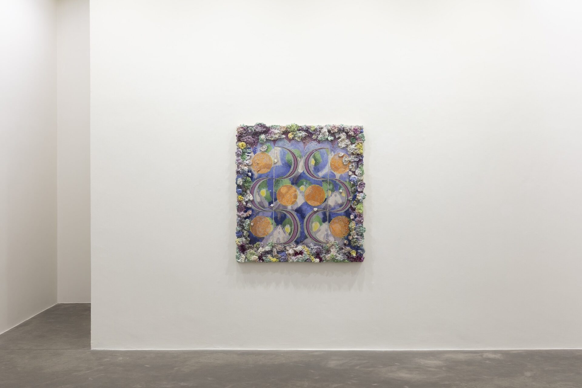 Described by art critic John Yau as “one of the great painters of his generation”, Phillip Allen has refused to settle into any one mode or style, choosing instead to continually push the possibilities of the picture plane resulting in paintings that are sculptural, optical and joyously excessive. Dense accretions of acrylic and oil paint form thick, encrusted borders that frame finely worked interior fields. Within these interiors, rhythmic geometries, spiralling motifs and kaleidoscopic colour sequences unfold with a sense of buoyant improvisation.