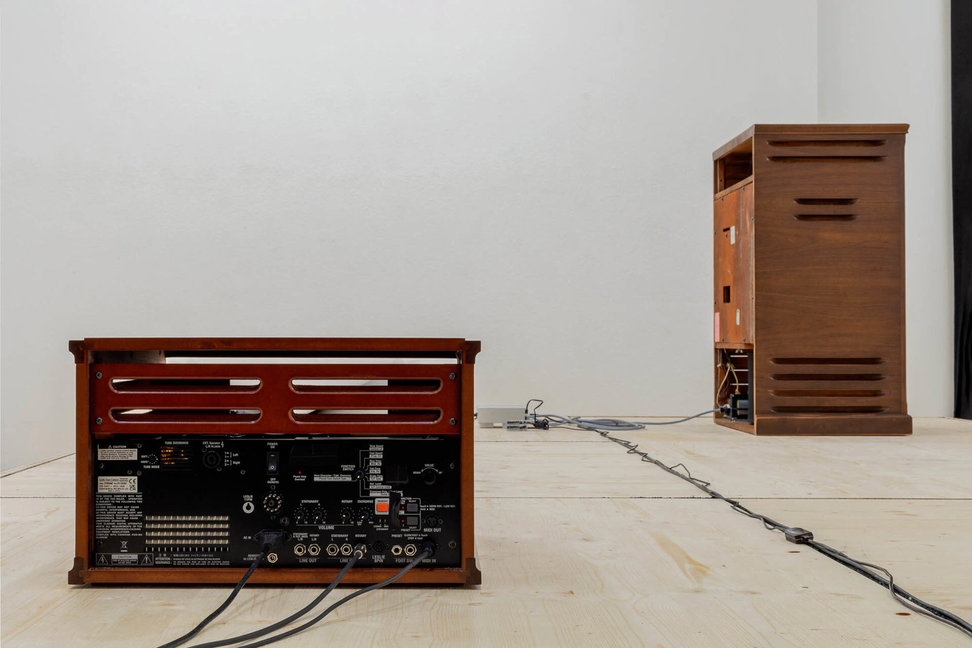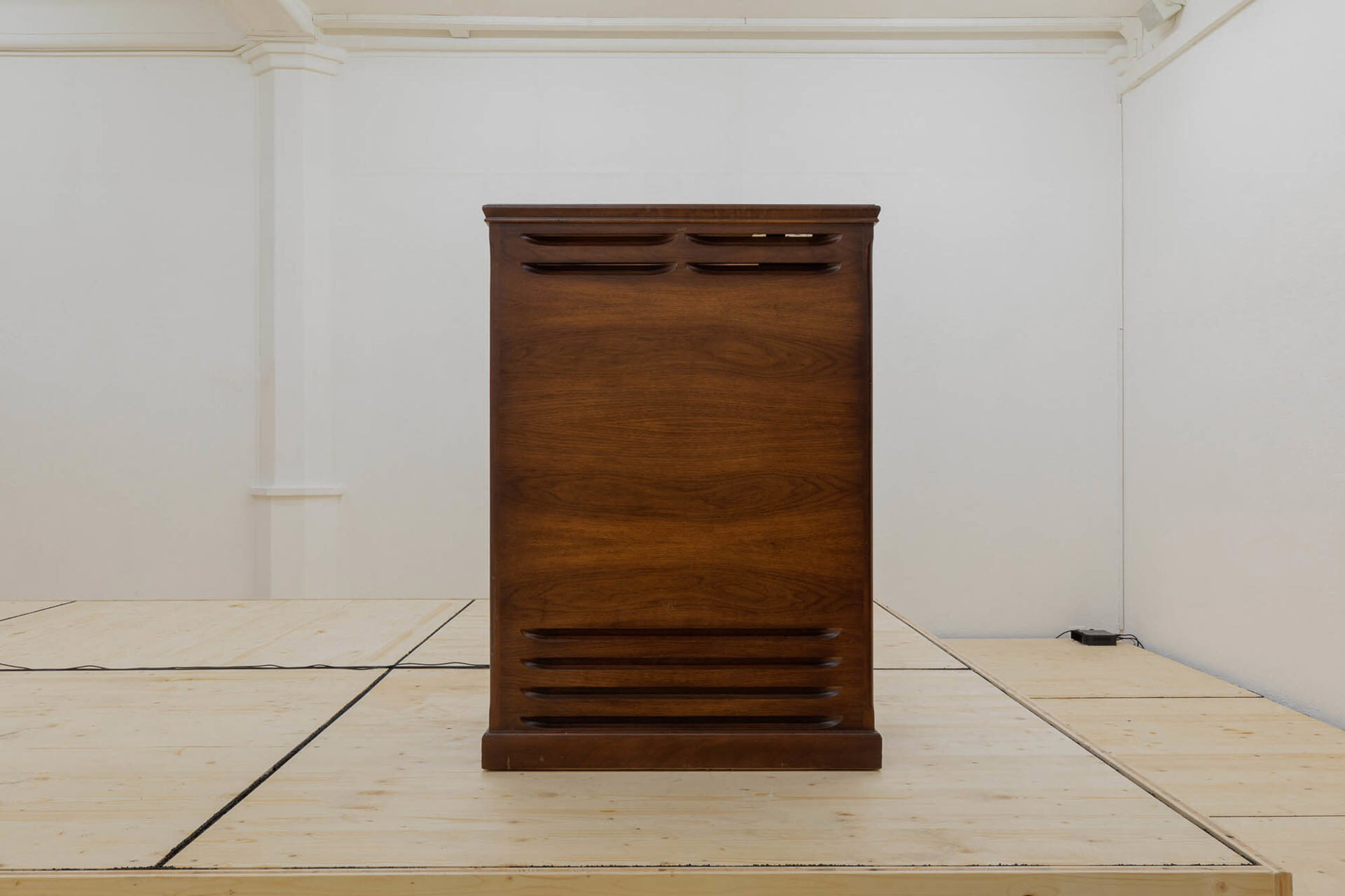 For this installation, Koch explores the acoustic phenomenon of the Doppler Effect, the way sound bends through movement. By extending the rotating mechanism of a Leslie speaker into the room’s architecture, we experience athe shift in frequency as sound moves closer or further away from us. It is motion-made music, a warping of sound. Like the rising pitch of a siren that moves through traffic or a plane passing by in the sky: sound warps through motion.