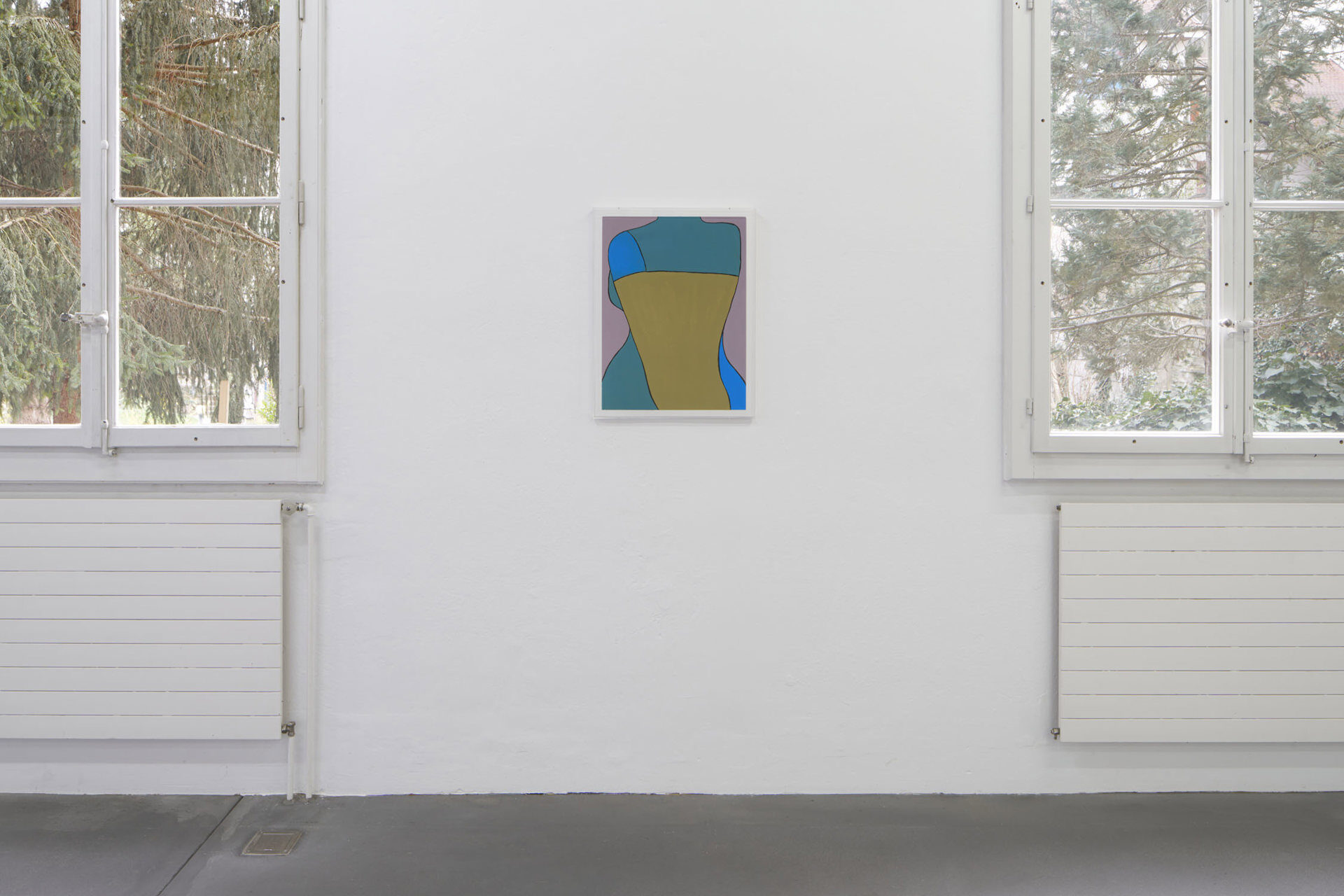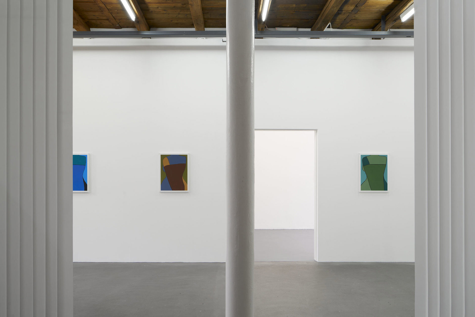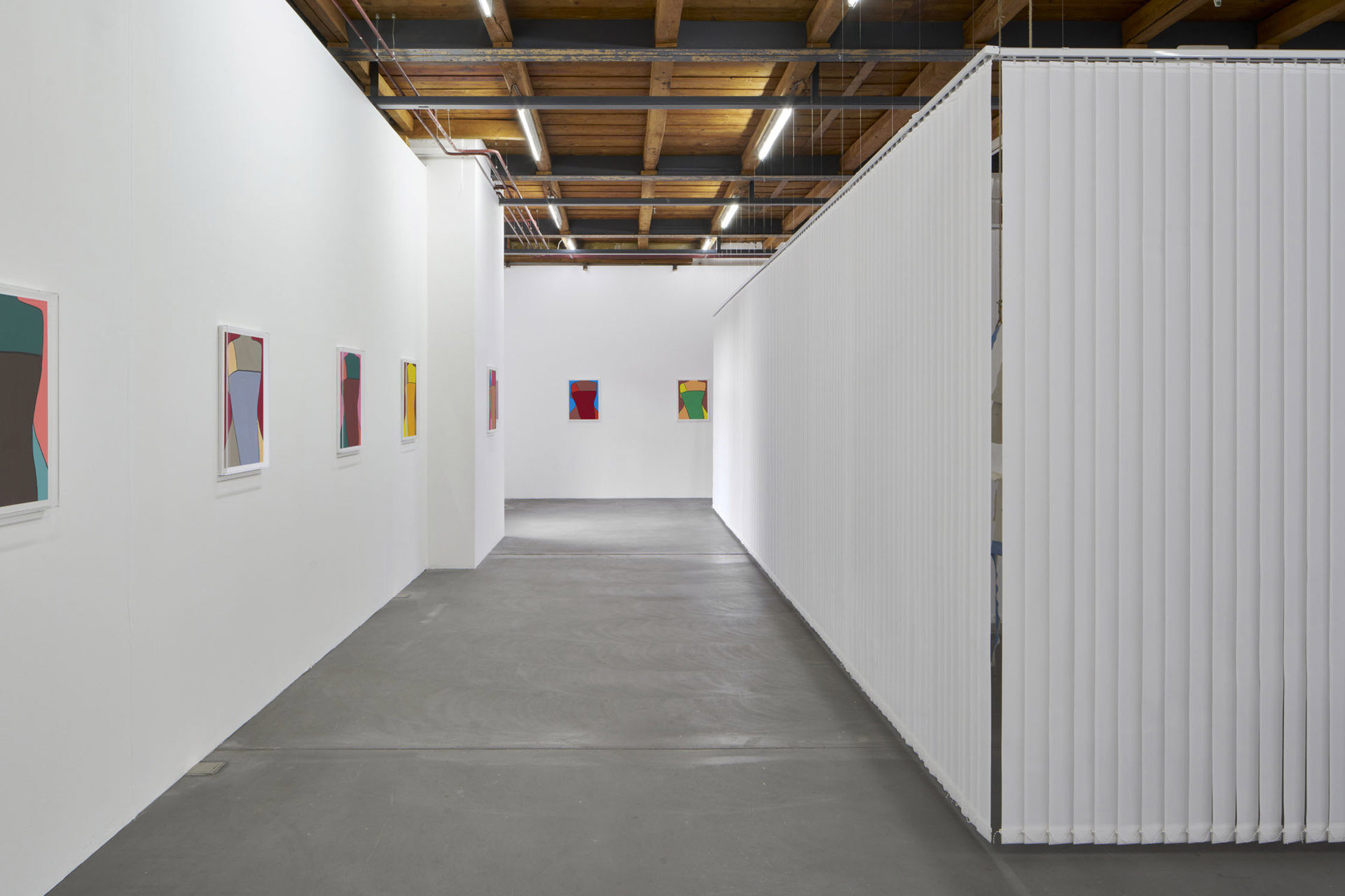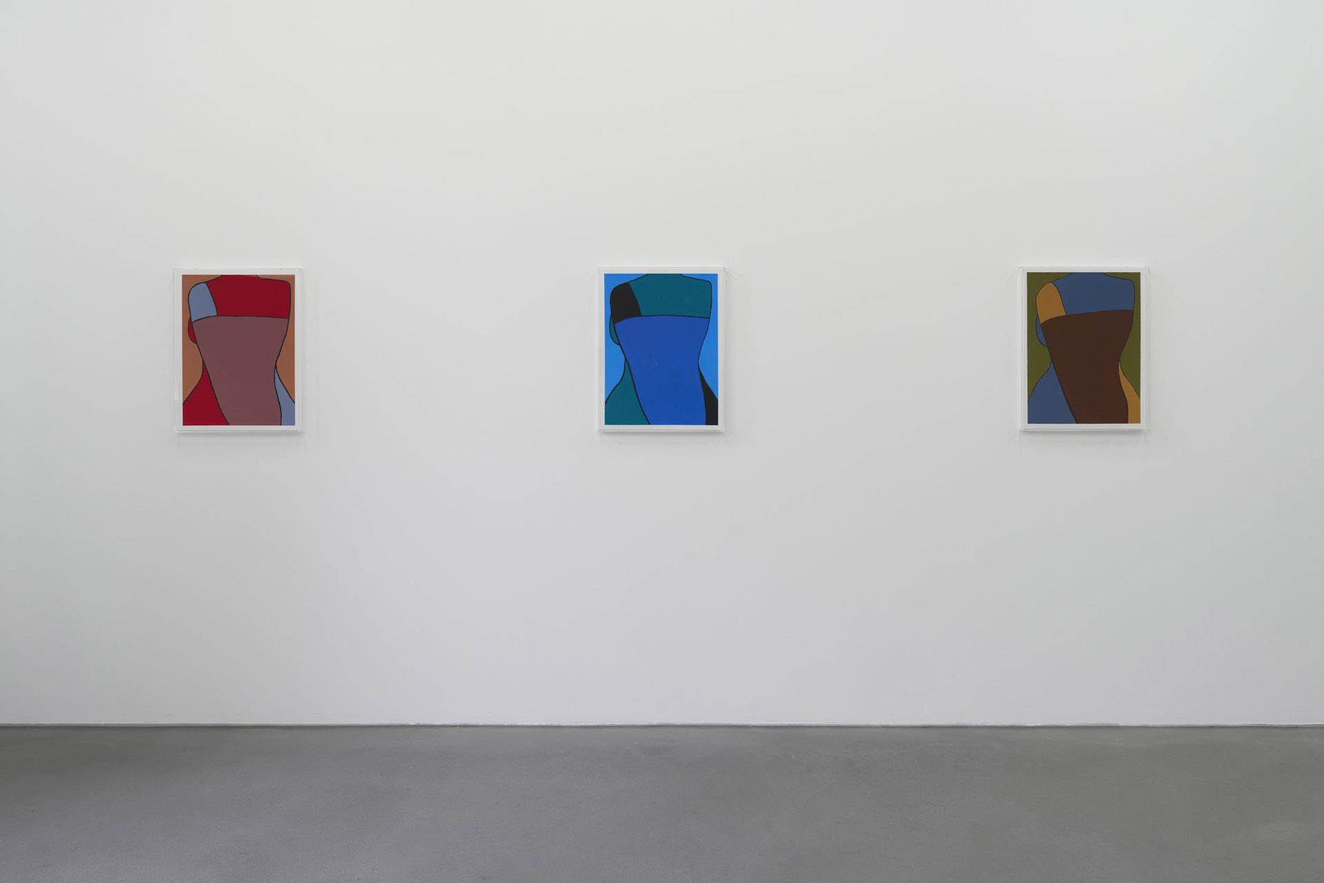 Her exhibition is made up of two ensembles. Outside the curtain, the motif of a bust is repeated across eighteen paintings on paper, with a series of different patterns cut. Reminiscent of preparatory work for a collection, the palette draws from a swatch of 110 colours developed by the artist for the work. Blocks of colour appear side by side in each painting, without any mixing taking place. The figure seen from the back both resists representation and offers itself to abstraction. The curves that form the body…