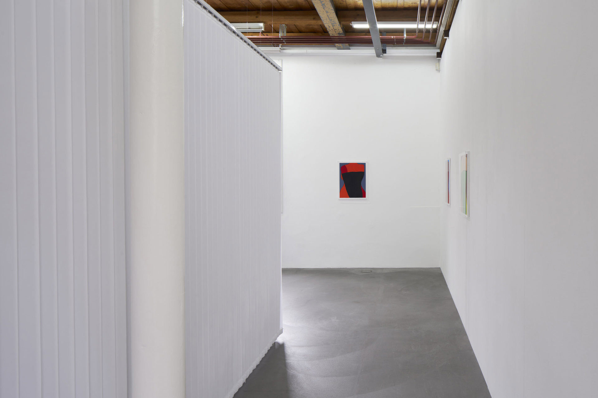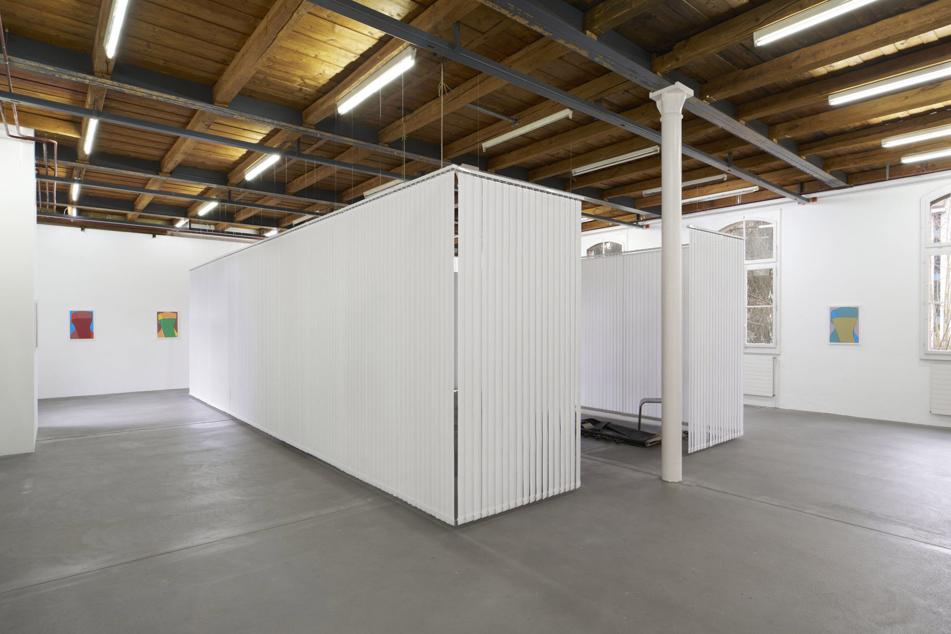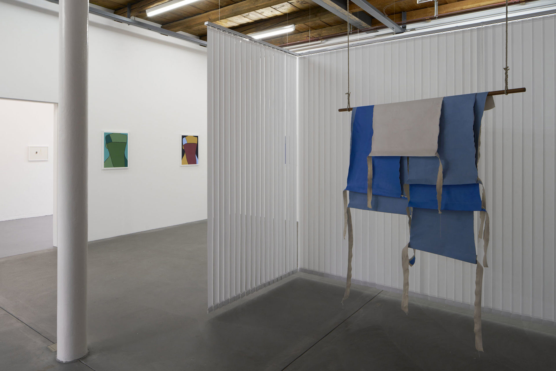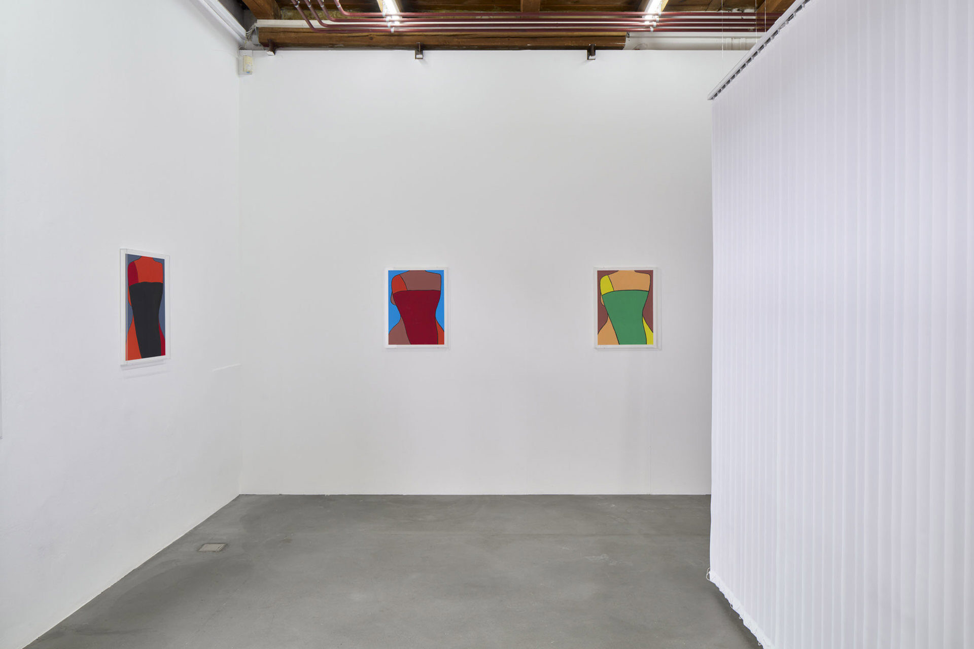 Her exhibition is made up of two ensembles. Outside the curtain, the motif of a bust is repeated across eighteen paintings on paper, with a series of different patterns cut. Reminiscent of preparatory work for a collection, the palette draws from a swatch of 110 colours developed by the artist for the work. Blocks of colour appear side by side in each painting, without any mixing taking place. The figure seen from the back both resists representation and offers itself to abstraction. The curves that form the body…