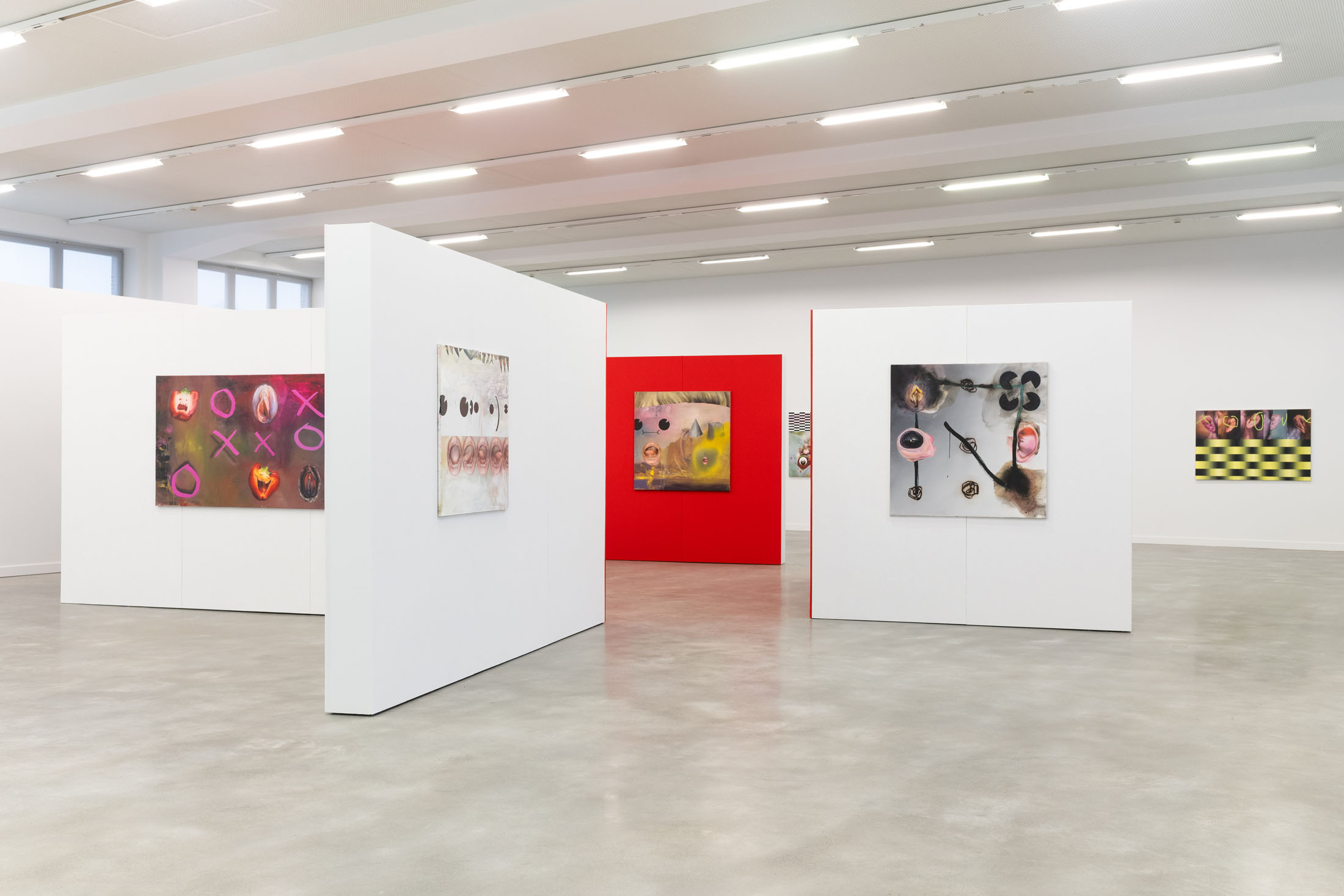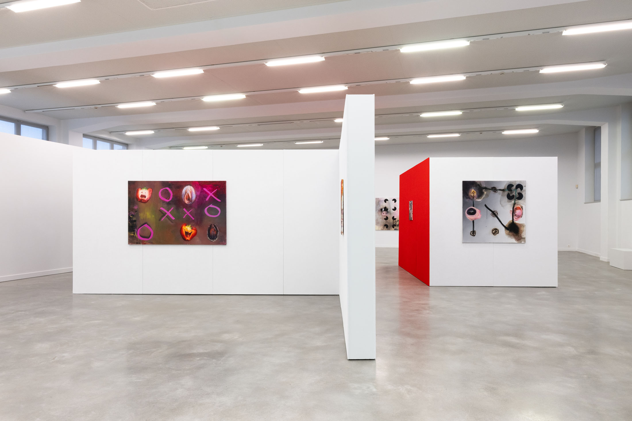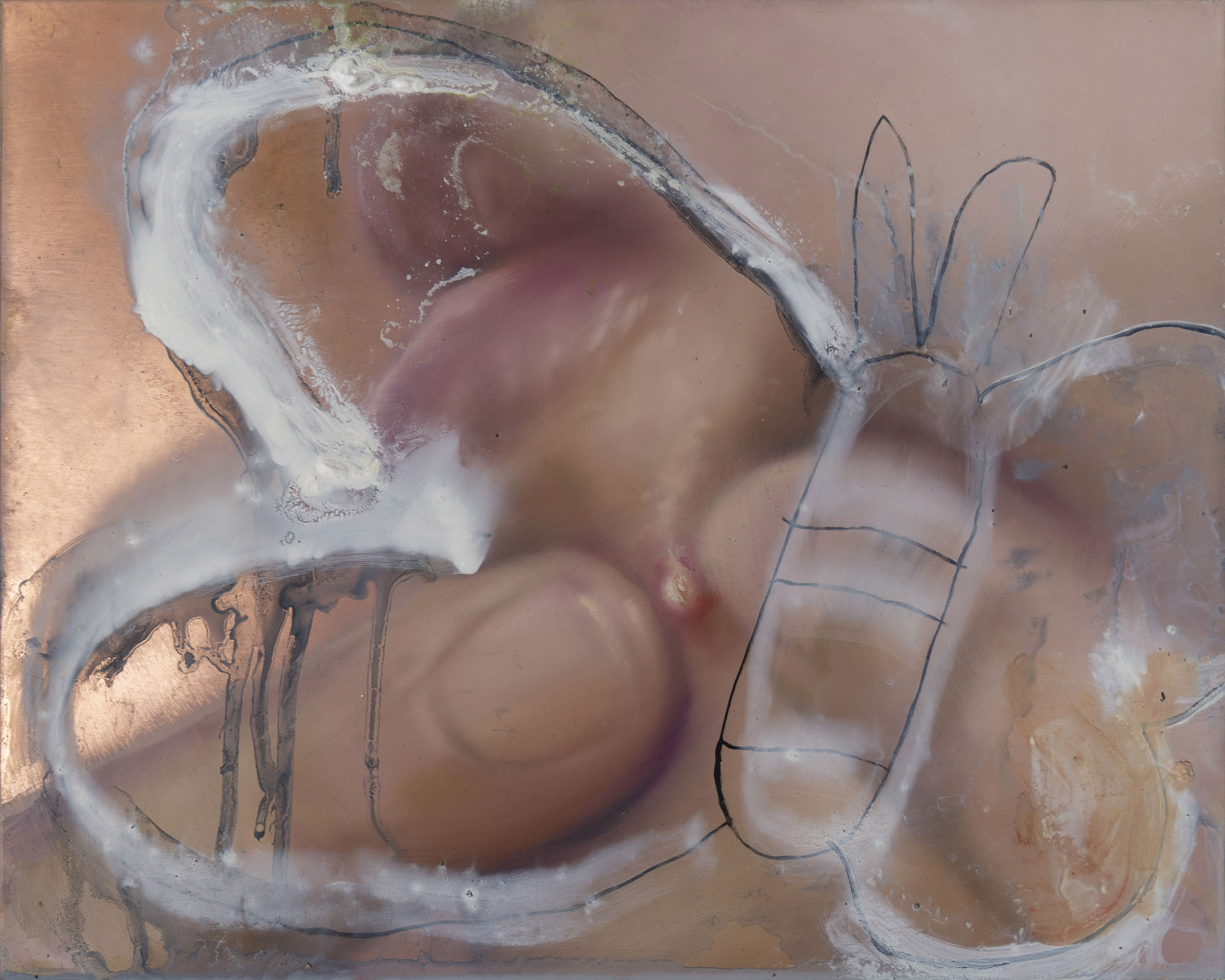 The artist works across three media simultaneously – paper, oil on canvas and copper plate – which continually influence one another. On paper, quick notes, cut-outs and shifts…
