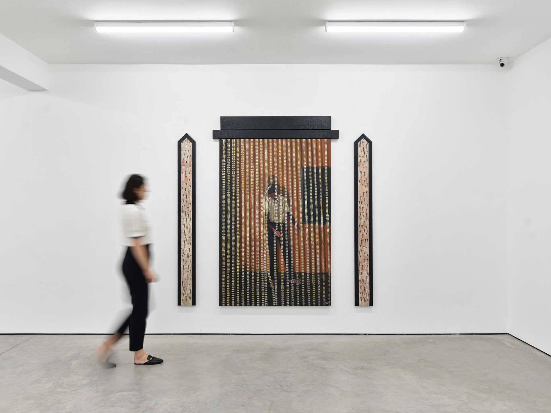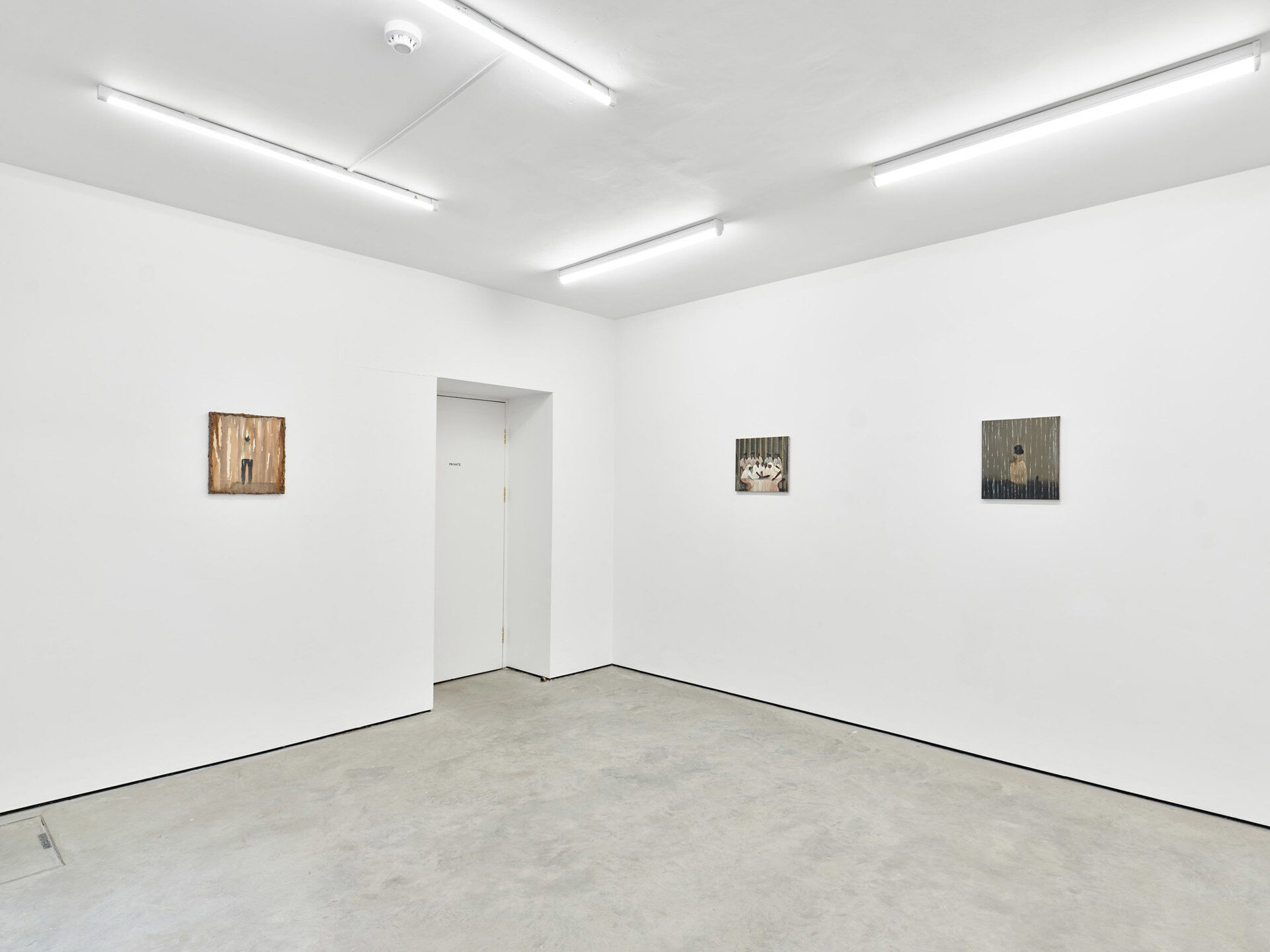 Surreptitious scenes and contemplative moments are on display in Seven Scenes of Separation. There is the question of whether one should really be intruding on these images at all. Abul Hisham’s, (mostly male), figures are held at a distance, painted behind strings of jasmine buds, showers streams of small coloured dots or showers of rain. Like a lace veil, these are porous barriers that are only mildly obscuring. There are lone figures that turn their backs as if reluctant to be subjects and protective of what appears to be their partaking in rituals. There are those pictured in tight, secretive huddles. They hardly ever meet the viewer’s eyes.