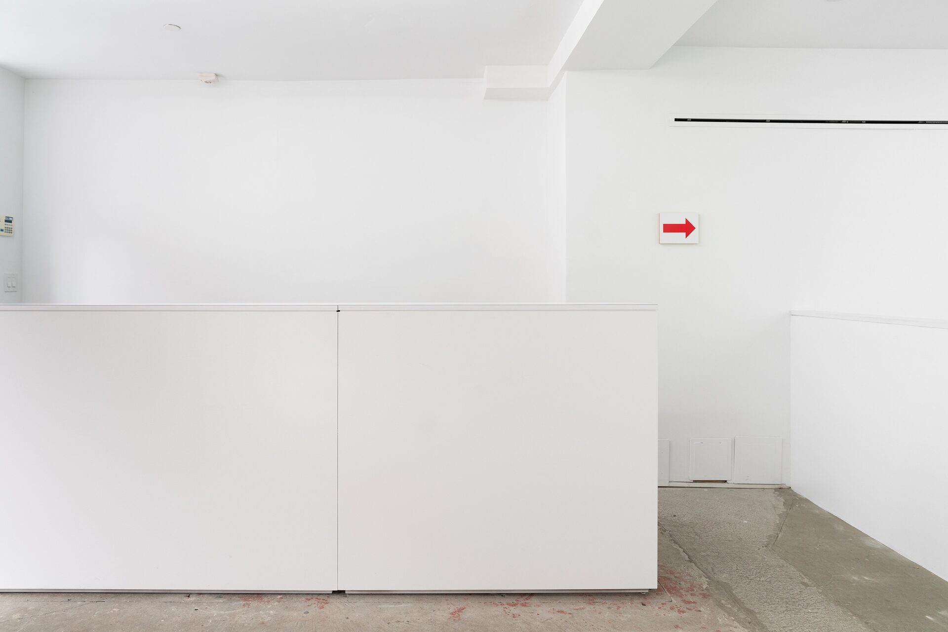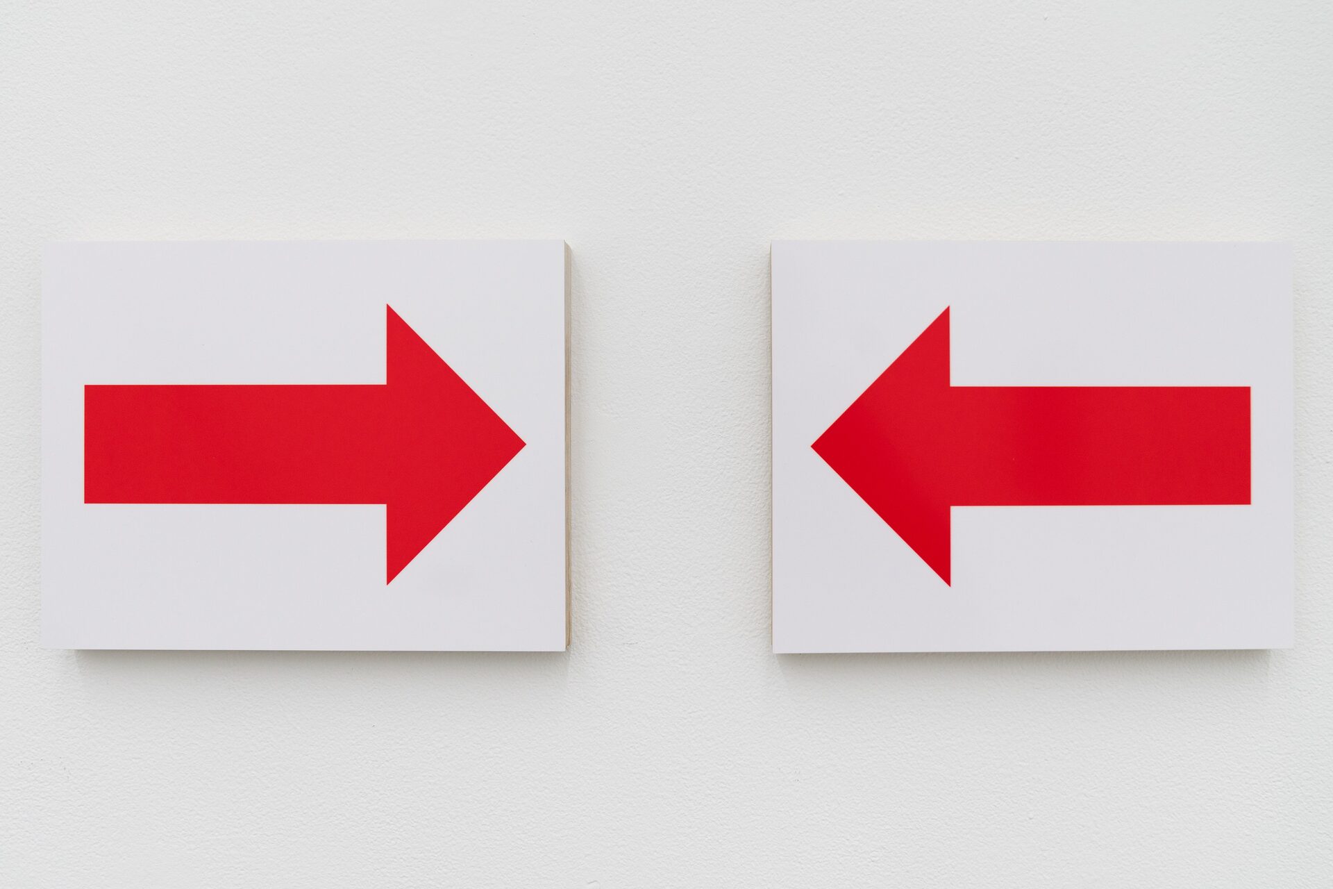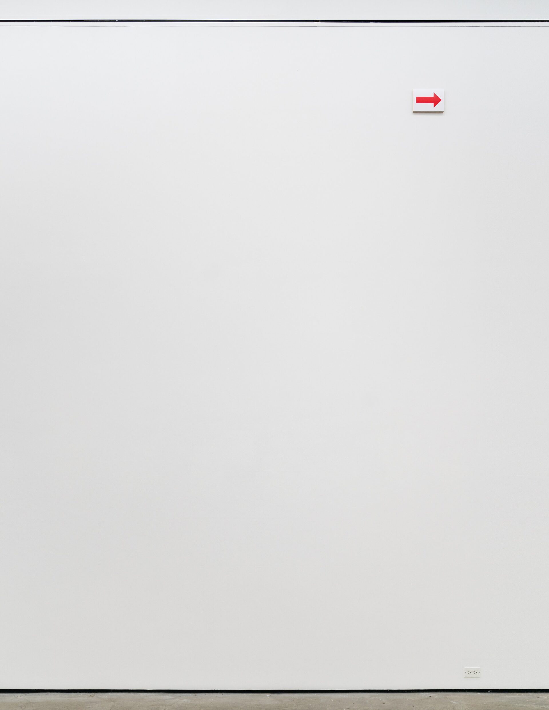 The starting point of the exhibition is a work by Louise Lawler, Alizarin (Terrorists are made, not born), 2023, consisting of a red arrow printed on a small white panel, and “Installed in any direction” as directed in the caption. The work was first exhibited in the artist’s exhibition “Going Through The Motions” at Sprüth Magers in Los Angeles which opened on November 9, 2023. In addition to hanging inside the gallery, Alizarin (Terrorists are made, not born) also existed as a banner outside the gallery and appears in a video trailer on the gallery website. It has also been exhibited as a postcard and in publication. In March 2024 the work was exhibited as a full page advertisement in Artforum International magazine, paid for by the artist as “something that needed to be said.”