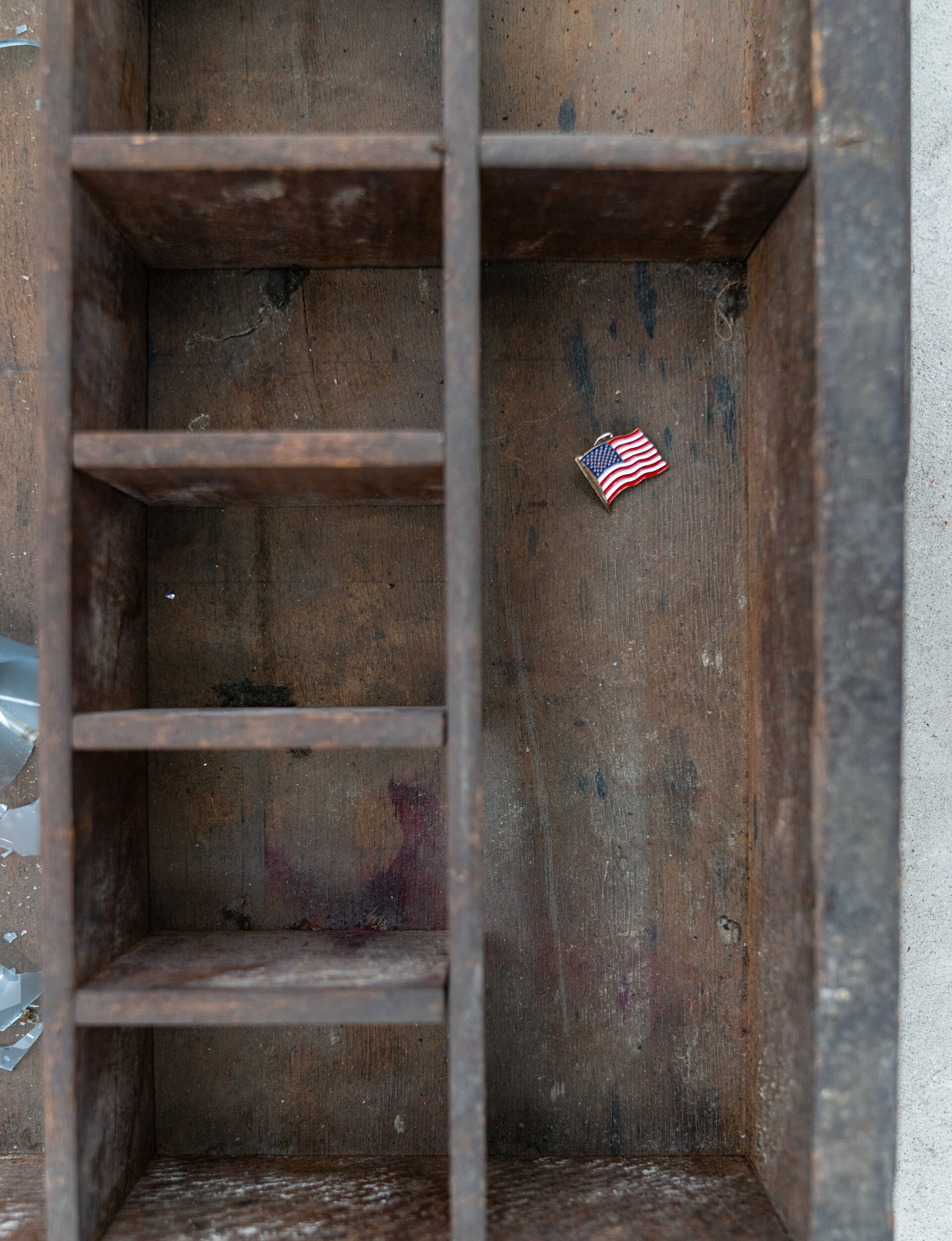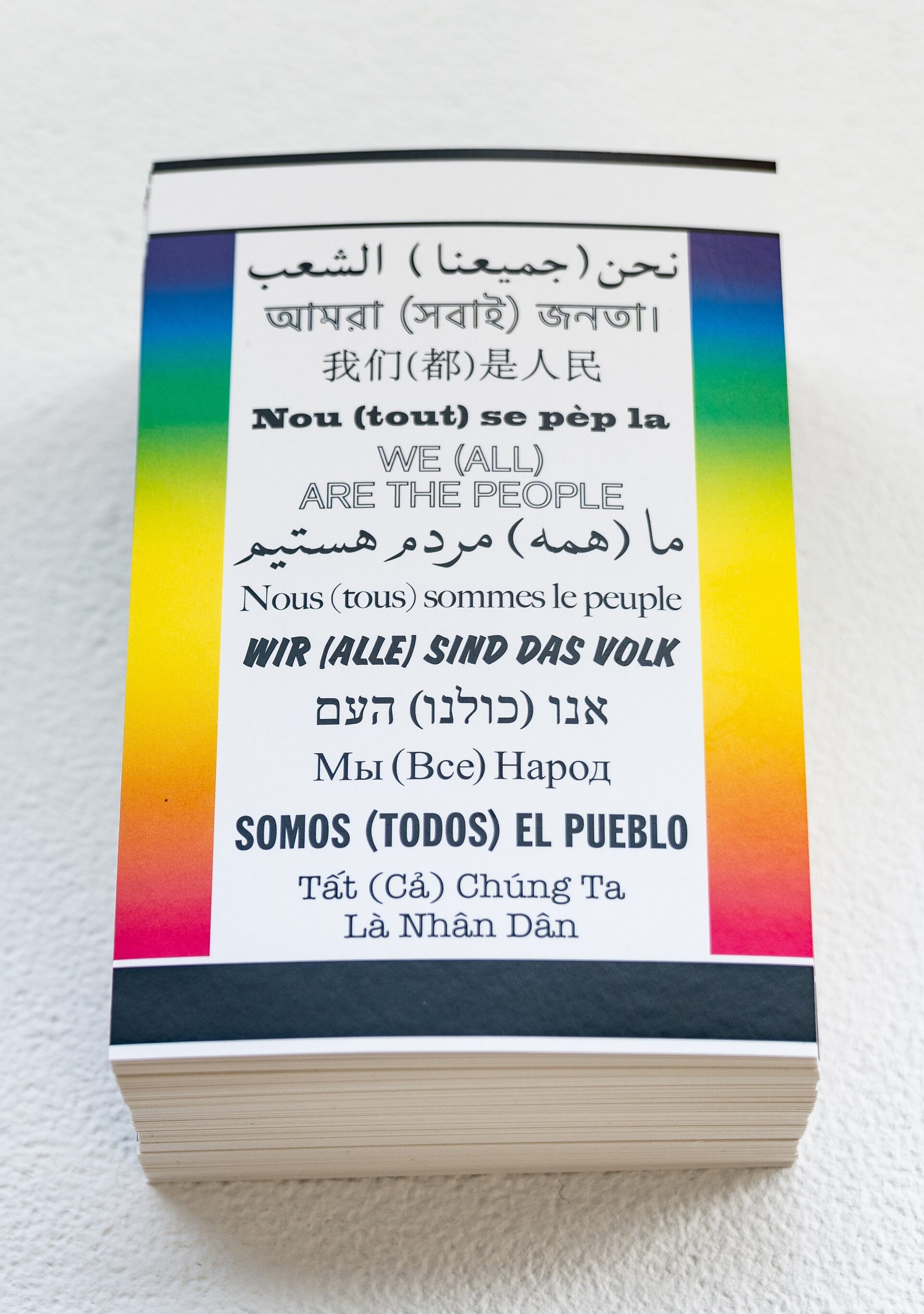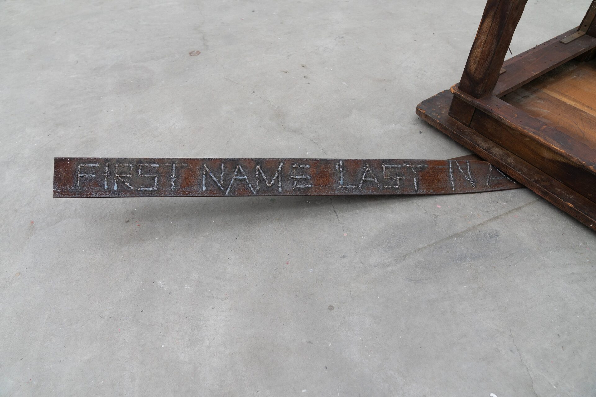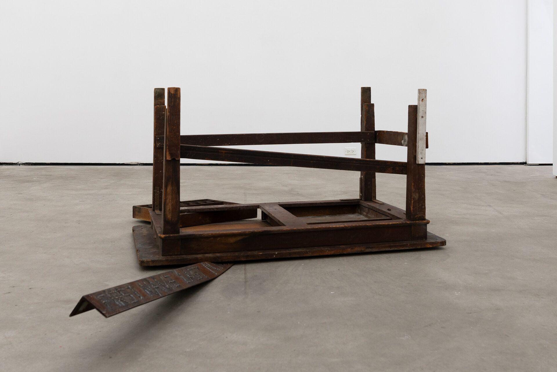 The starting point of the exhibition is a work by Louise Lawler, Alizarin (Terrorists are made, not born), 2023, consisting of a red arrow printed on a small white panel, and “Installed in any direction” as directed in the caption. The work was first exhibited in the artist’s exhibition “Going Through The Motions” at Sprüth Magers in Los Angeles which opened on November 9, 2023. In addition to hanging inside the gallery, Alizarin (Terrorists are made, not born) also existed as a banner outside the gallery and appears in a video trailer on the gallery website. It has also been exhibited as a postcard and in publication. In March 2024 the work was exhibited as a full page advertisement in Artforum International magazine, paid for by the artist as “something that needed to be said.”