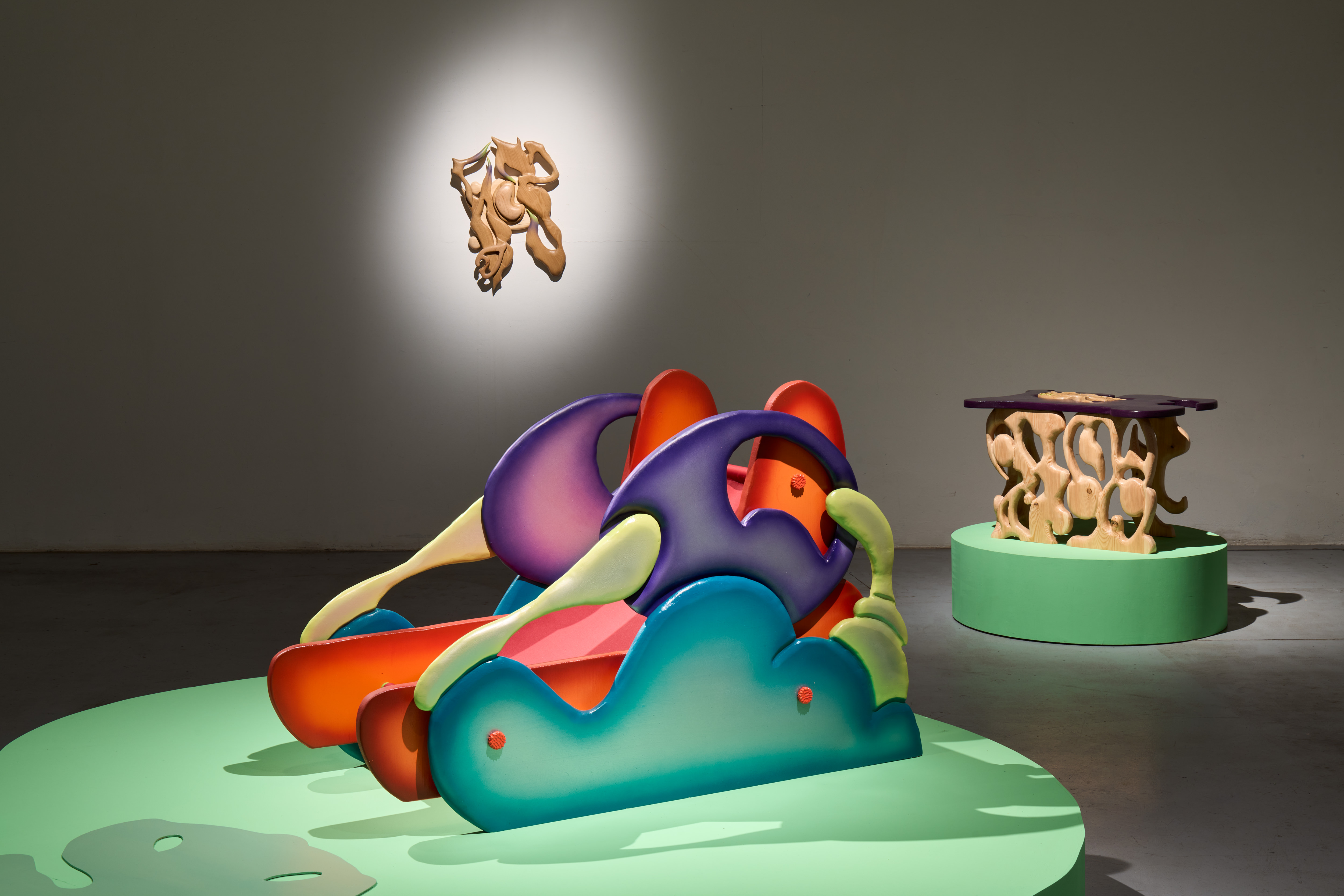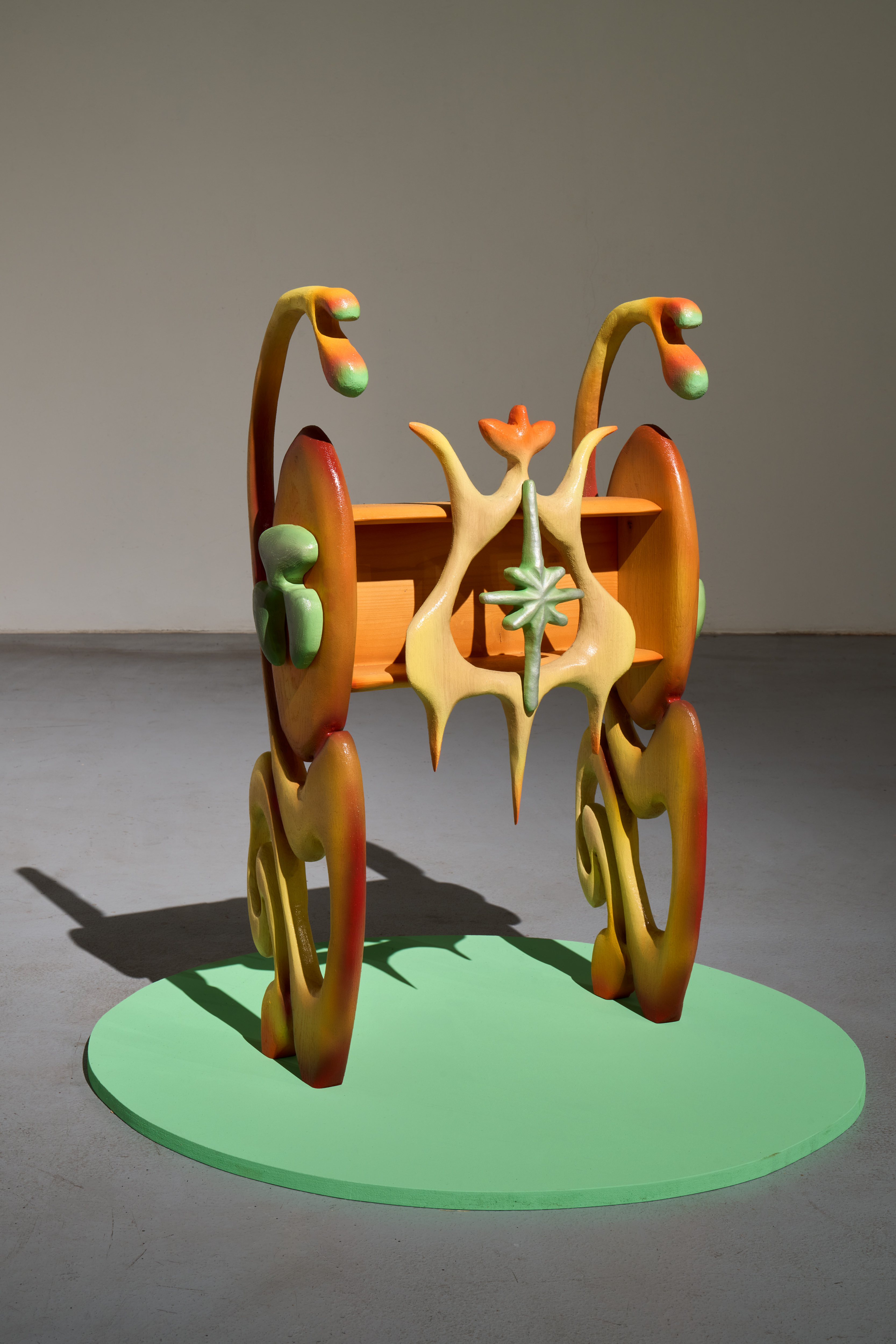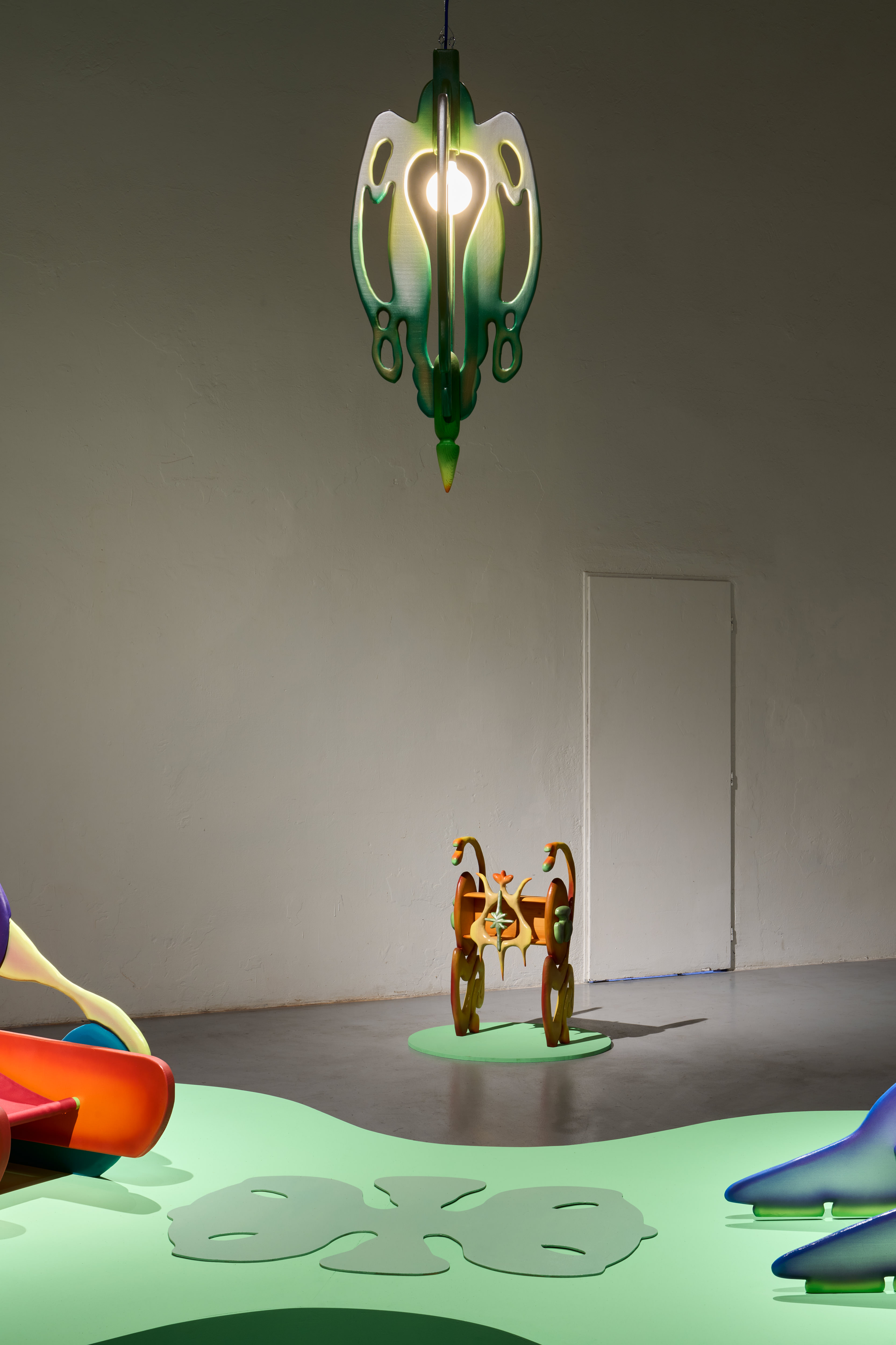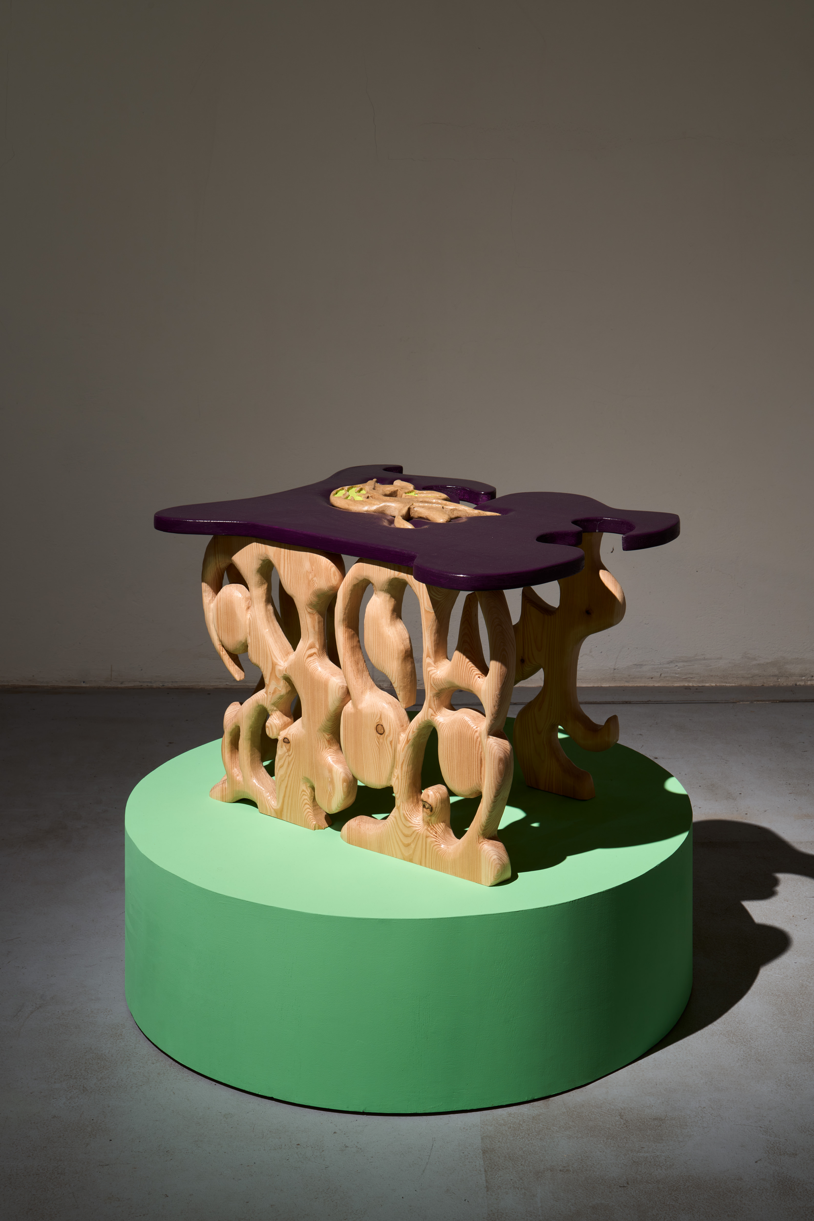 The exhibition by Anna Slama and Marek Delong at Kostka Gallery follows on from their projects Maglev at Karpuchina Gallery (2022) and Time Has Torn the Curtain at NoD Gallery (2024), presenting the duo’s current trajectory. While still rooted in DIY aesthetics, the fantastical, and handcraft, their new, predominantly wooden objects – with their forms and smooth,polished surfaces – foreground the dynamics of motion, openly drawing on the ergonomic product-design aesthetics of the 2000s.