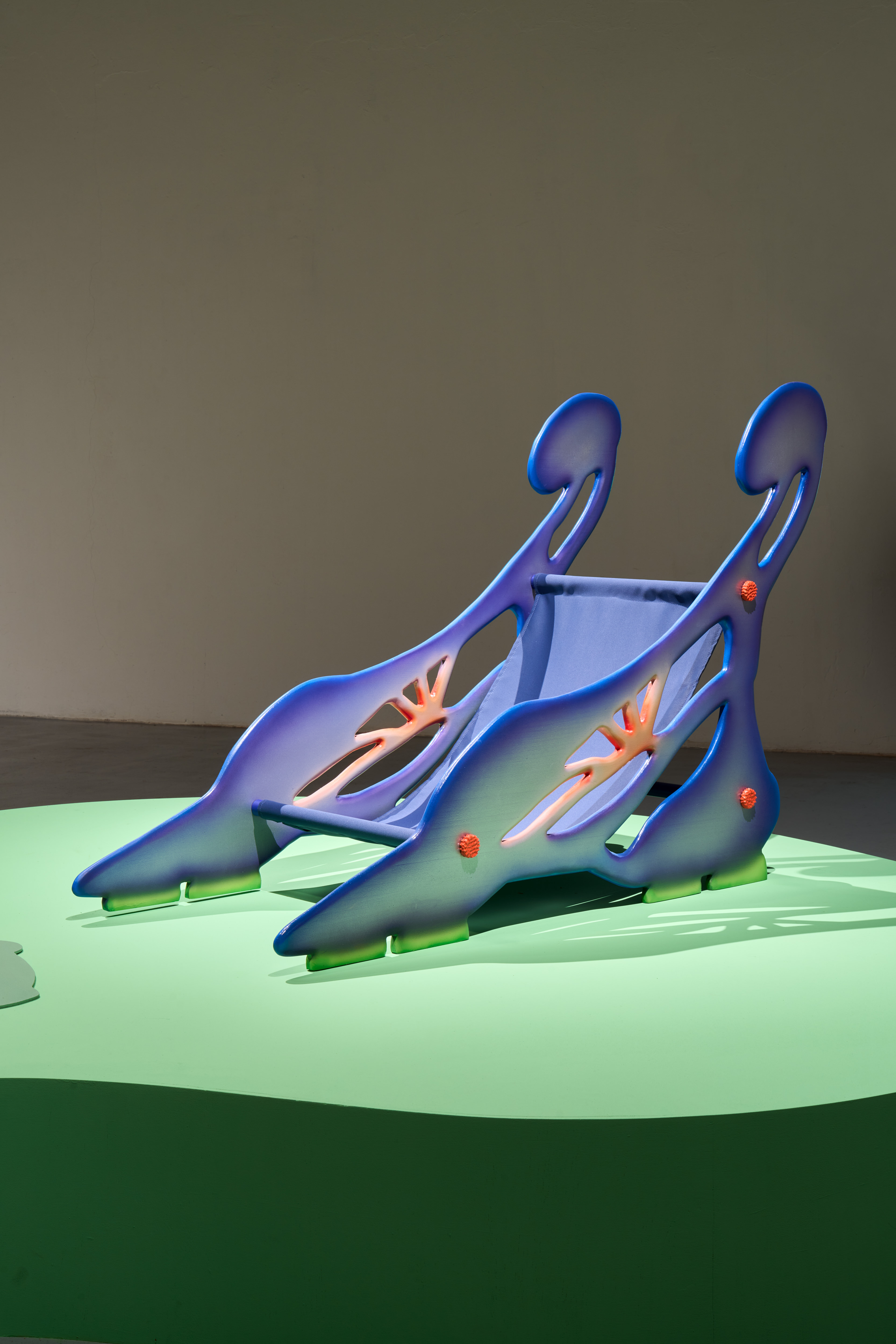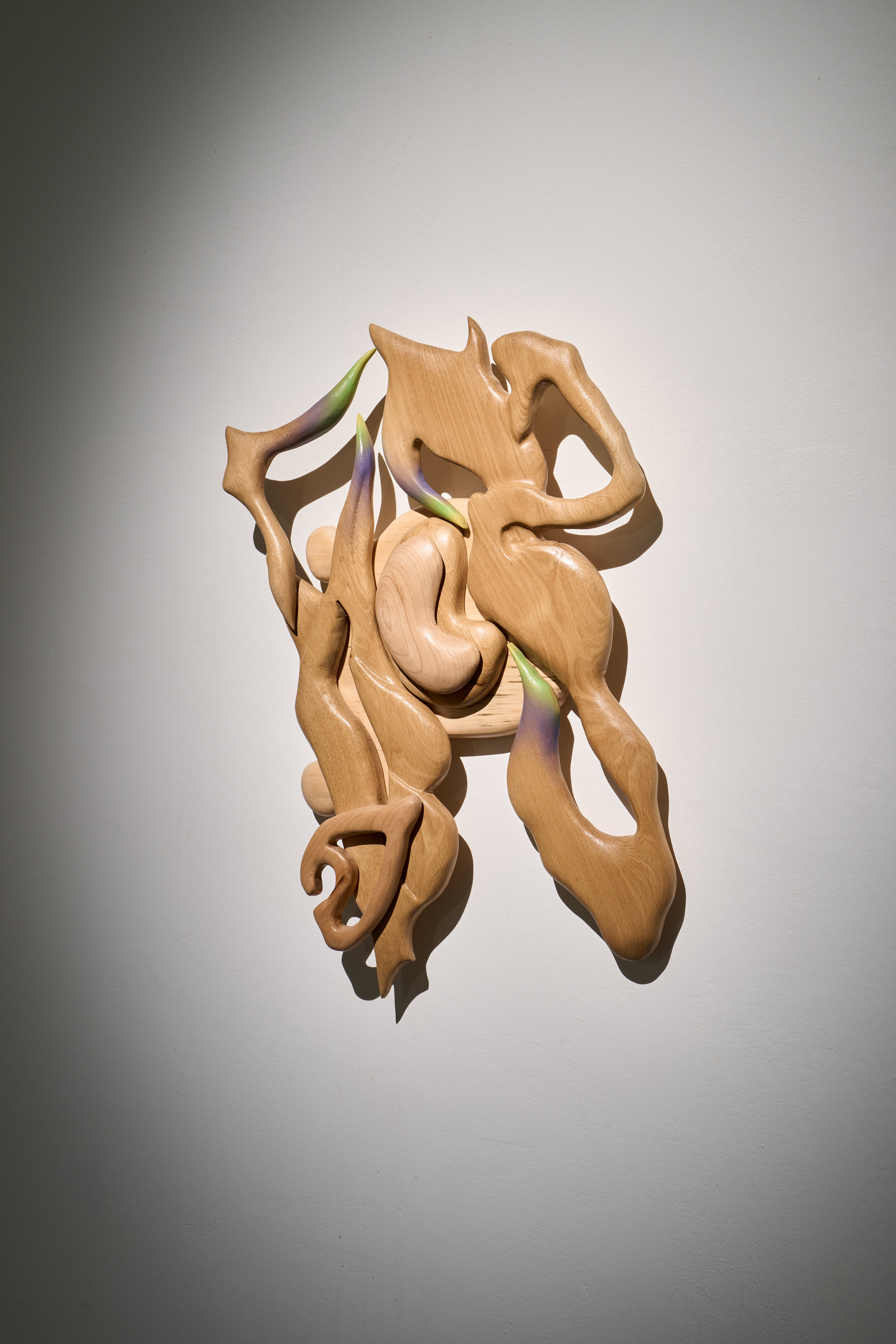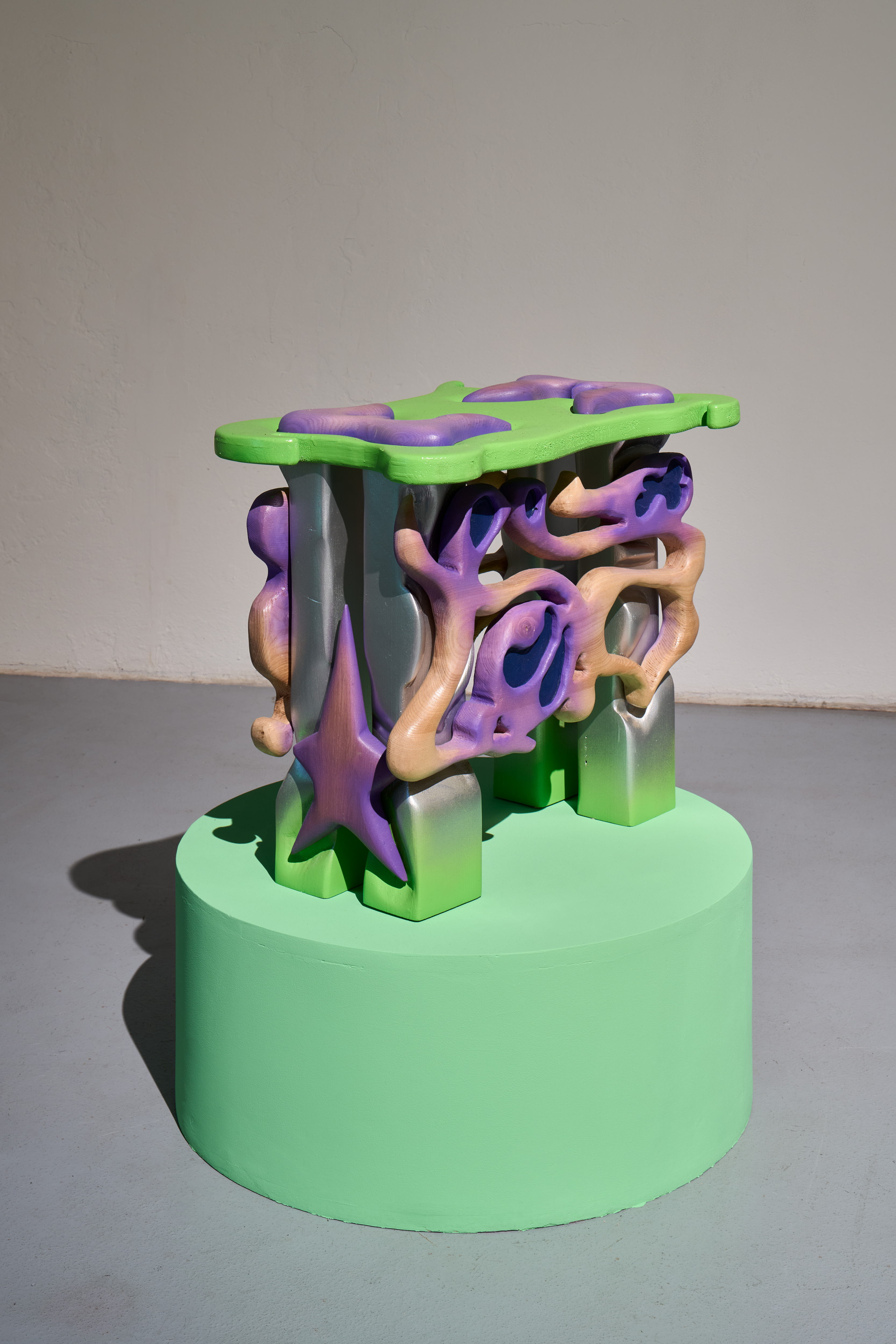 The exhibition by Anna Slama and Marek Delong at Kostka Gallery follows on from their projects Maglev at Karpuchina Gallery (2022) and Time Has Torn the Curtain at NoD Gallery (2024), presenting the duo’s current trajectory. While still rooted in DIY aesthetics, the fantastical, and handcraft, their new, predominantly wooden objects – with their forms and smooth,polished surfaces – foreground the dynamics of motion, openly drawing on the ergonomic product-design aesthetics of the 2000s.