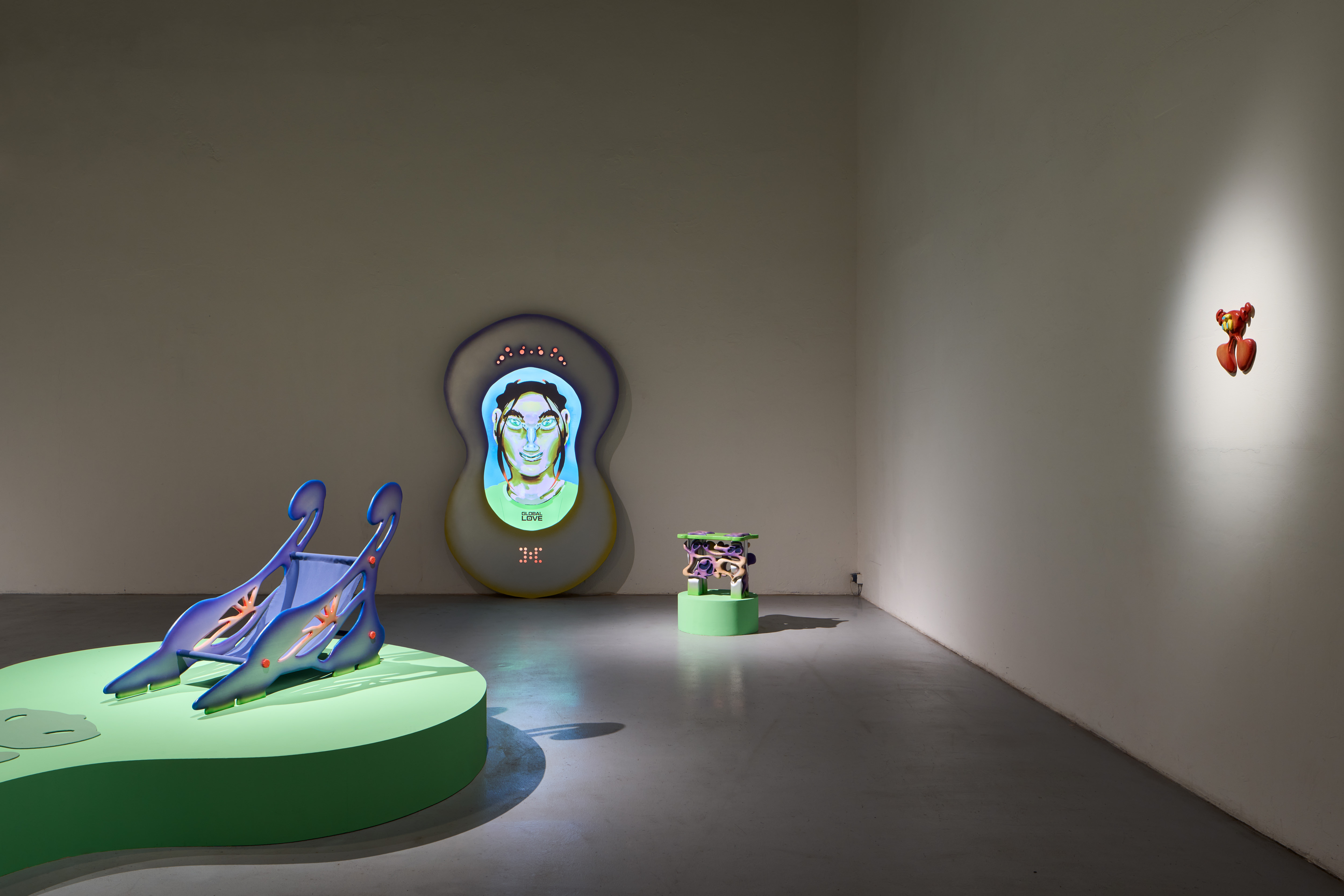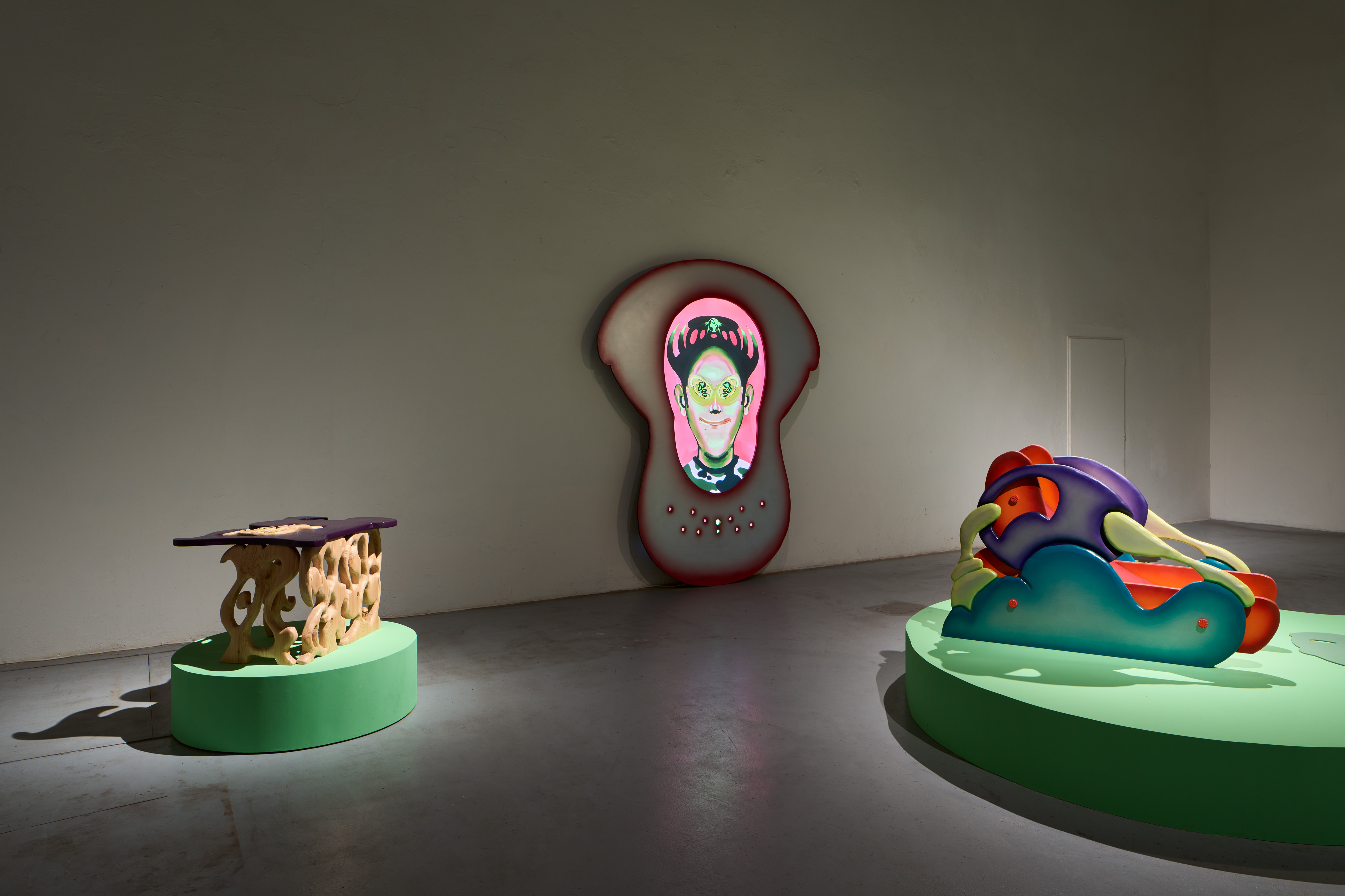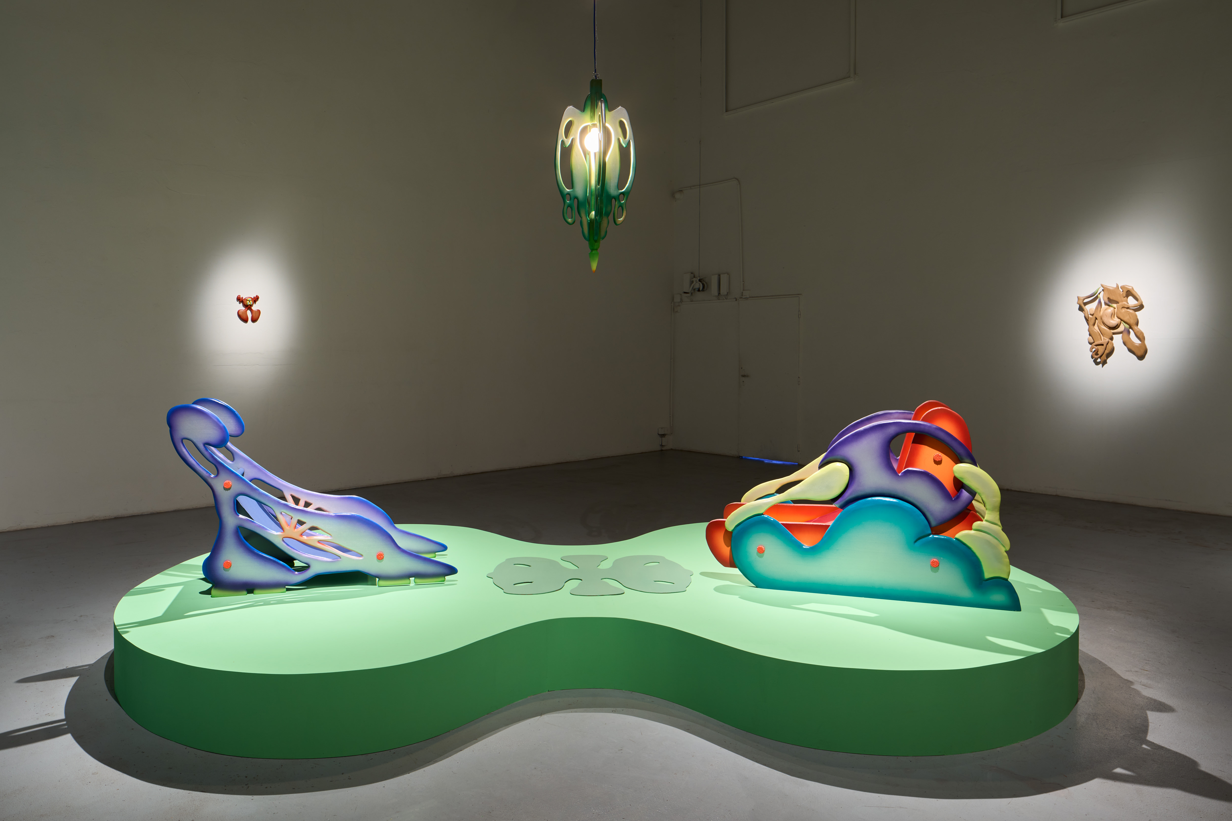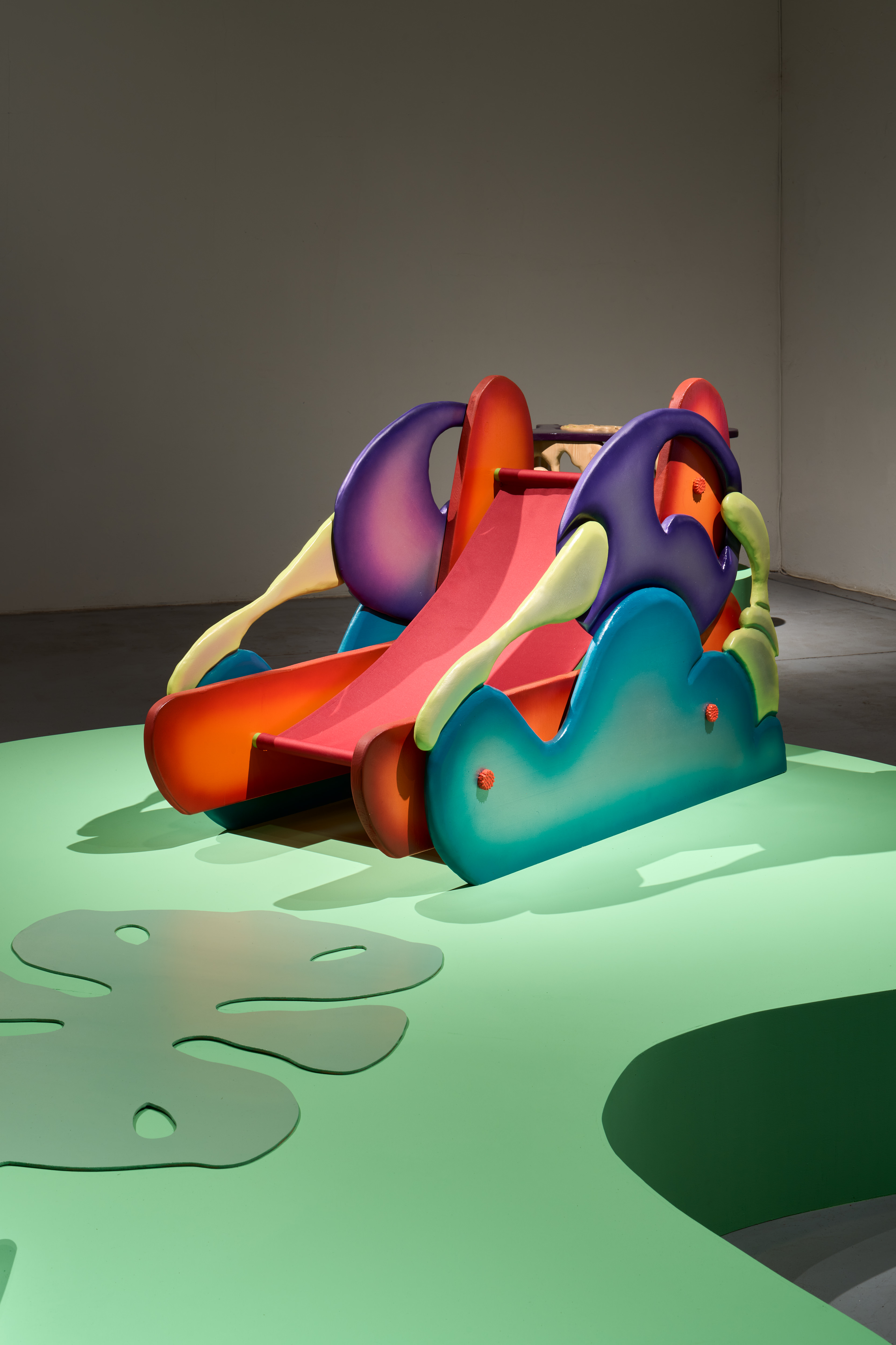 The exhibition by Anna Slama and Marek Delong at Kostka Gallery follows on from their projects Maglev at Karpuchina Gallery (2022) and Time Has Torn the Curtain at NoD Gallery (2024), presenting the duo’s current trajectory. While still rooted in DIY aesthetics, the fantastical, and handcraft, their new, predominantly wooden objects – with their forms and smooth,polished surfaces – foreground the dynamics of motion, openly drawing on the ergonomic product-design aesthetics of the 2000s.