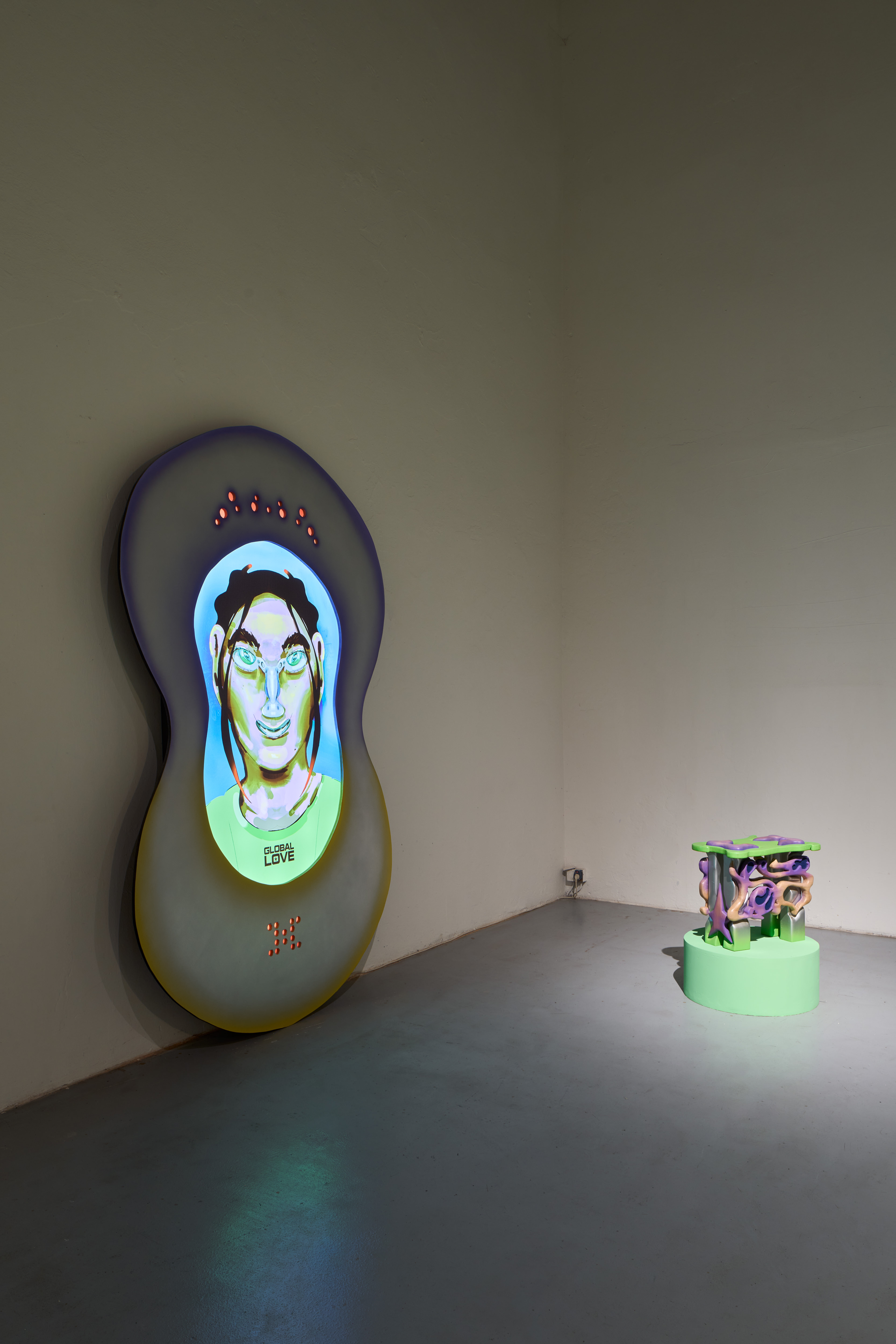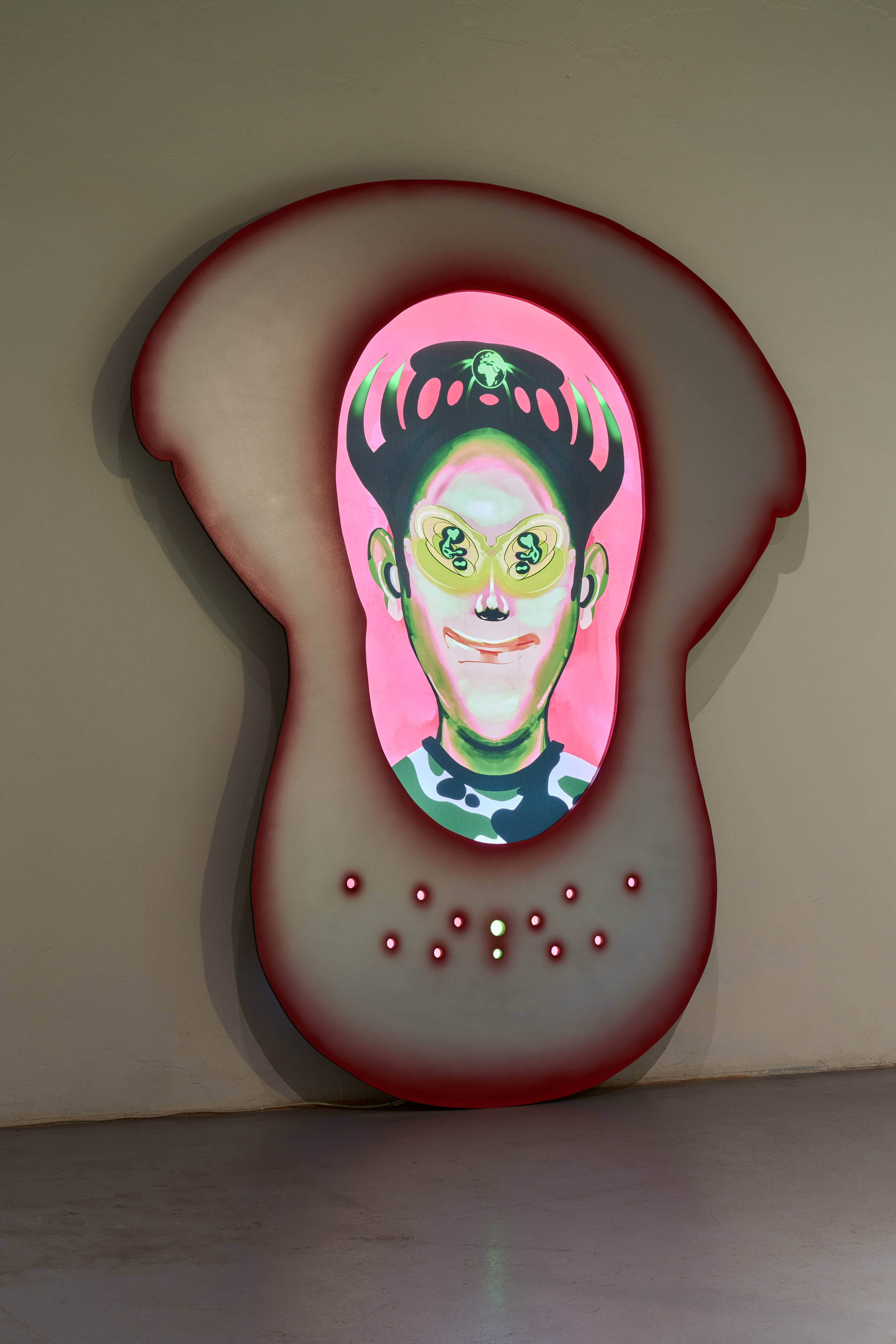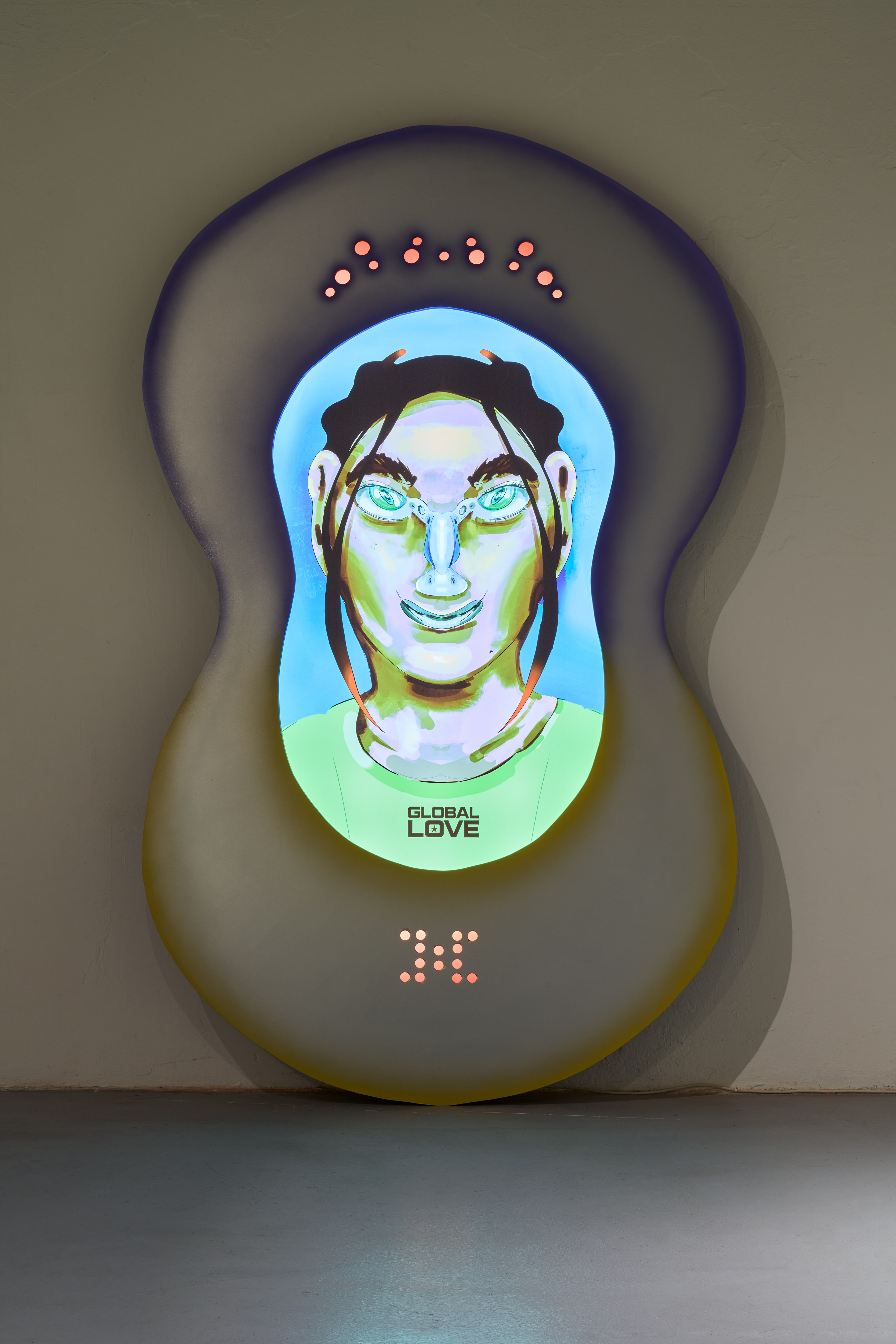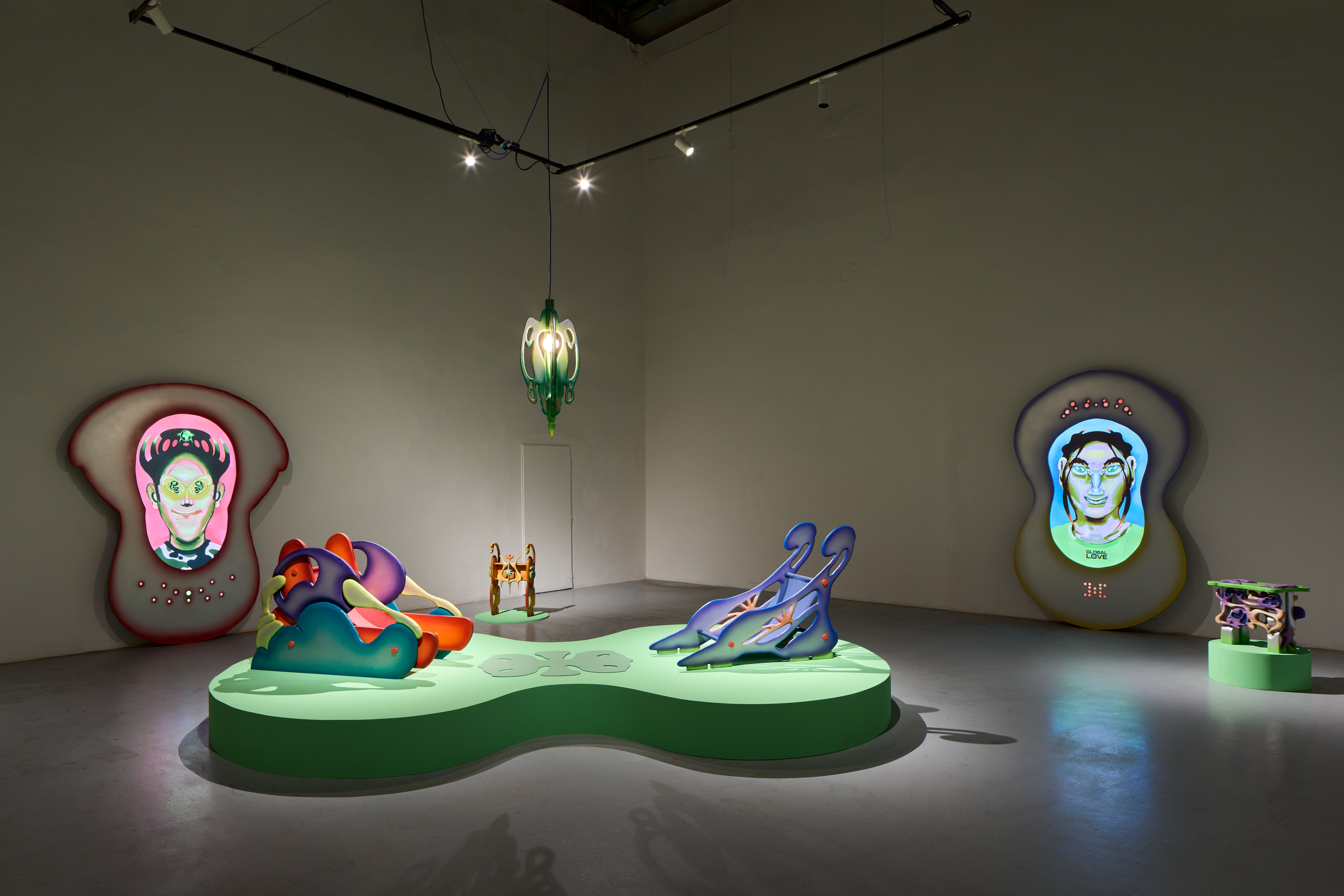 At the heart of the installation is a pair of chaise longues positioned opposite each other. Deliberately left empty, they do not invite the audience to sit; we can, however, lie down in them in our minds and “just look” – and yet, on a certain level, a dialogue may unfold between us. Two luminous portals open on the walls, which are at once stylised portraits of figures looking not “past the viewer” but at one another. Their faces and expressions disregard anatomy, drawing partly on the visual…