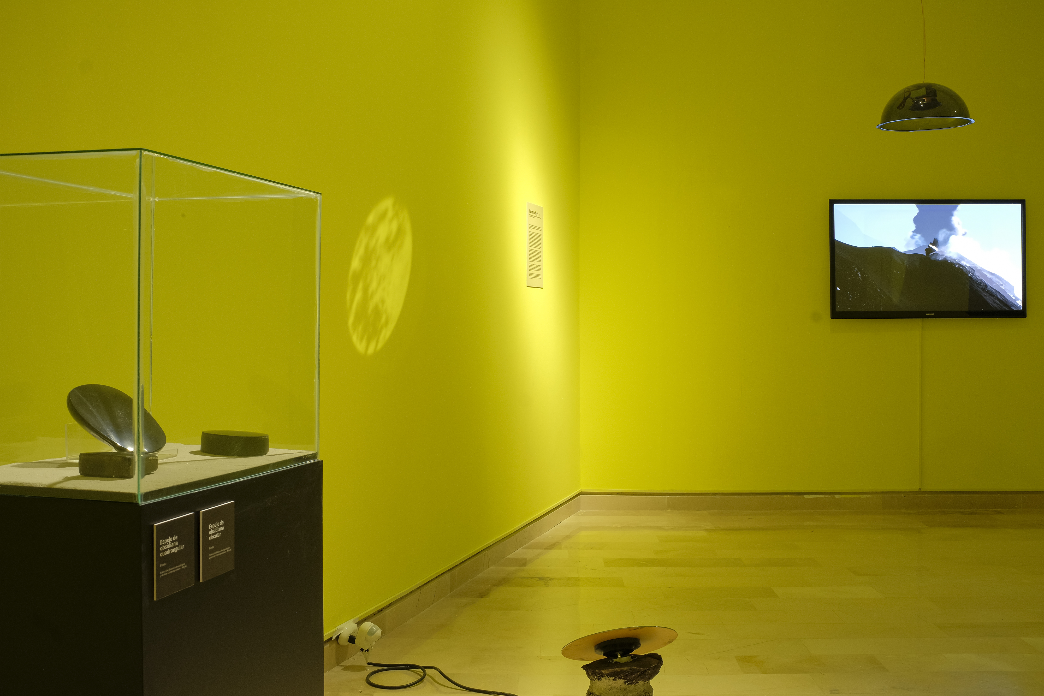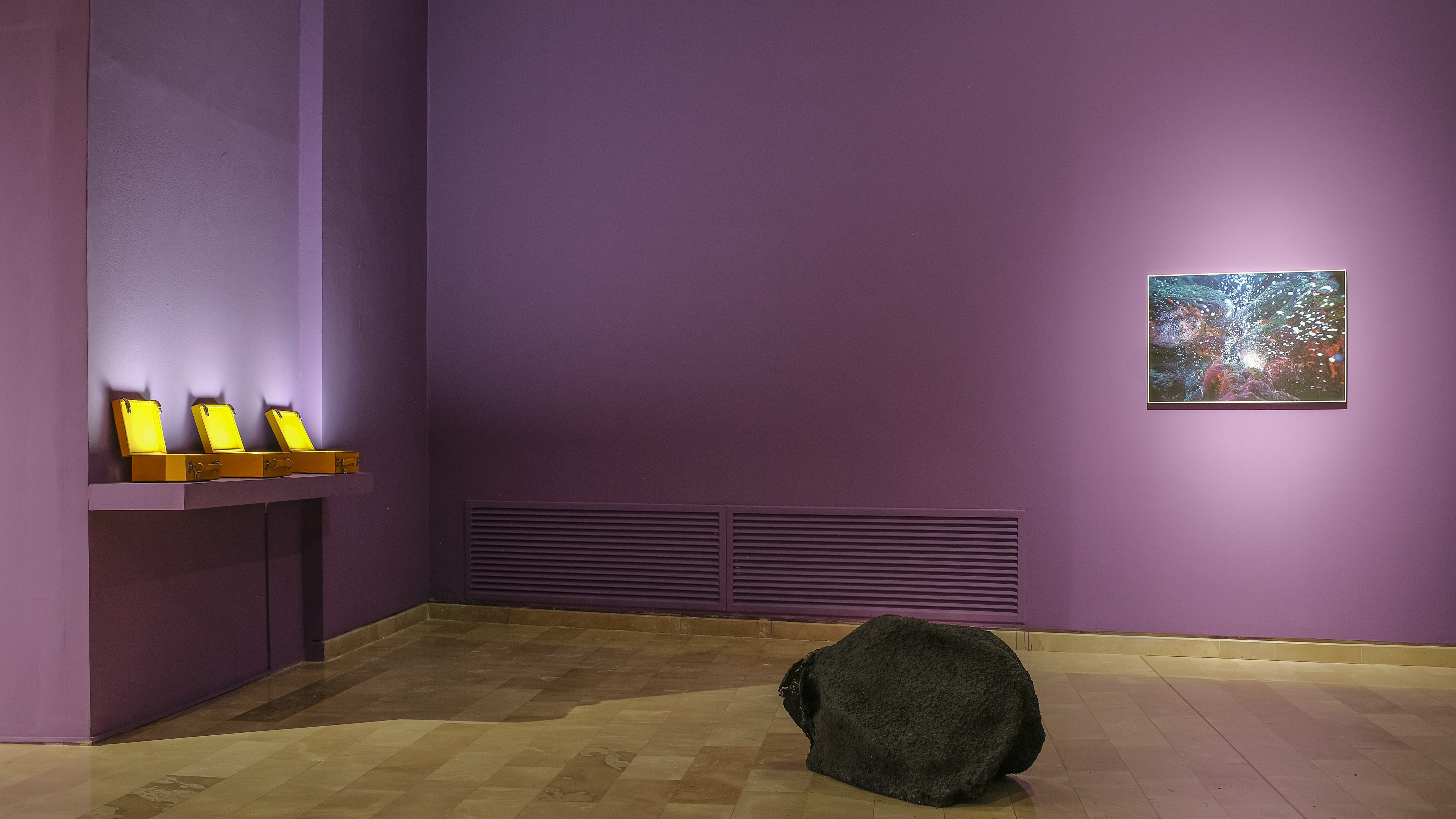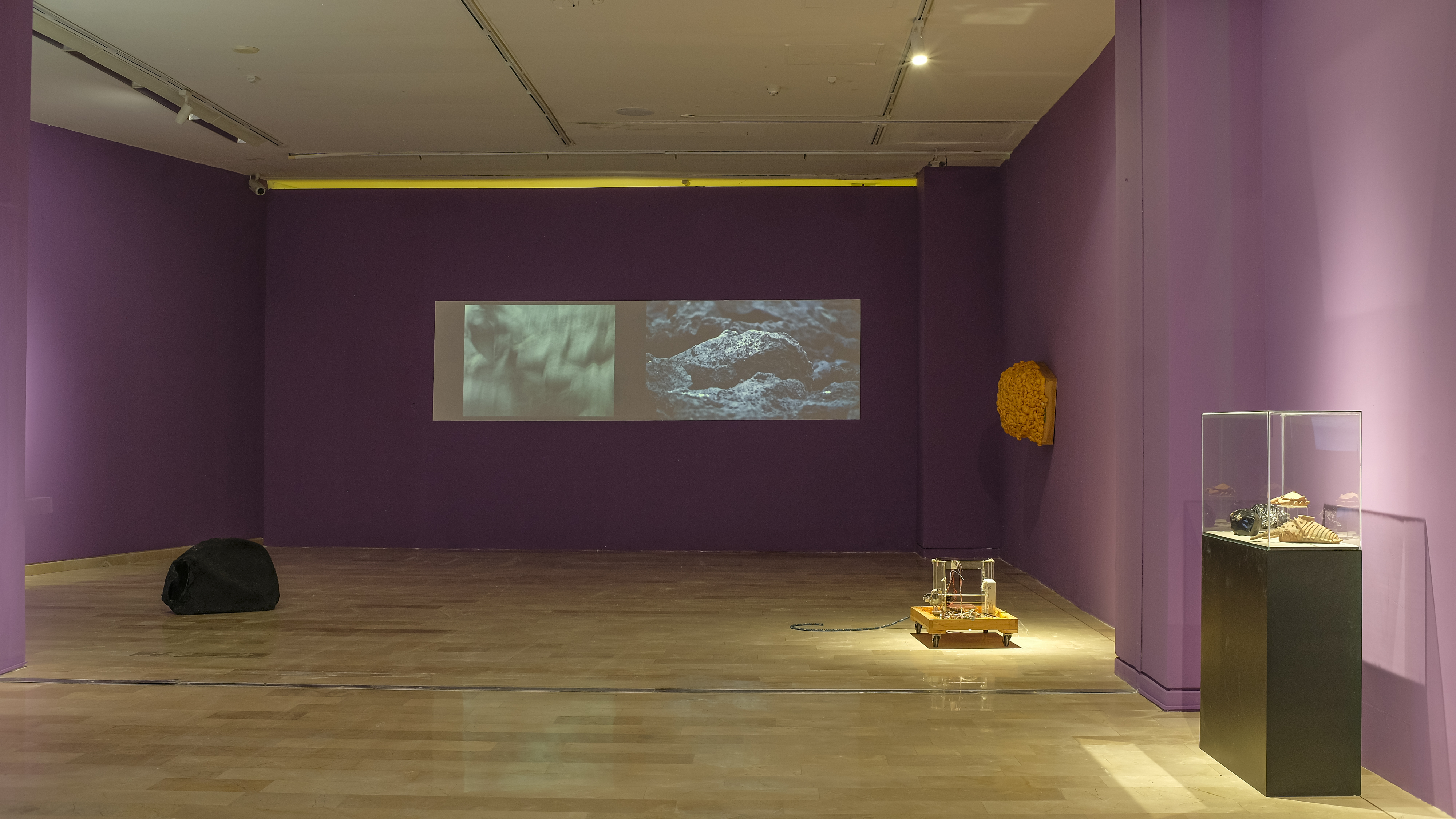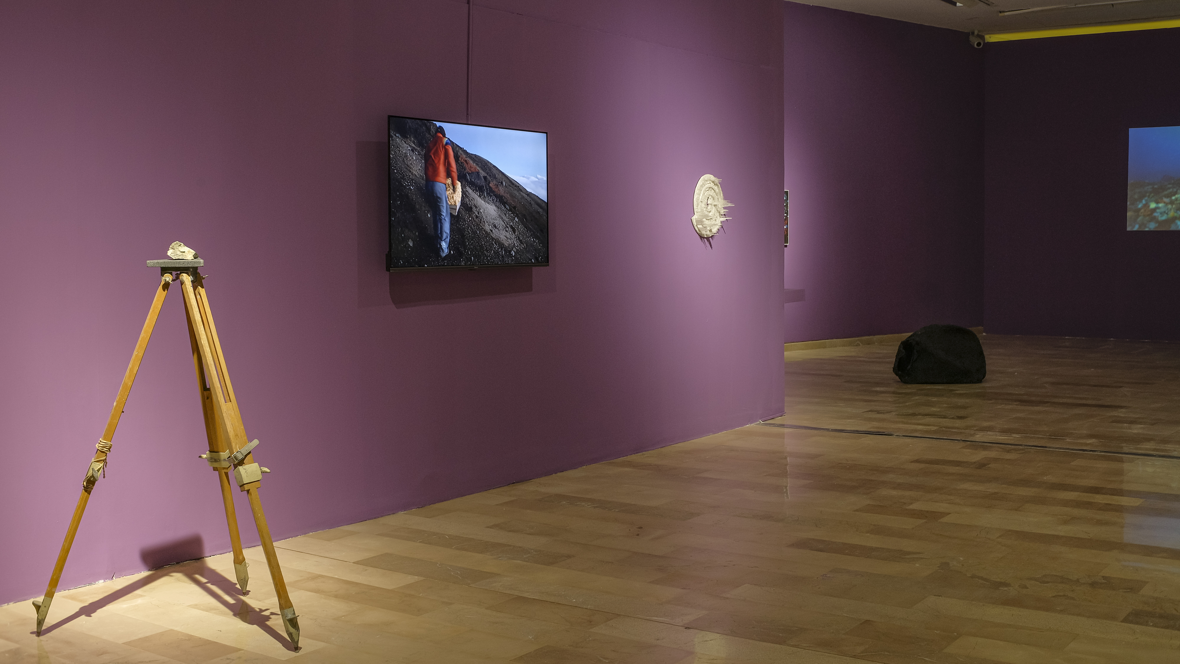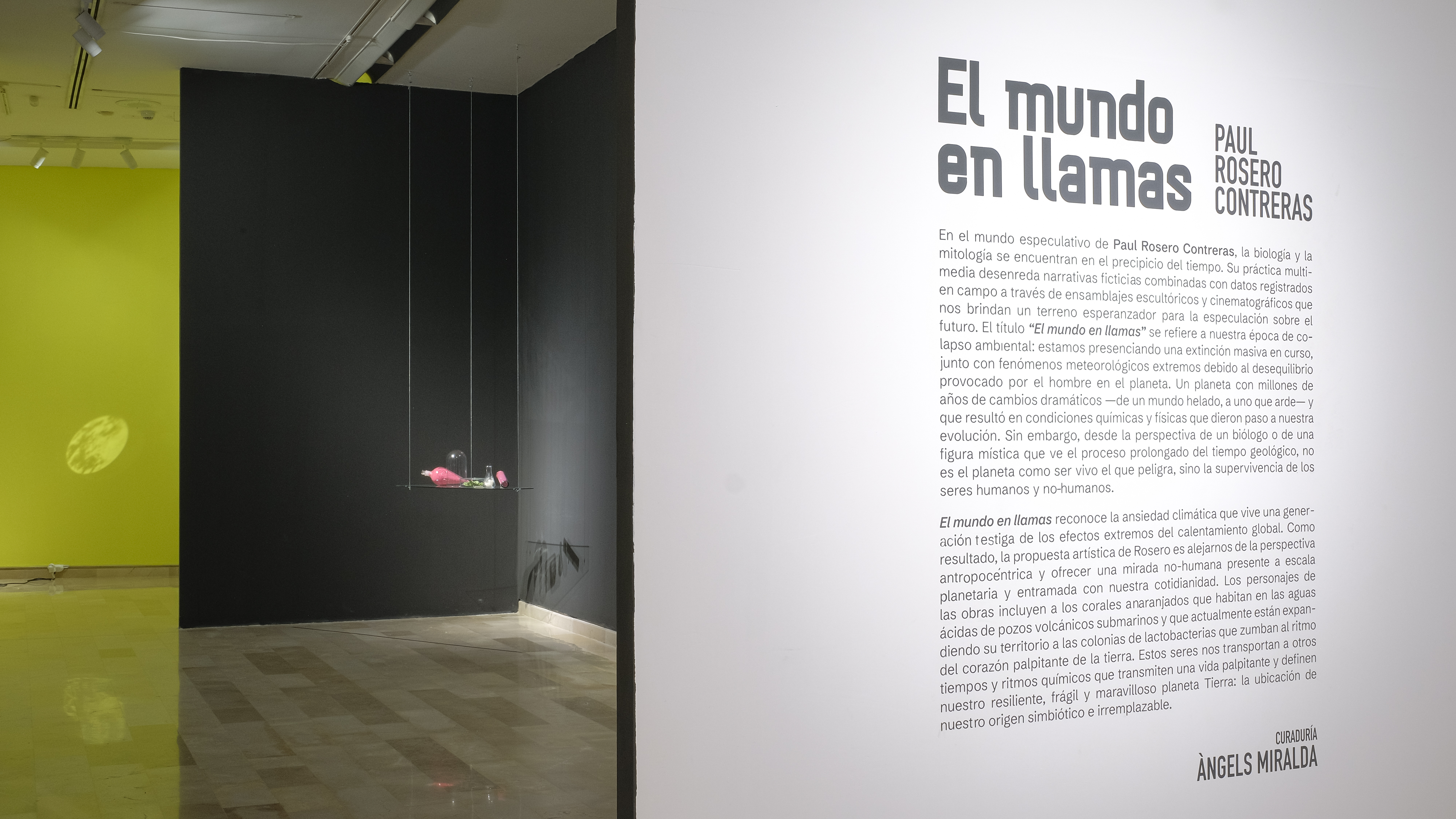 In the speculative world of Paul Rosero Contreras, biology and mythology meet at the precipice of time. His multimedia practice unravels fictional narratives combined with field-recorded data through sculptural and cinematic assemblages that provide us with a hopeful ground for speculating on the future. The title “The World Ablaze” refers to times of environmental collapse. We are witnessing an ongoing mass-extinction along with extreme meteorological phenomena due to the man-made disequilibrium of the planet. A planet with millions of years of dramatic changes —from iceball earth to fireball earth— which resulted in chemical and physical conditions that gave rise to our evolution. From the perspective of a biologist or mystic figure who sees the drawn-out process of geological time, it is not the planet as a living being that will end, but rather the survival of human and non-human beings.