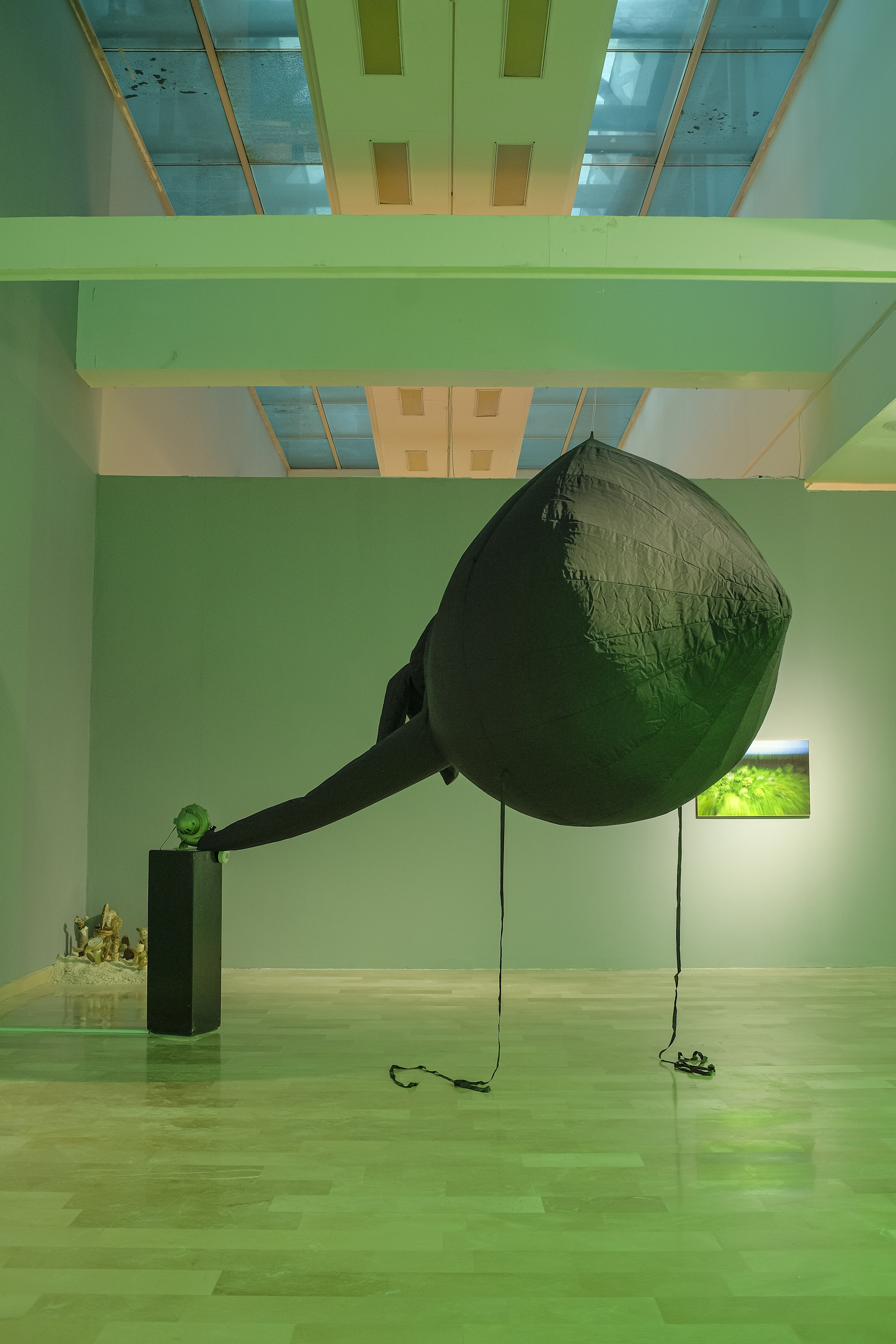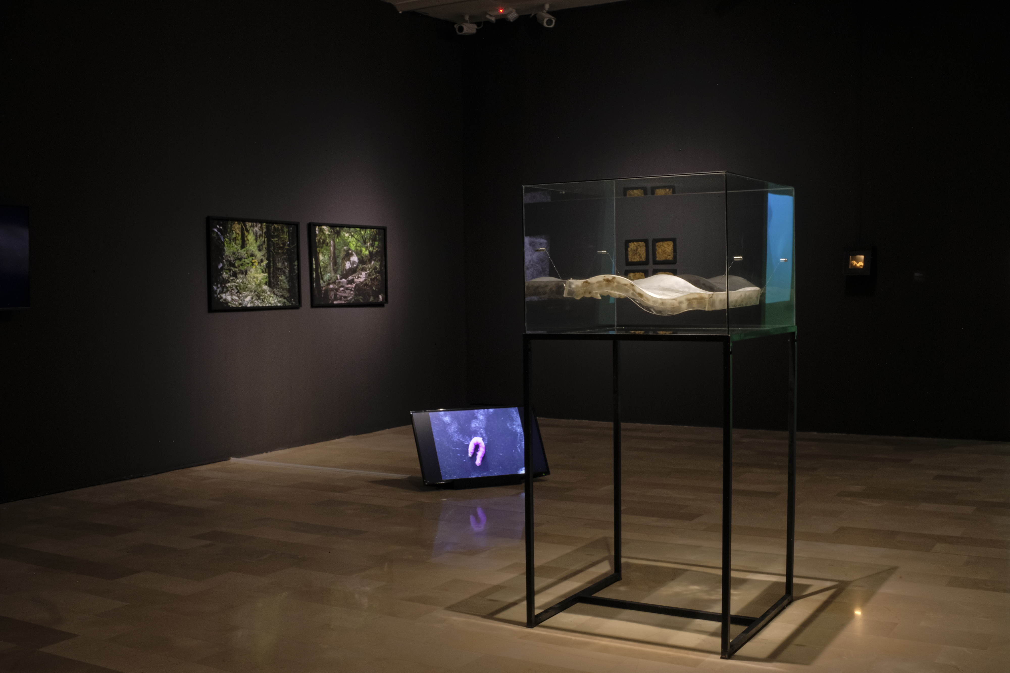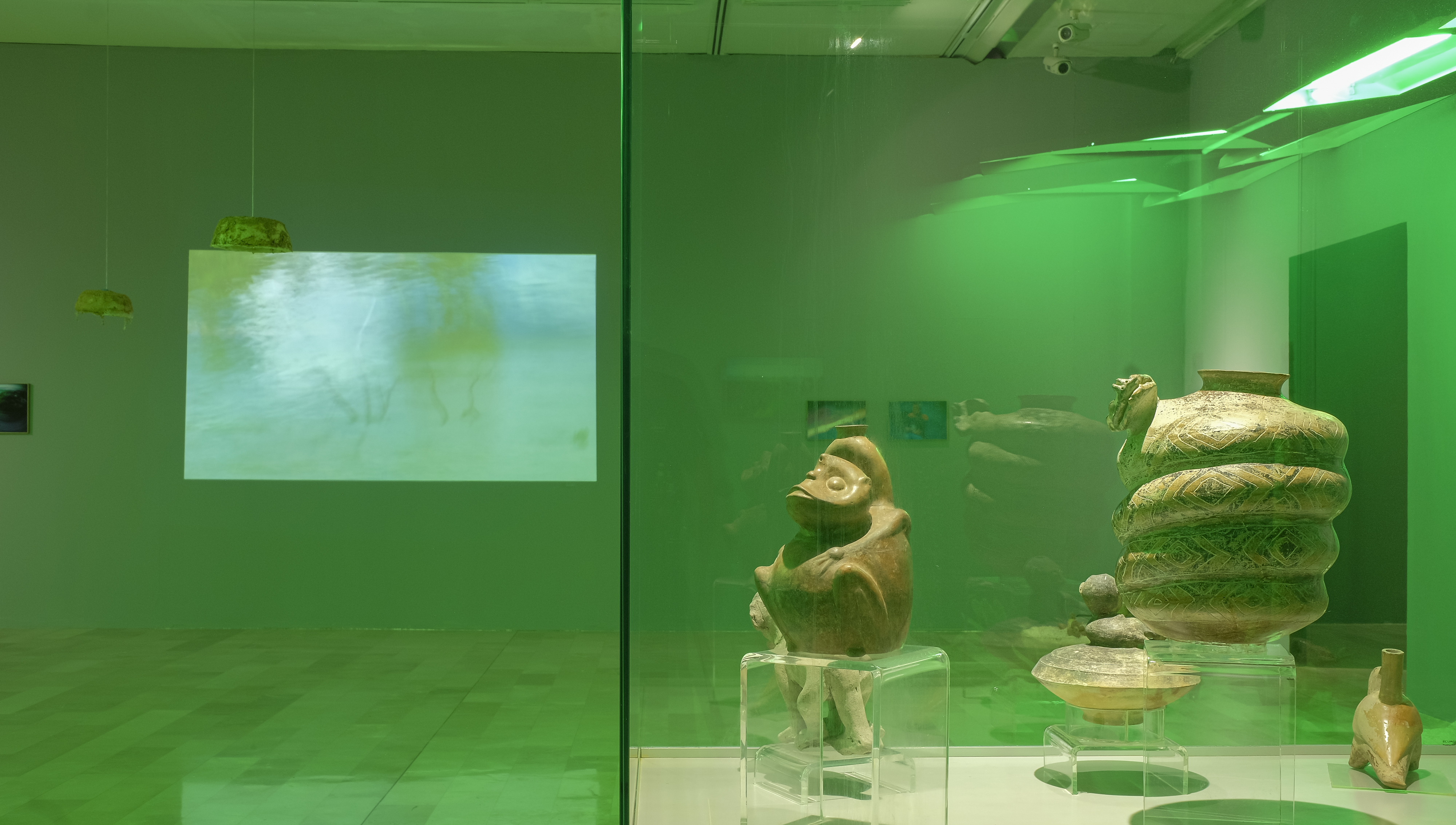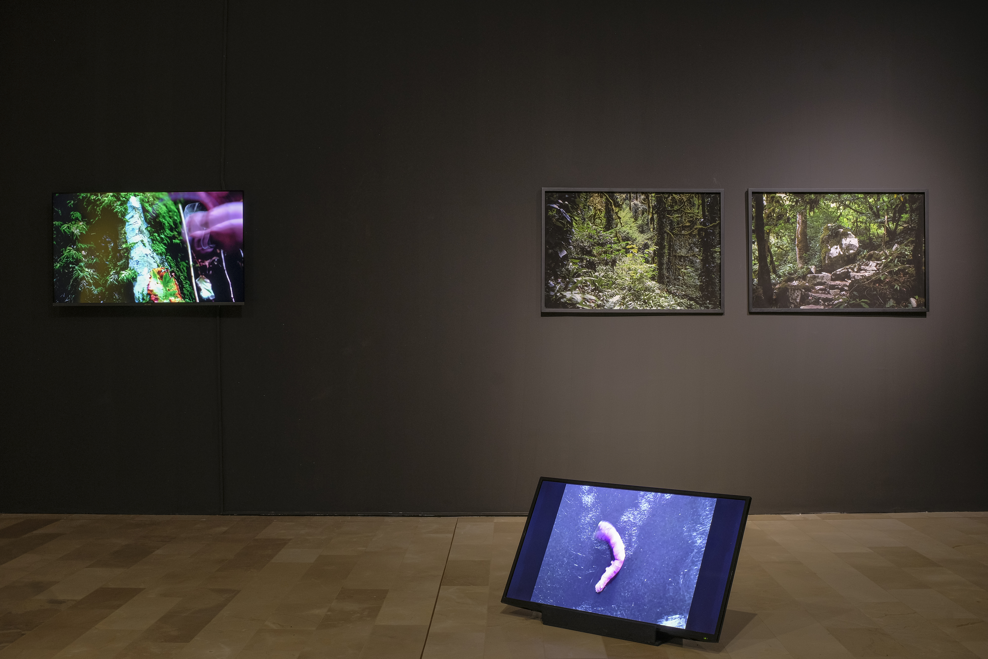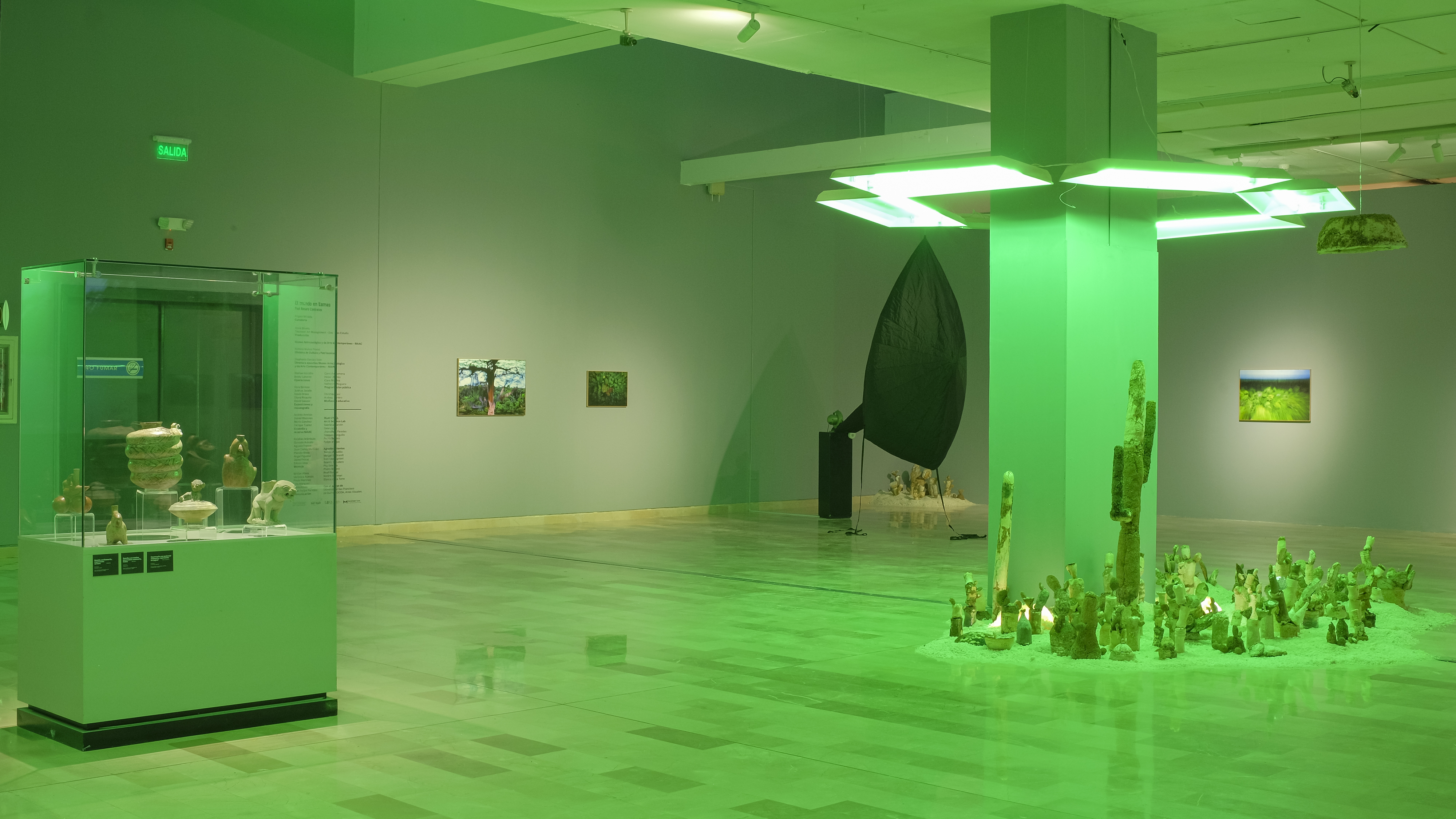 In the speculative world of Paul Rosero Contreras, biology and mythology meet at the precipice of time. His multimedia practice unravels fictional narratives combined with field-recorded data through sculptural and cinematic assemblages that provide us with a hopeful ground for speculating on the future. The title “The World Ablaze” refers to times of environmental collapse. We are witnessing an ongoing mass-extinction along with extreme meteorological phenomena due to the man-made disequilibrium of the planet. A planet with millions of years of dramatic changes —from iceball earth to fireball earth— which resulted in chemical and physical conditions that gave rise to our evolution. From the perspective of a biologist or mystic figure who sees the drawn-out process of geological time, it is not the planet as a living being that will end, but rather the survival of human and non-human beings.