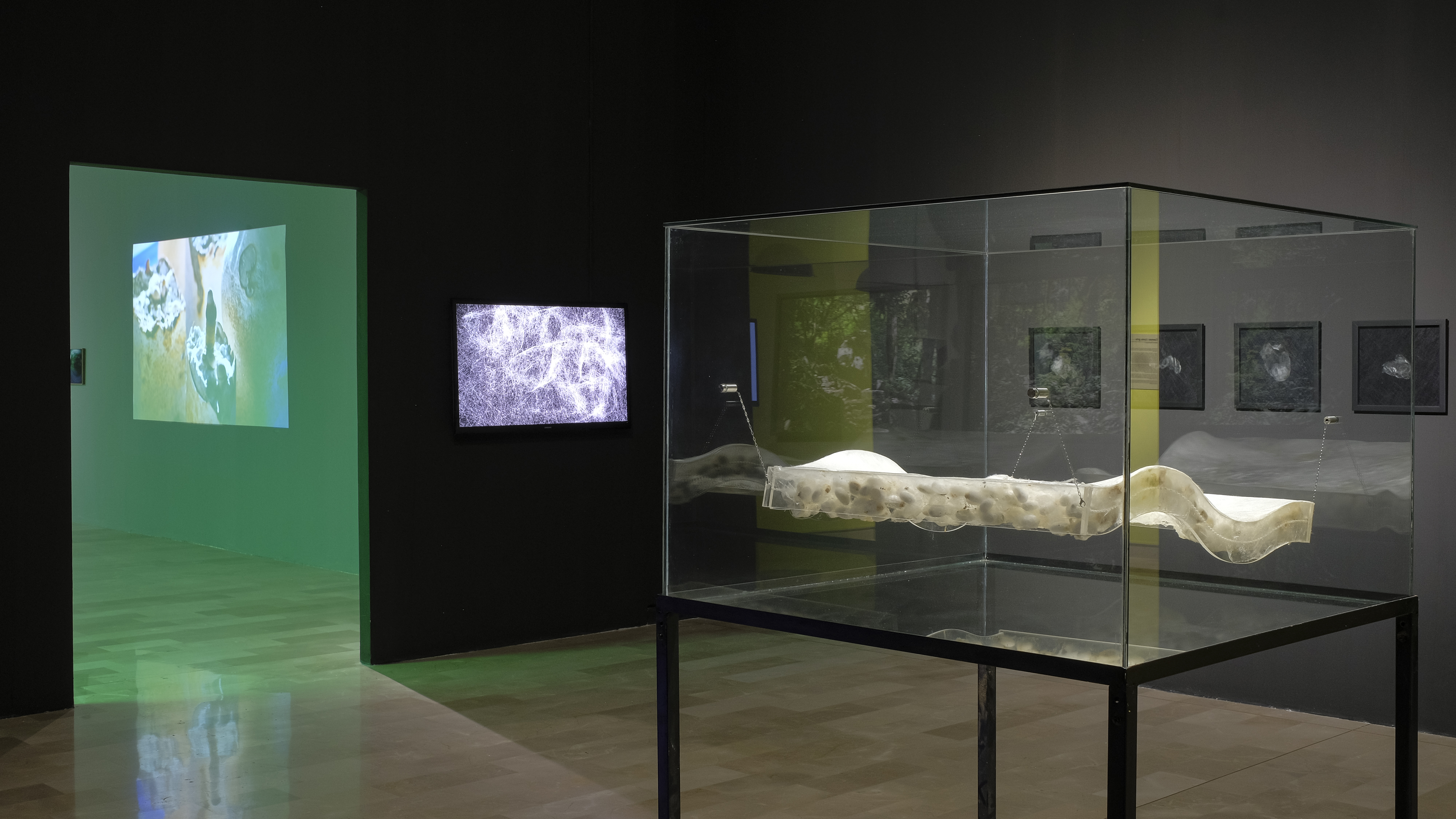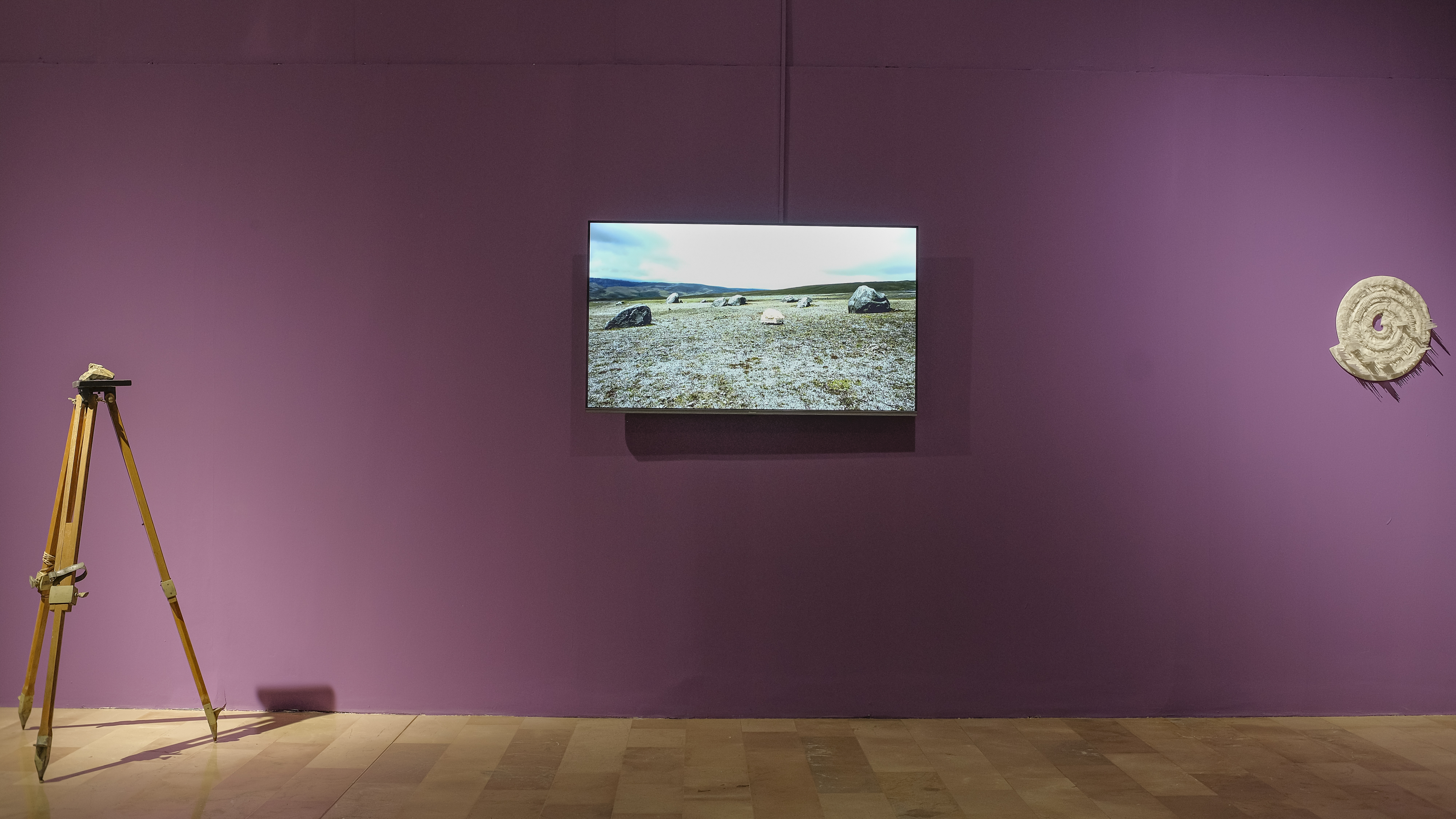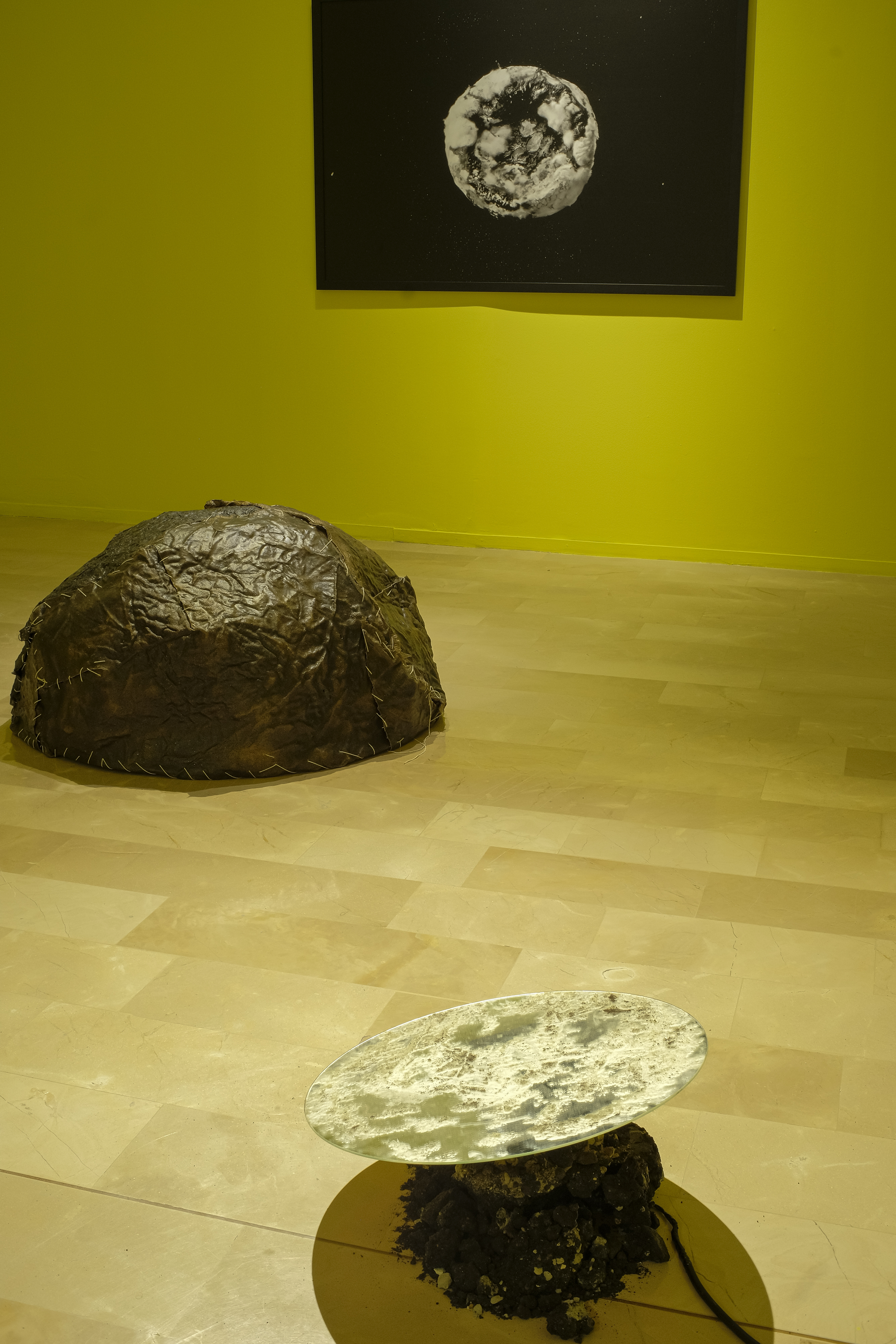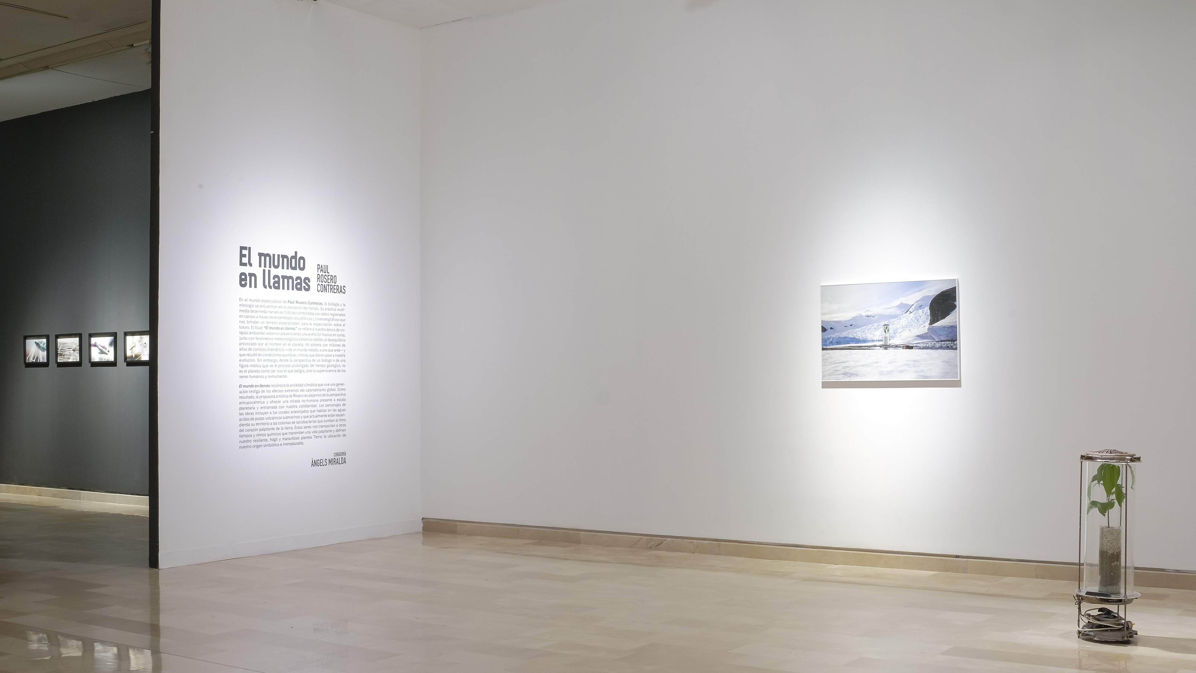 In the speculative world of Paul Rosero Contreras, biology and mythology meet at the precipice of time. His multimedia practice unravels fictional narratives combined with field-recorded data through sculptural and cinematic assemblages that provide us with a hopeful ground for speculating on the future. The title “The World Ablaze” refers to times of environmental collapse. We are witnessing an ongoing mass-extinction along with extreme meteorological phenomena due to the man-made disequilibrium of the planet. A planet with millions of years of dramatic changes —from iceball earth to fireball earth— which resulted in chemical and physical conditions that gave rise to our evolution. From the perspective of a biologist or mystic figure who sees the drawn-out process of geological time, it is not the planet as a living being that will end, but rather the survival of human and non-human beings.