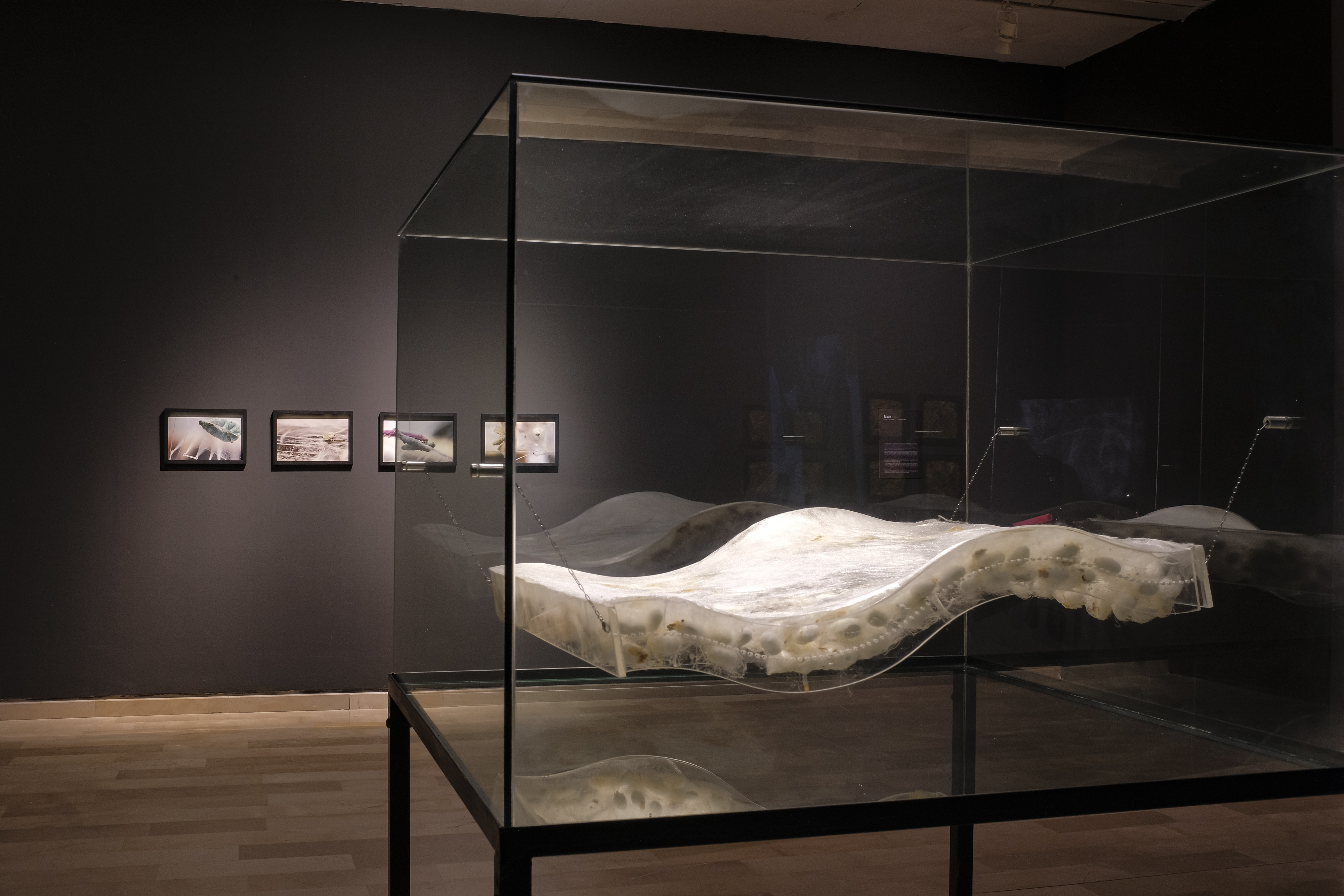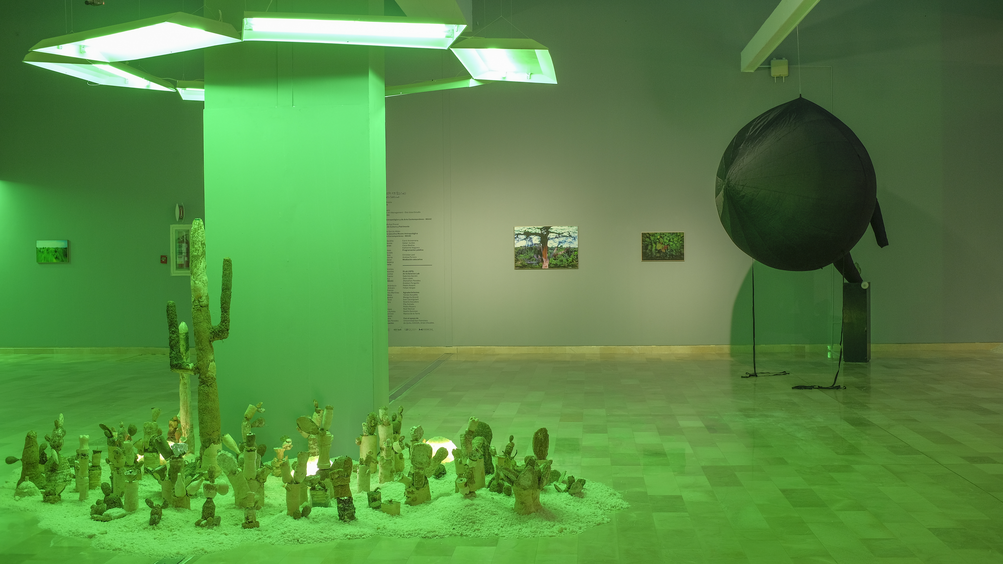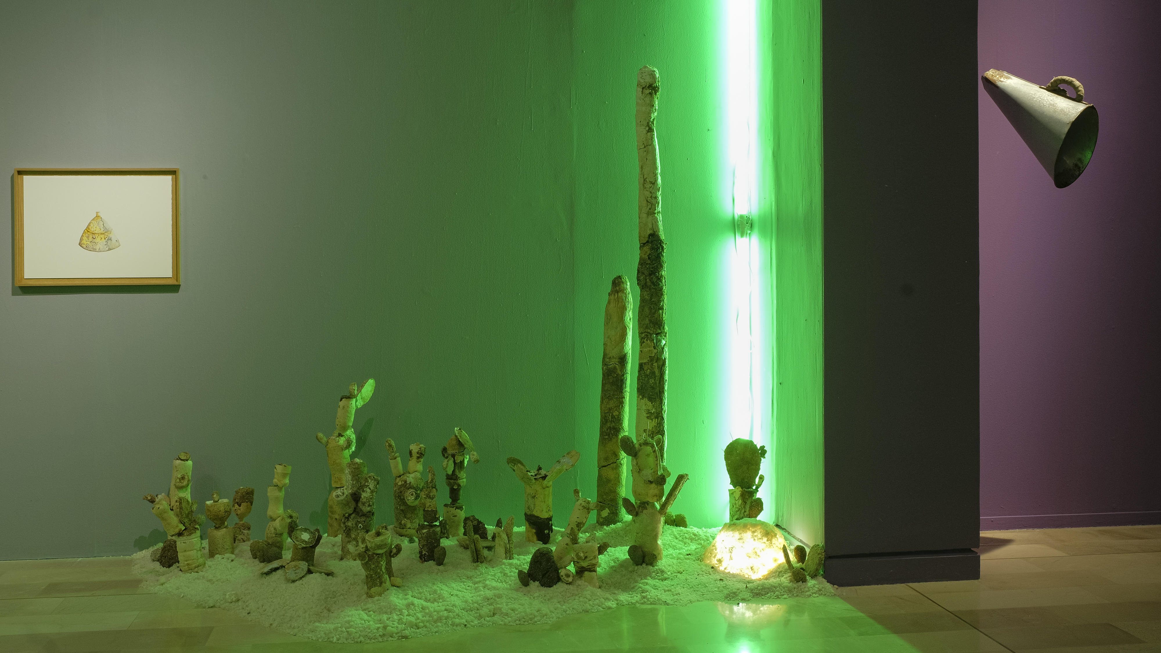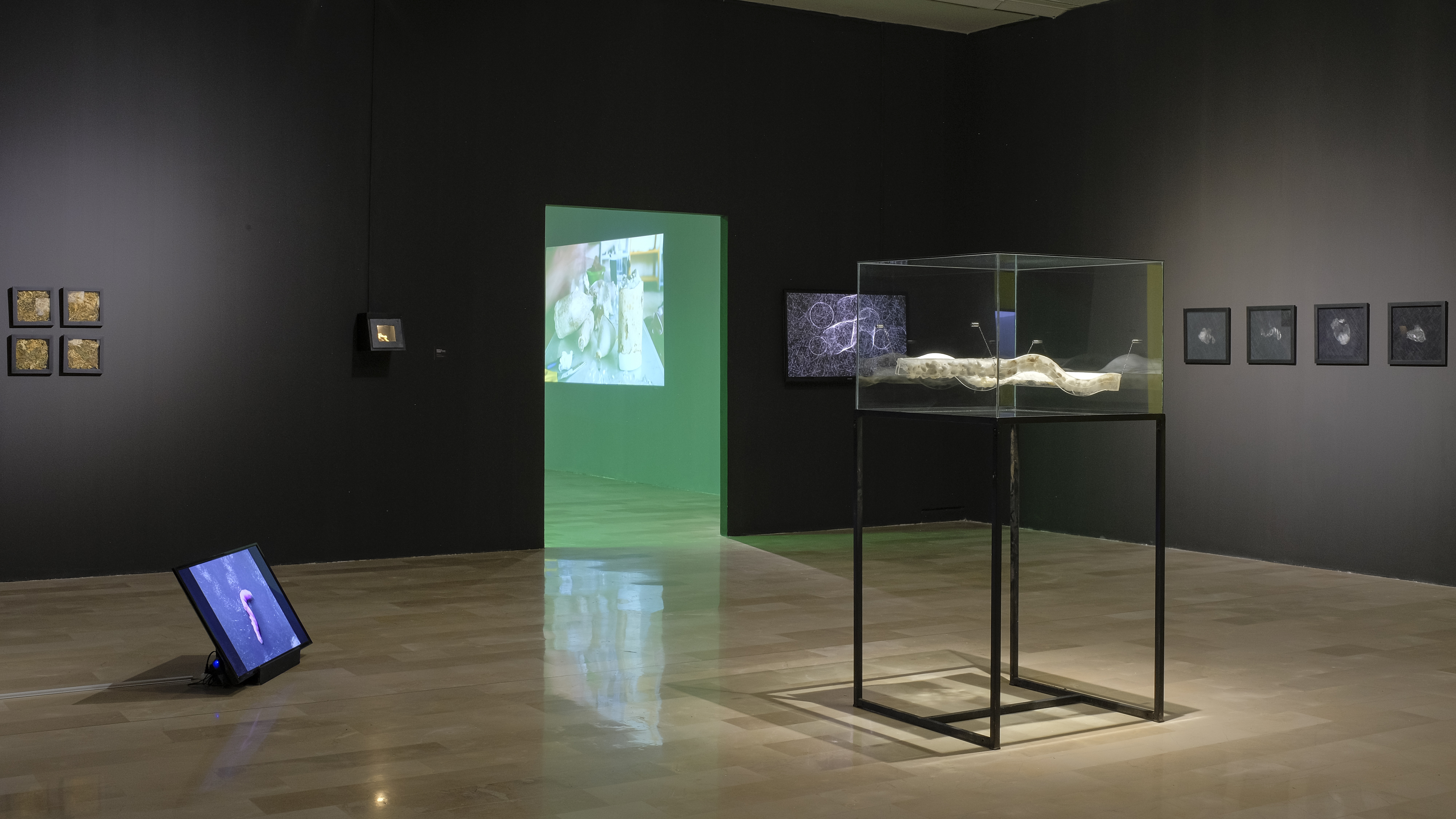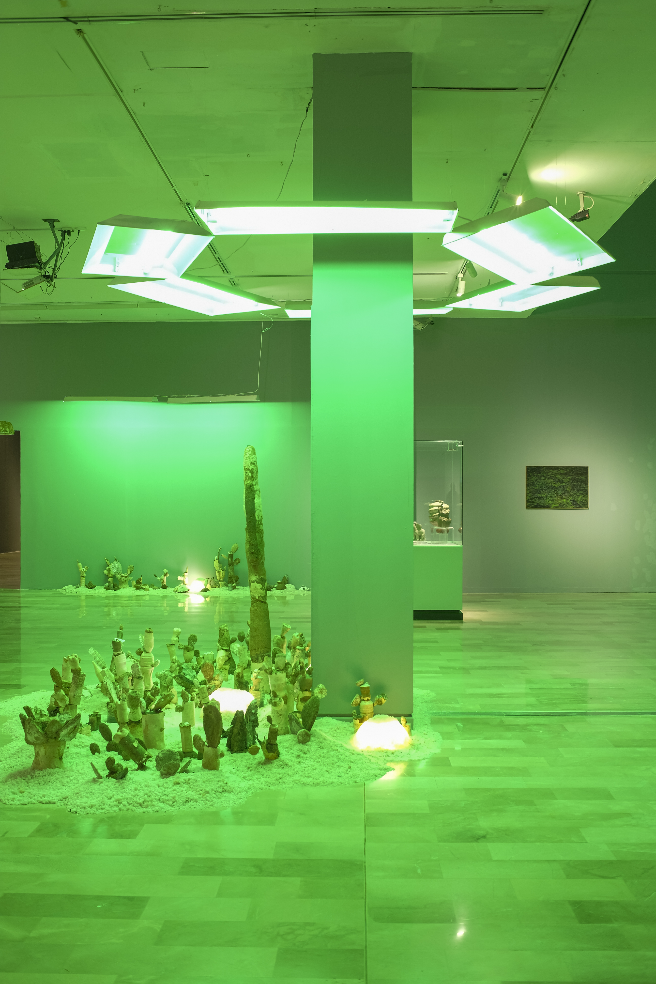 In the speculative world of Paul Rosero Contreras, biology and mythology meet at the precipice of time. His multimedia practice unravels fictional narratives combined with field-recorded data through sculptural and cinematic assemblages that provide us with a hopeful ground for speculating on the future. The title “The World Ablaze” refers to times of environmental collapse. We are witnessing an ongoing mass-extinction along with extreme meteorological phenomena due to the man-made disequilibrium of the planet. A planet with millions of years of dramatic changes —from iceball earth to fireball earth— which resulted in chemical and physical conditions that gave rise to our evolution. From the perspective of a biologist or mystic figure who sees the drawn-out process of geological time, it is not the planet as a living being that will end, but rather the survival of human and non-human beings.