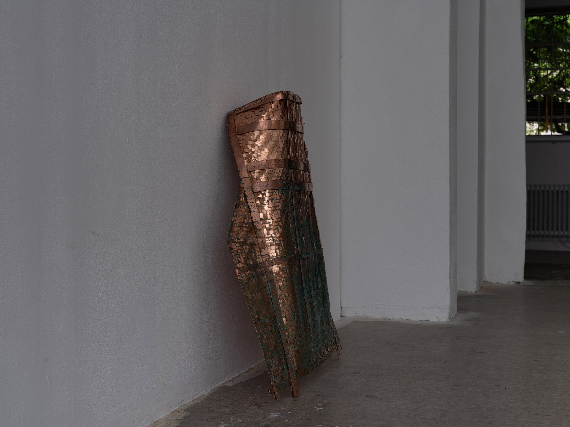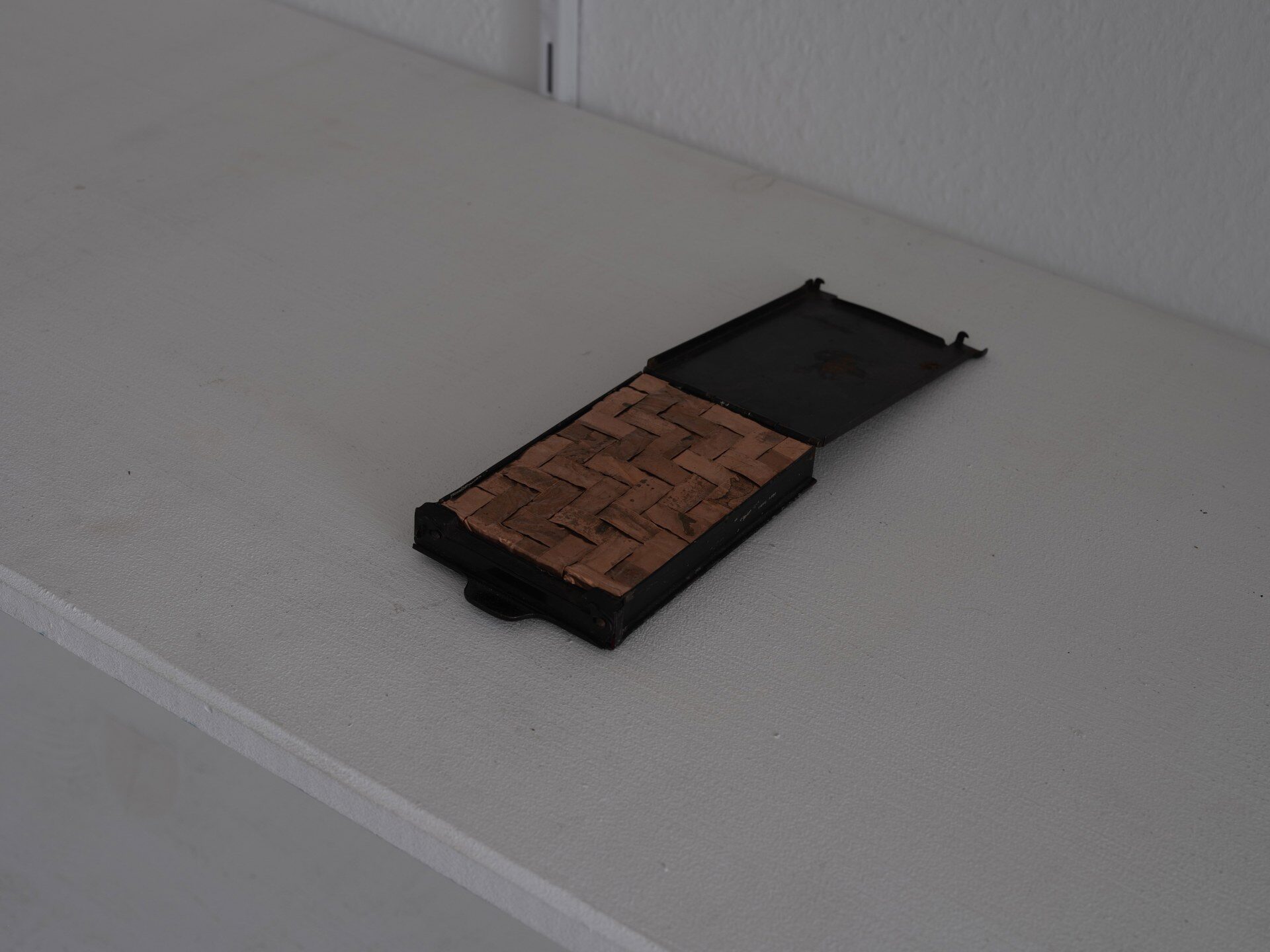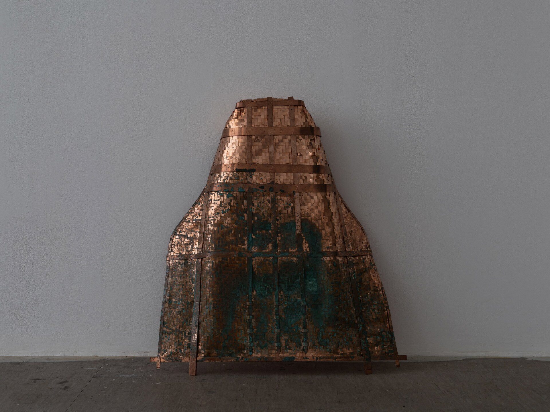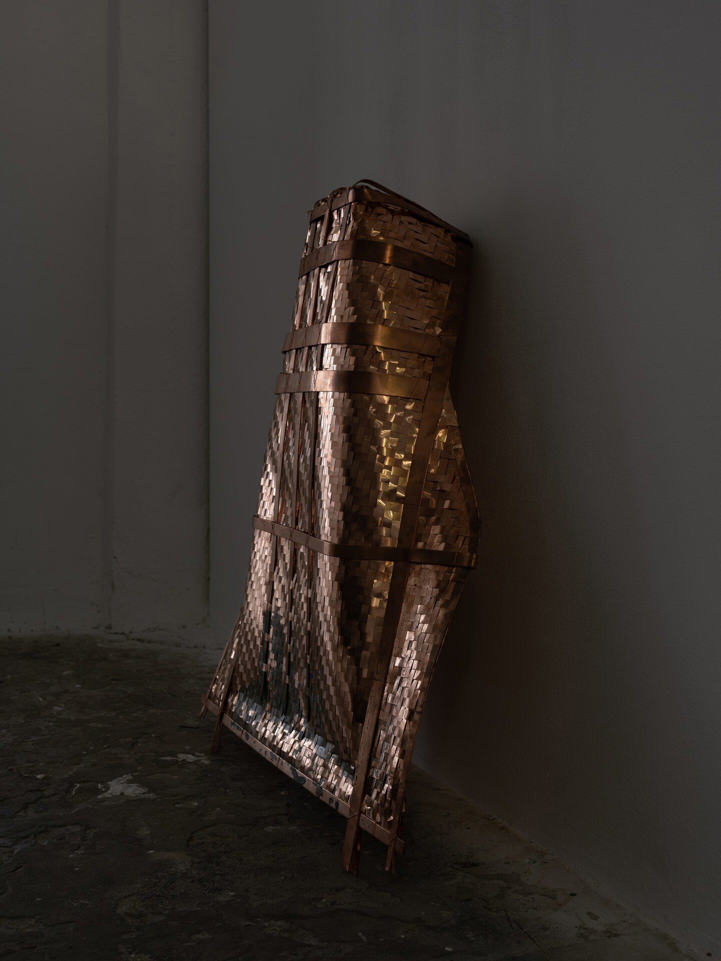 For his first solo exhibition at Neue Alte Brücke, the artist has produced two hand-woven copper reproductions of a traditional Korean winnowing basket, a tool historically used to clean harvested rice. Beyond its agricultural purpose, the basket once served a symbolic role in a ritual of childhood discipline: children who wet the bed were made to wear it on their heads and walk through the village asking neighbors for salt, a gesture meant to purge impurity through public shame.