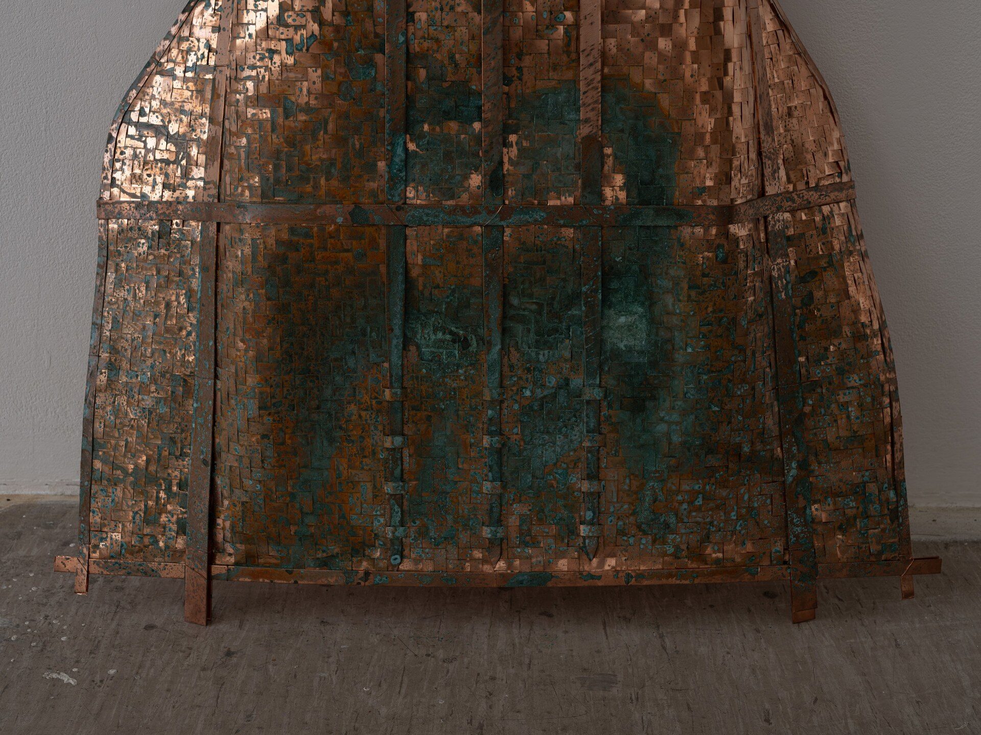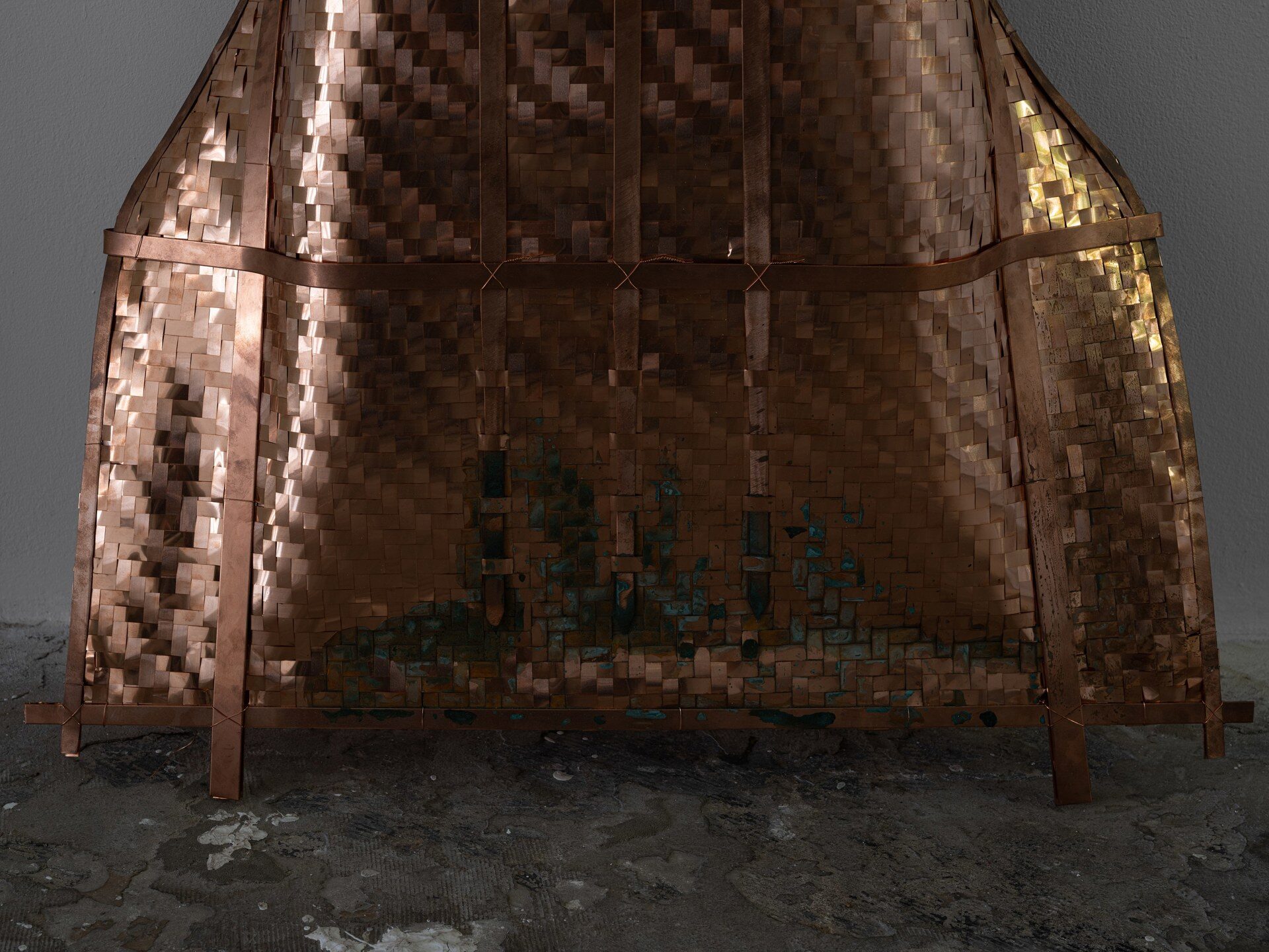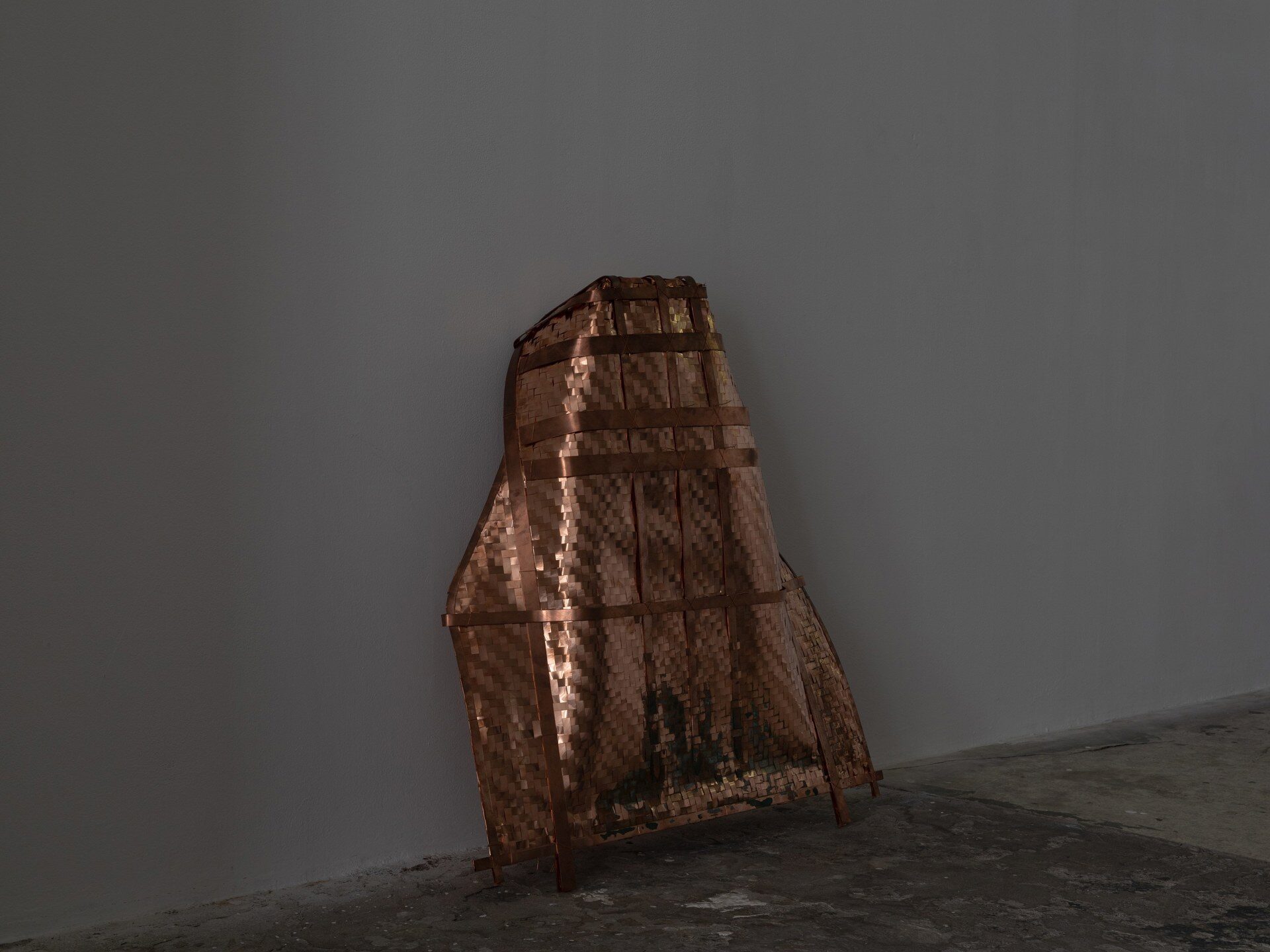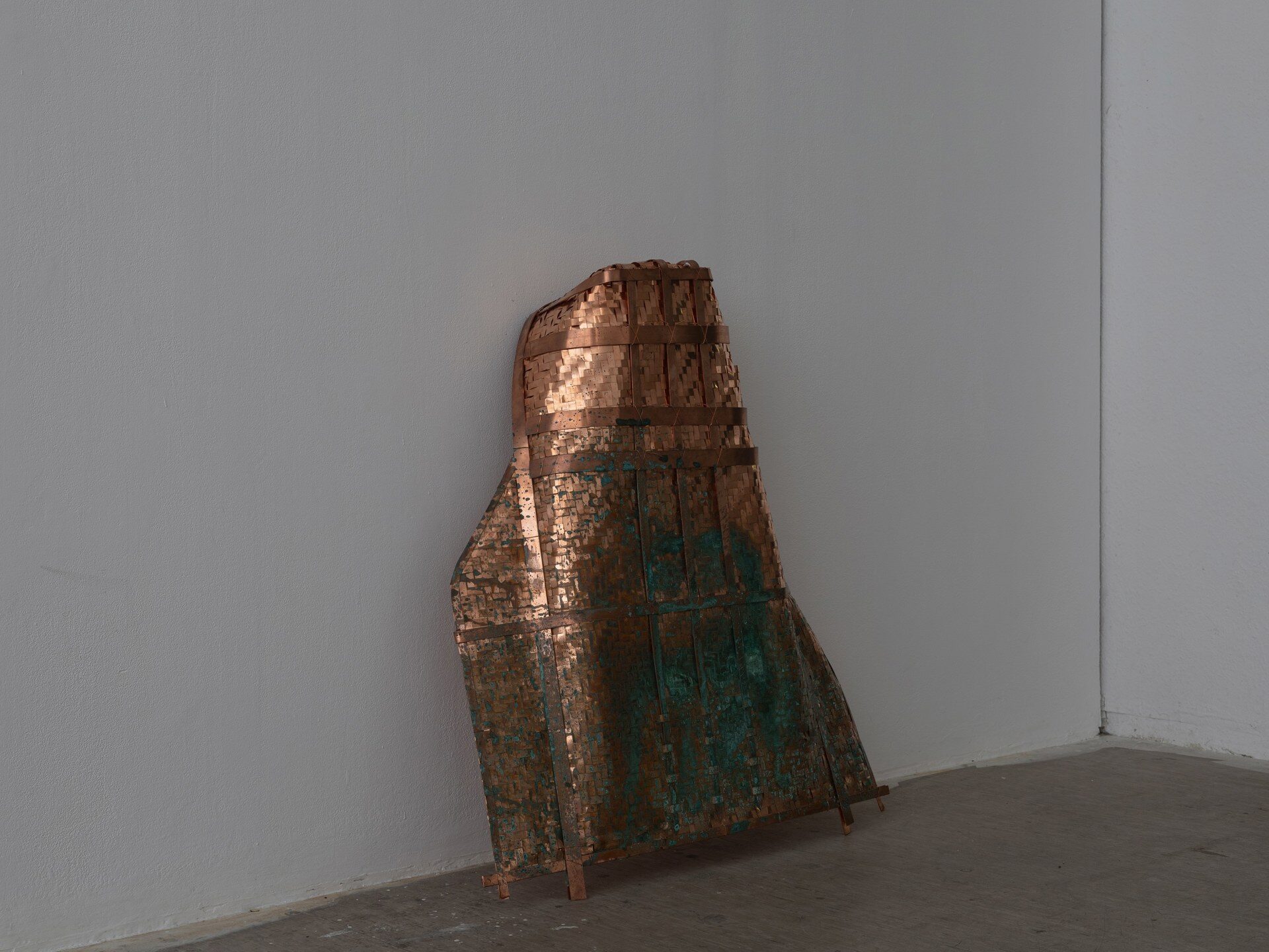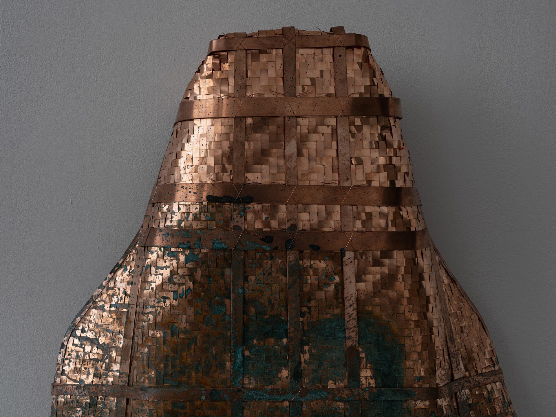 For his first solo exhibition at Neue Alte Brücke, the artist has produced two hand-woven copper reproductions of a traditional Korean winnowing basket, a tool historically used to clean harvested rice. Beyond its agricultural purpose, the basket once served a symbolic role in a ritual of childhood discipline: children who wet the bed were made to wear it on their heads and walk through the village asking neighbors for salt, a gesture meant to purge impurity through public shame.